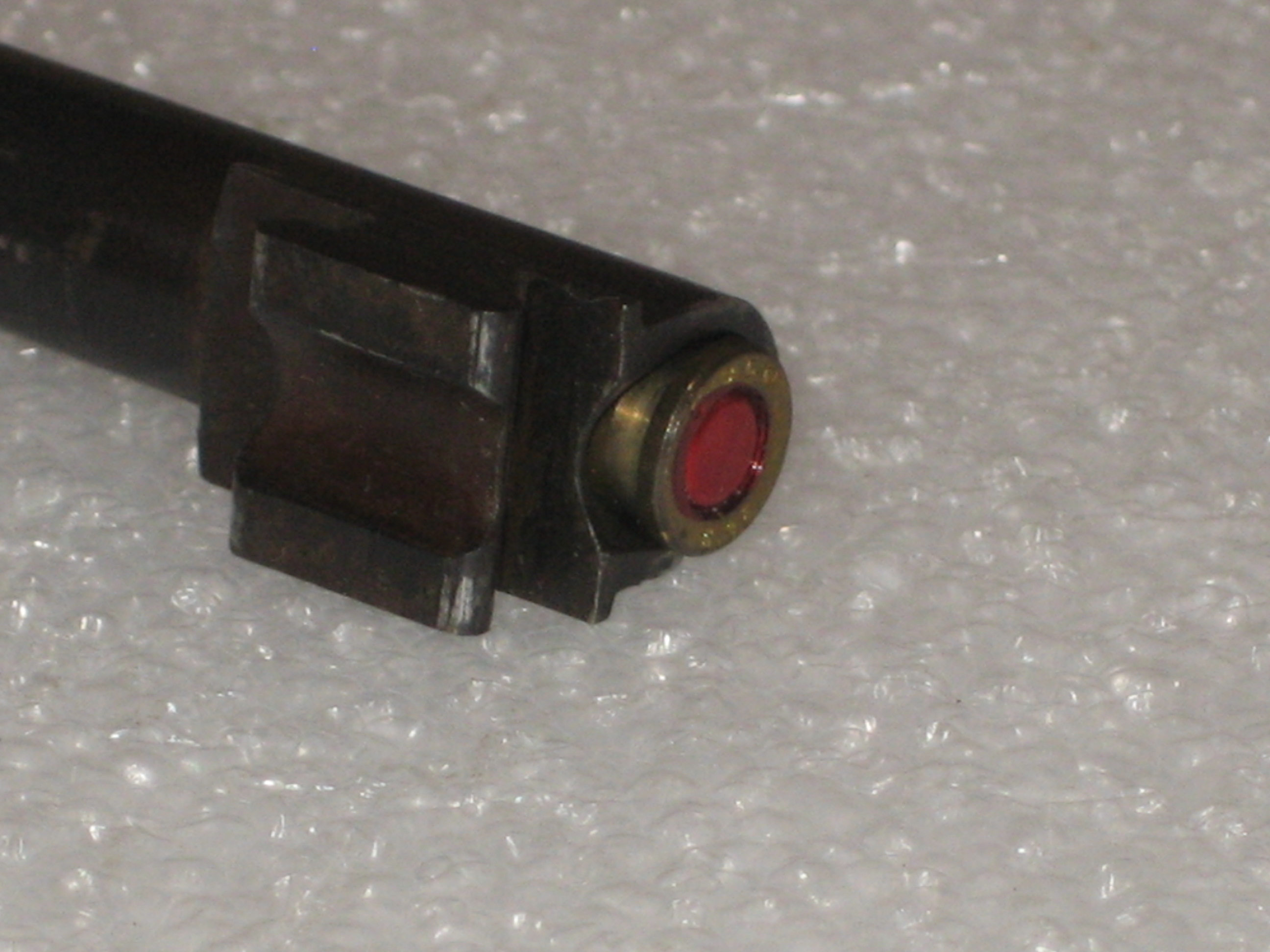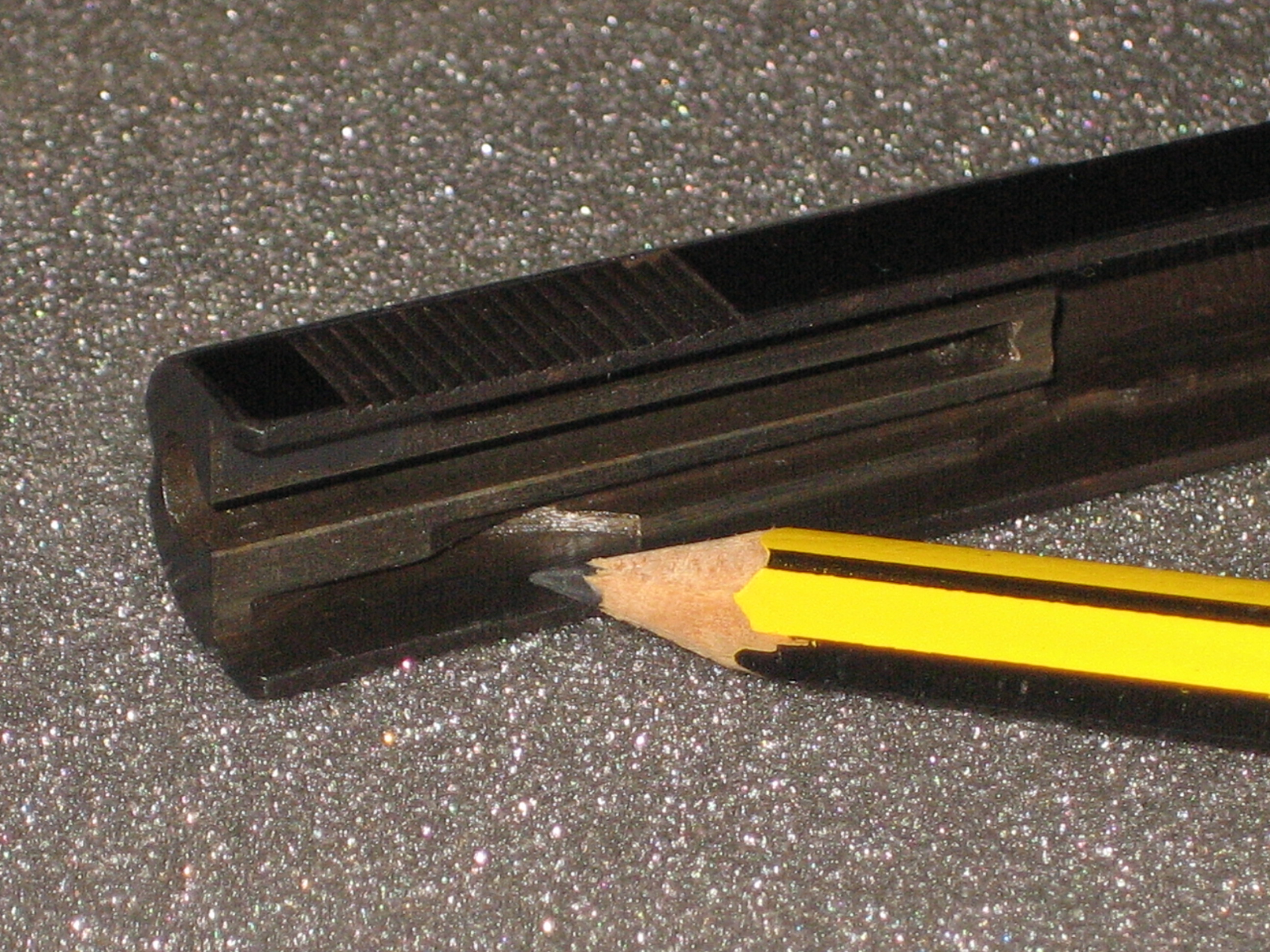 A la pointe du crayon se trouve le témoin d’armement du percuteur. On voit le cône pointu : le percuteur est armé.