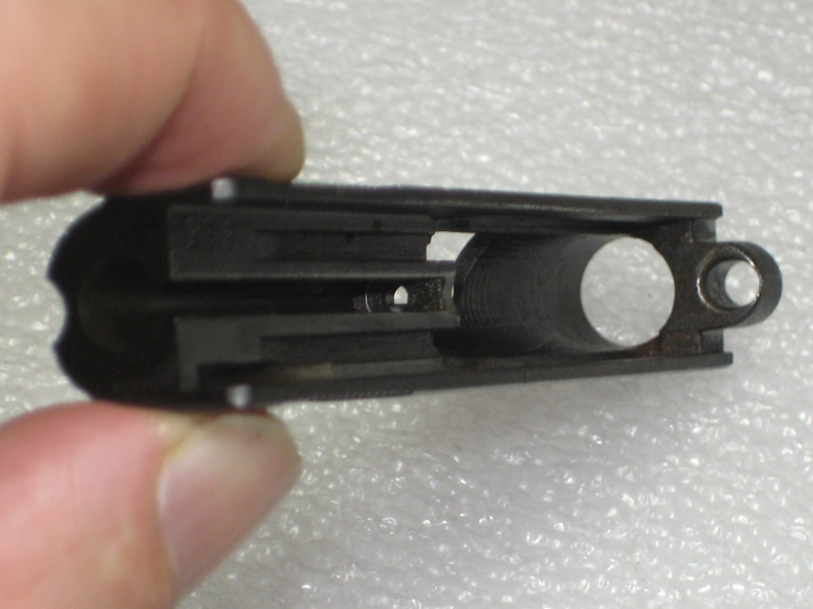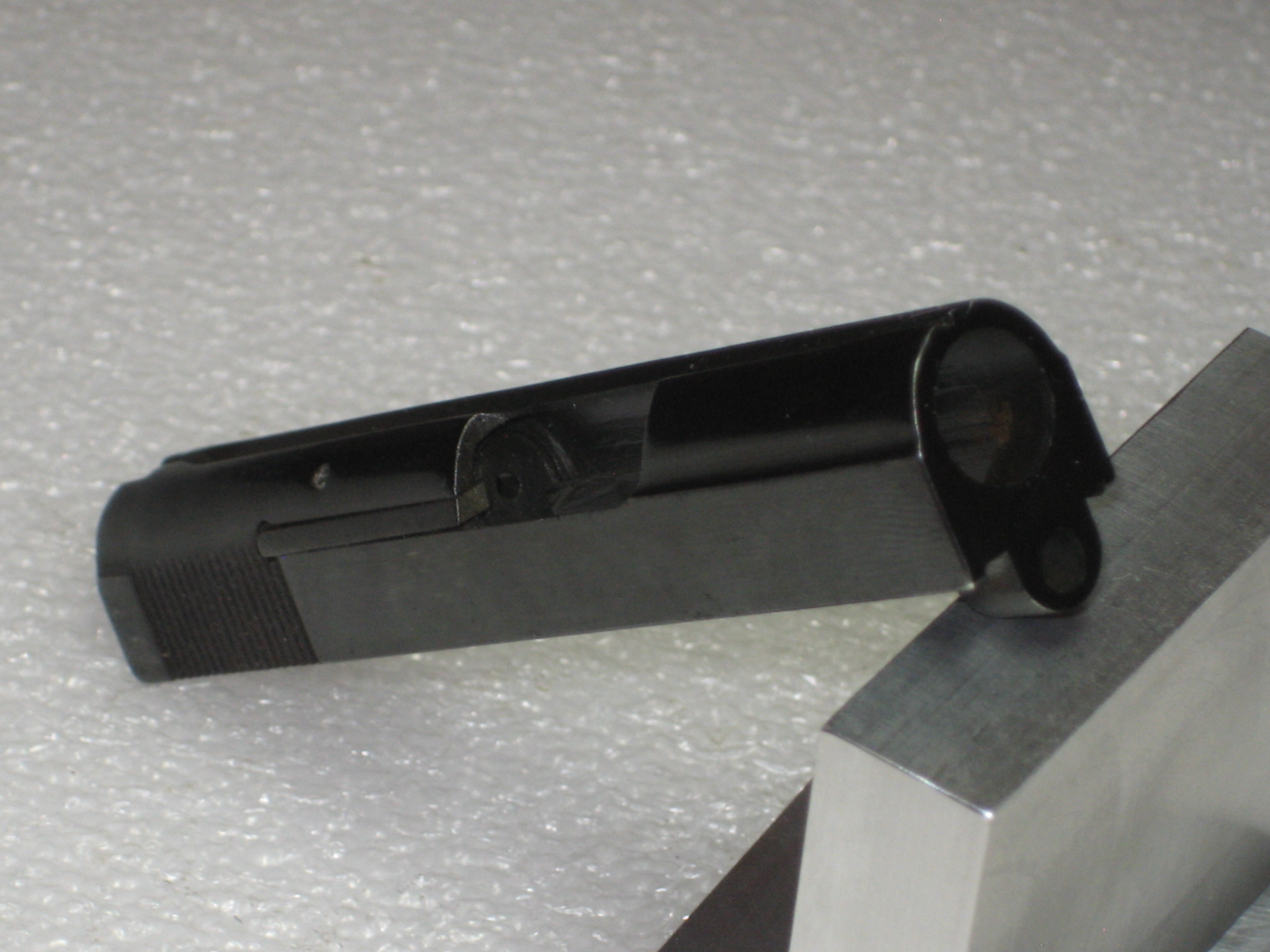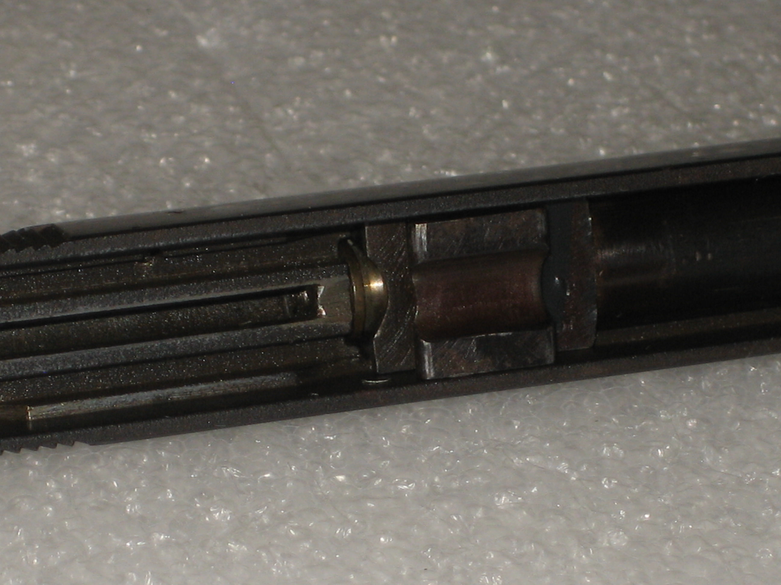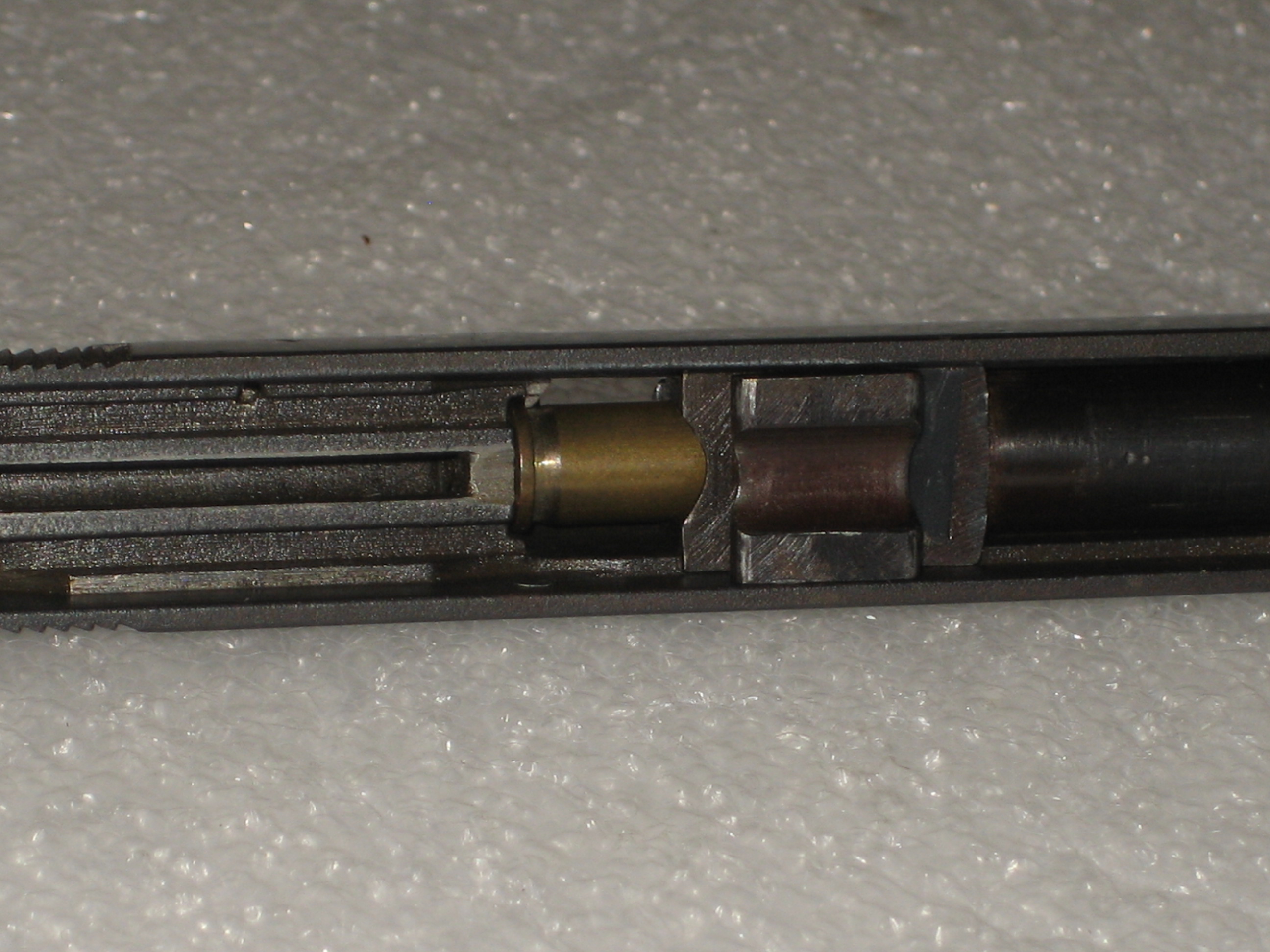 - Repousser à l’intérieur de la culasse le ressort de percuteur. Pour ce faire, vous devez, si le percuteur a été armé lors des manipulations ultérieures, engager un chargeur vide (juste suffisamment pour désengager la sécurité de chargeur de la queue de détente, voir la prochaine photo) et presser la queue de détente (d’où l’intérêt d’avoir vérifié si la chambre est vide) ;