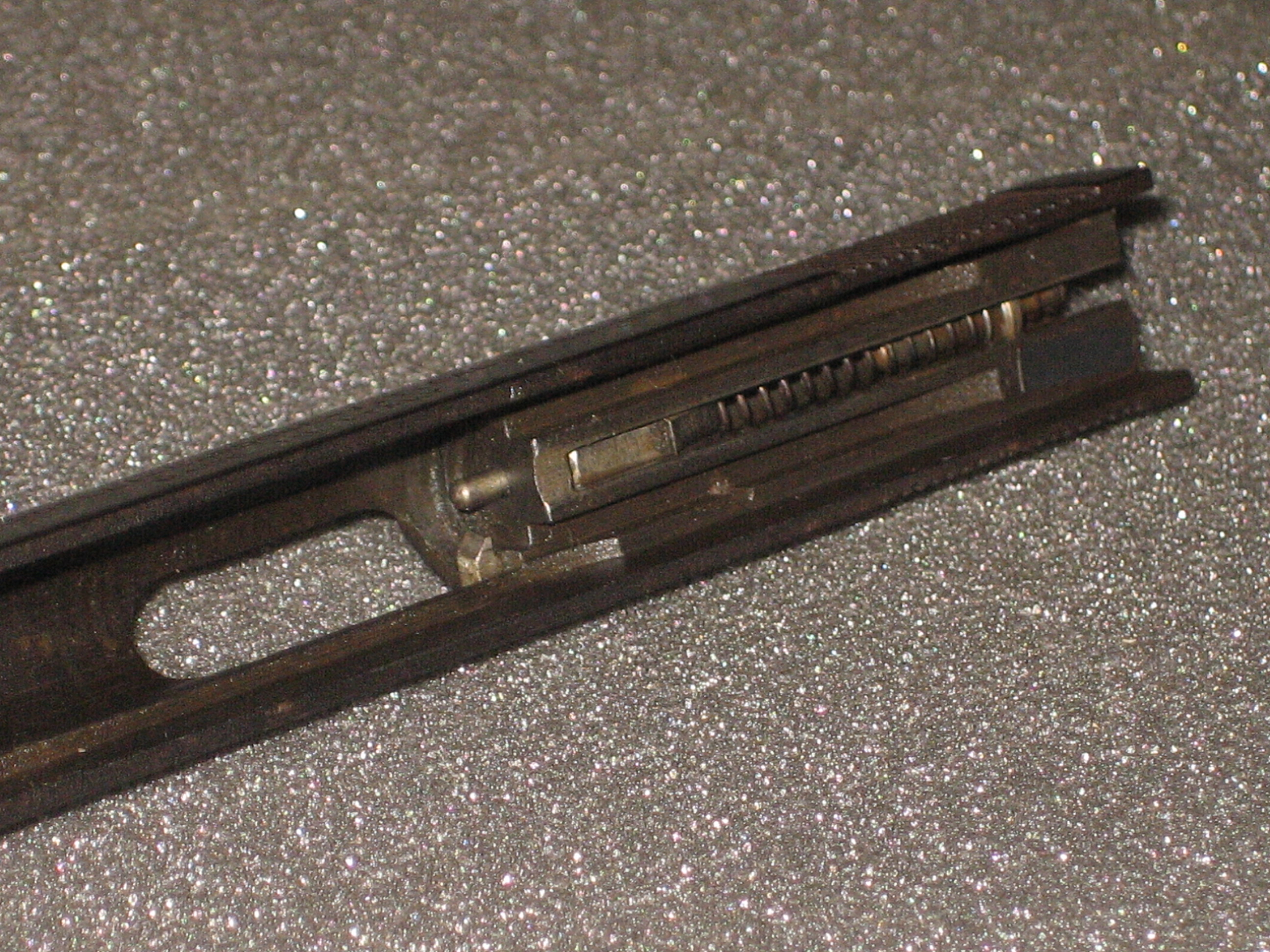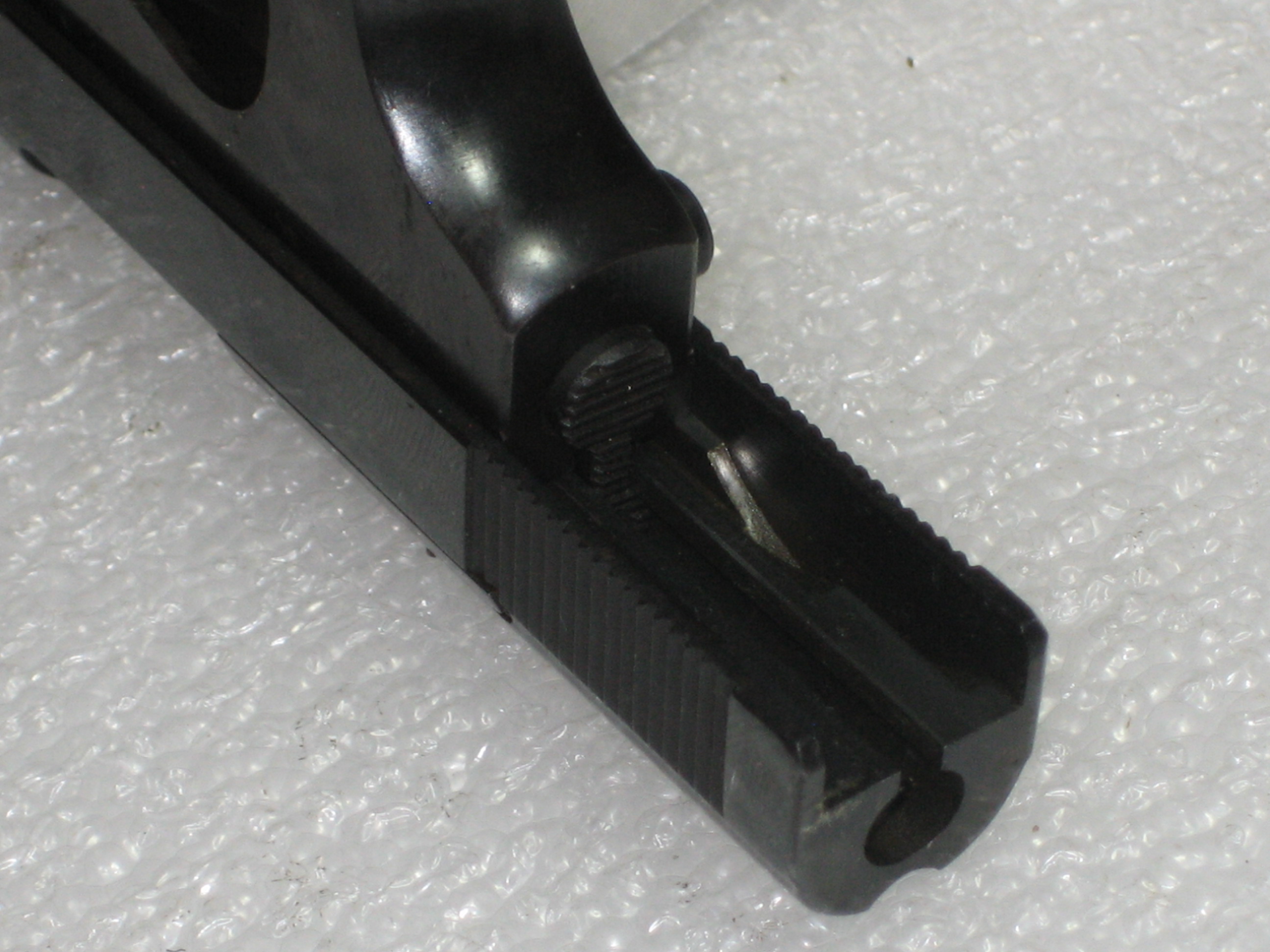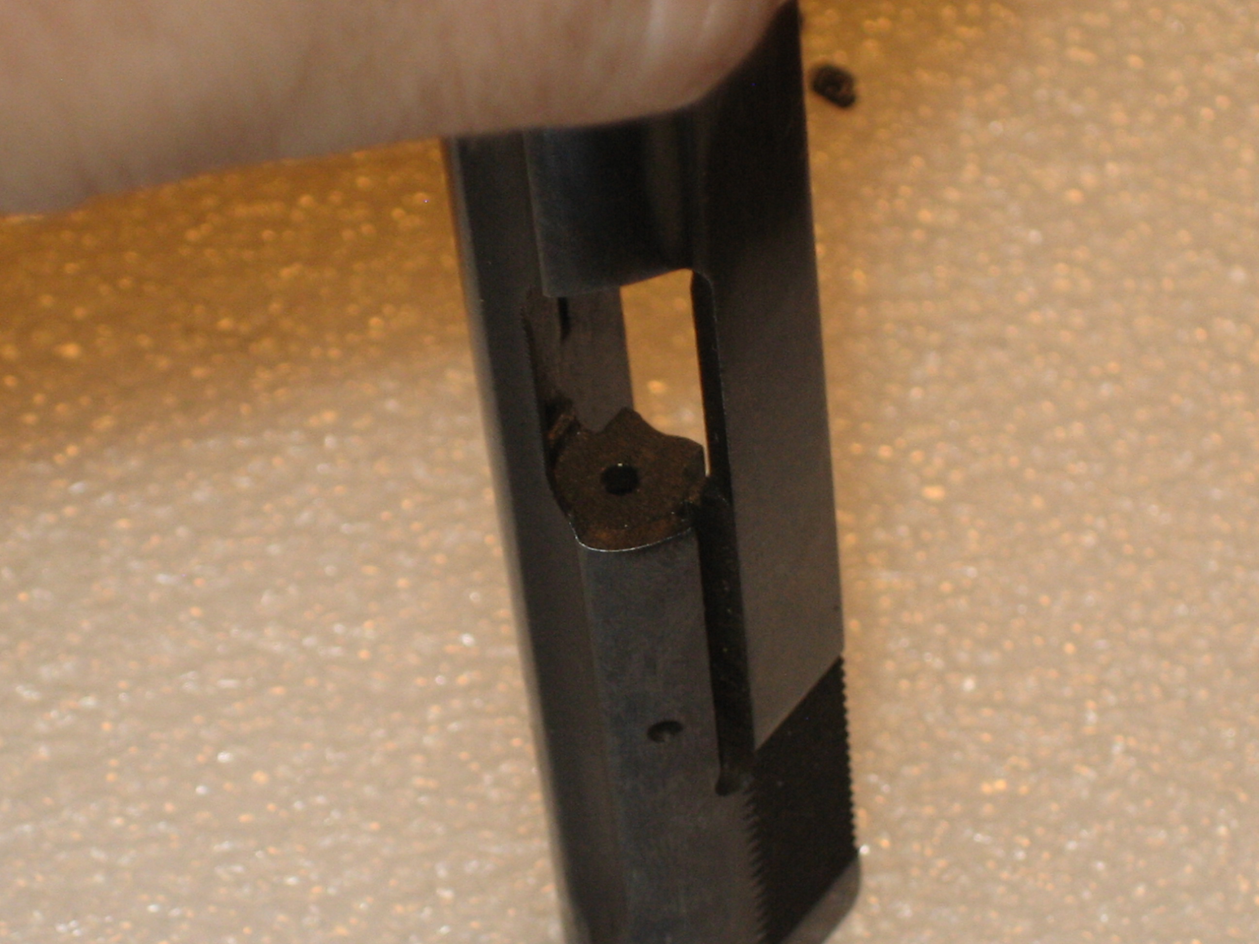 - Repousser à l’intérieur de la culasse le ressort de percuteur. Pour ce faire, vous devez, si le percuteur a été armé lors des manipulations ultérieures, engager un chargeur vide (juste suffisamment pour désengager la sécurité de chargeur de la queue de détente, voir la prochaine photo) et presser la queue de détente (d’où l’intérêt d’avoir vérifié si la chambre est vide) ;