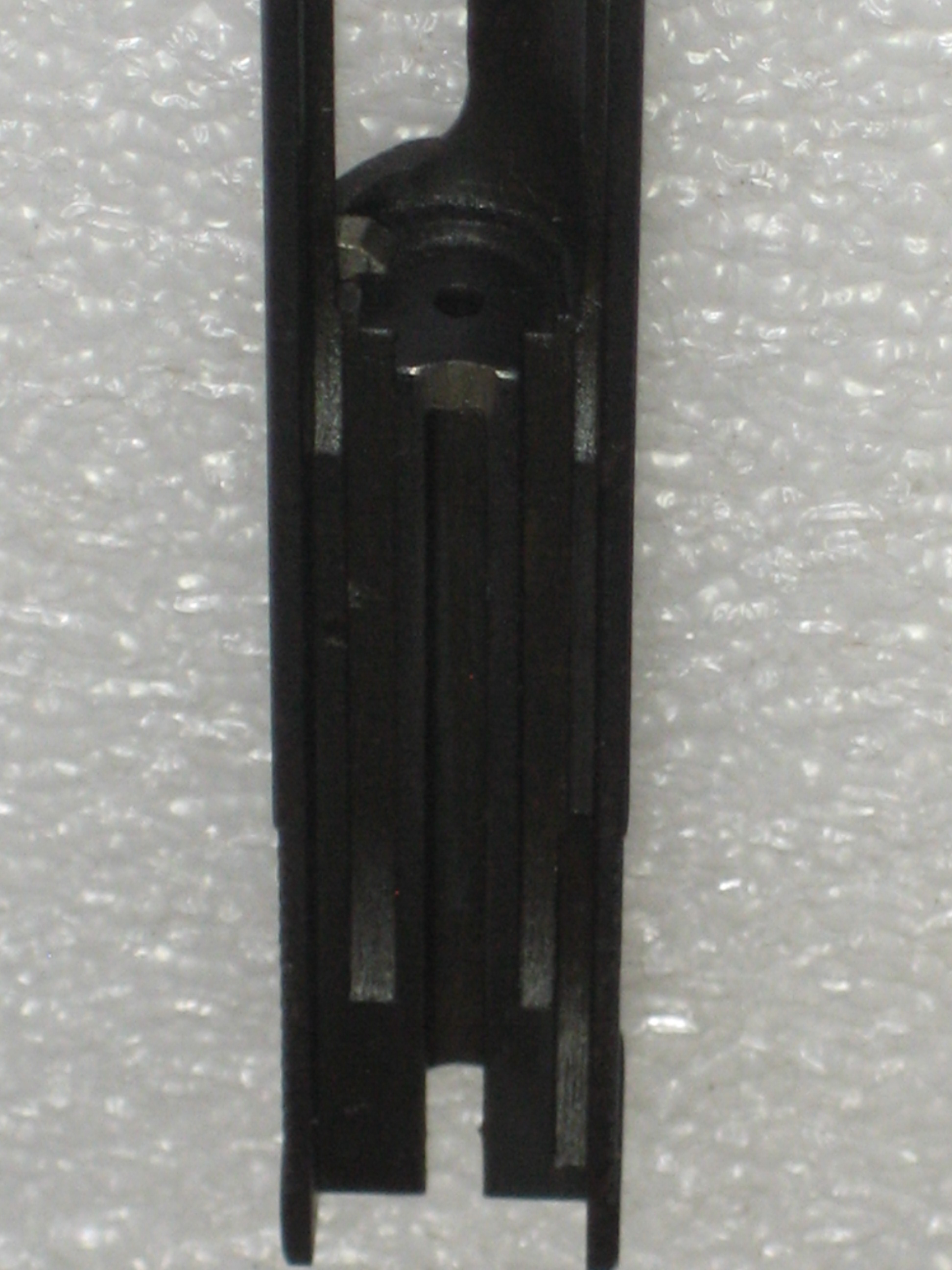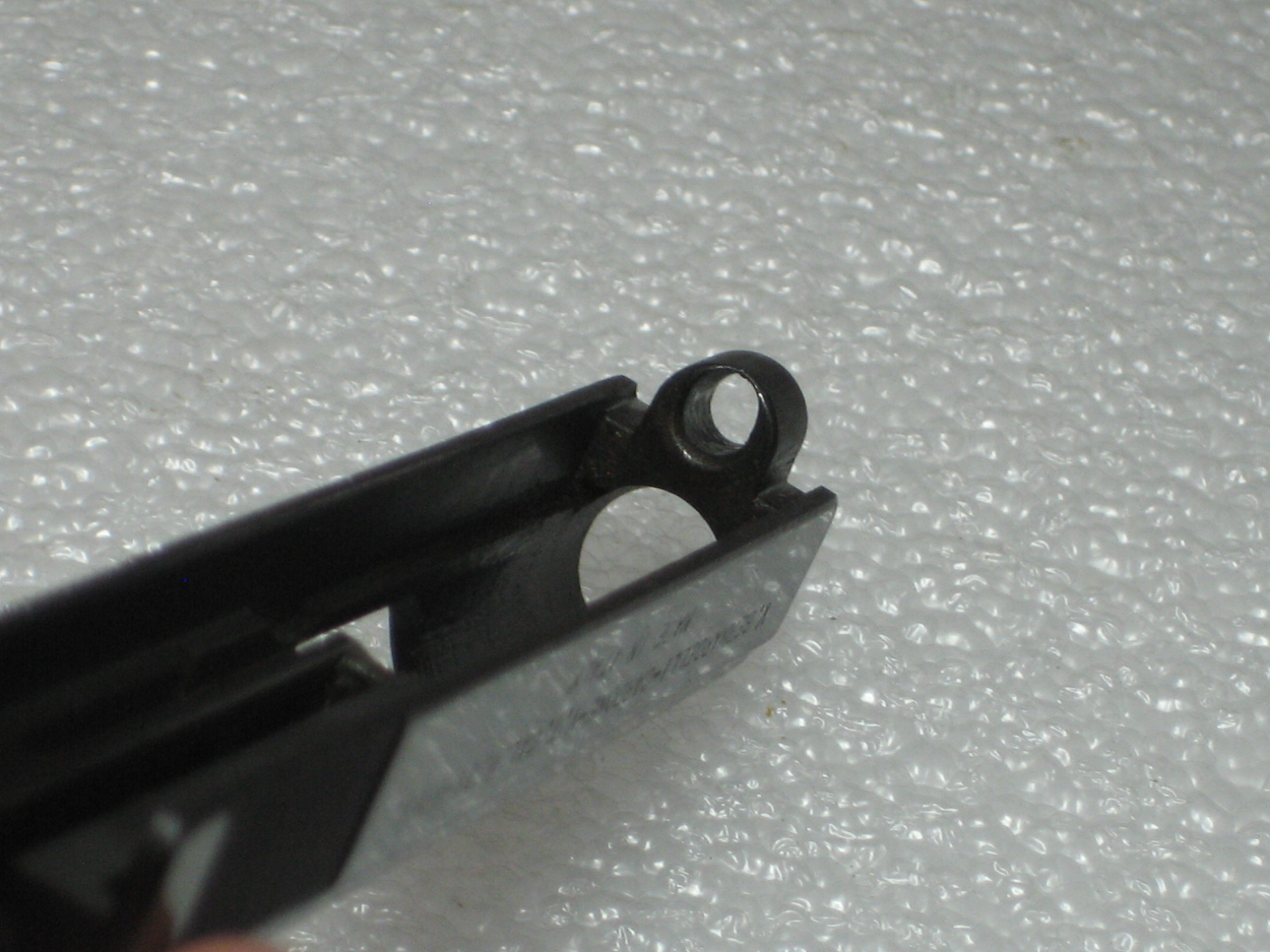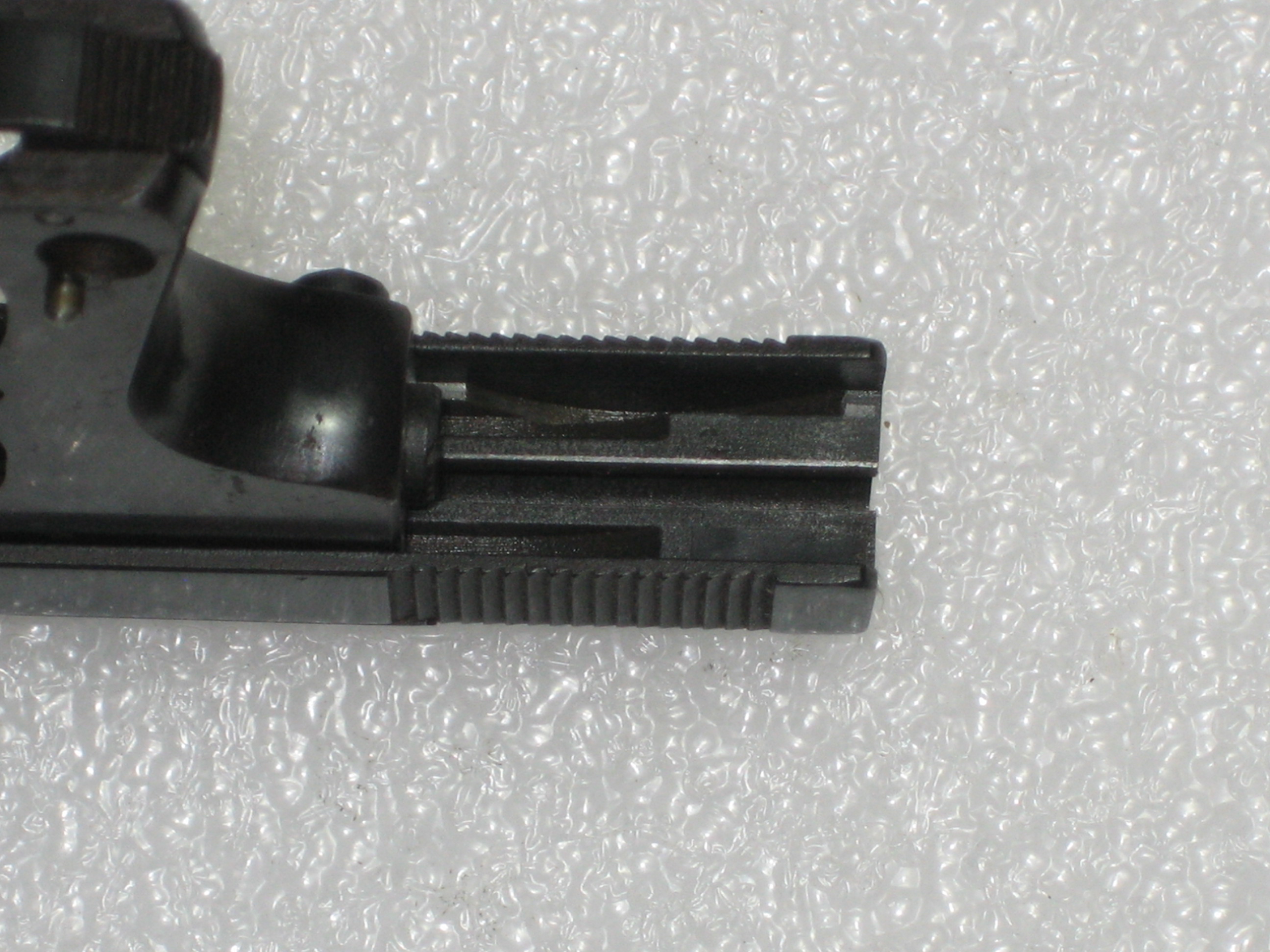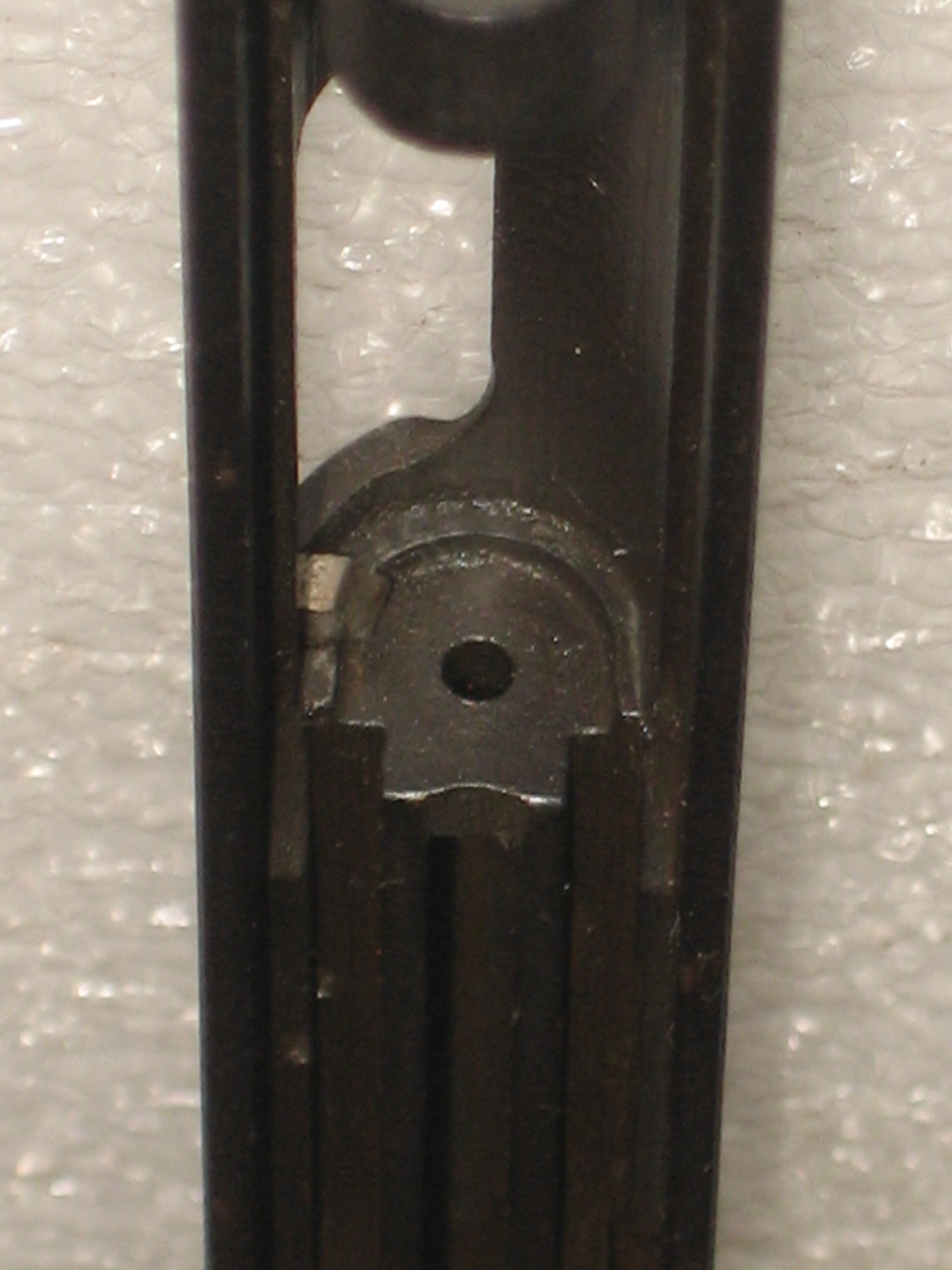 - Repousser à l’intérieur de la culasse le ressort de percuteur. Pour ce faire, vous devez, si le percuteur a été armé lors des manipulations ultérieures, engager un chargeur vide (juste suffisamment pour désengager la sécurité de chargeur de la queue de détente, voir la prochaine photo) et presser la queue de détente (d’où l’intérêt d’avoir vérifié si la chambre est vide) ;