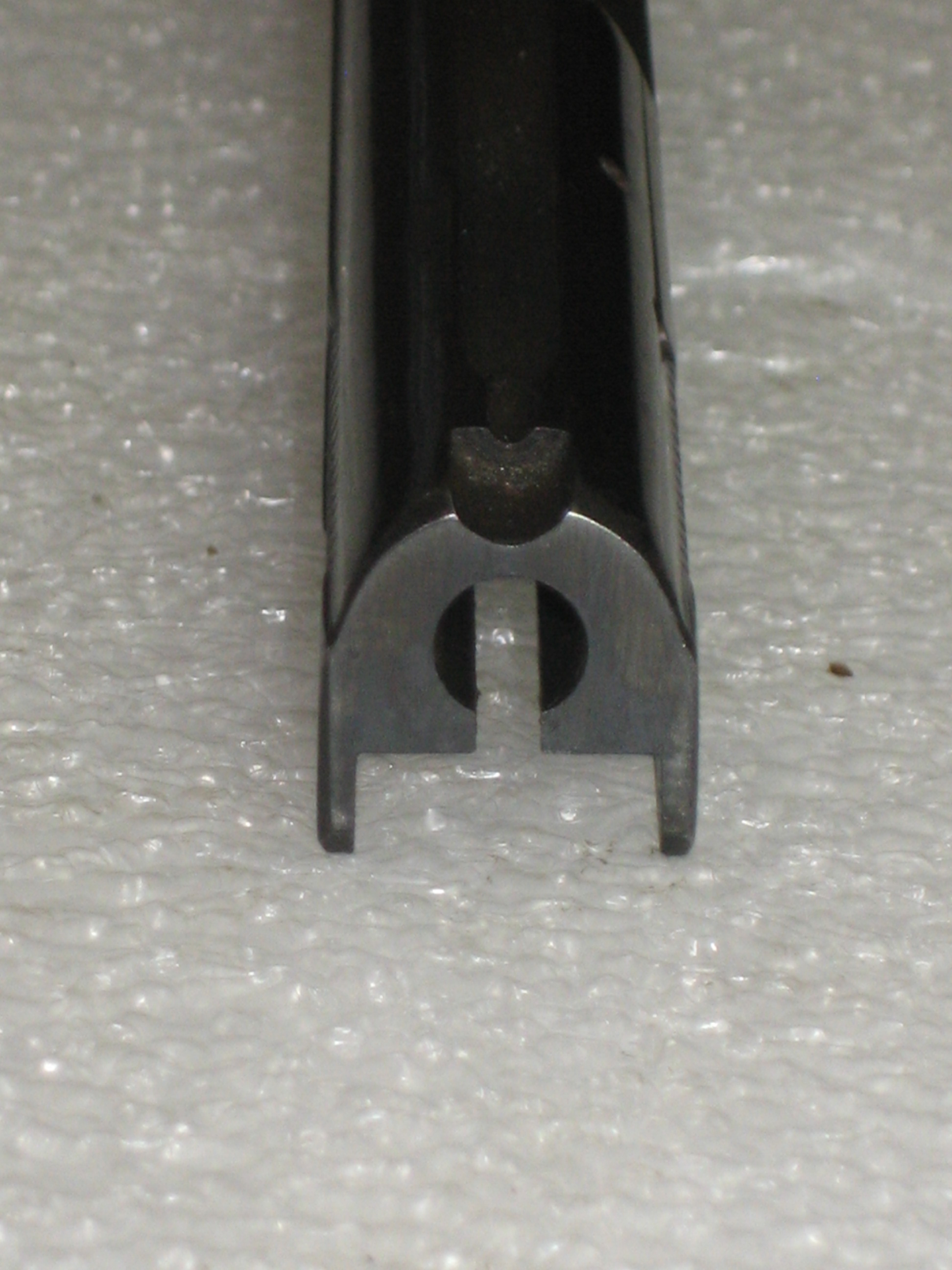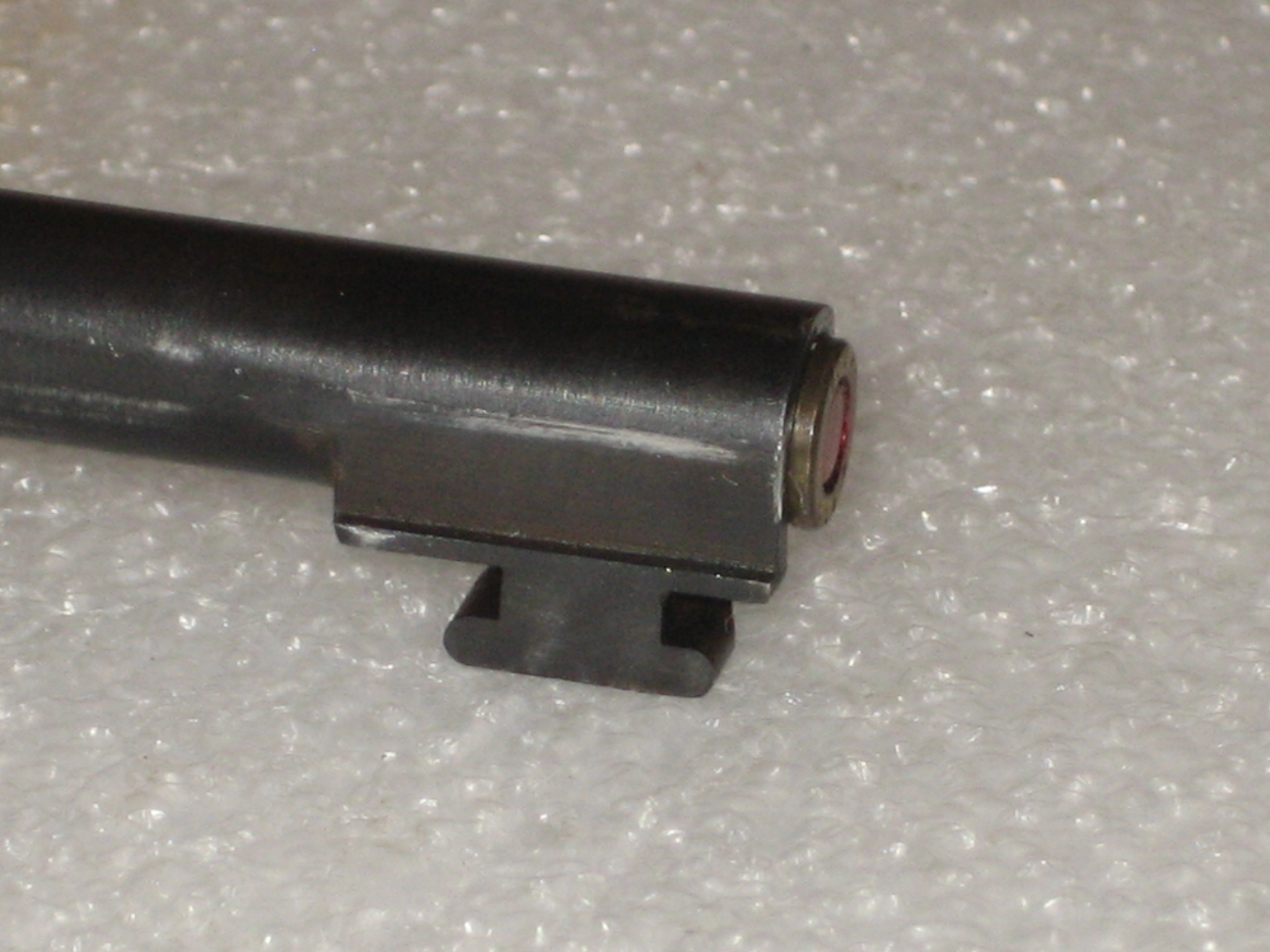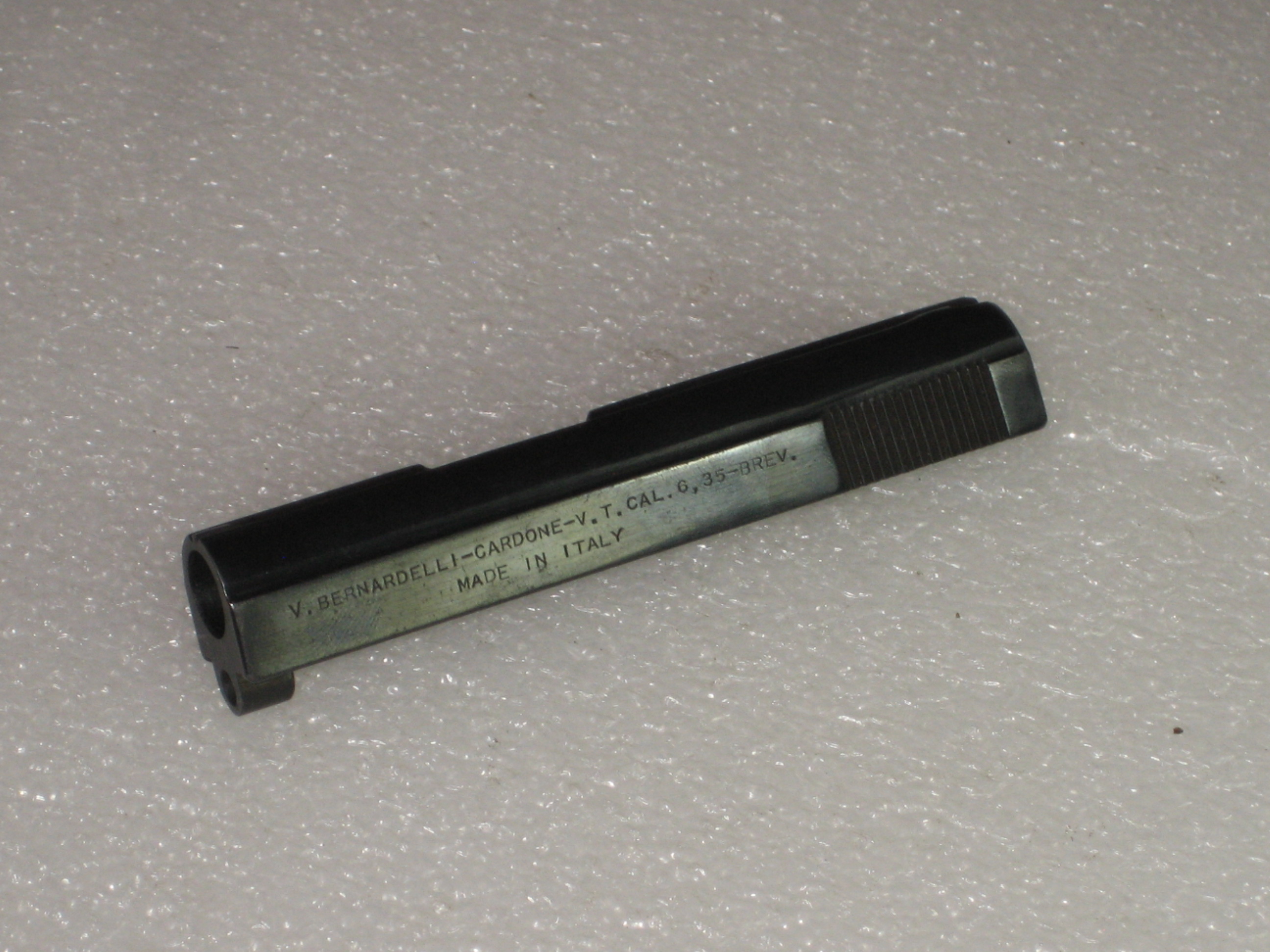 Est ce que le canon a été rayé après usinage de son profil ? Ou, le rayage a t’il eu lieu en premier puis l’usinage du profil ensuite ? Ce serait une information intéressante à connaître. Je pencherais pour la seconde solution (car la plus courante). A savoir : l’emploi de barre d’acier de plusieurs dizaines de centimètres percées et rayées au calibre 6,35 mm. Les barres sont sectionnées à la longueur souhaitée. Le profil du canon est obtenu par usinage de ces portions de barres. Puis la chambre est réalisée avec une fraise spécifique (fraise de chambre). Le canon du Bernardelli baby peut être obtenu à partir d’un barreau rayé de 14 mm de diamètre (minimum). Le canon a 6 rayures à gauche.