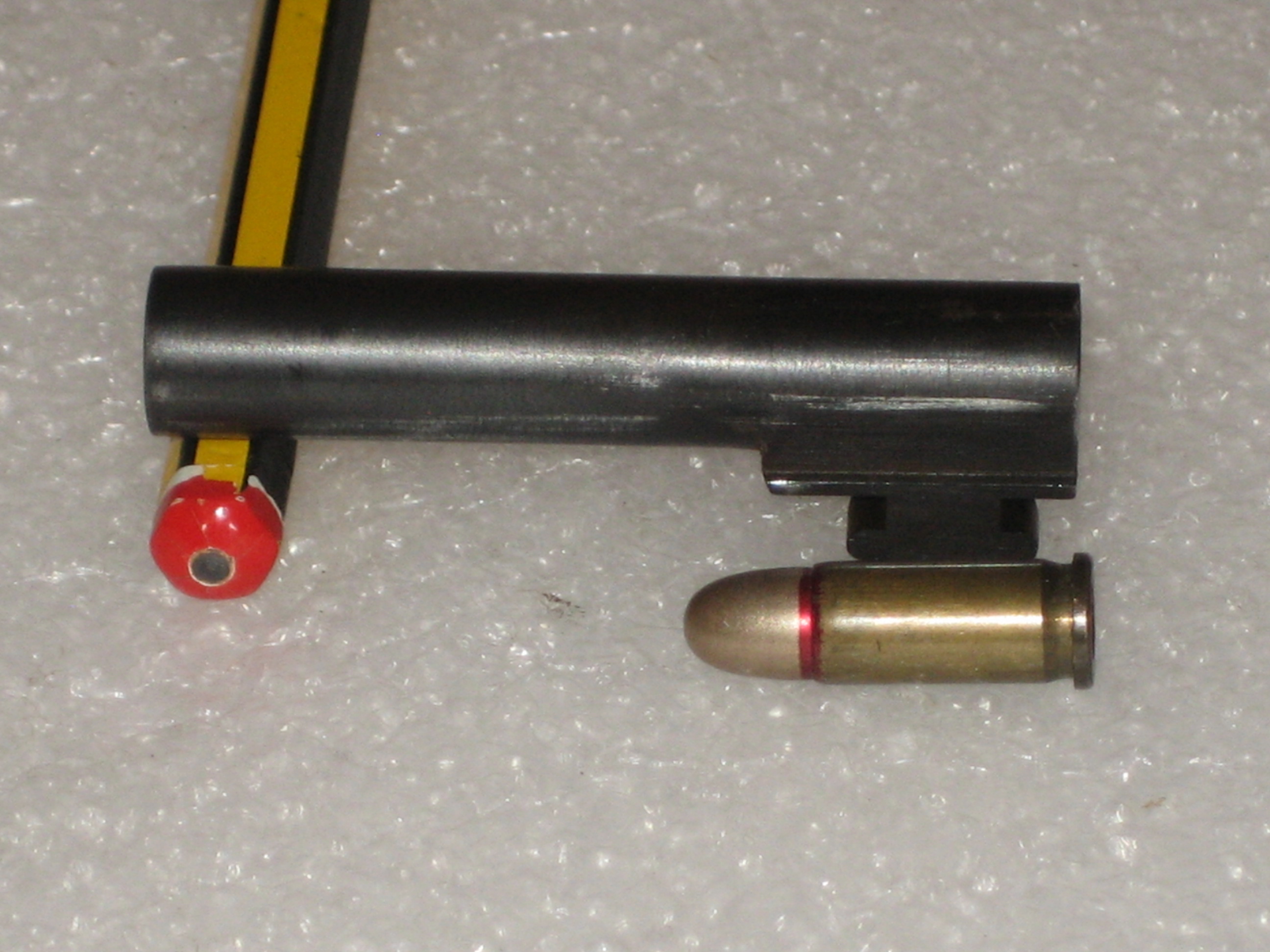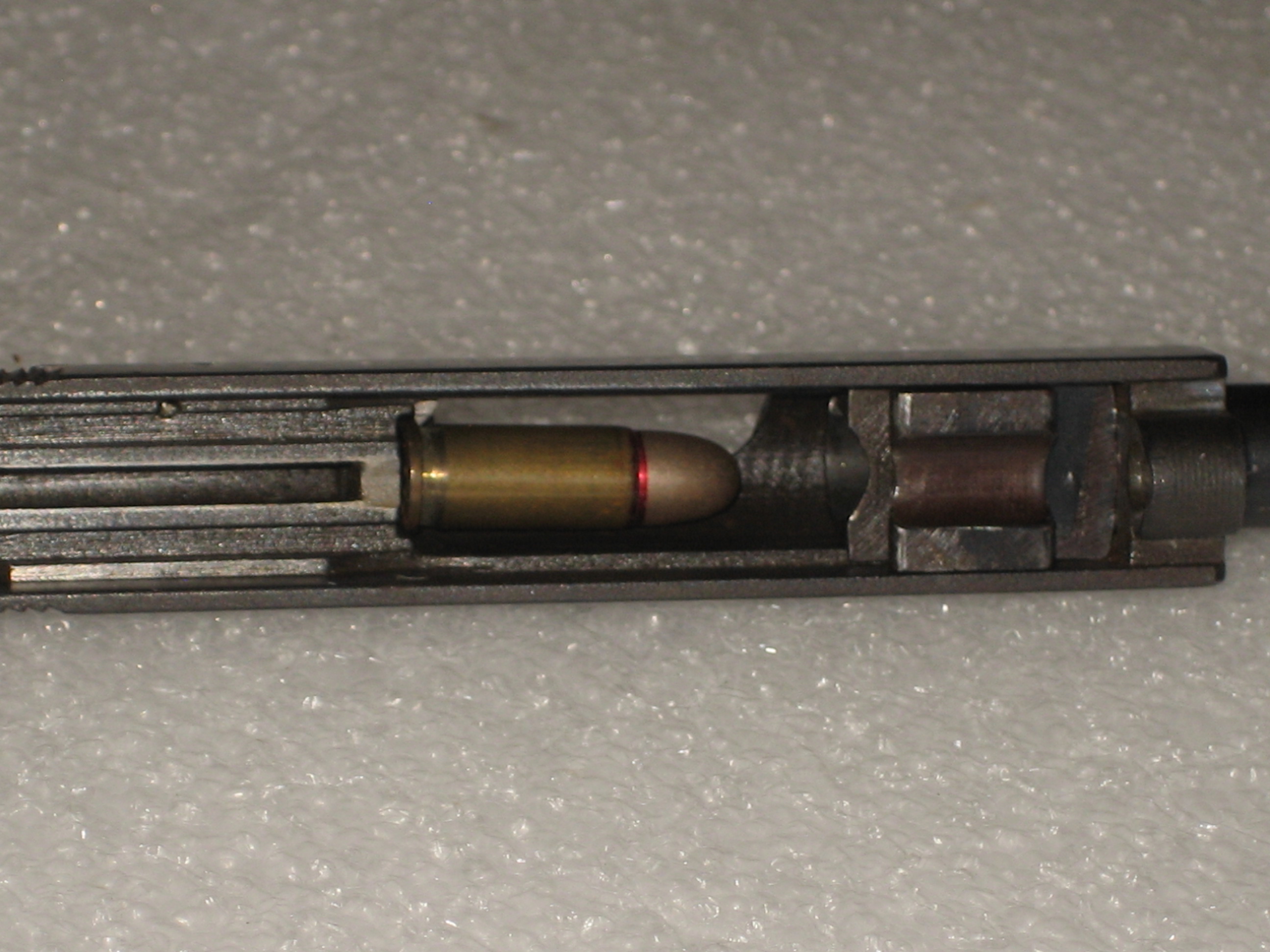 La course maximale du canon dans la culasse (idem avec ou sans ressort récupérateur) est : 28 mm alors qu’une munition mesure environ 22,8 mm.