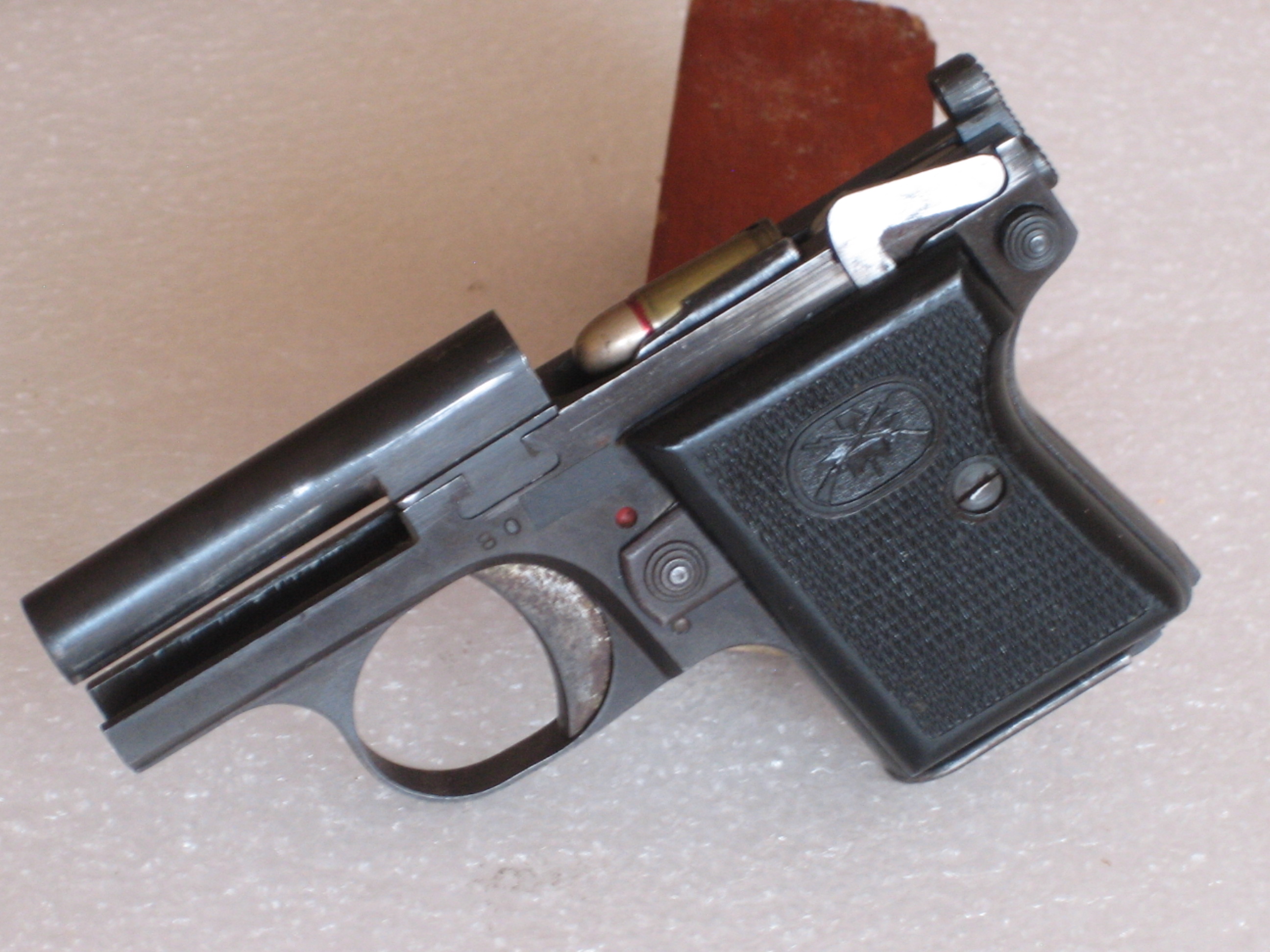 - Bernardelli Baby, vue de l’intérieur de la culasse. Une munition est chambrée.