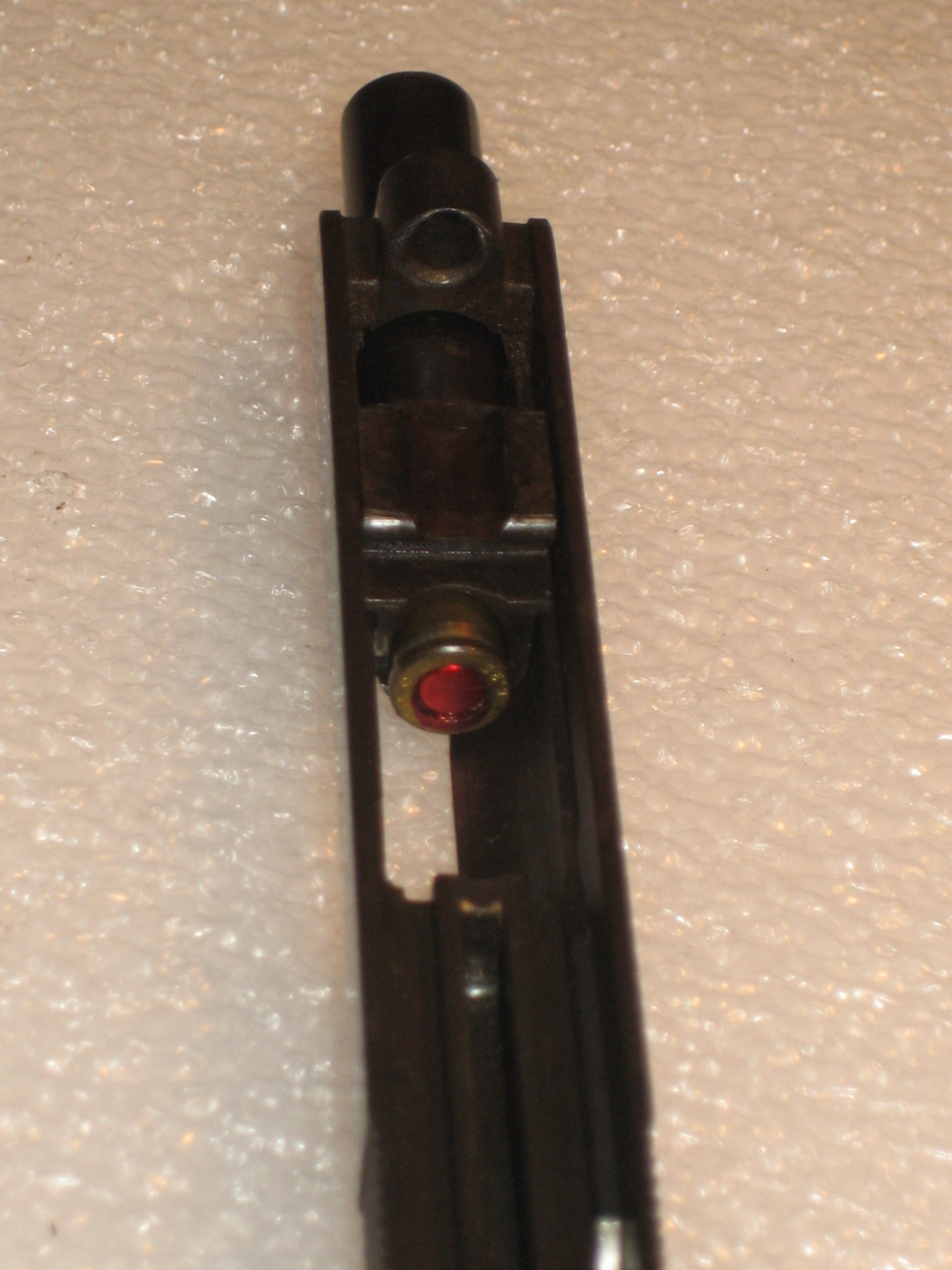 - Bernardelli Baby, vue de l’intérieur de la culasse. Une munition dans la cuvette de tir.