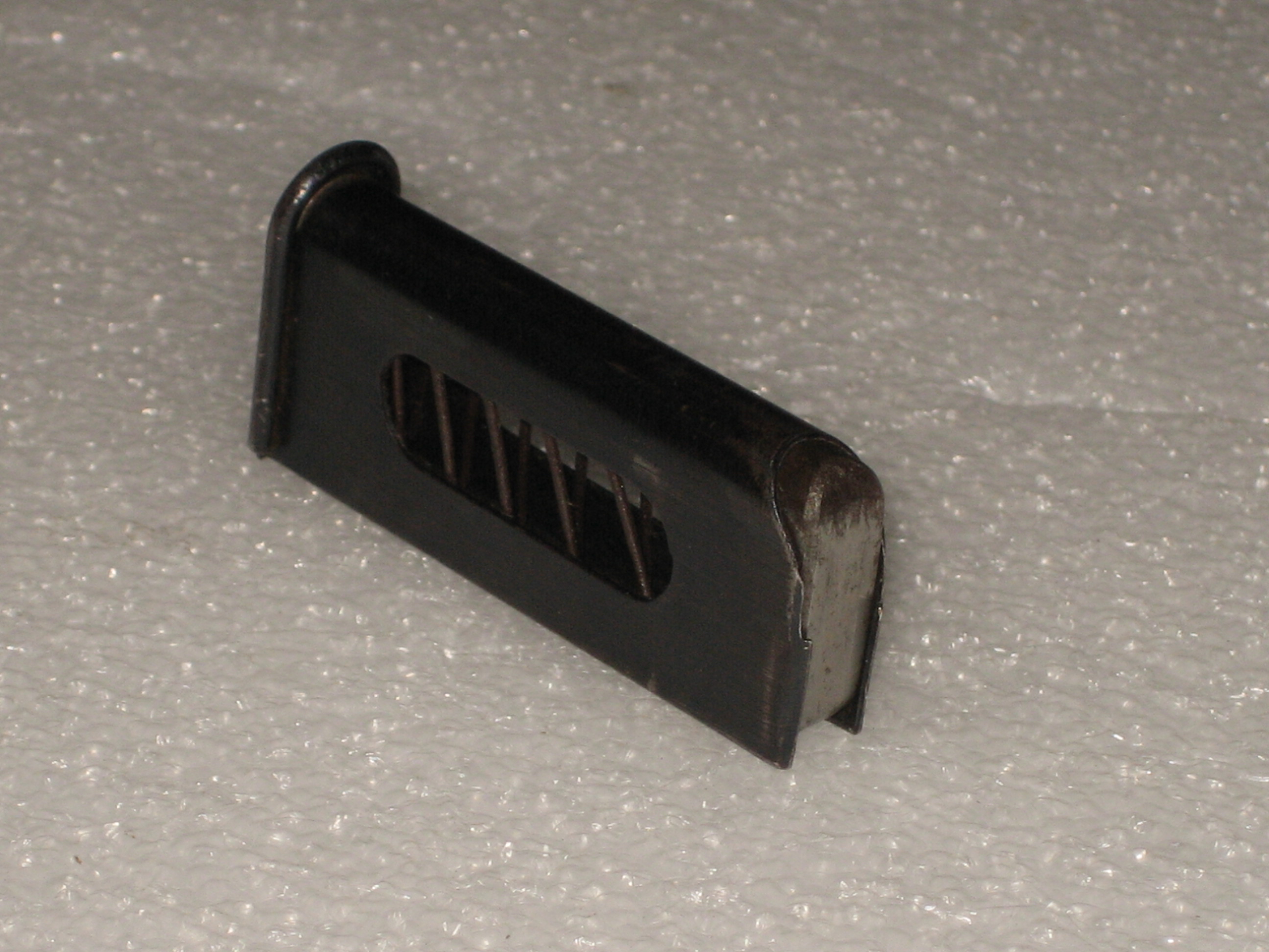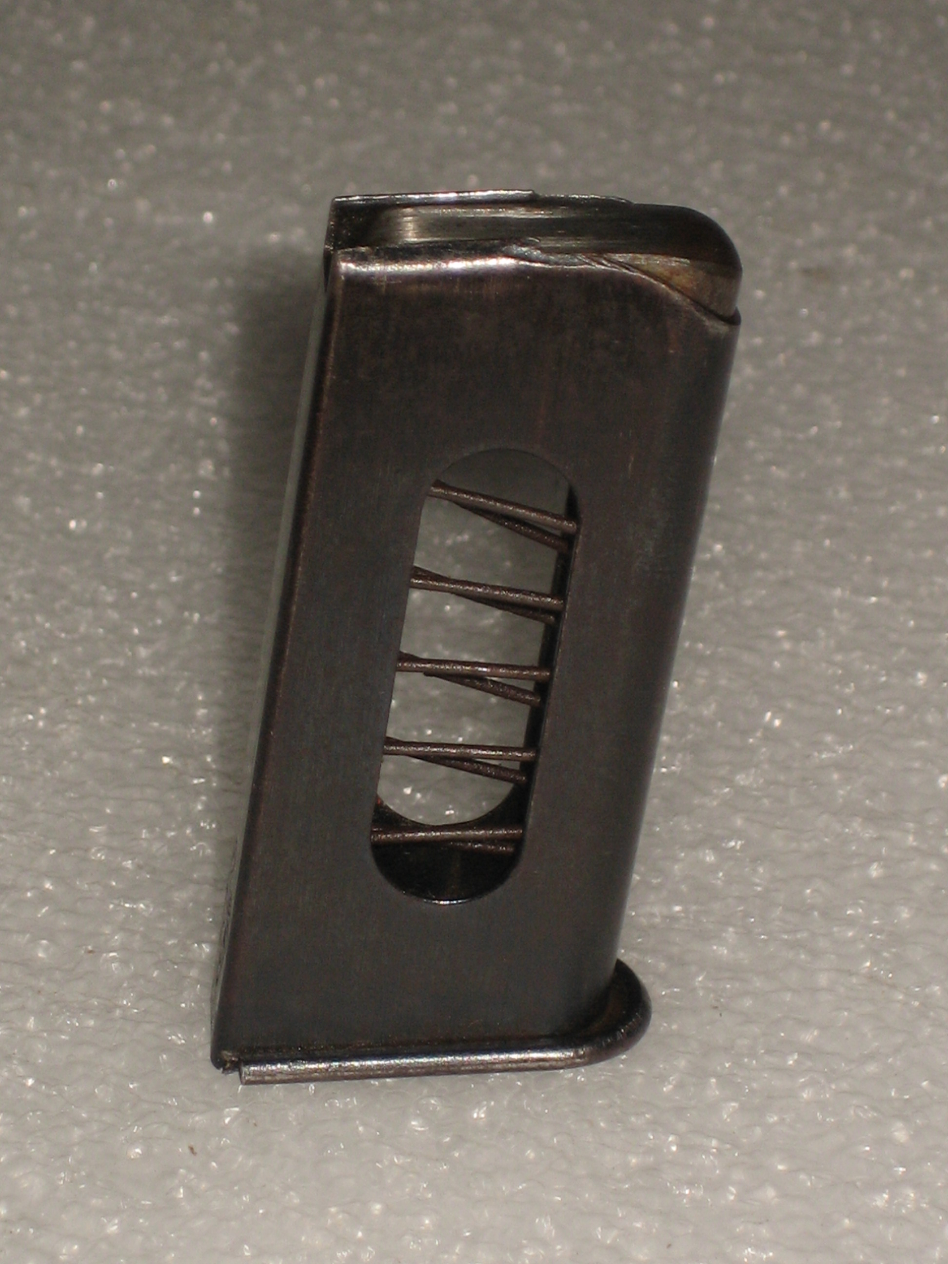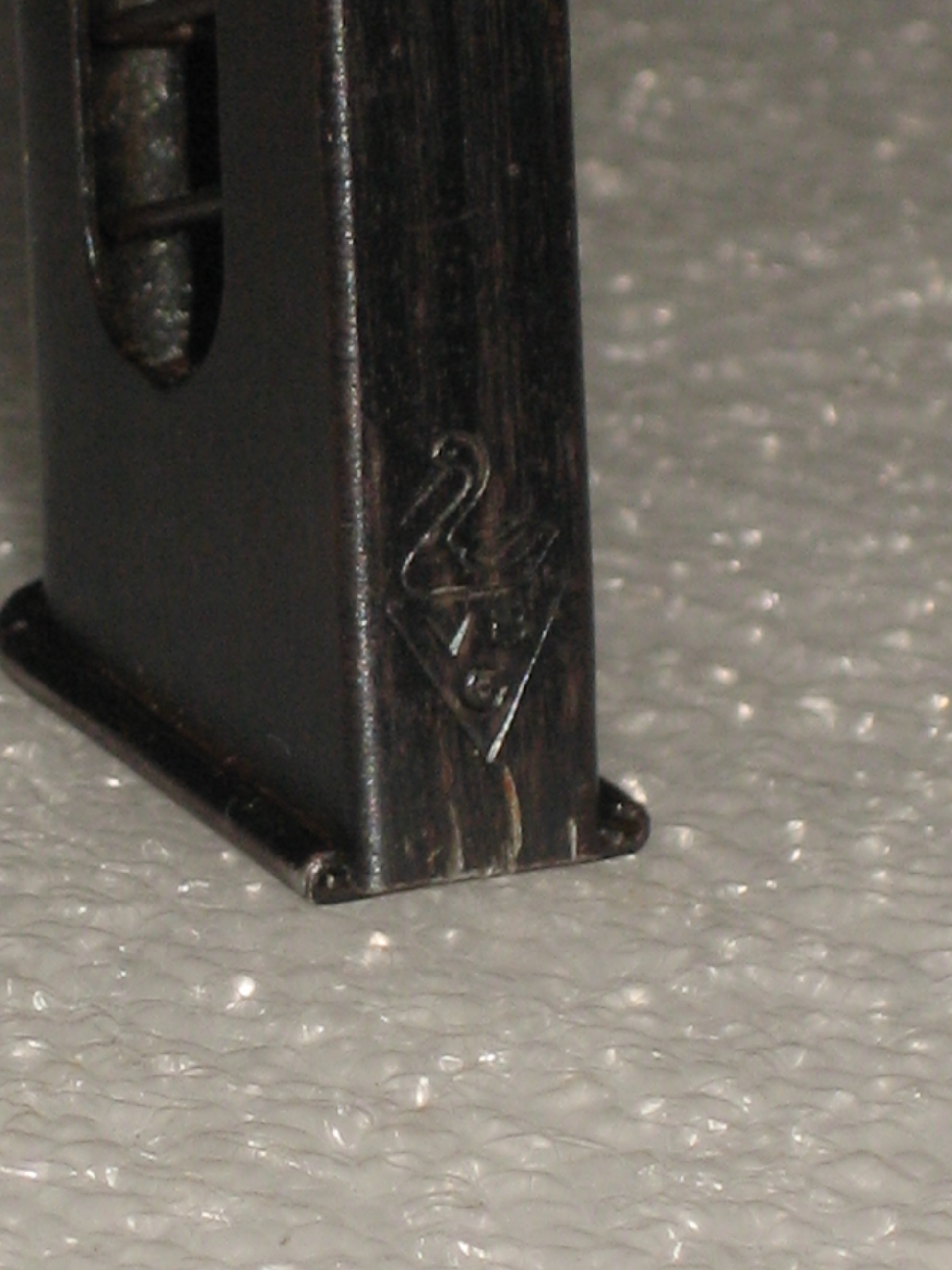 Le chargeur est une tôle qui a été matricée puis soudée. Il est surprenant de voir que la soudure n’est pas située à l’arrière mais sur la partie latérale gauche. Ceci est peu courant d’autant plus que le chargeur du pistolet Baby comporte des ouvertures latérales. La pièce est parfaitement réalisée et n’a pas souffert des utilisations passées. La soudure est fine et peu visible, elle ne montre pas de signe de faiblesse. L’emplacement des ouvertures latérales ne constituent manifestement pas un problème pour la soudure .