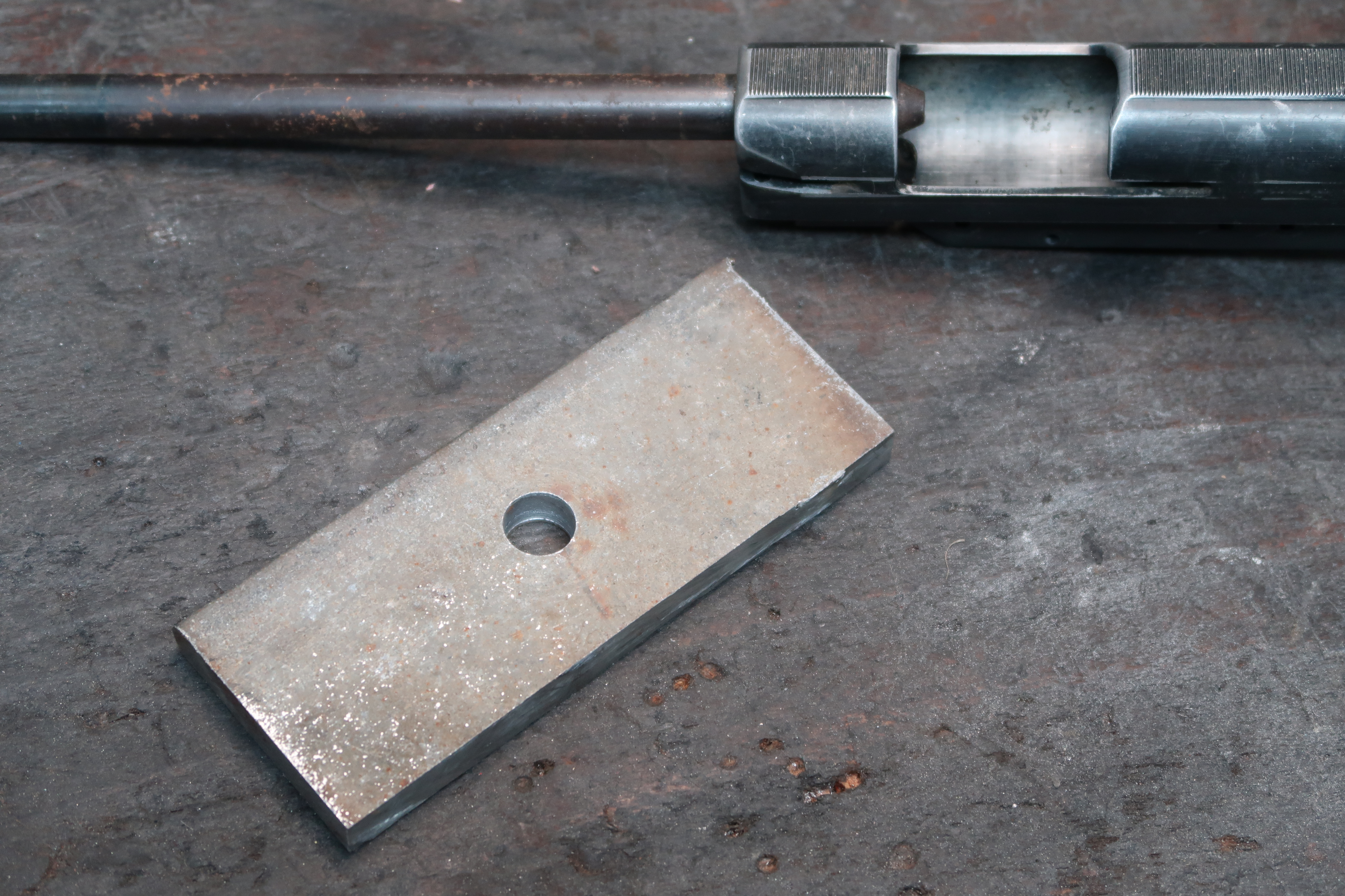 - j’ai percé une plaque d’acier d’environ 10 mm d’épaisseur avec un forêt de diamètre 13 mm. Elle va me servir de butée de boite de culasse ;