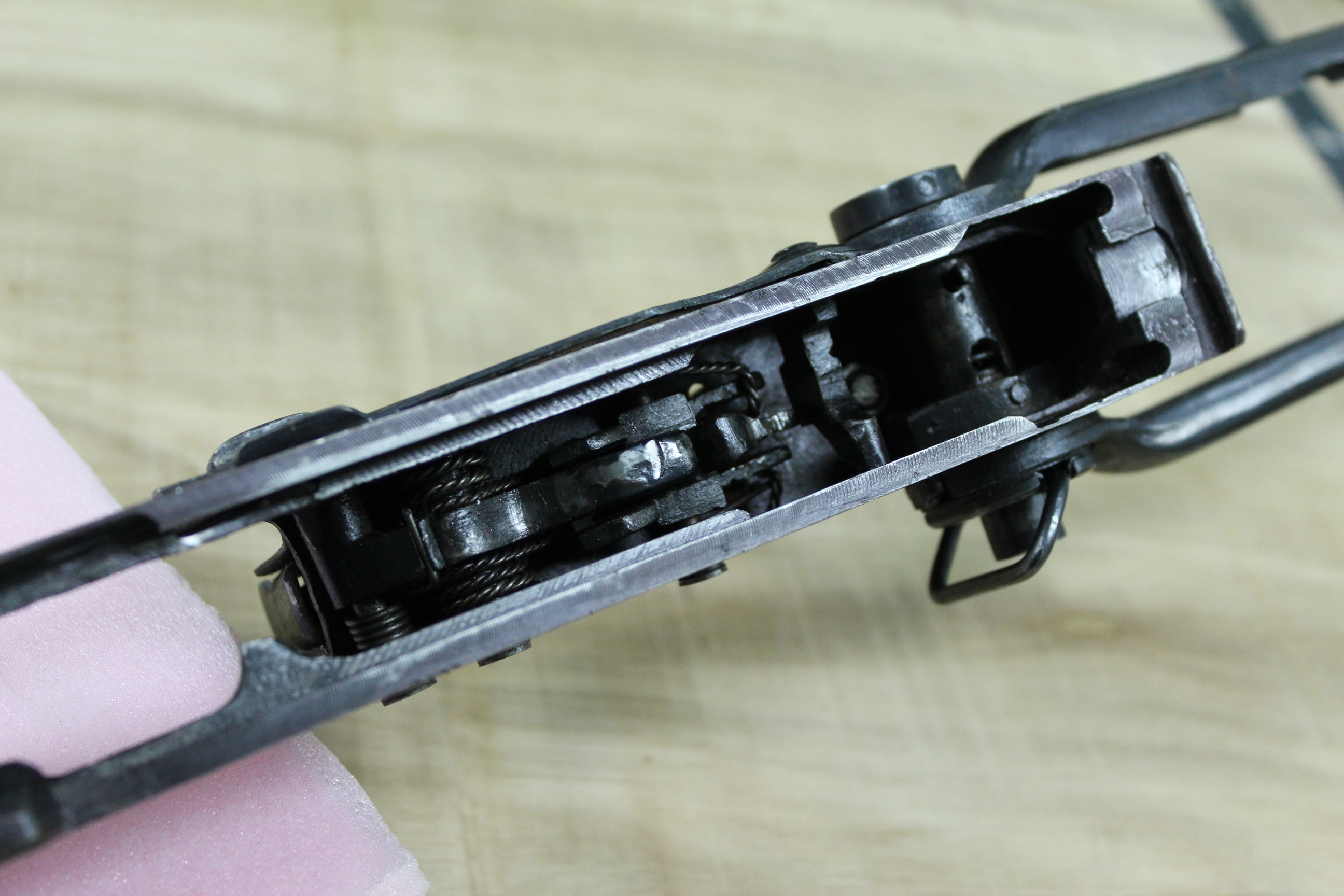 Soit une carcasse estampée obtenue par le pliage d’une tôle de 1 mm sur laquelle viendra se riveter le support de canon (à l’extrémité avant), le support de crosse (à l’extrémité arrière), le rail de l’éjecteur (soudé par point à l’intérieur coté gauche), le rail opposé à l’éjecteur (soudé par point à l’intérieur coté droit).