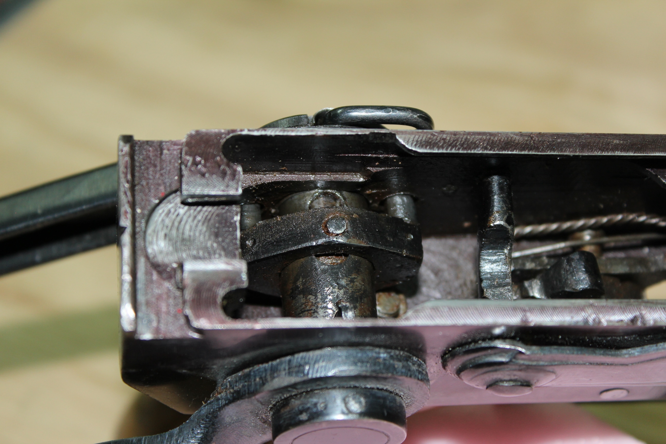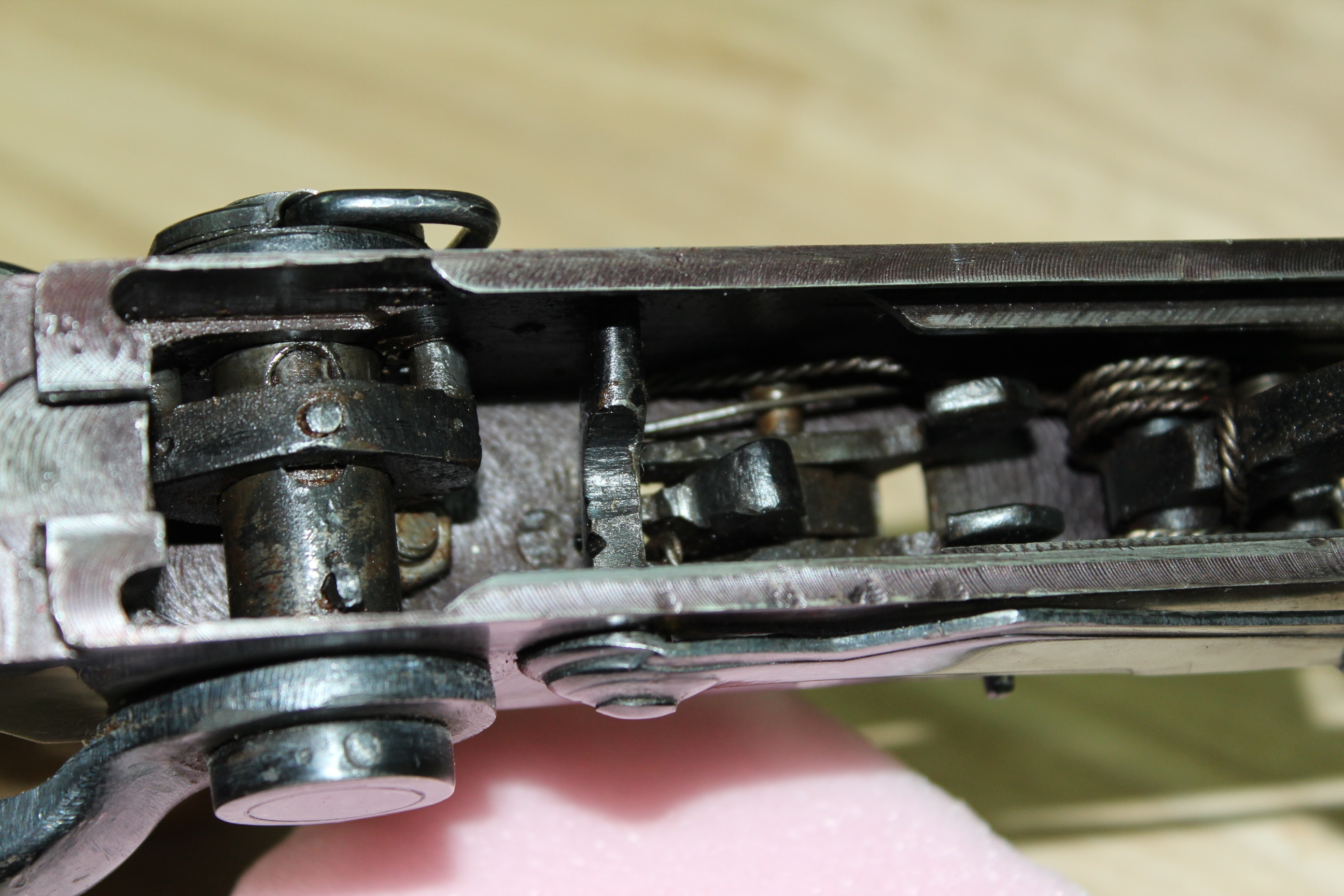 La gâchette est de travers dans son logement. Il provient d’un jeu excessif entre l’axe et son logement et d’un jeu important entre la gâchette et la queue de détente.