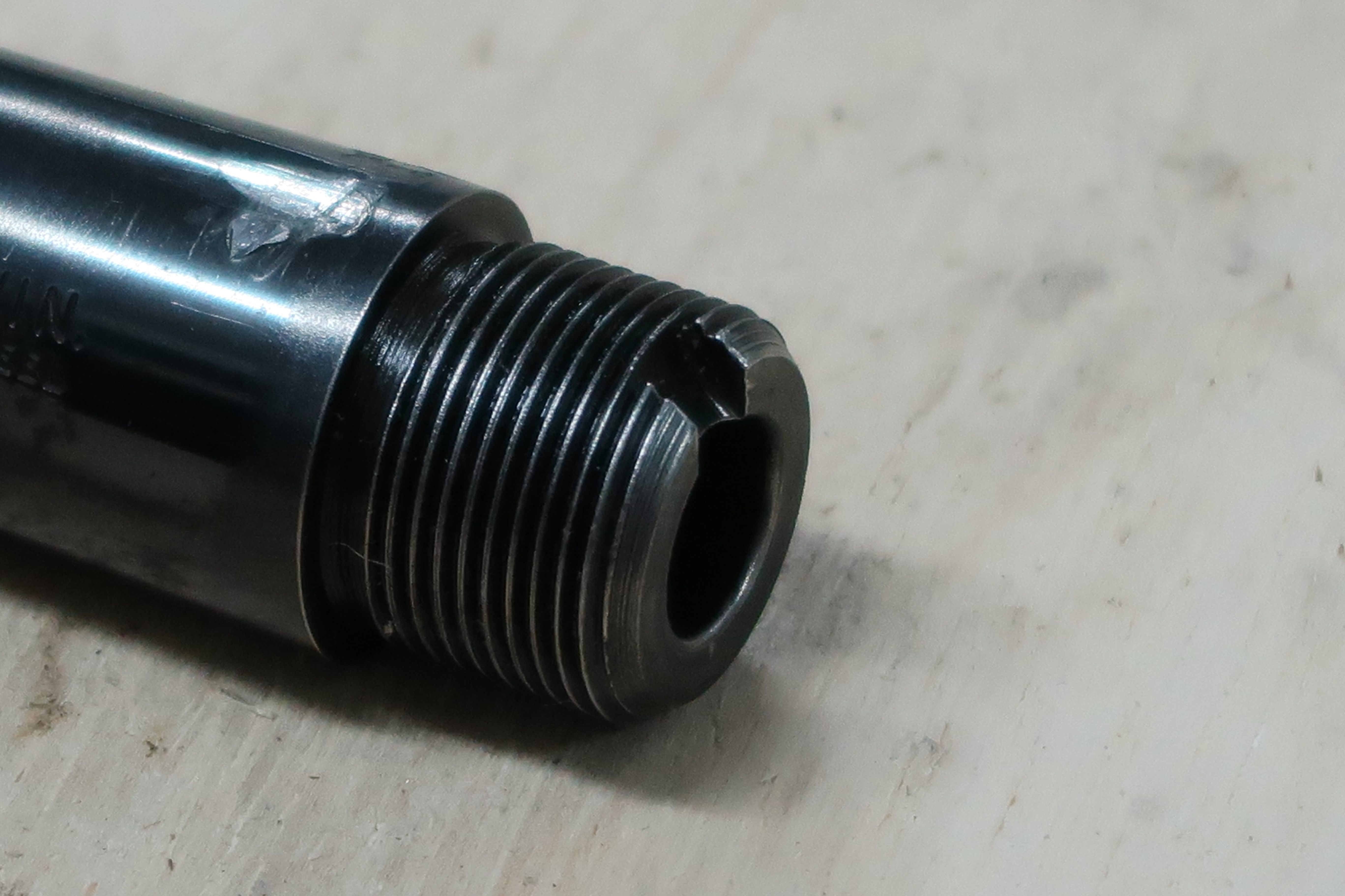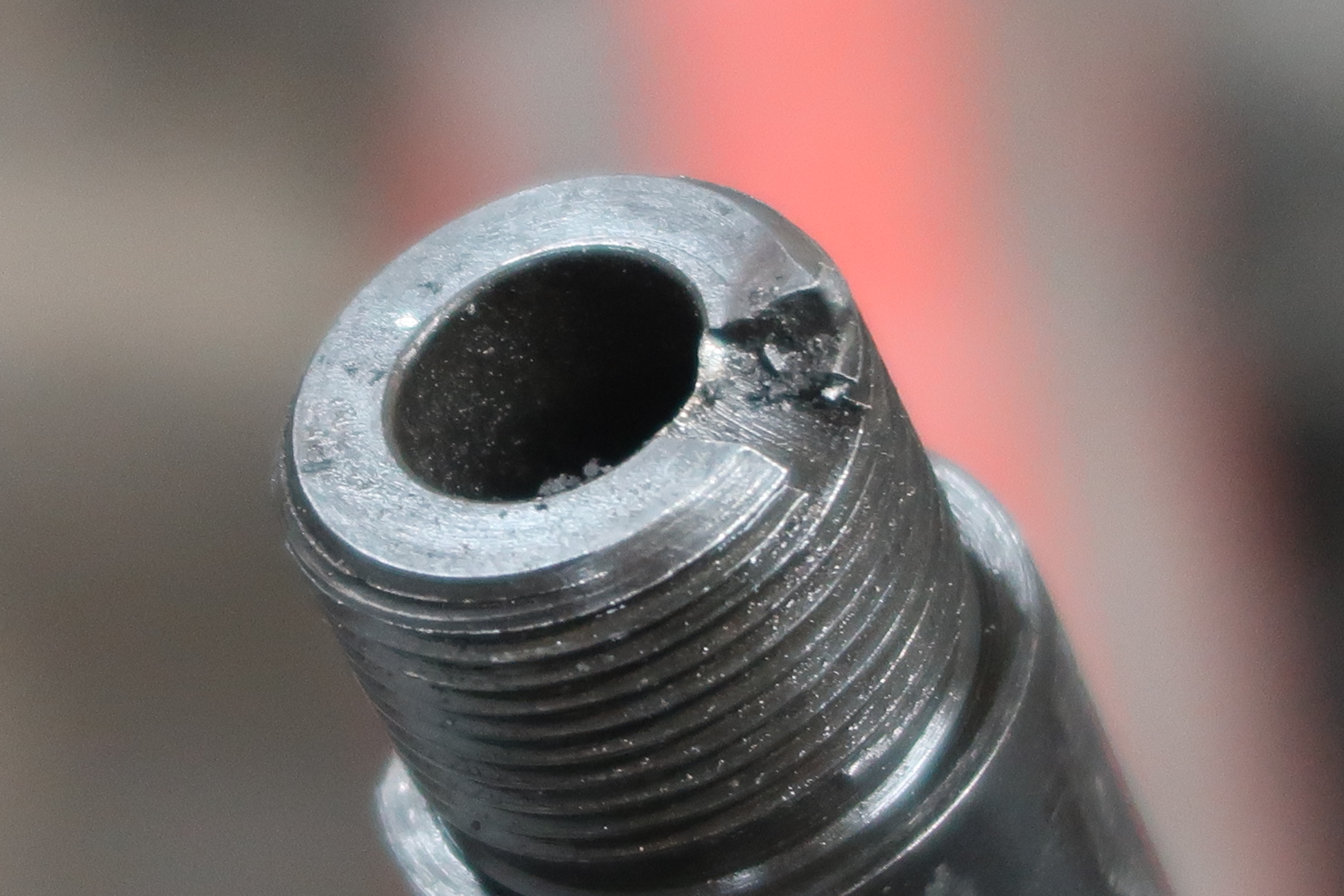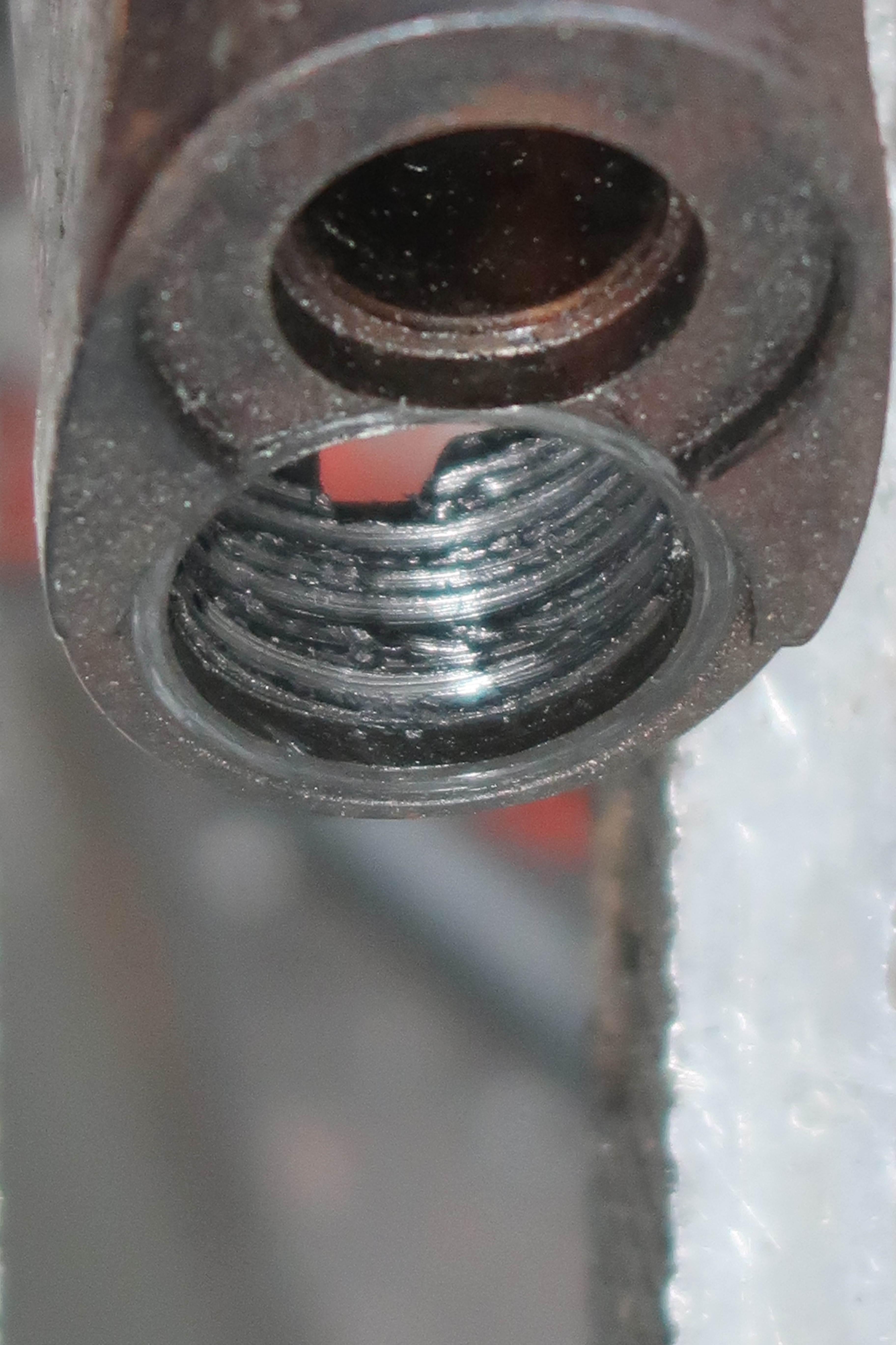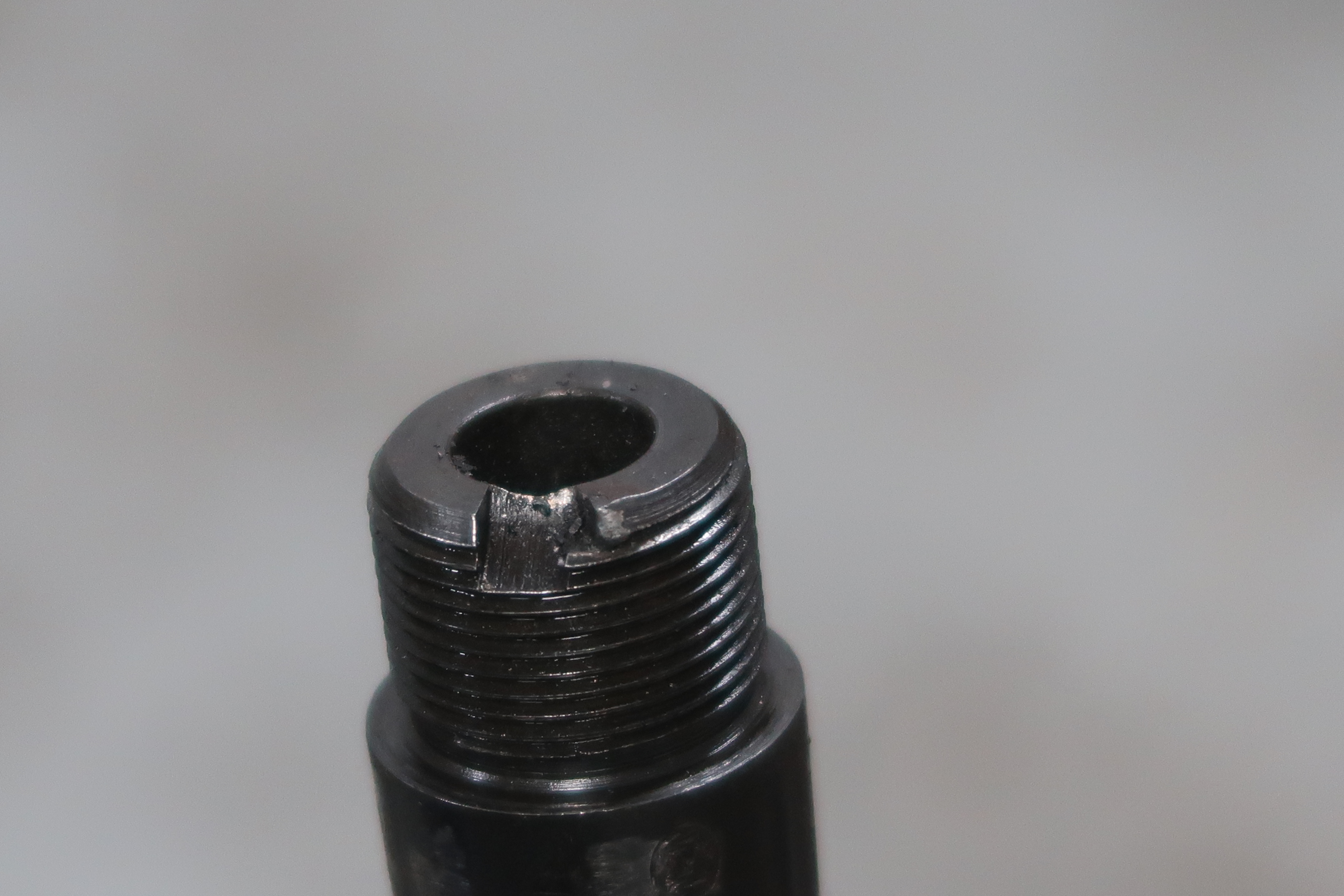 La petite bavure provoquée par l’extracteur sur le canon peut, selon son ampleur, toucher le filetage de la boite de culasse. Les photos ci-dessous montrent le résultat. Dans notre exemple, oui, la déformation est suffisante pour toucher le filetage du canon.