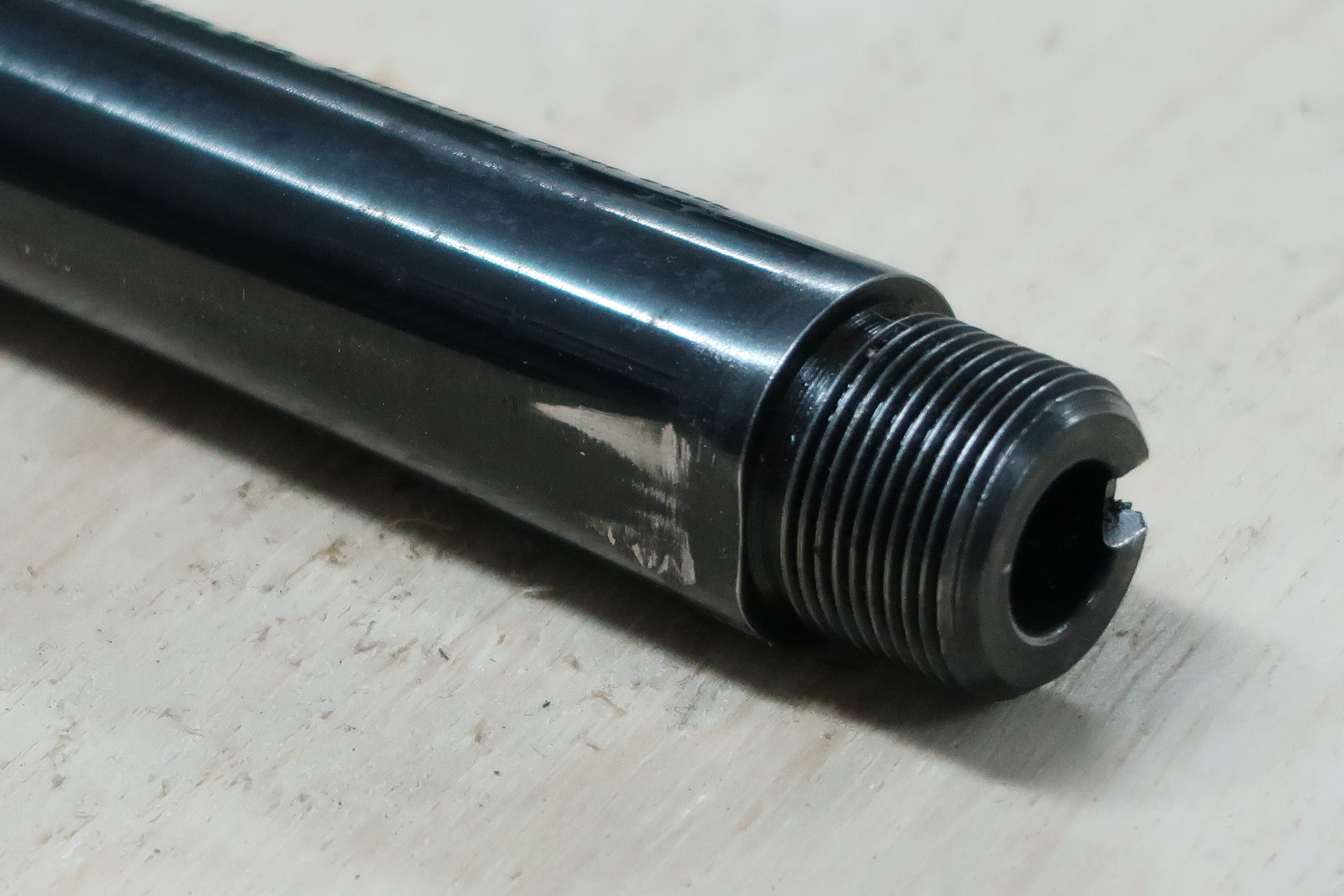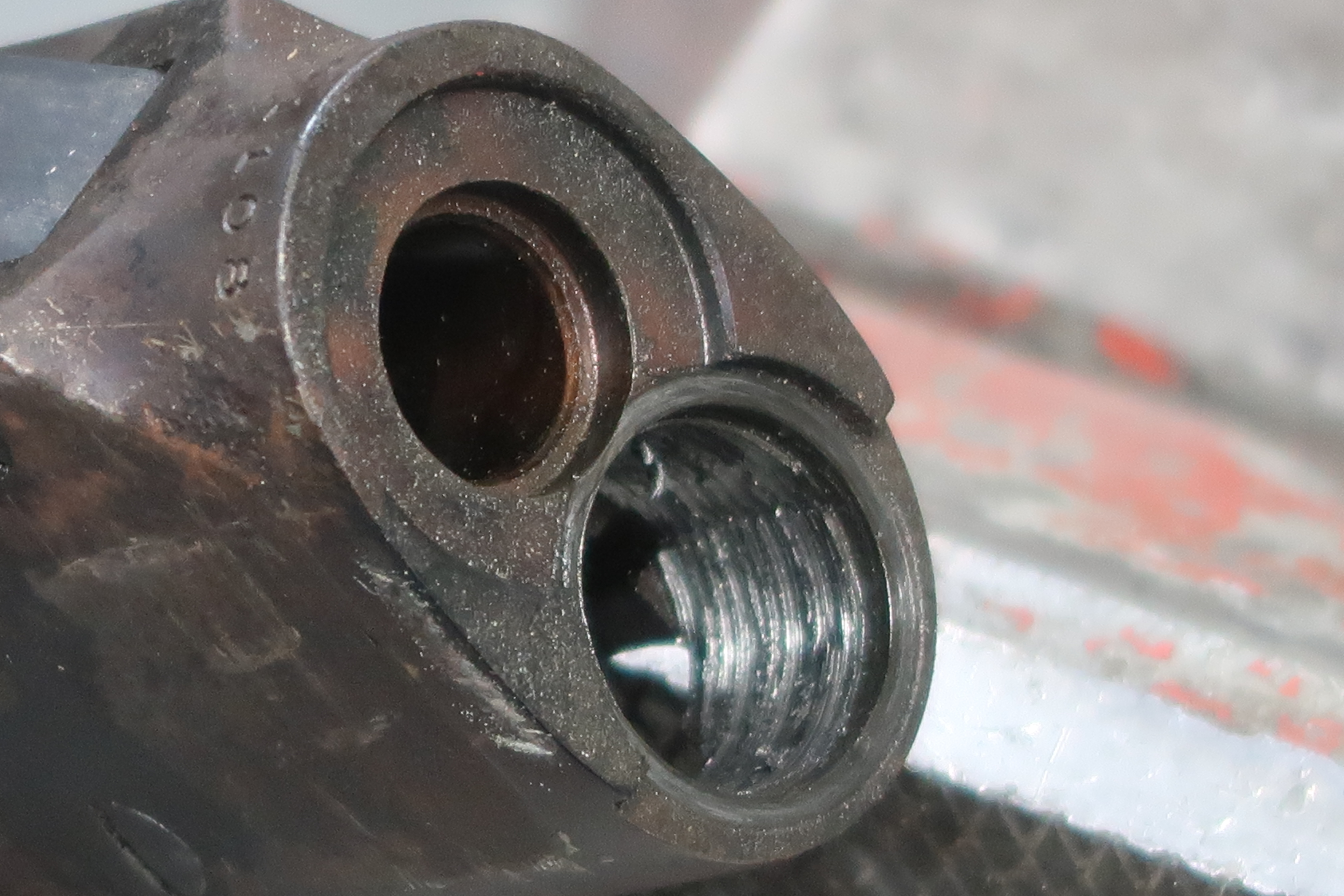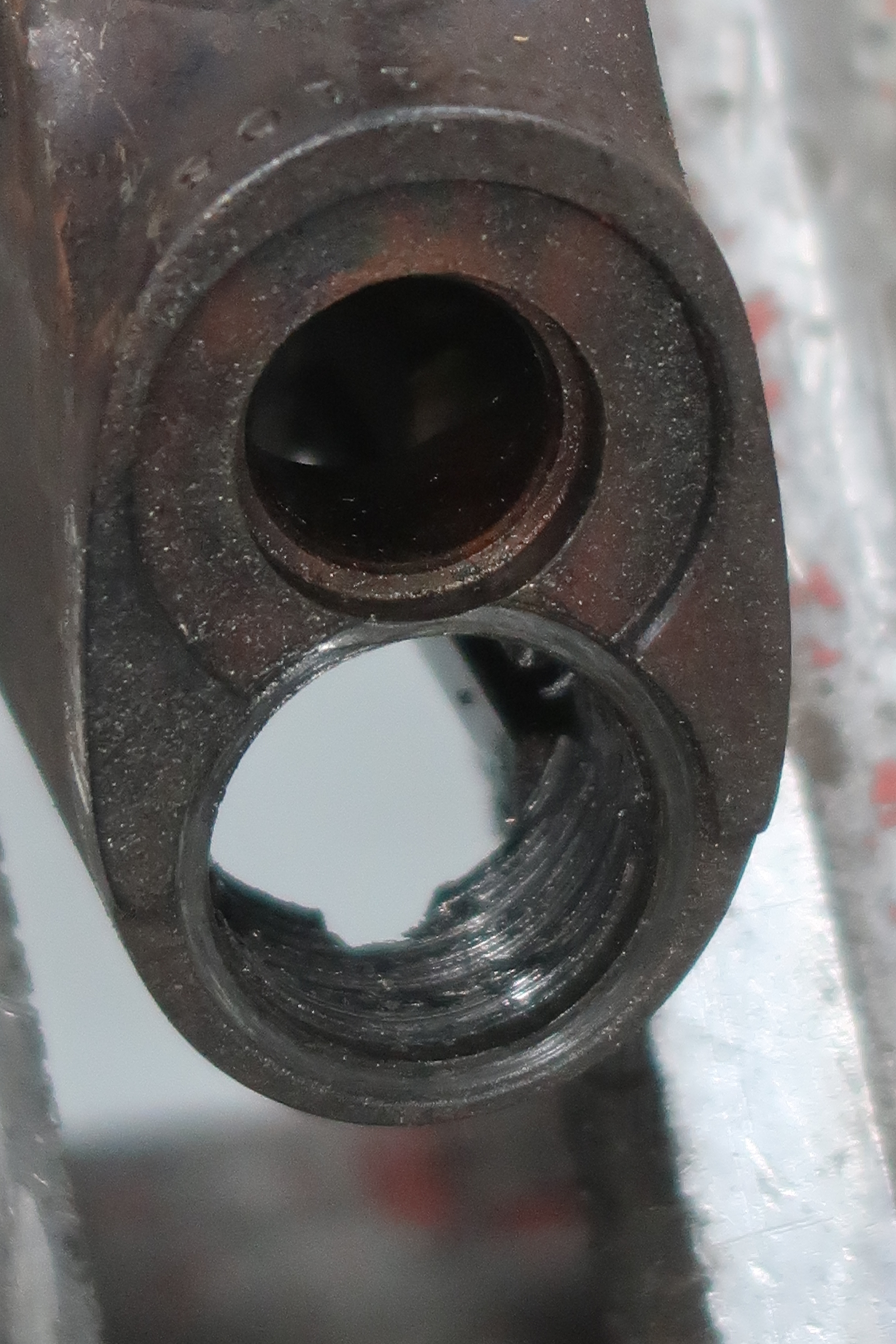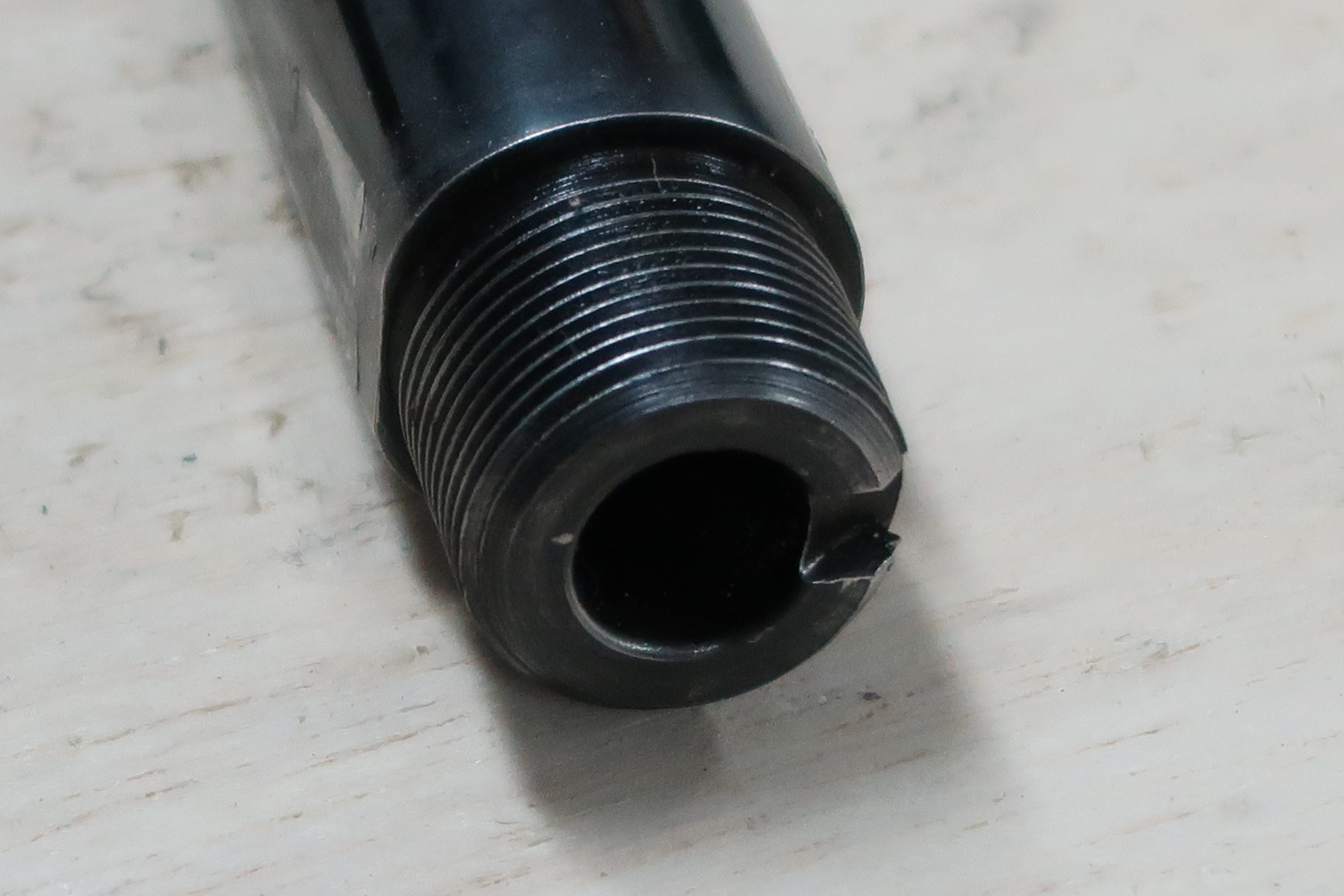 La petite bavure provoquée par l’extracteur sur le canon peut, selon son ampleur, toucher le filetage de la boite de culasse. Les photos ci-dessous montrent le résultat. Dans notre exemple, oui, la déformation est suffisante pour toucher le filetage du canon.