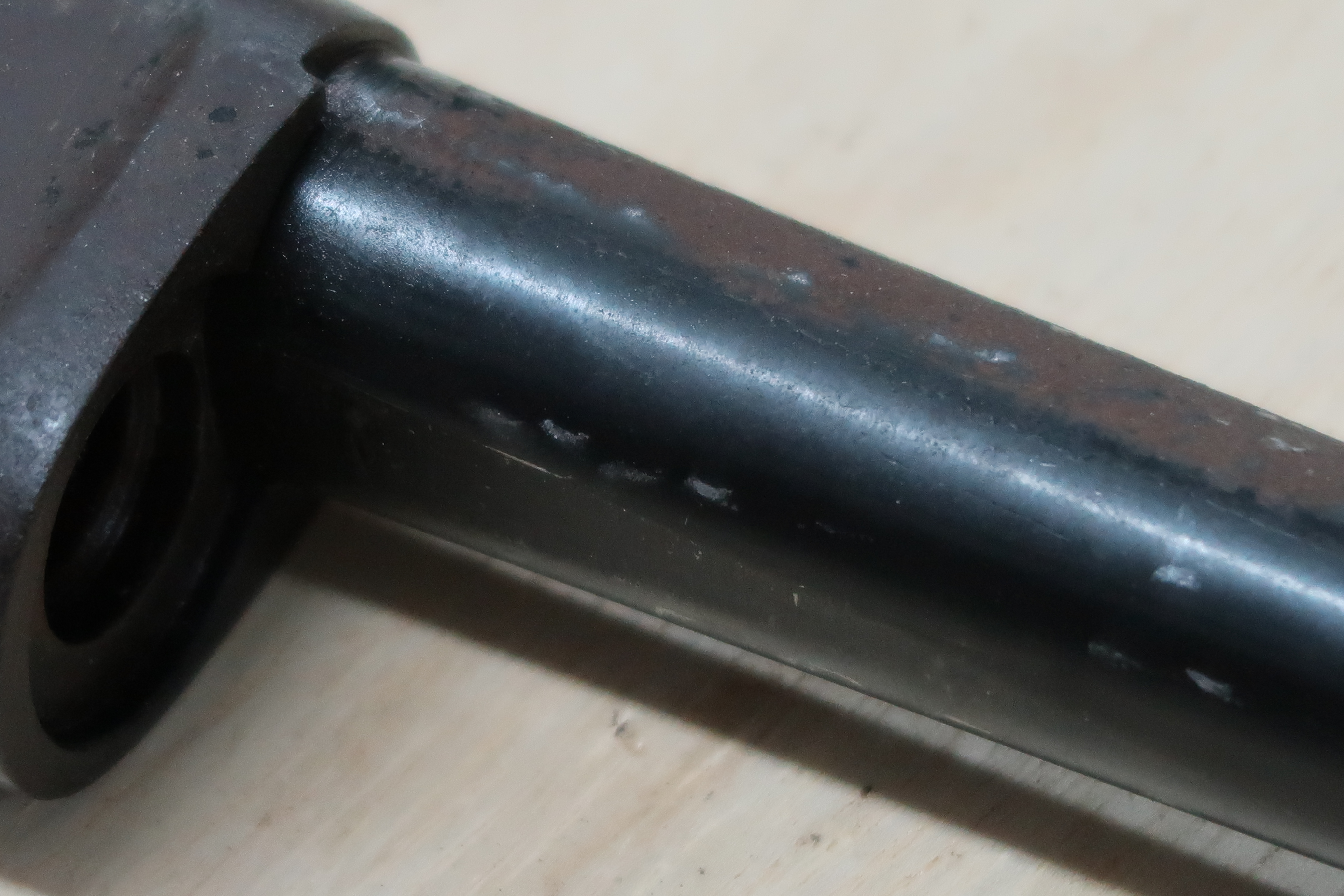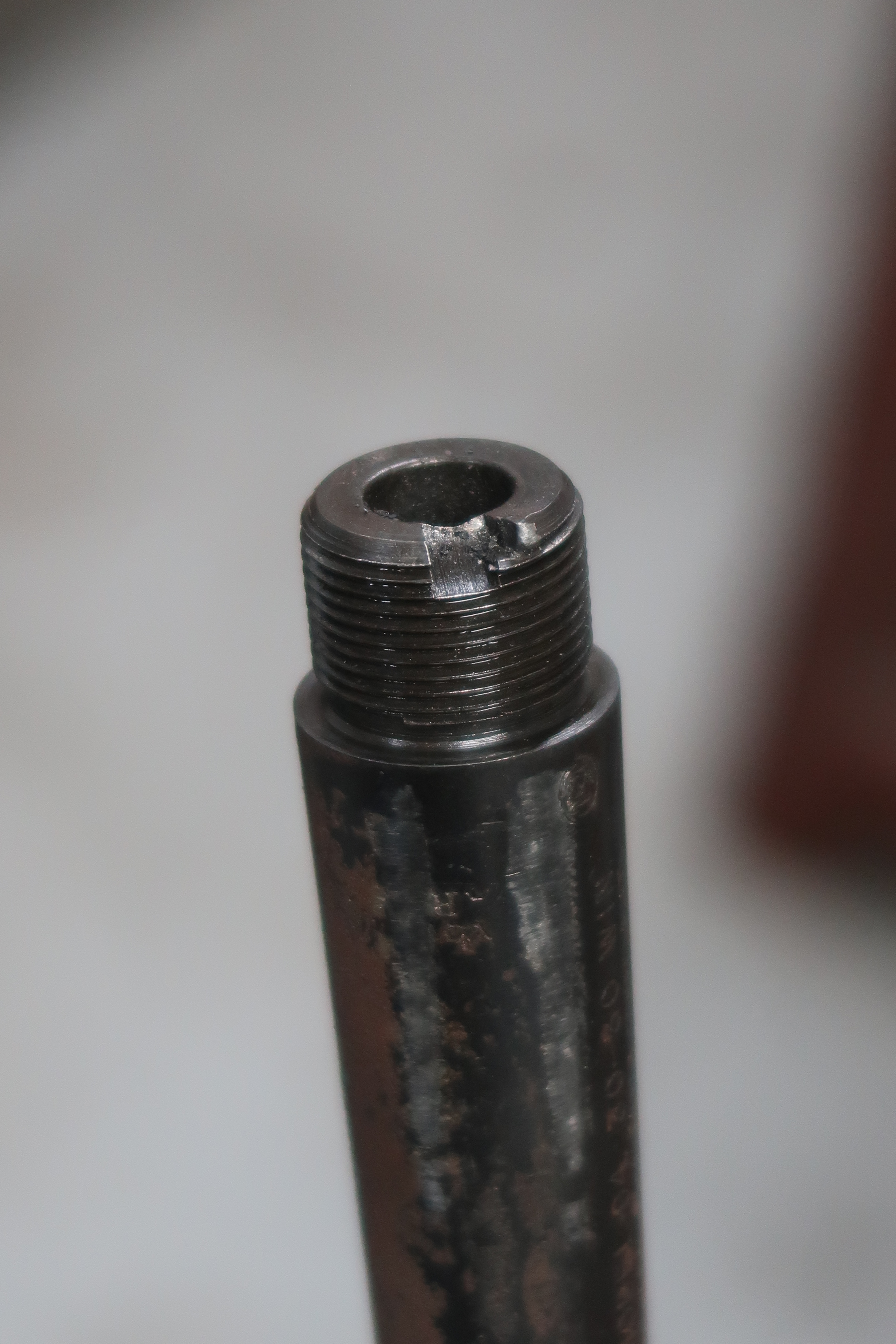 En ce qui concerne le canon de l’arme qui nous réunie ce jour, il est vissé sur la boite de culasse. Le sens de vissage est standard : à gauche. Le diamètre de base du filetage est :  20,5 mm. Le pas du filetage est : 20 filets par pouce. Pas de trace de frein filet, pas de goupille ni de vis de maintien en place. Seul le couple de serrage assure ce maintien. Les informations ont été obtenues après démontage.