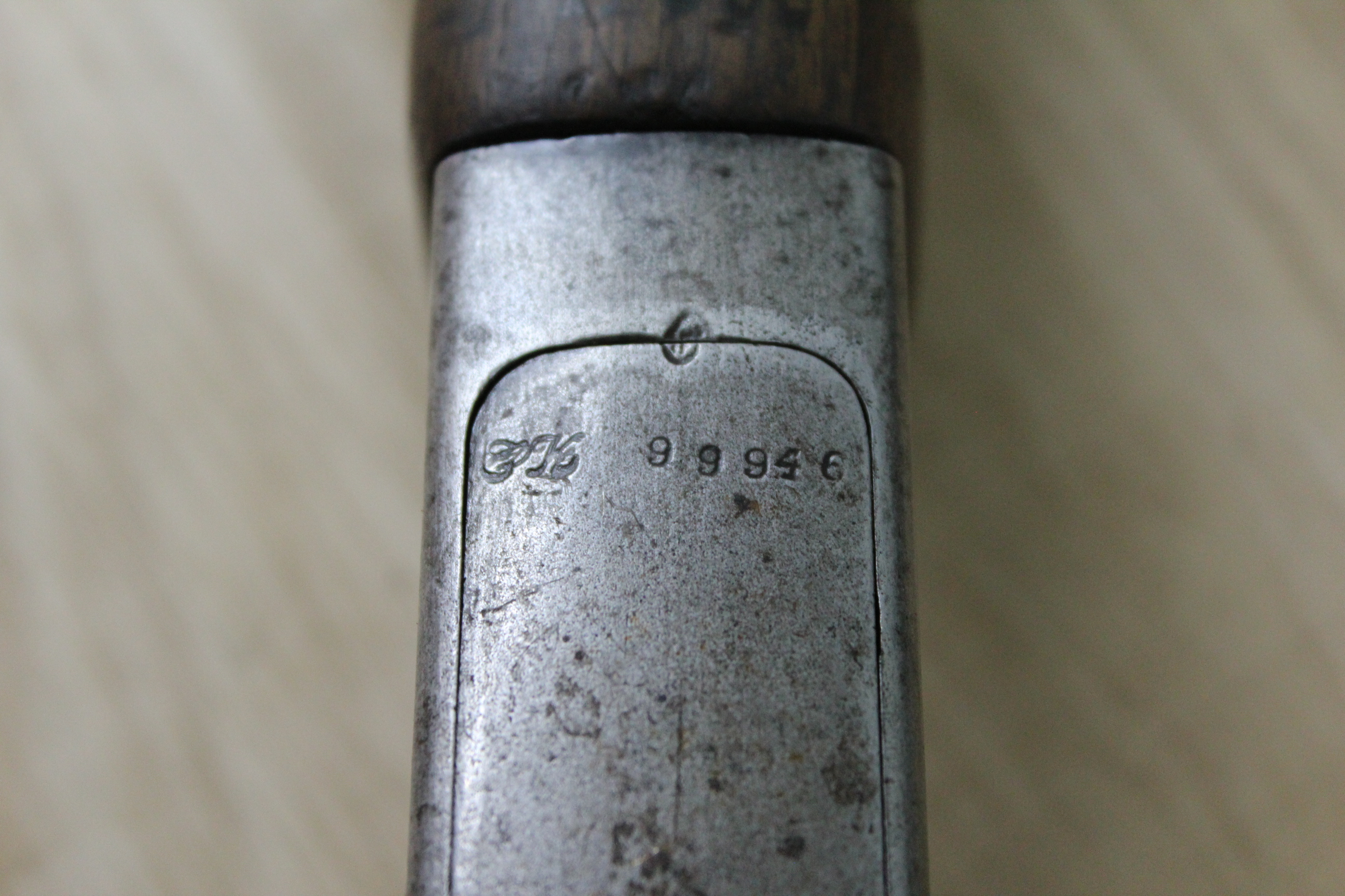 Un marquage me choque, il ne me semble pas d’origine. Les trois derniers chiffre de la date de 1889 semble ne pas avoir la même typographie et sont à mon avis beaucoup plus net. De plus, l’arrête vive du canon produite par la réduction du diamètre externe semble un peu avachie. Les trois derniers numéros ont ils été limés et refrappés ?