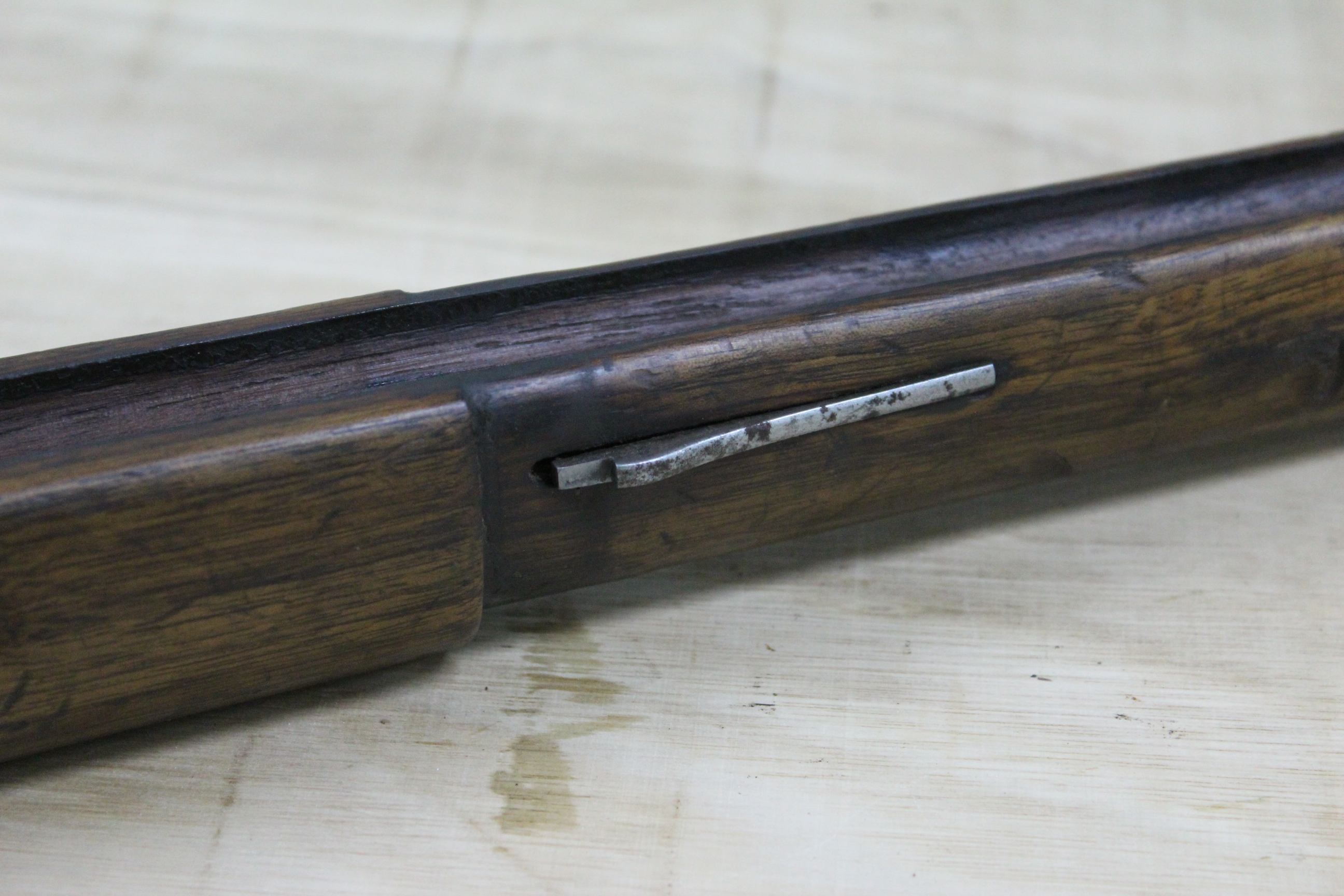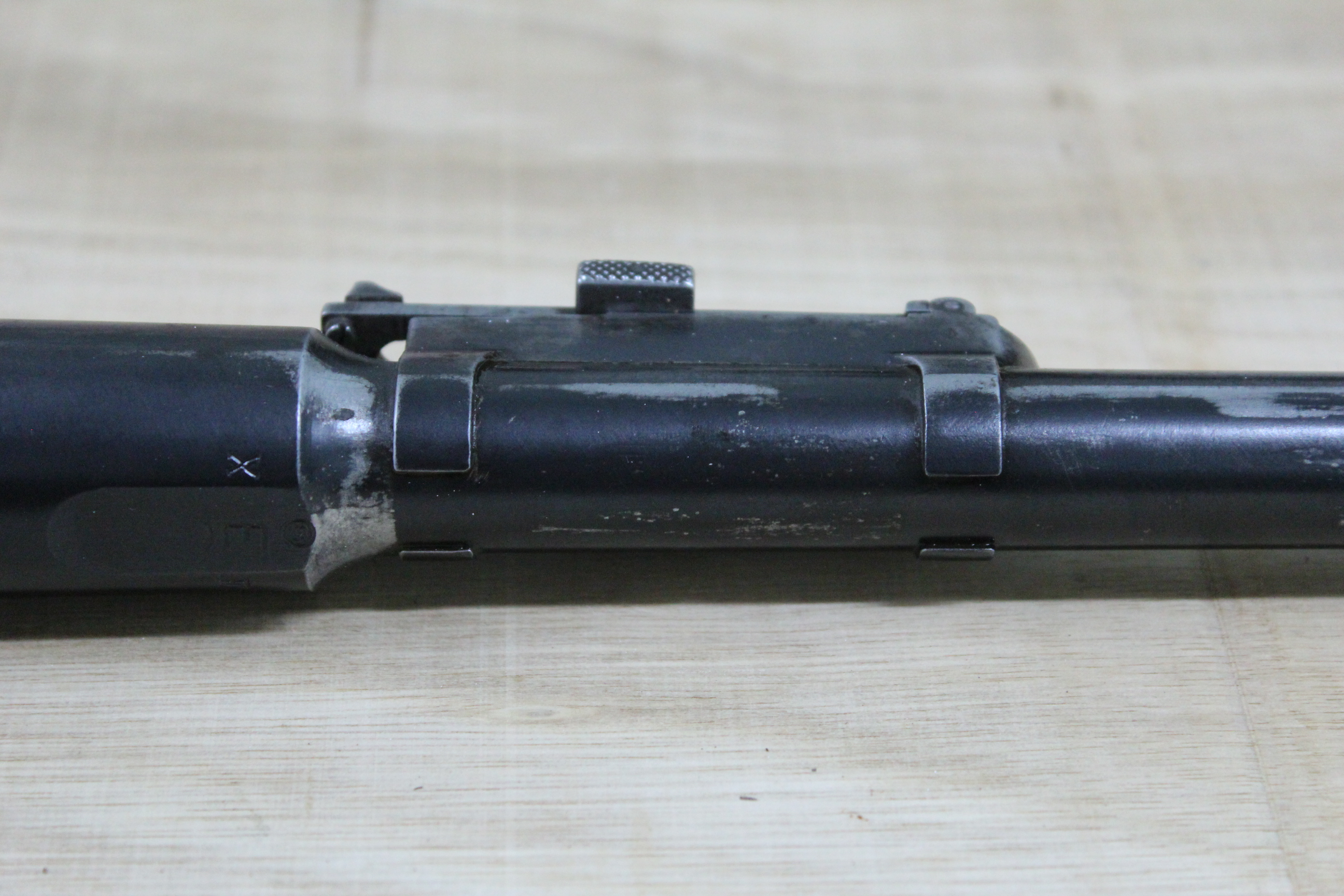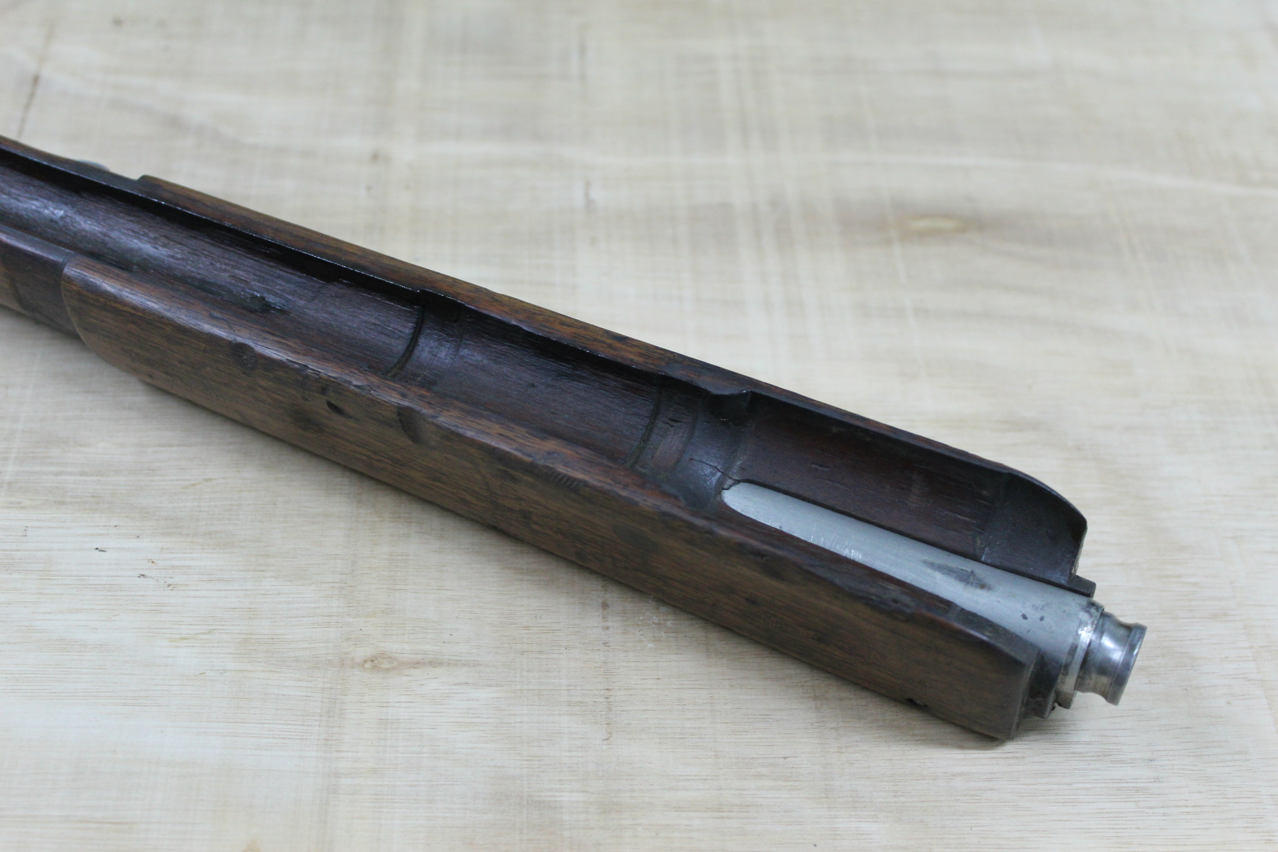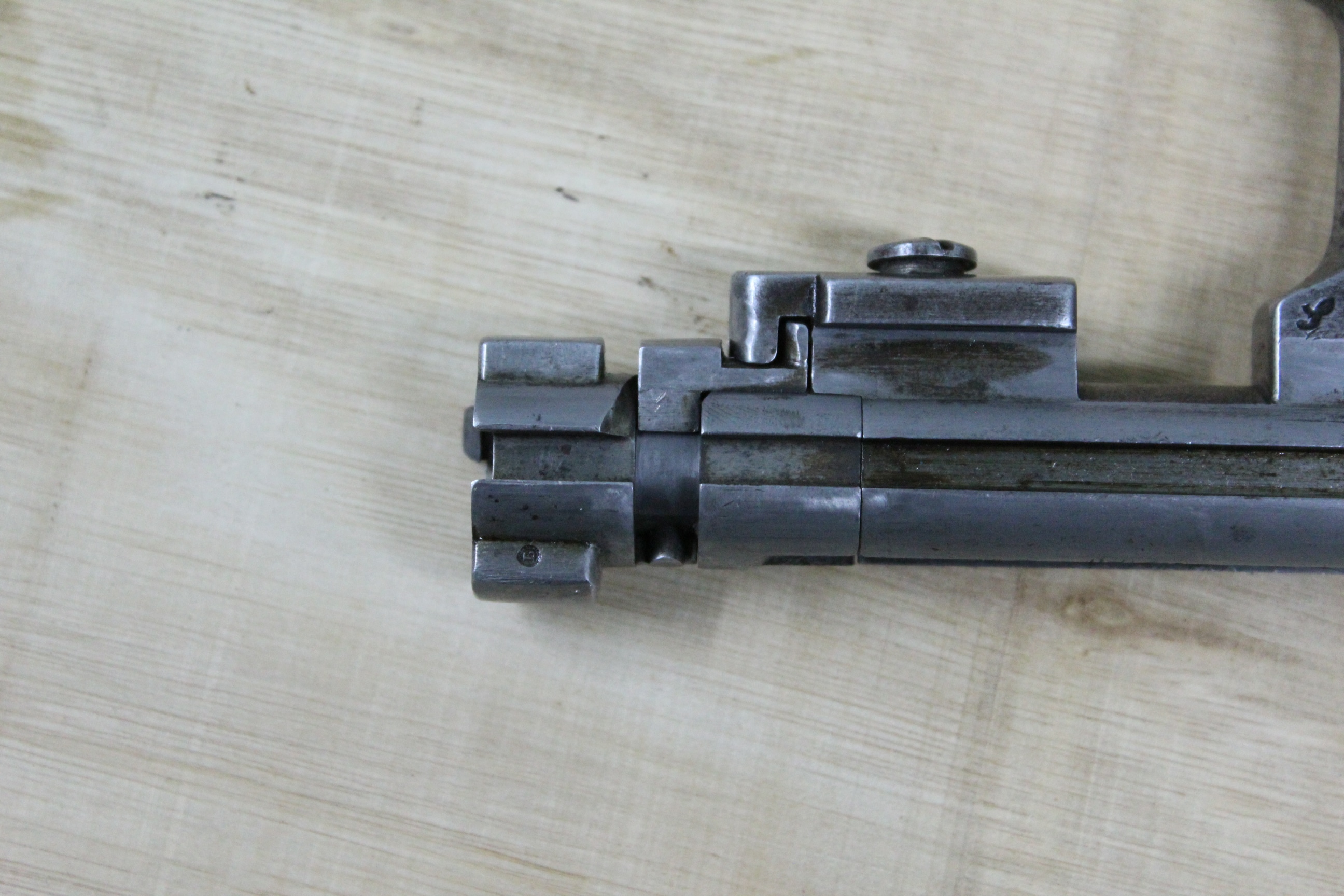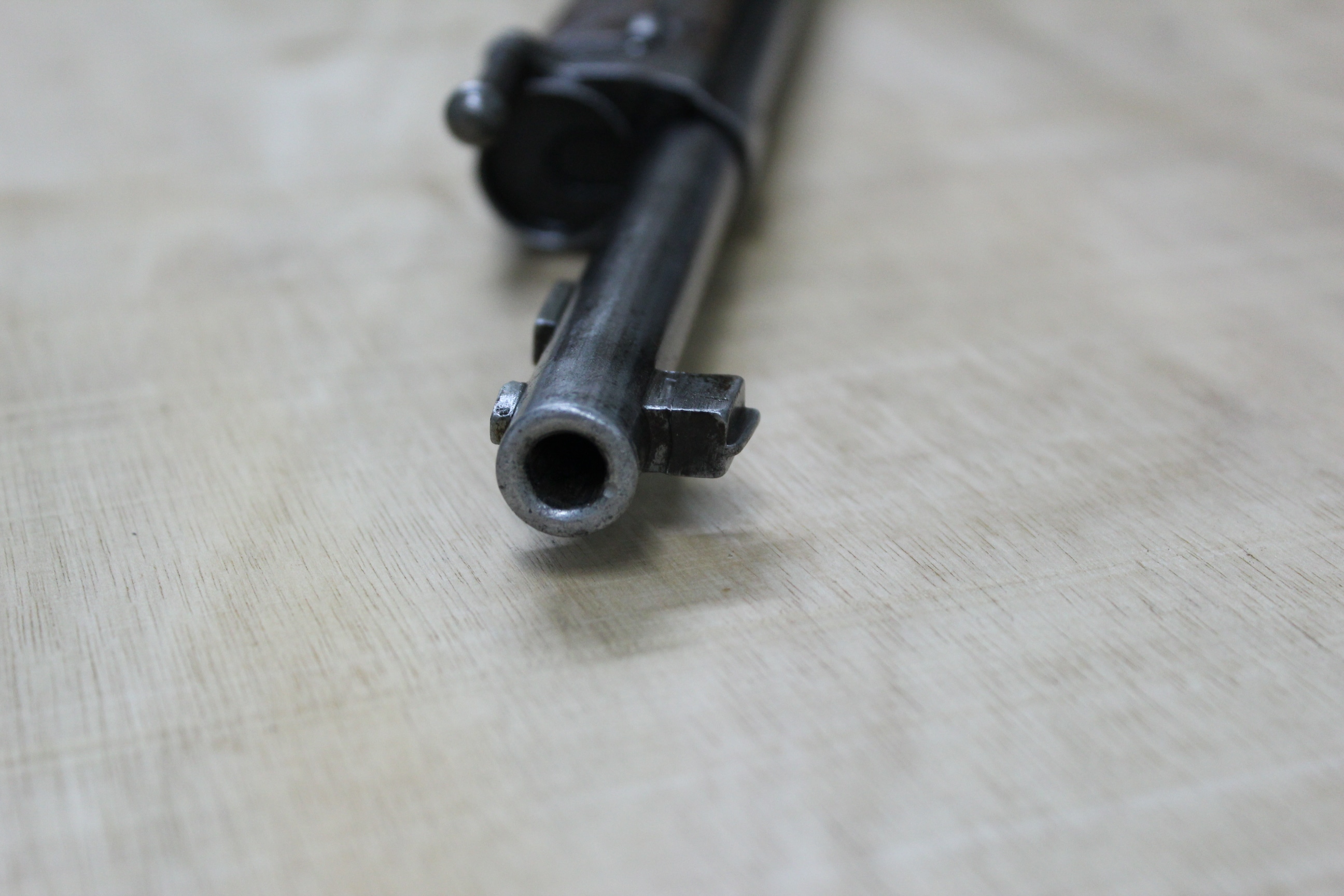 - Vue du dessous du canon et de la fixation de la hausse sur le canon. On remarquera le bronzage du canon qui est en bel état.