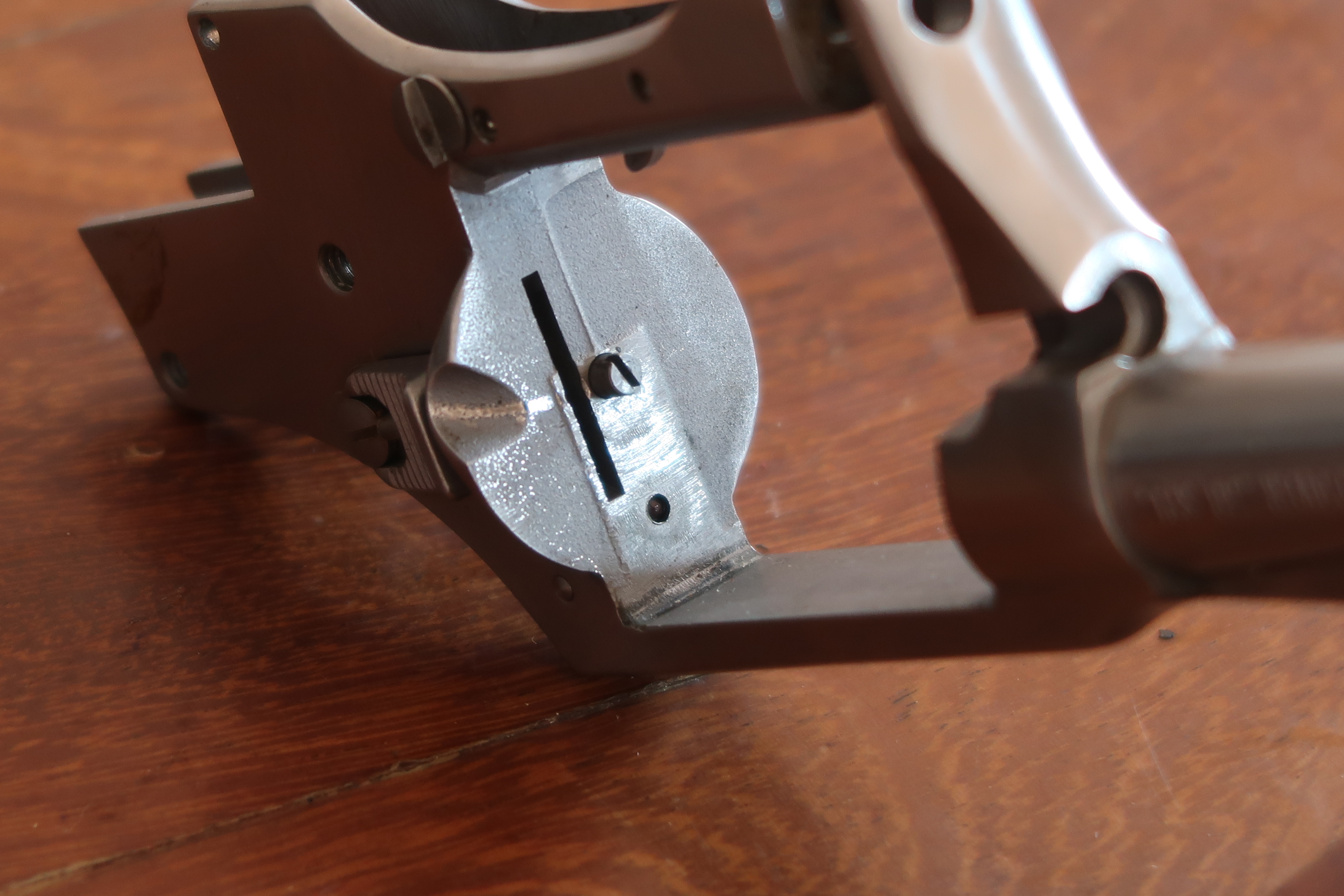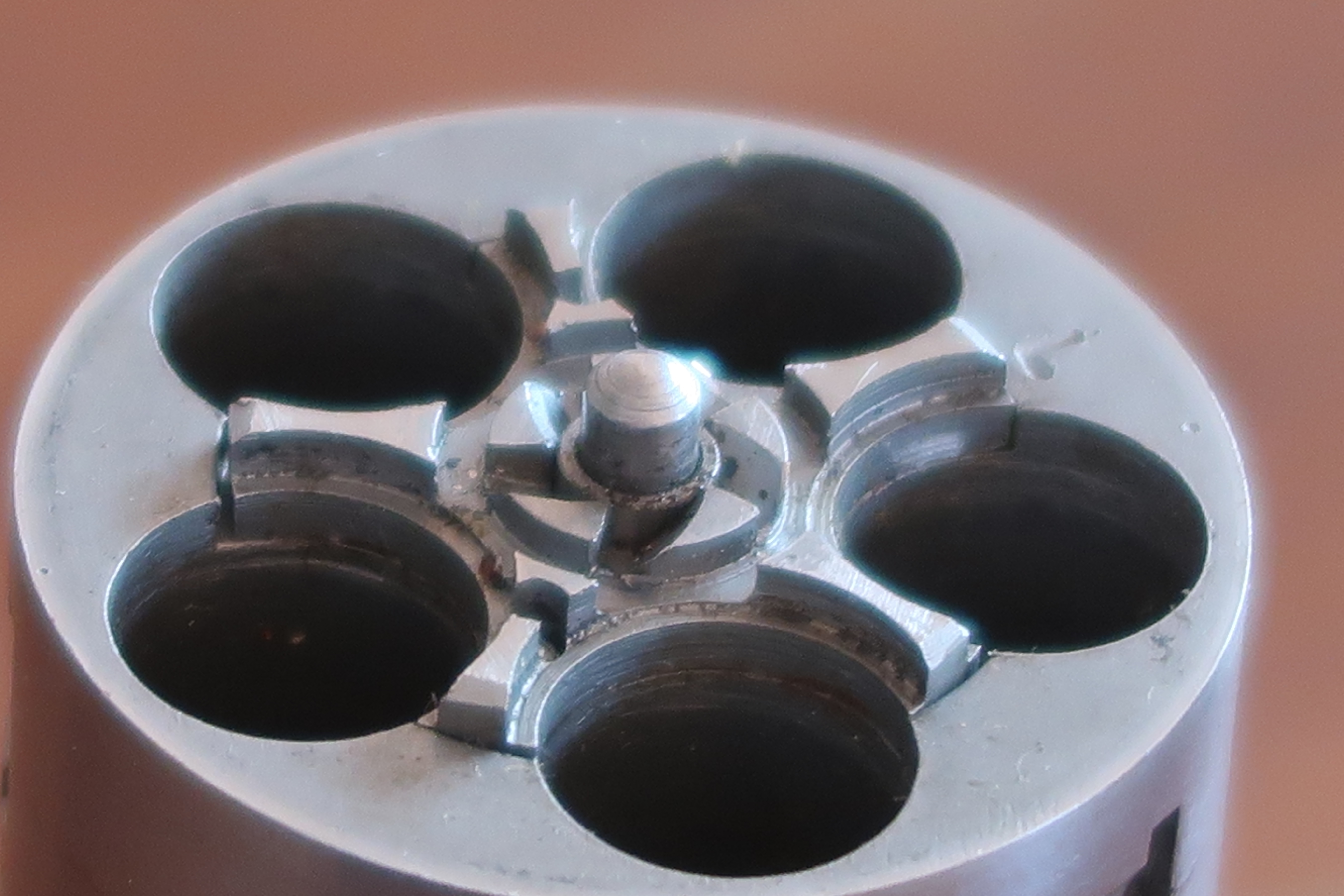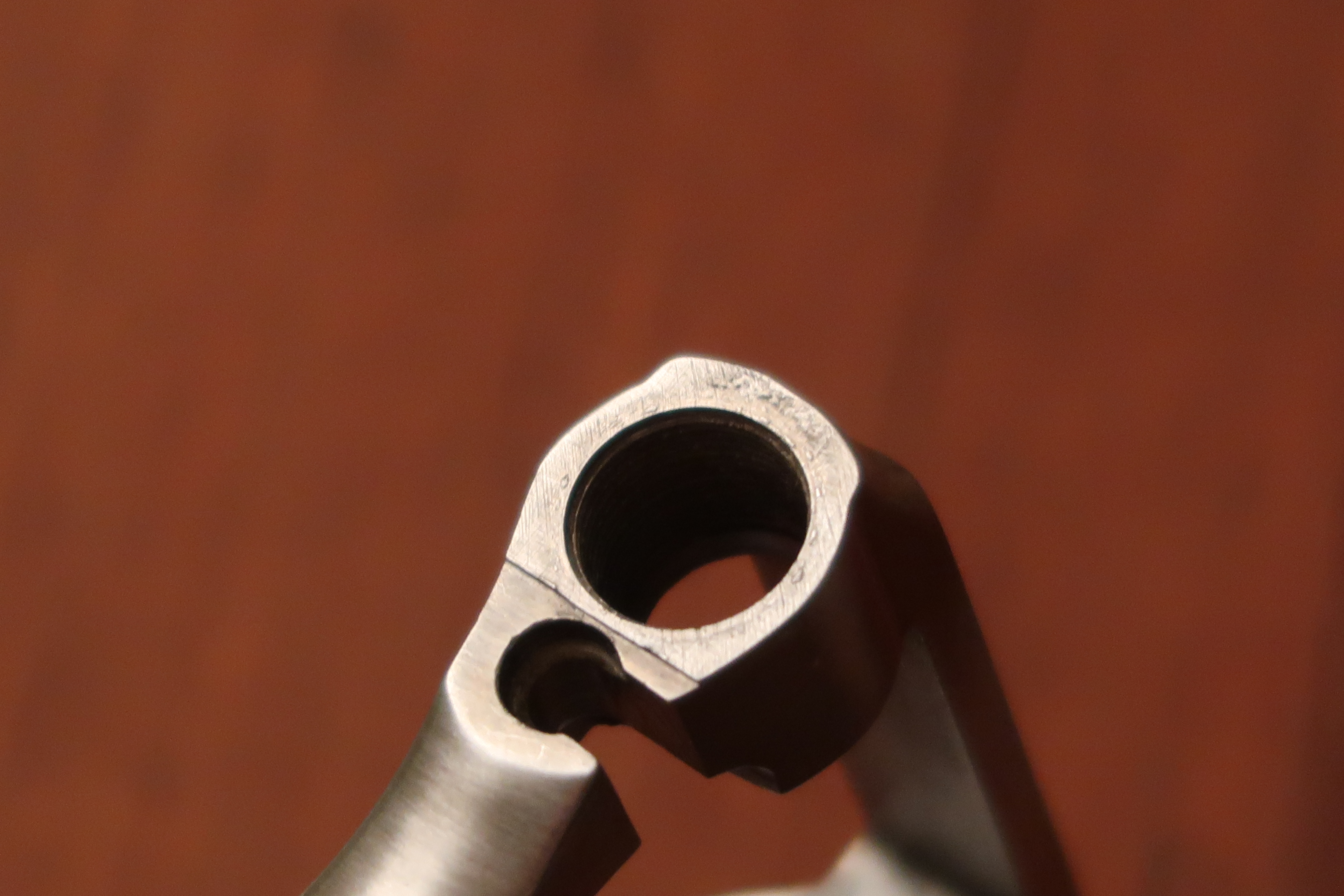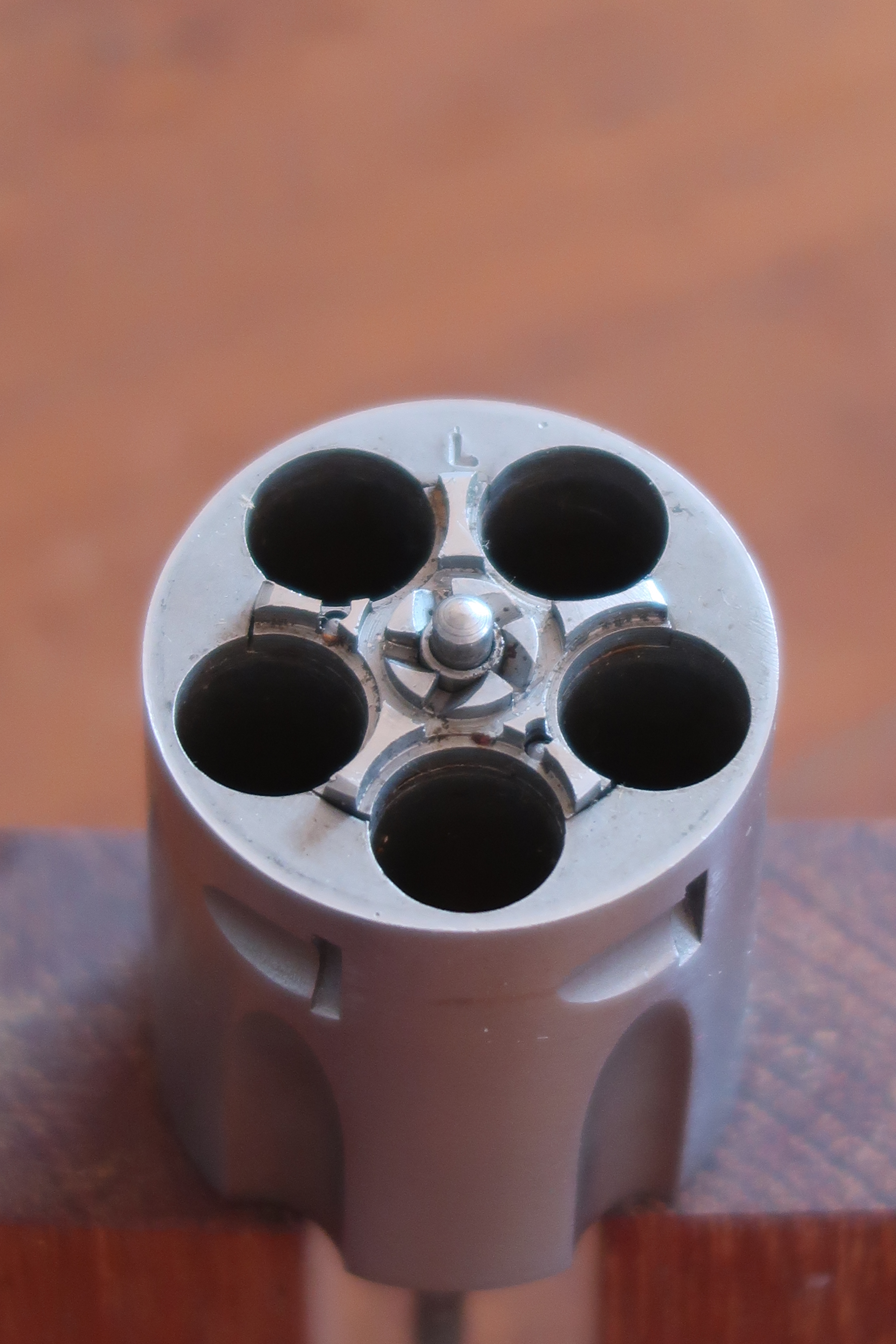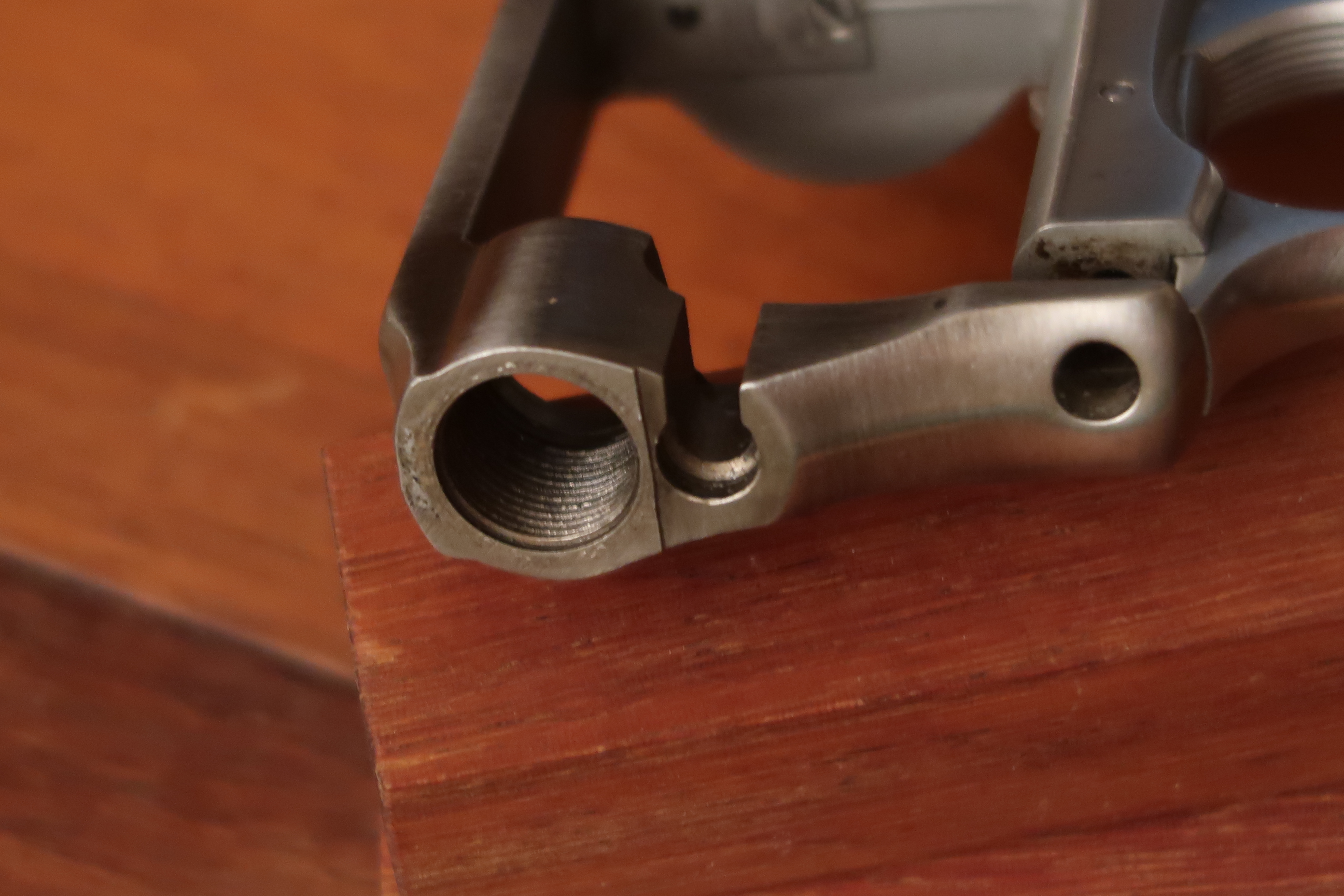 On voit au niveau de la table de tir l’aspect peau d’orange laissé par la micro-fusion. Juste la surface utile est polie. Soit l’appui du culot de la cartouche et l’appui de l’étoile du barillet. Cette surface est plus facile à polir car elle est en légère surépaisseur.