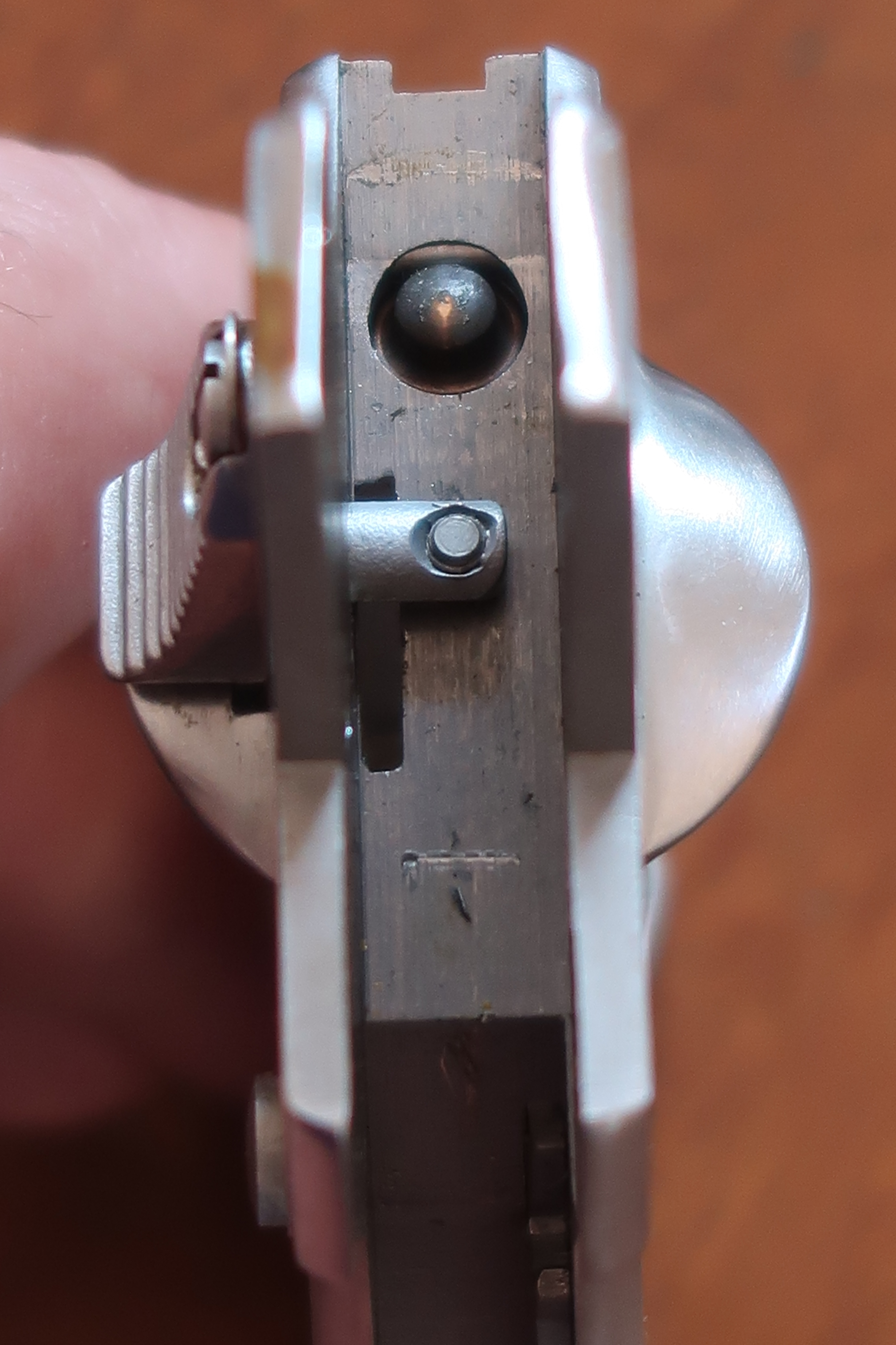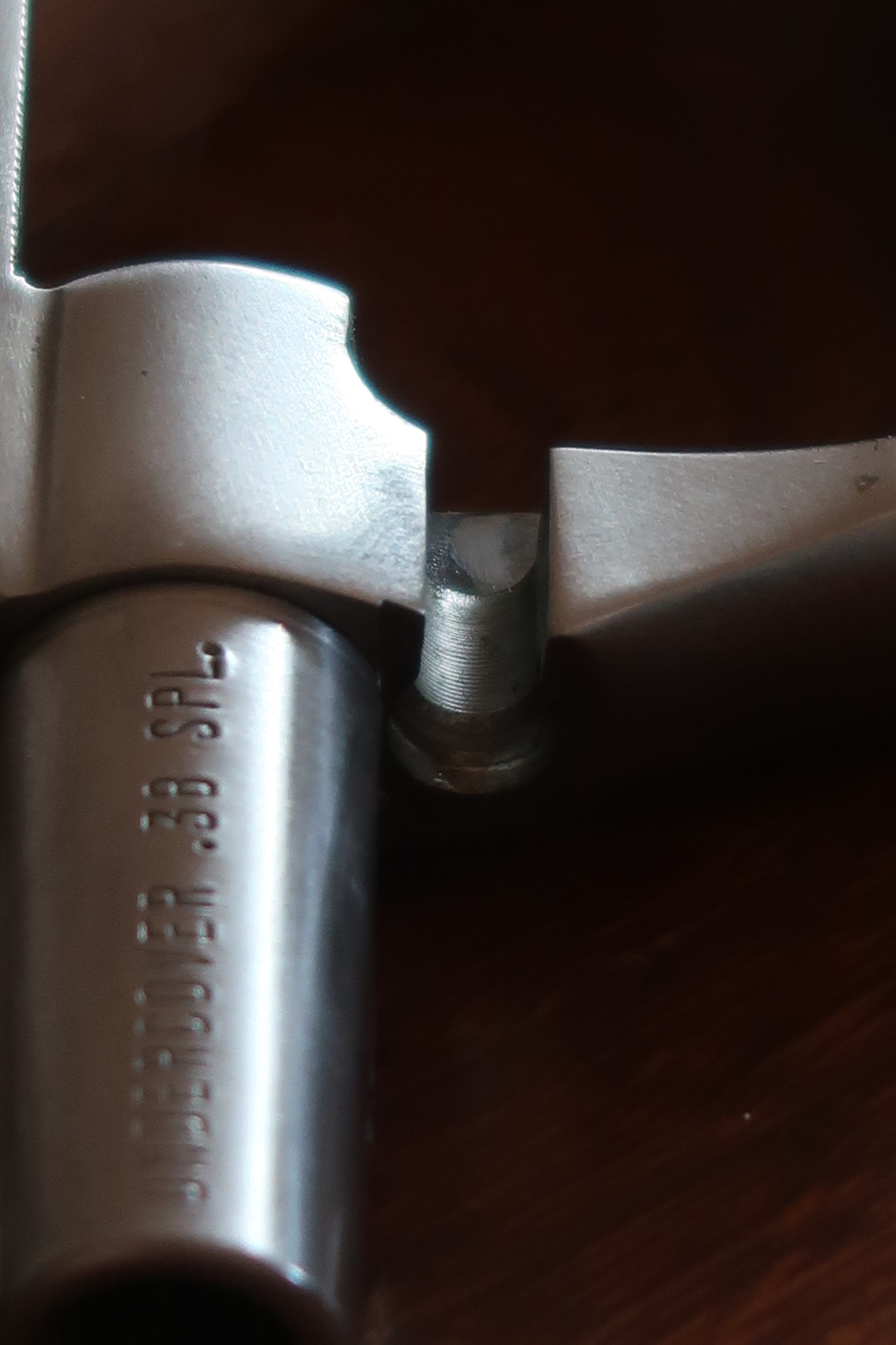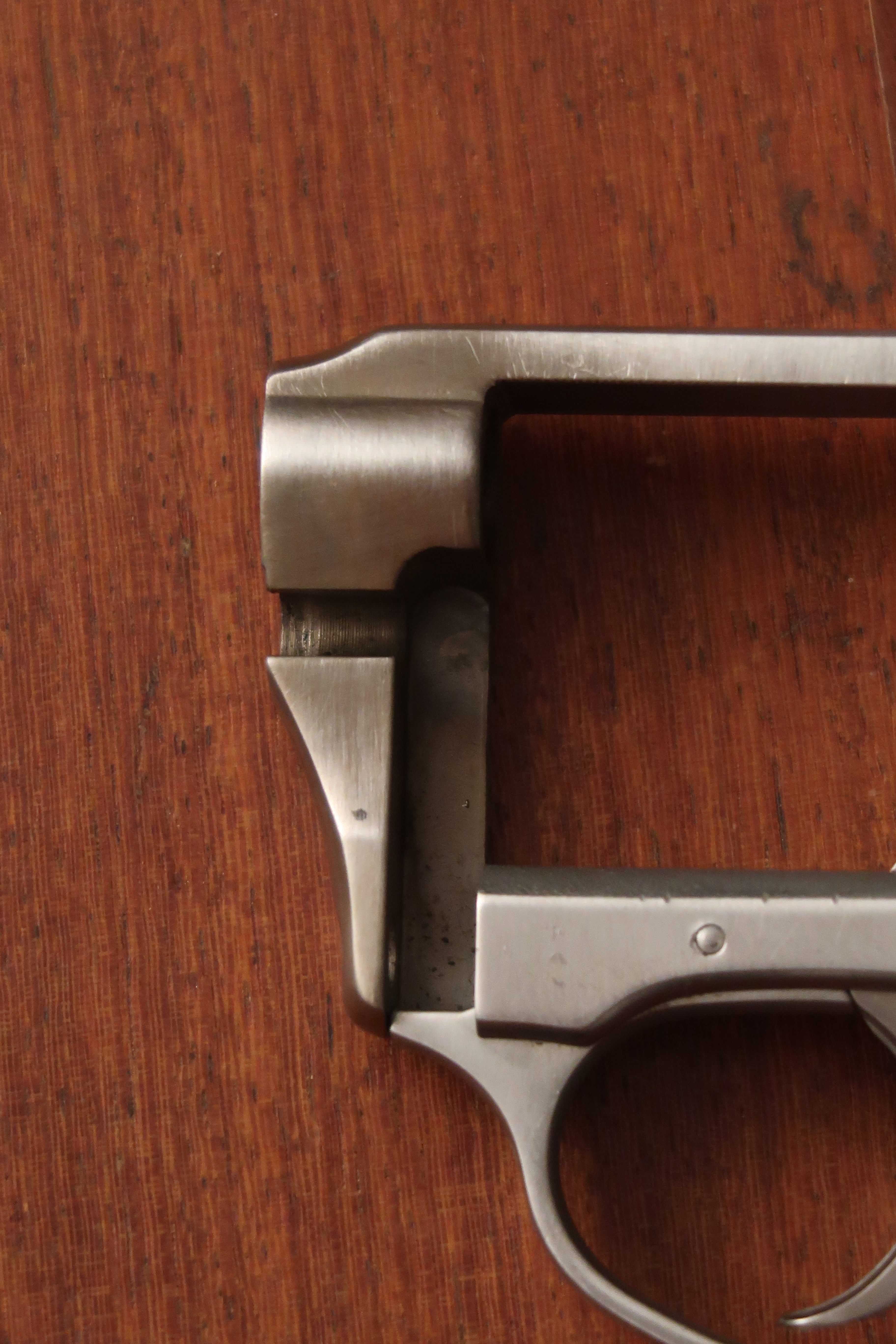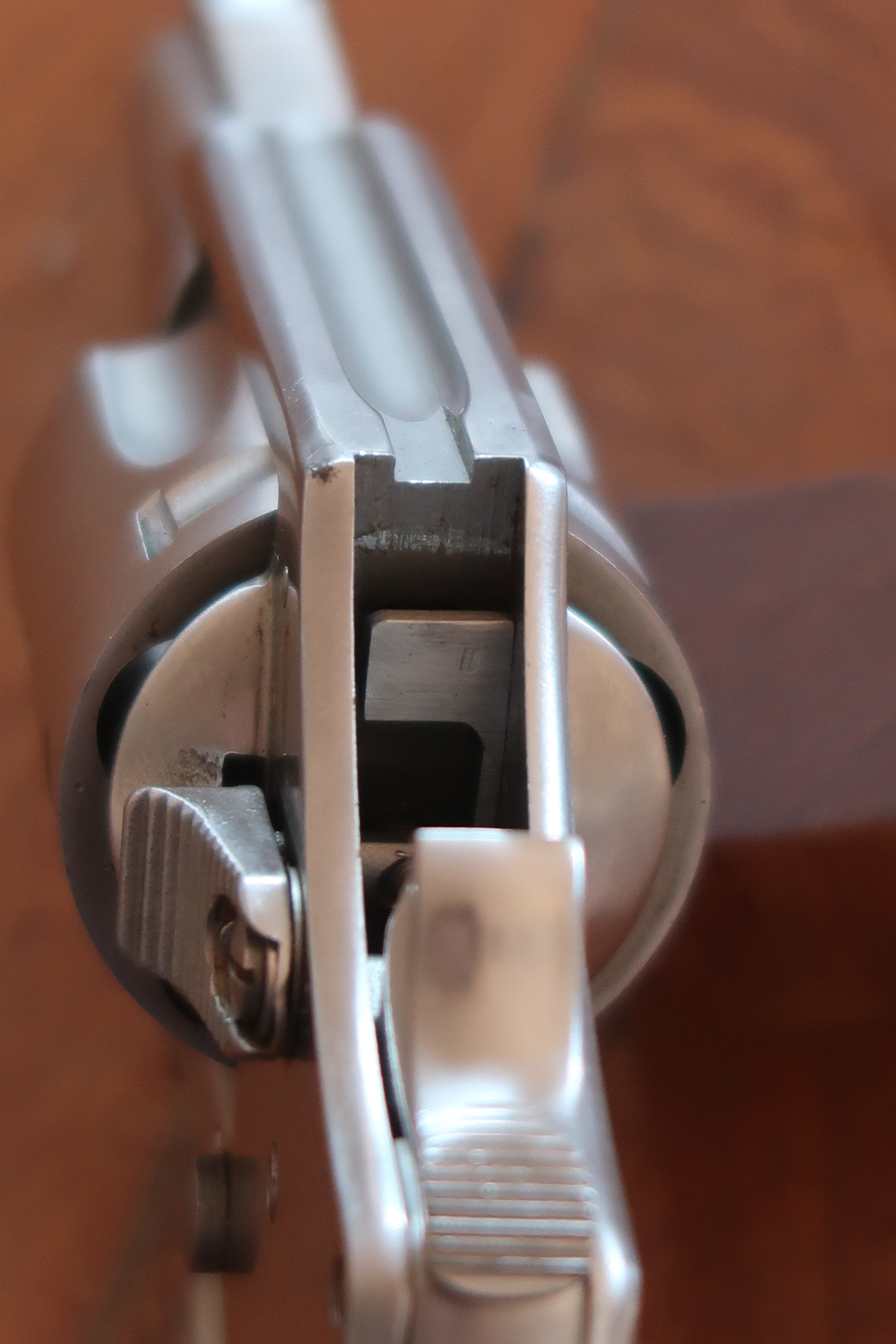 On voit au niveau de la table de tir l’aspect peau d’orange laissé par la micro-fusion. Juste la surface utile est polie. Soit l’appui du culot de la cartouche et l’appui de l’étoile du barillet. Cette surface est plus facile à polir car elle est en légère surépaisseur.
