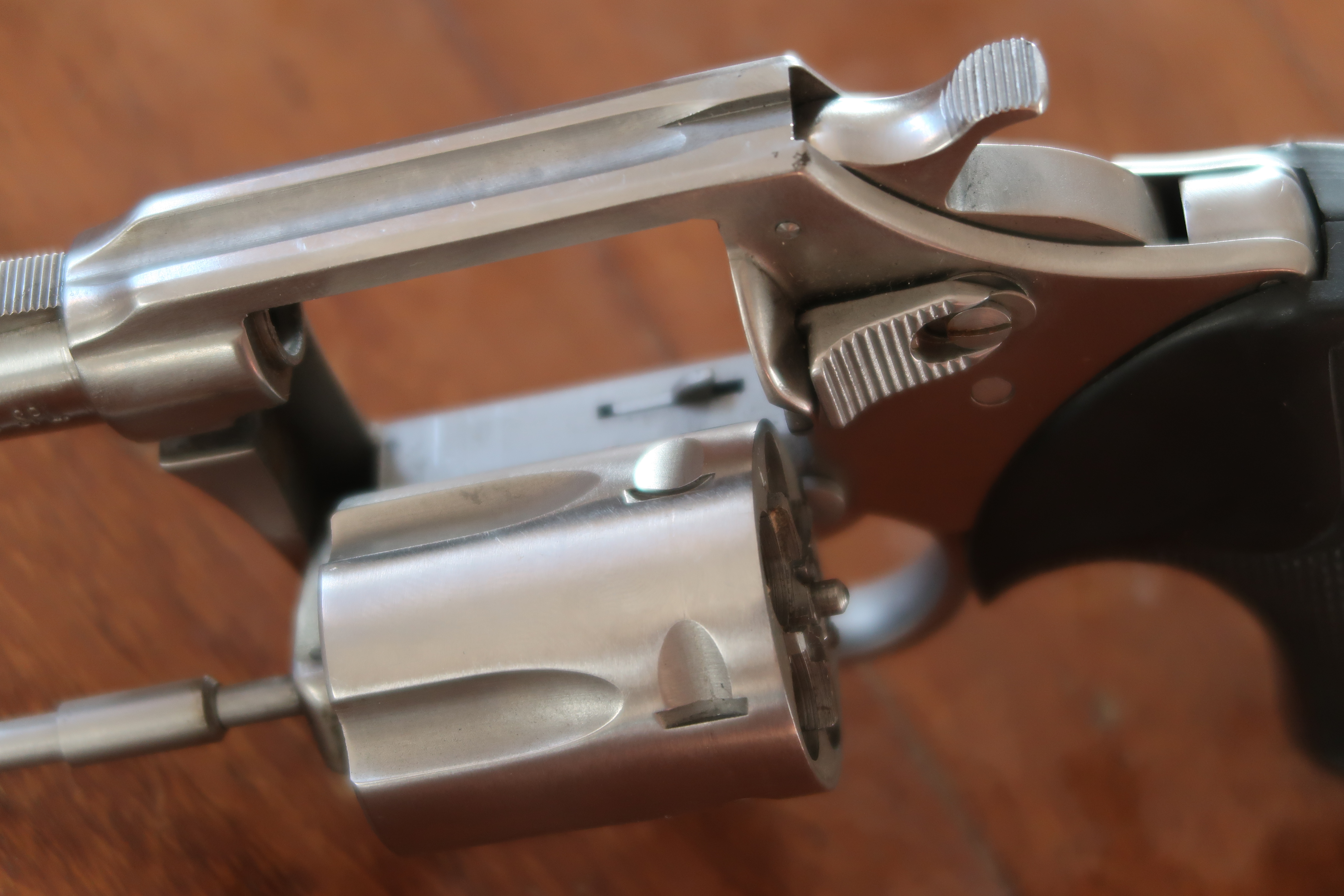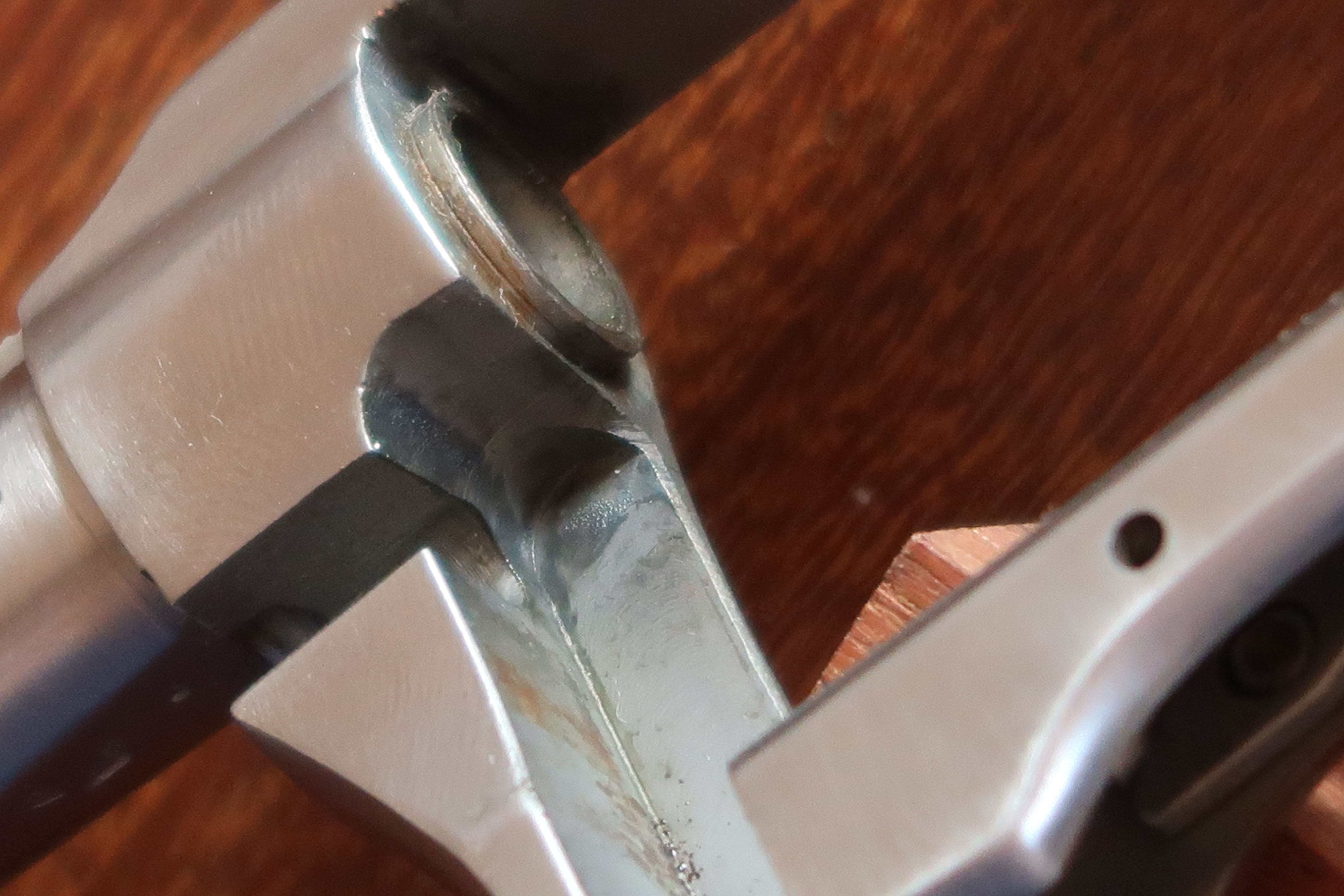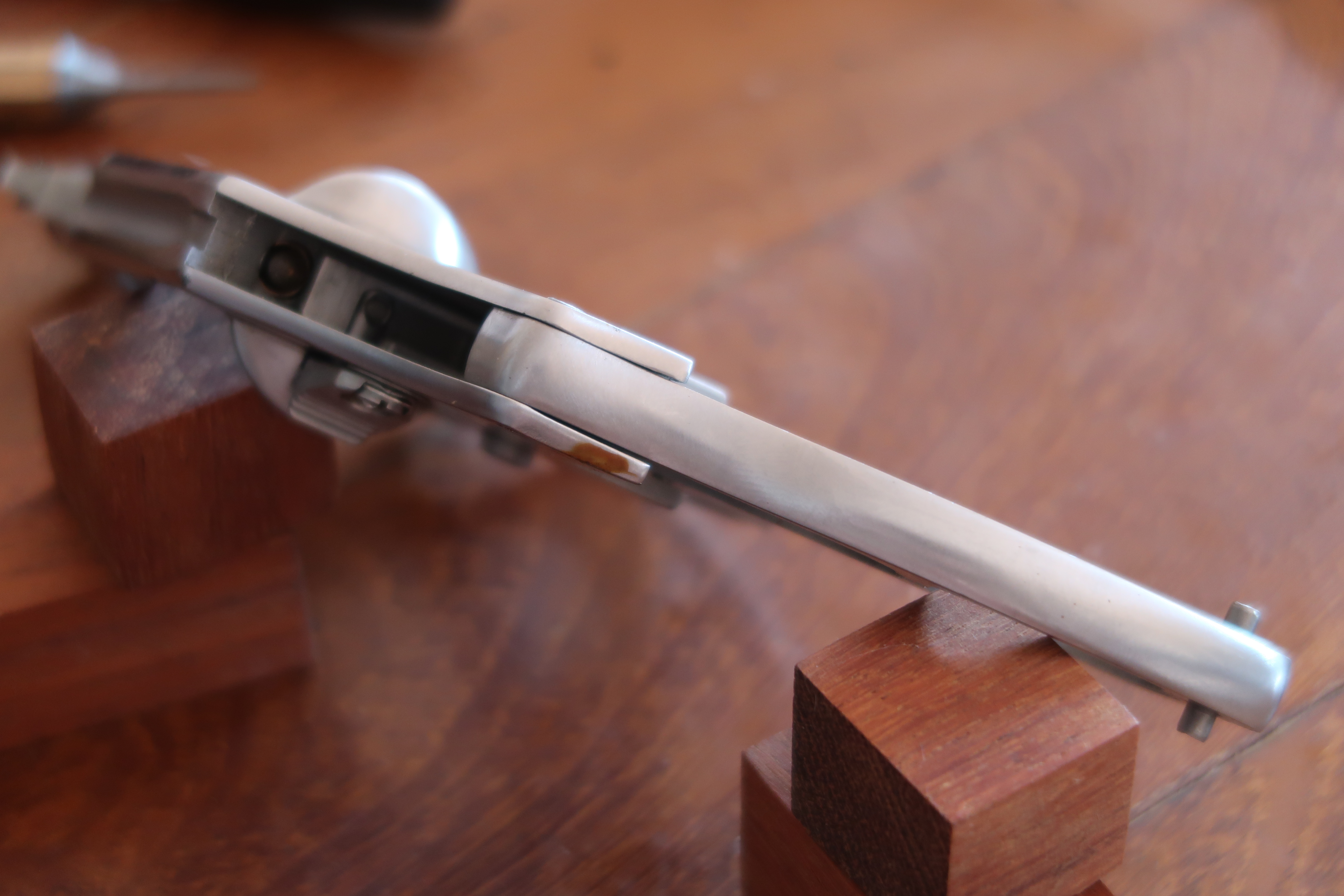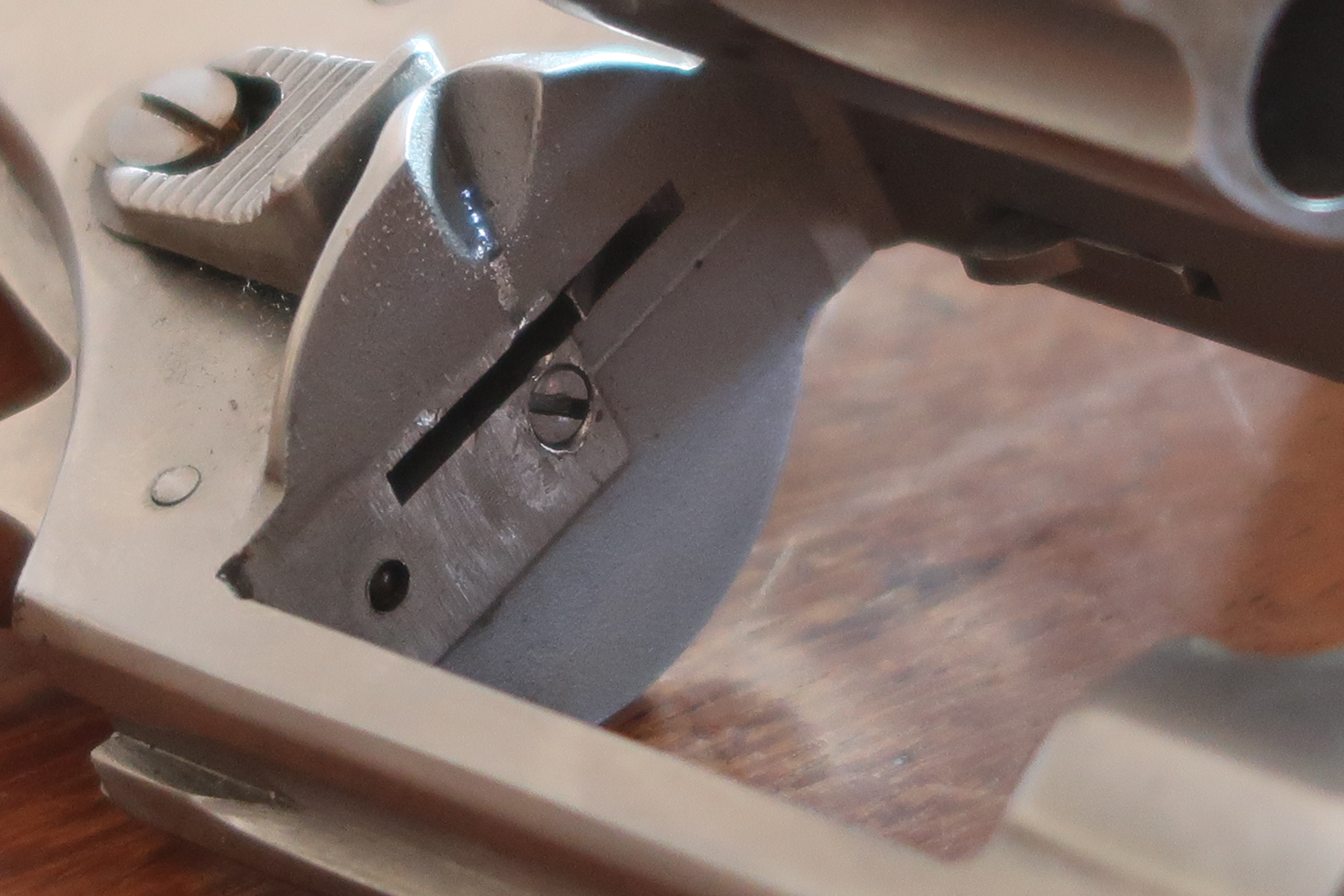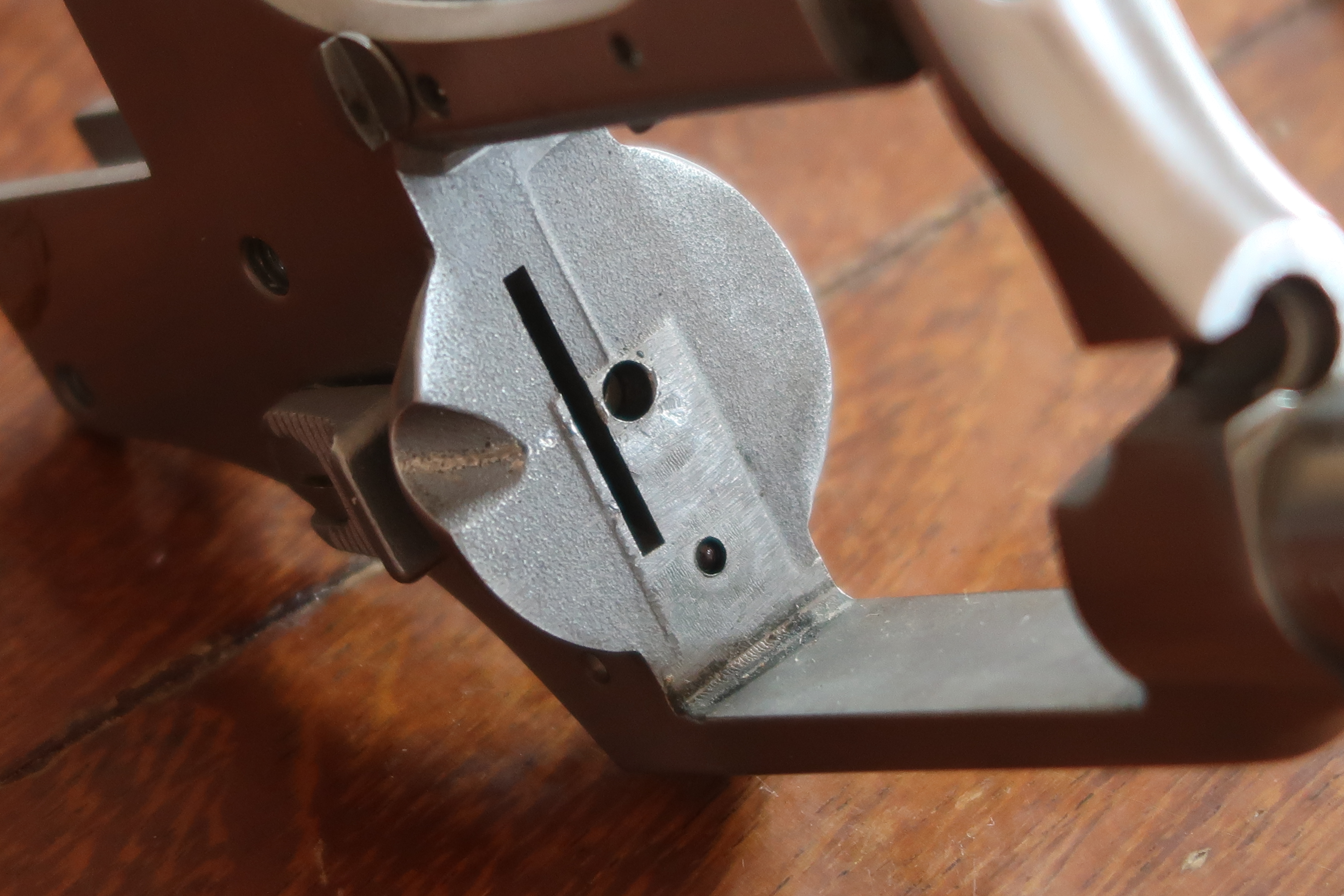 On voit au niveau de la table de tir l’aspect peau d’orange laissé par la micro-fusion. Juste la surface utile est polie. Soit l’appui du culot de la cartouche et l’appui de l’étoile du barillet. Cette surface est plus facile à polir car elle est en légère surépaisseur.