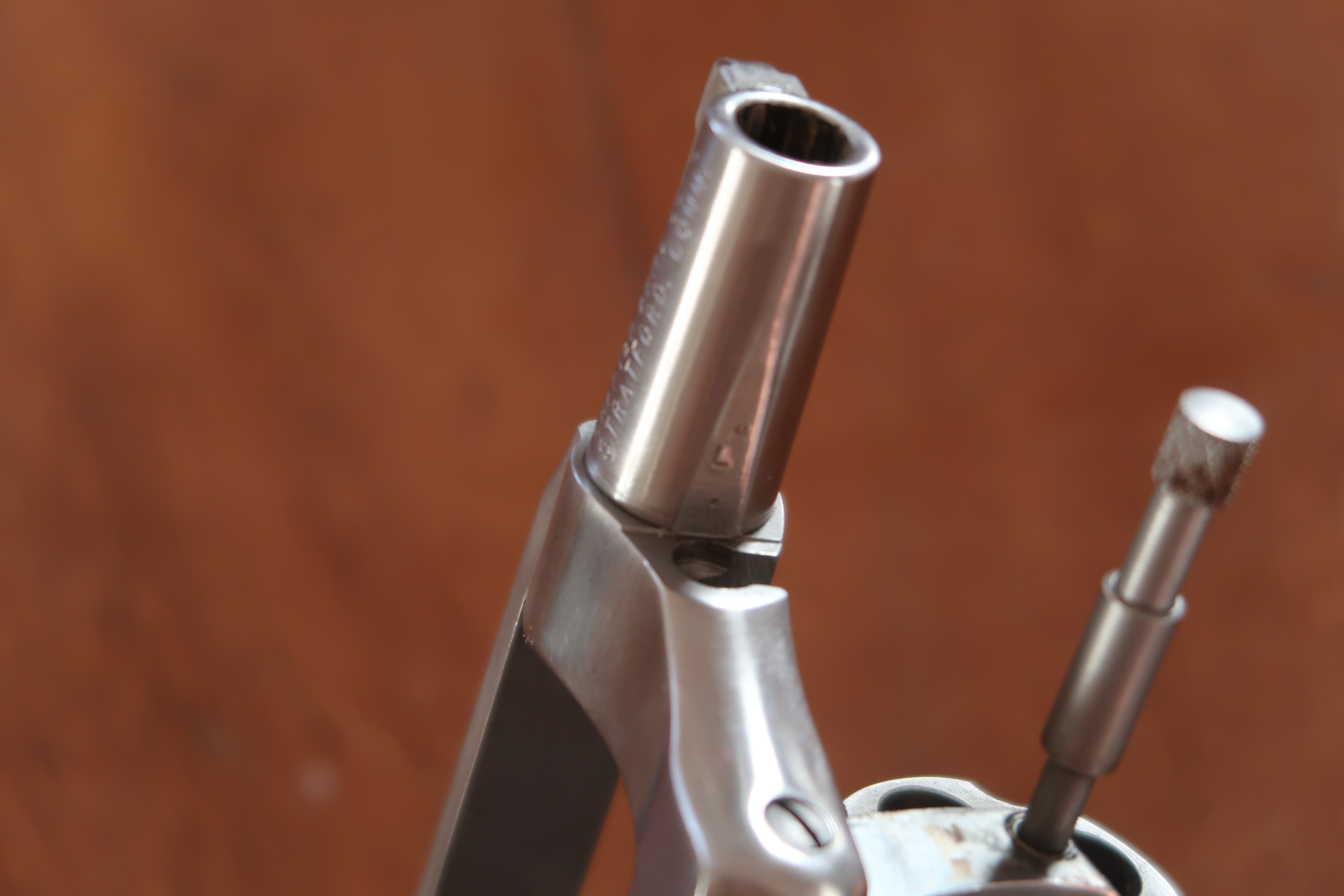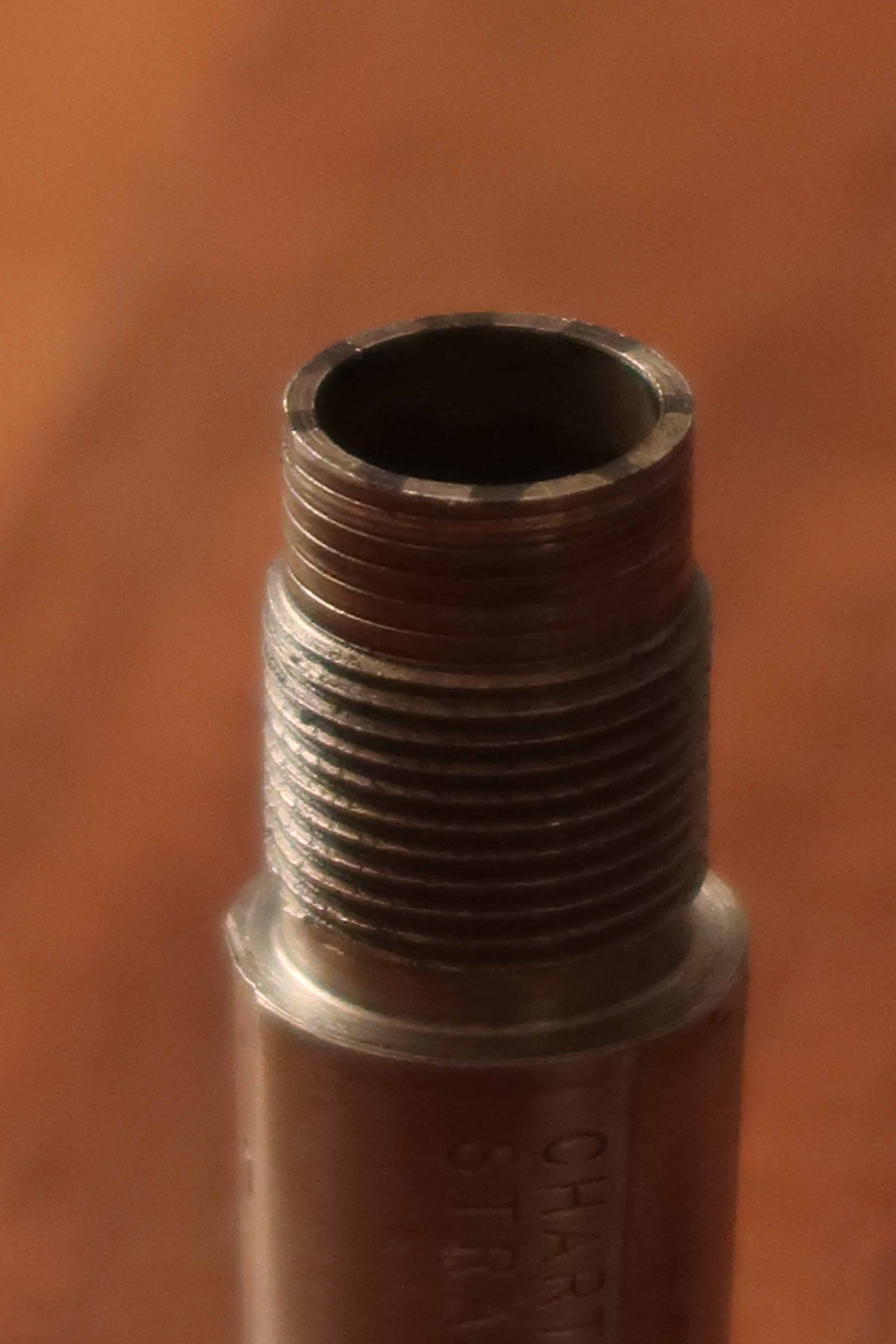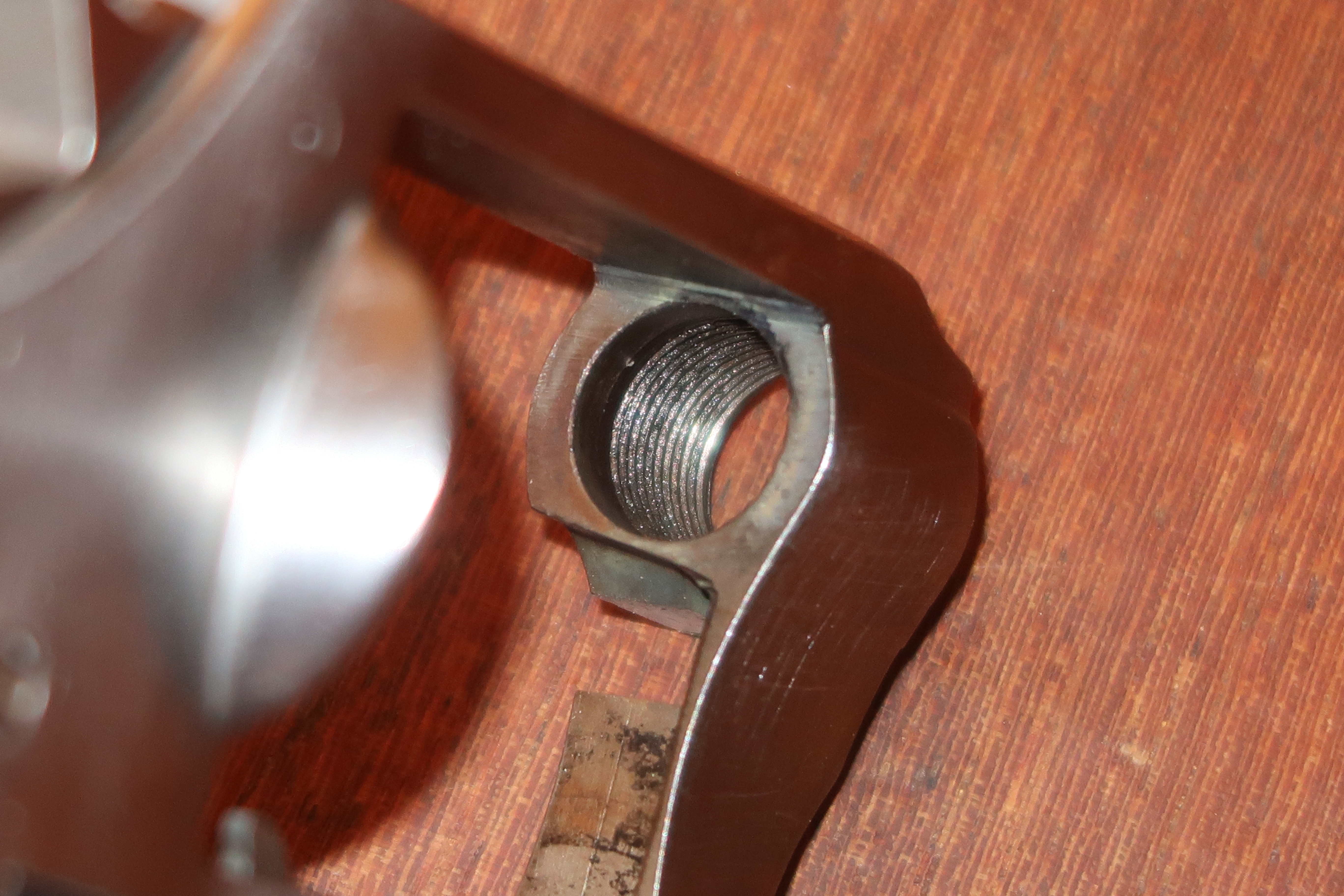 Je n’ai pas trouvé de trace de colle sur le filetage. Le canon est juste serré au couple. Par manque de temps pour me confectionner un outillage plus adapté, je n’ai pas pu définir ce dernier.