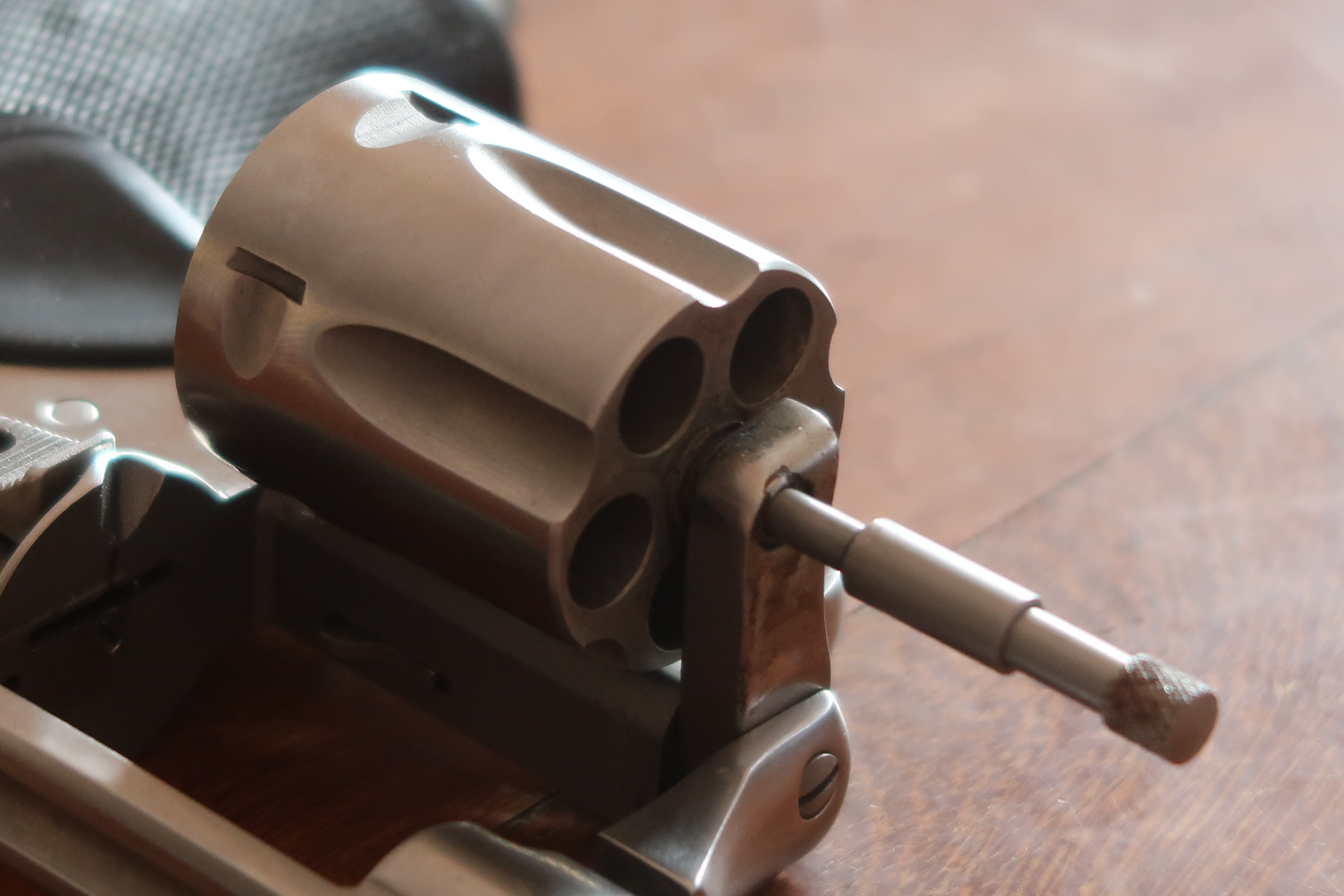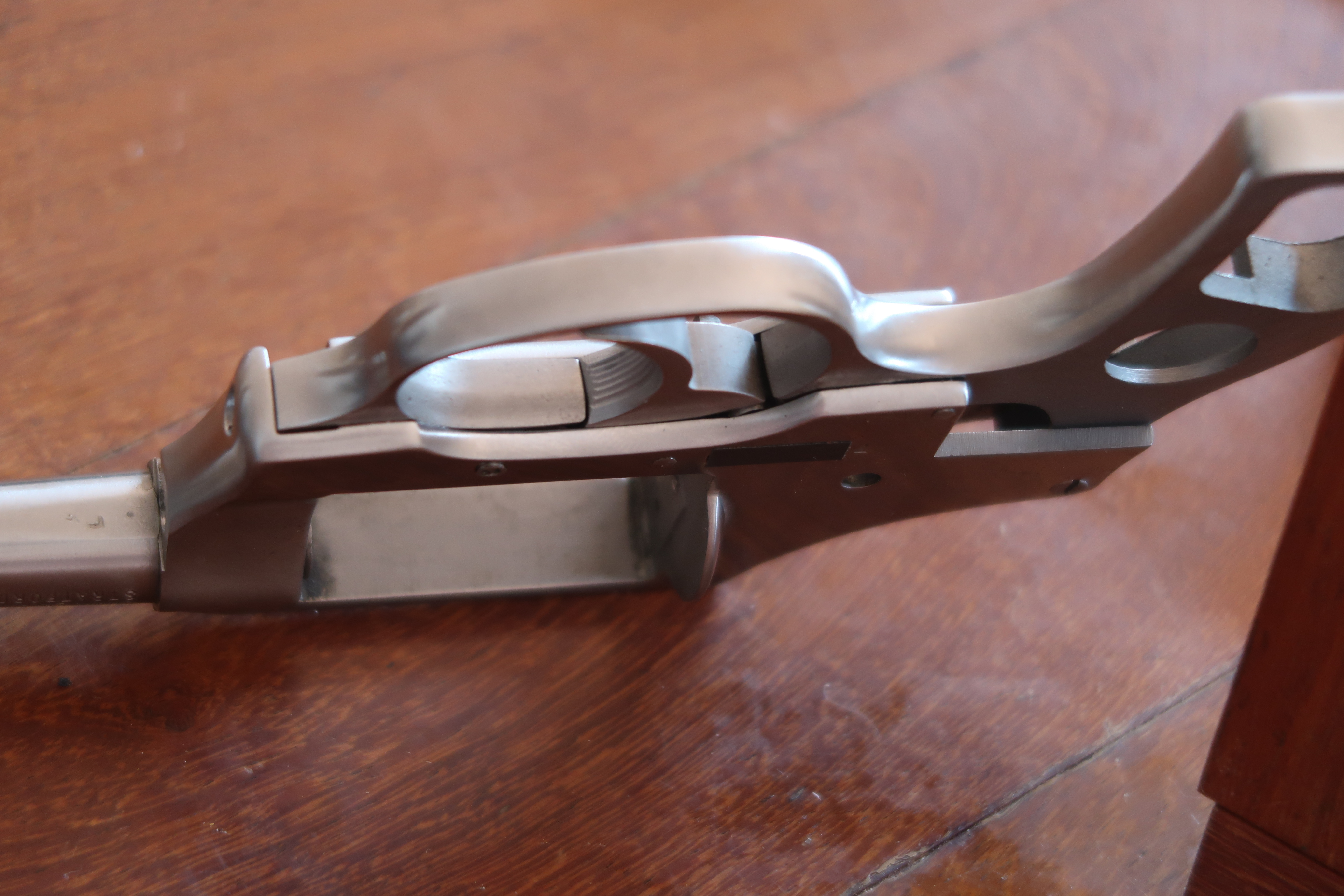Après renseignement pris auprès de l’entreprise, il semble que le canon a évolué dans le temps. Le modèle dont on parlera ici est antérieur à 1985. Le nouveau profil du canon inclus un logement pour la tige de l’extracteur. L’arme étudiée a donc plus de 32 ans. Je vous laisse juge de l’état de conservation.