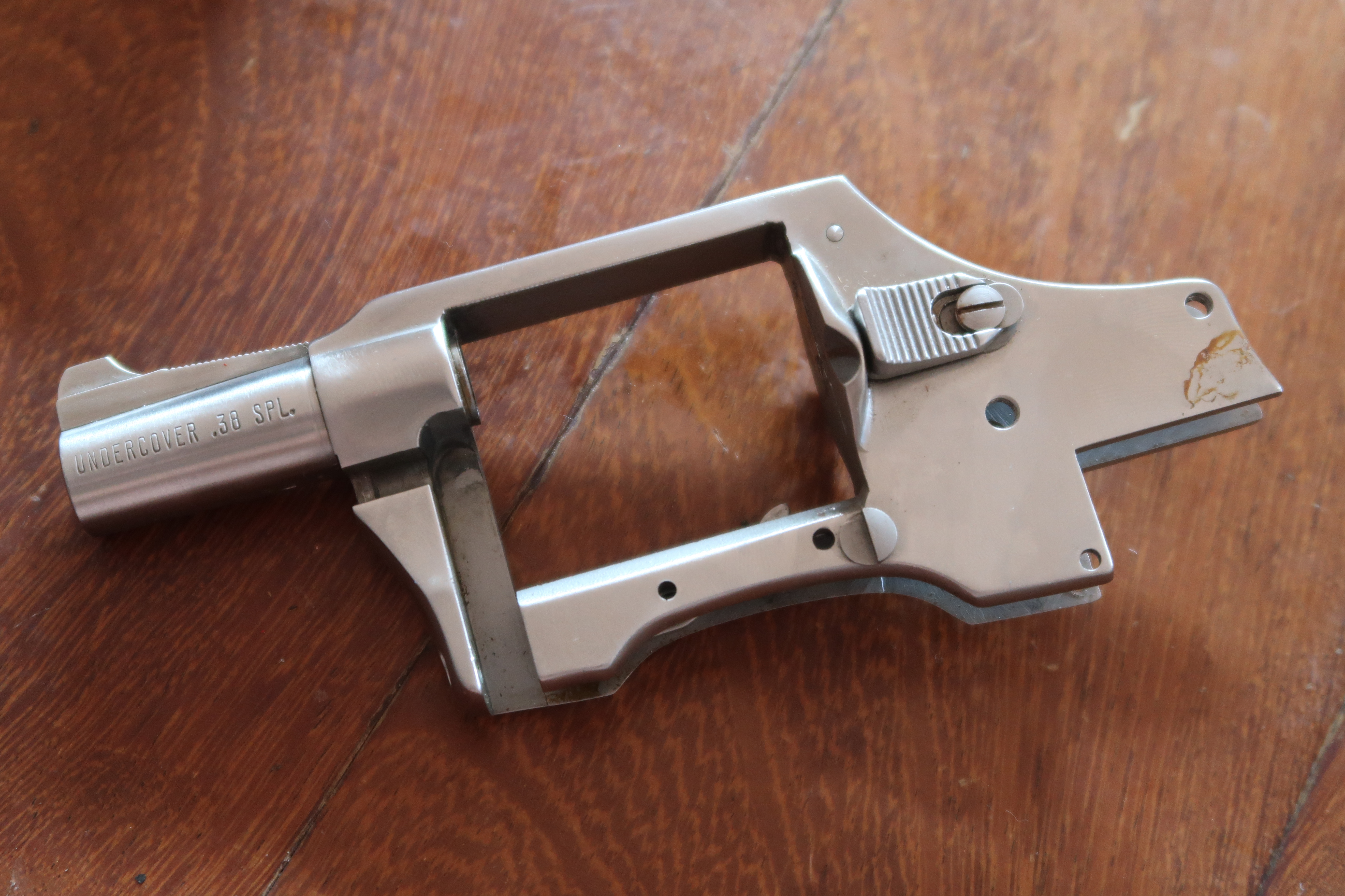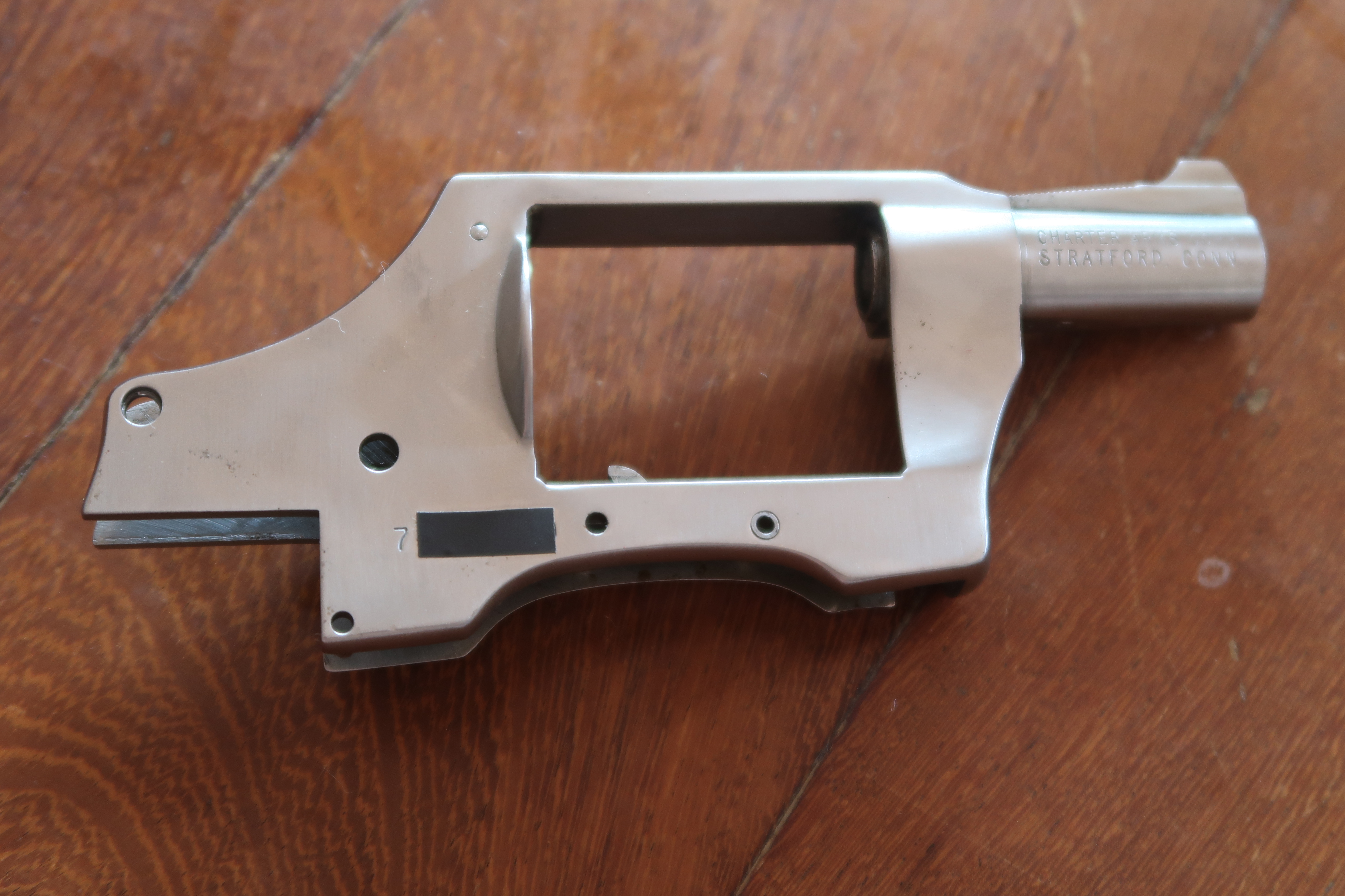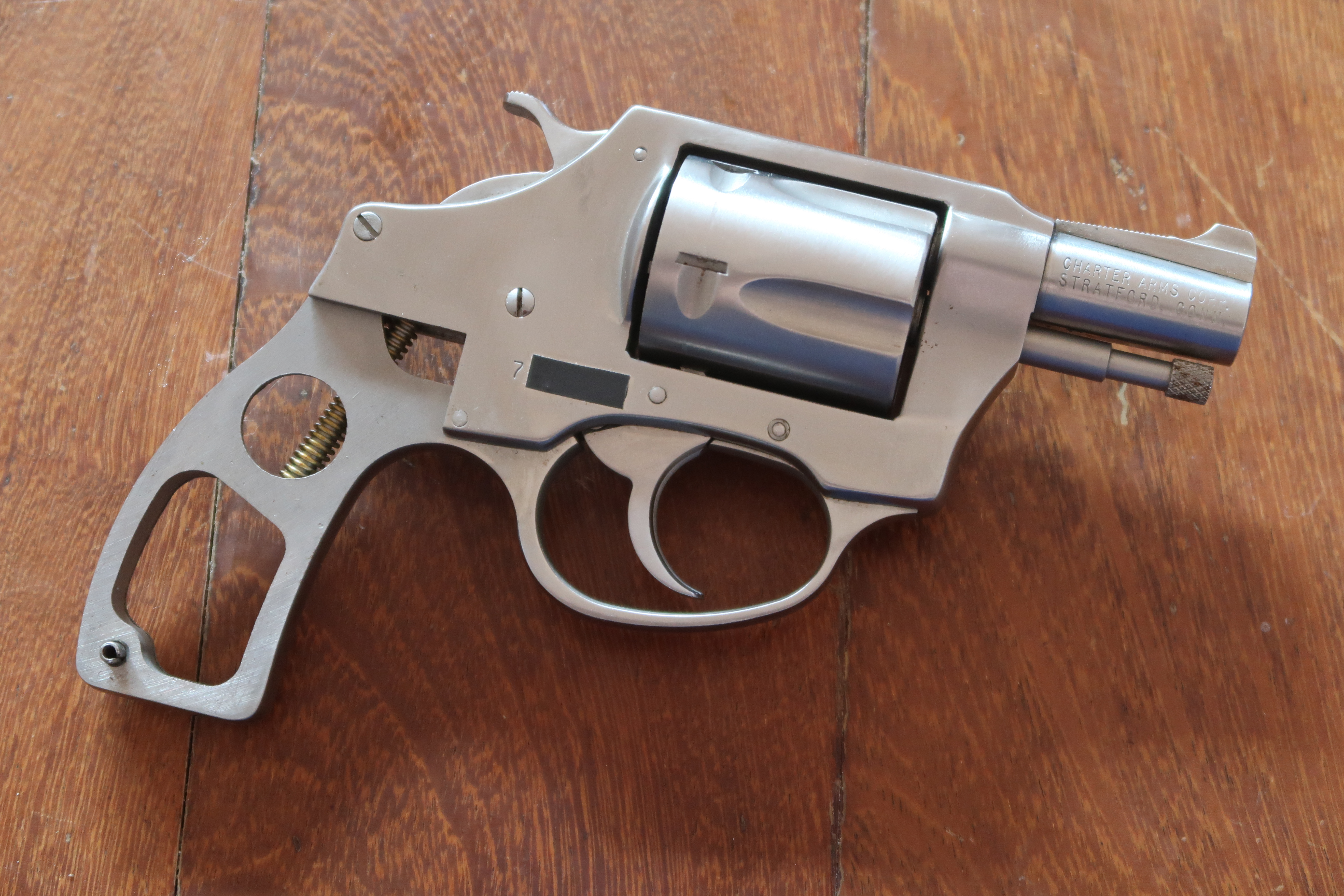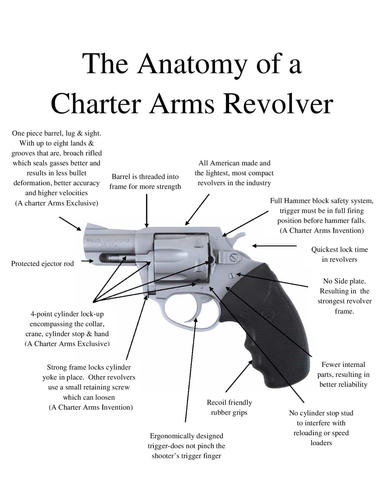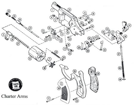 Contrairement aux carcasses de revolver de marque Colt ou Smith et Wesson qui ont une plaque de recouvrement du mécanisme, le Charter Arms n’en a pas. C’est pour la marque un argument publicitaire qui, selon eux rendrait la carcasse plus robuste.