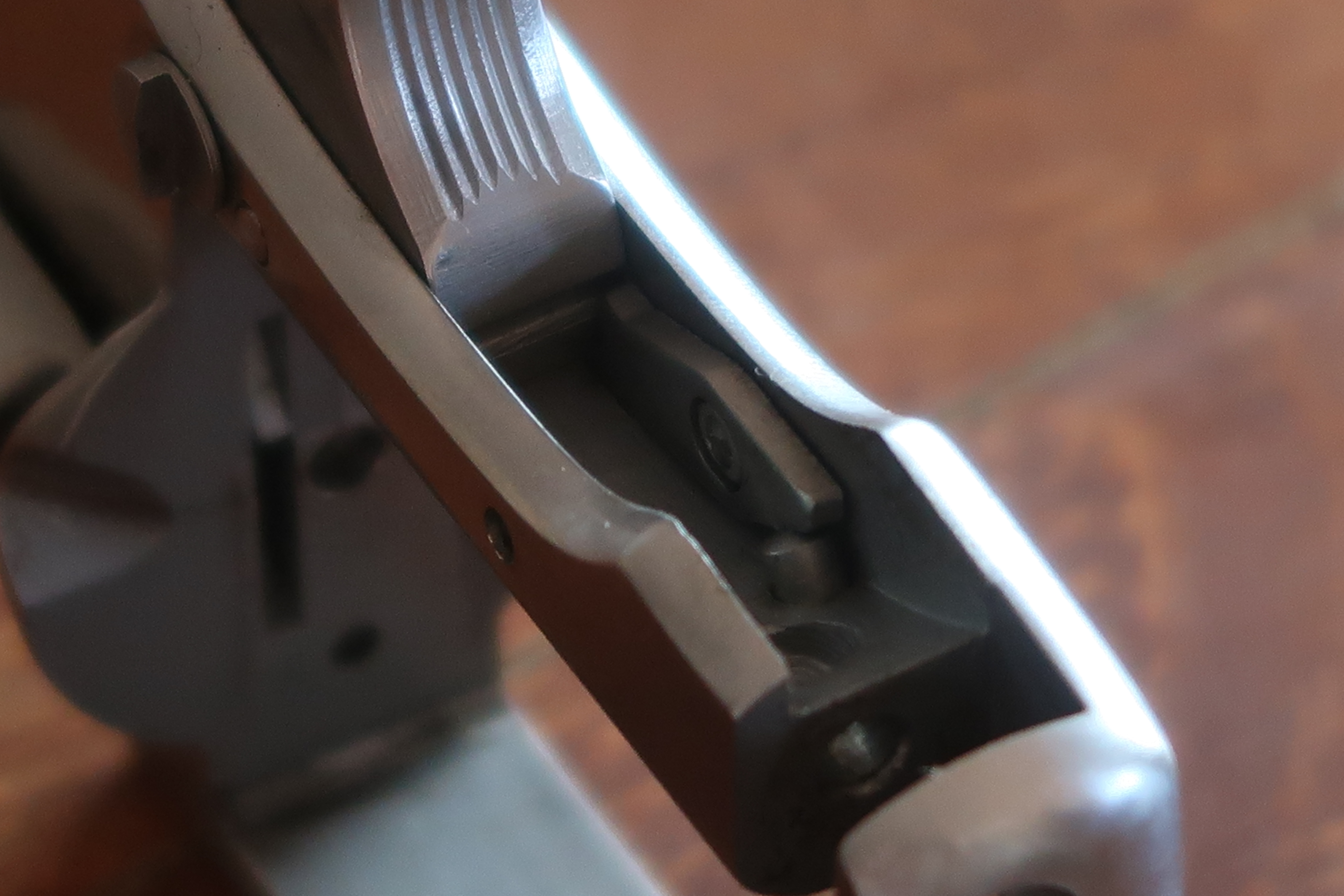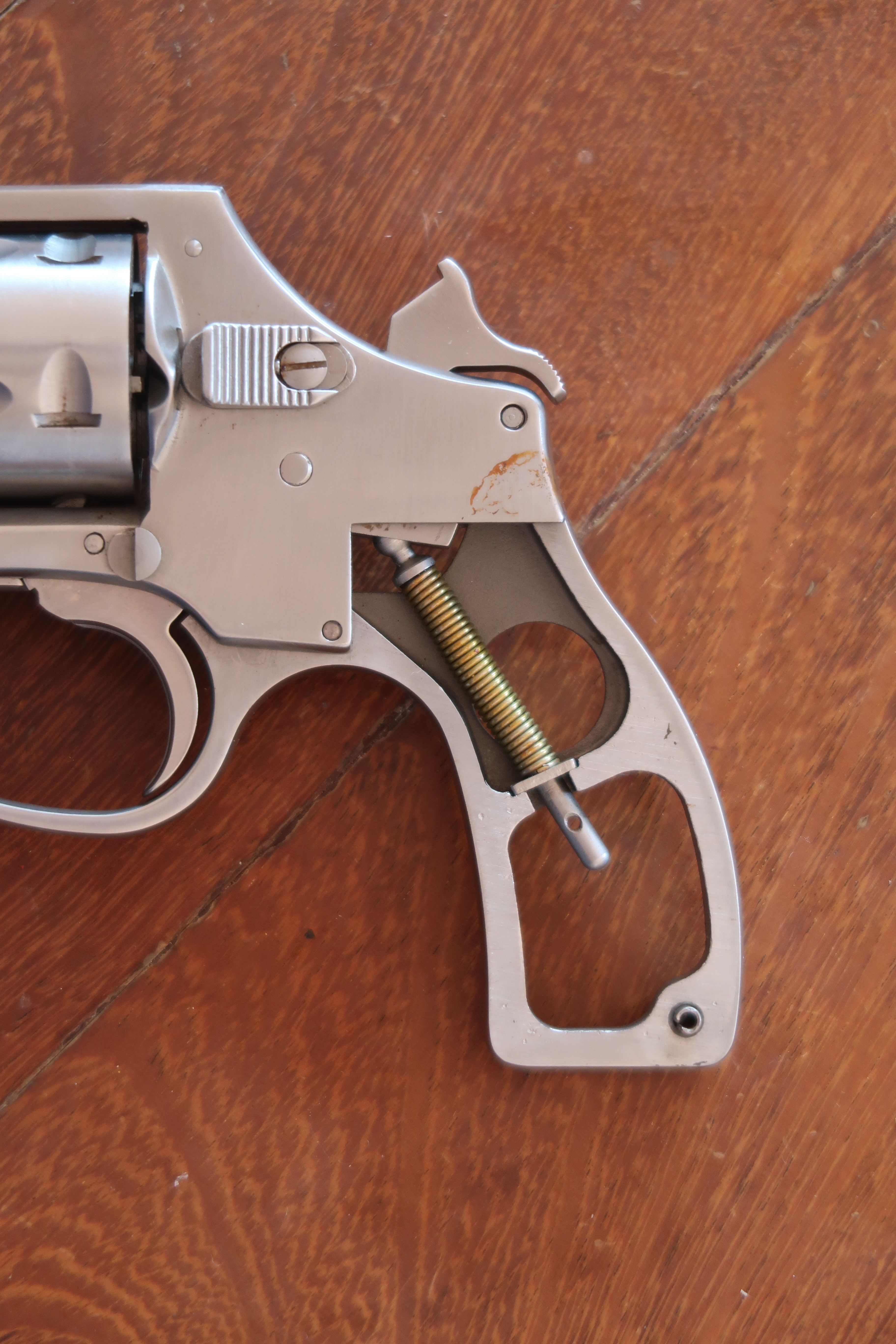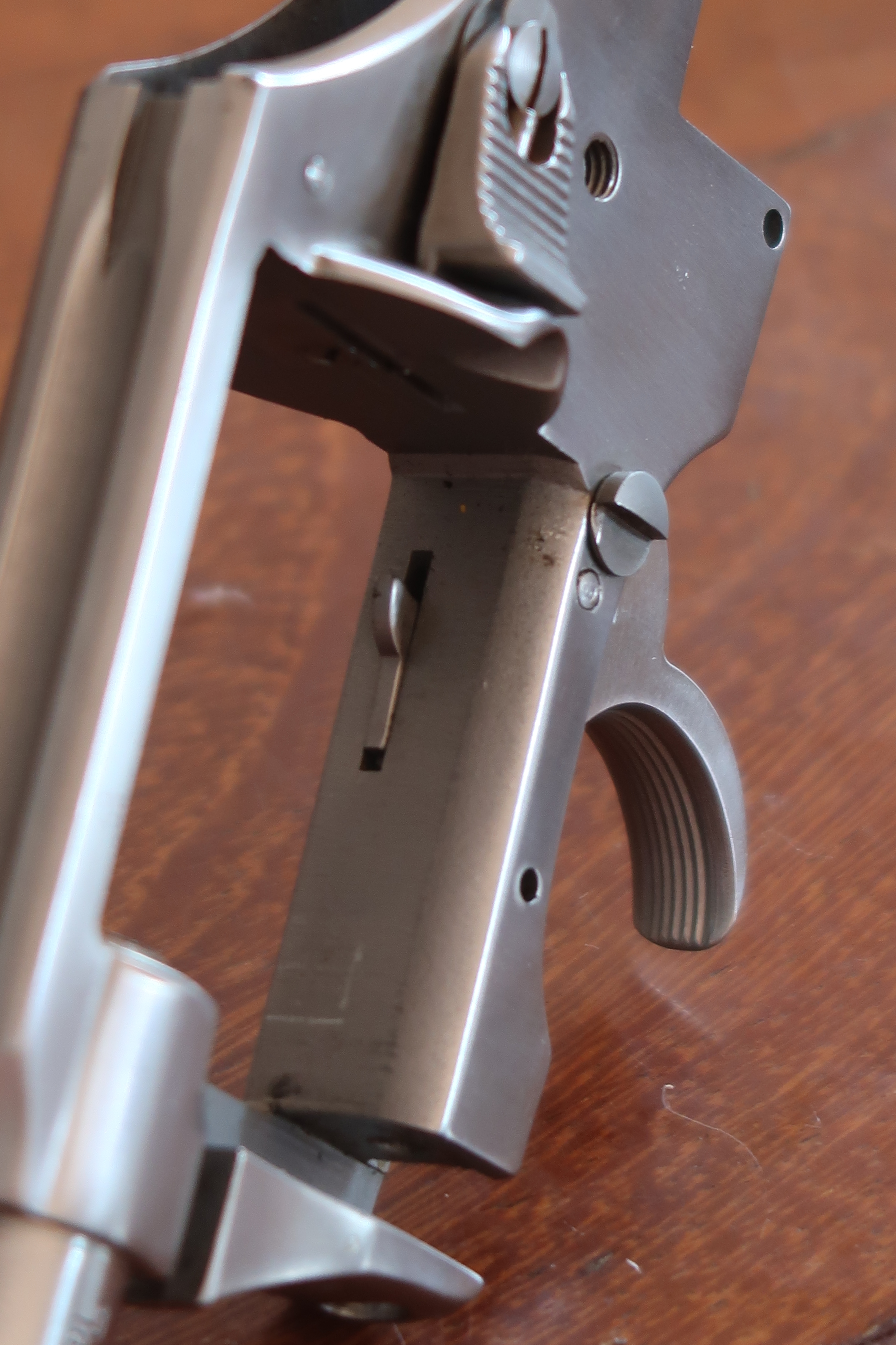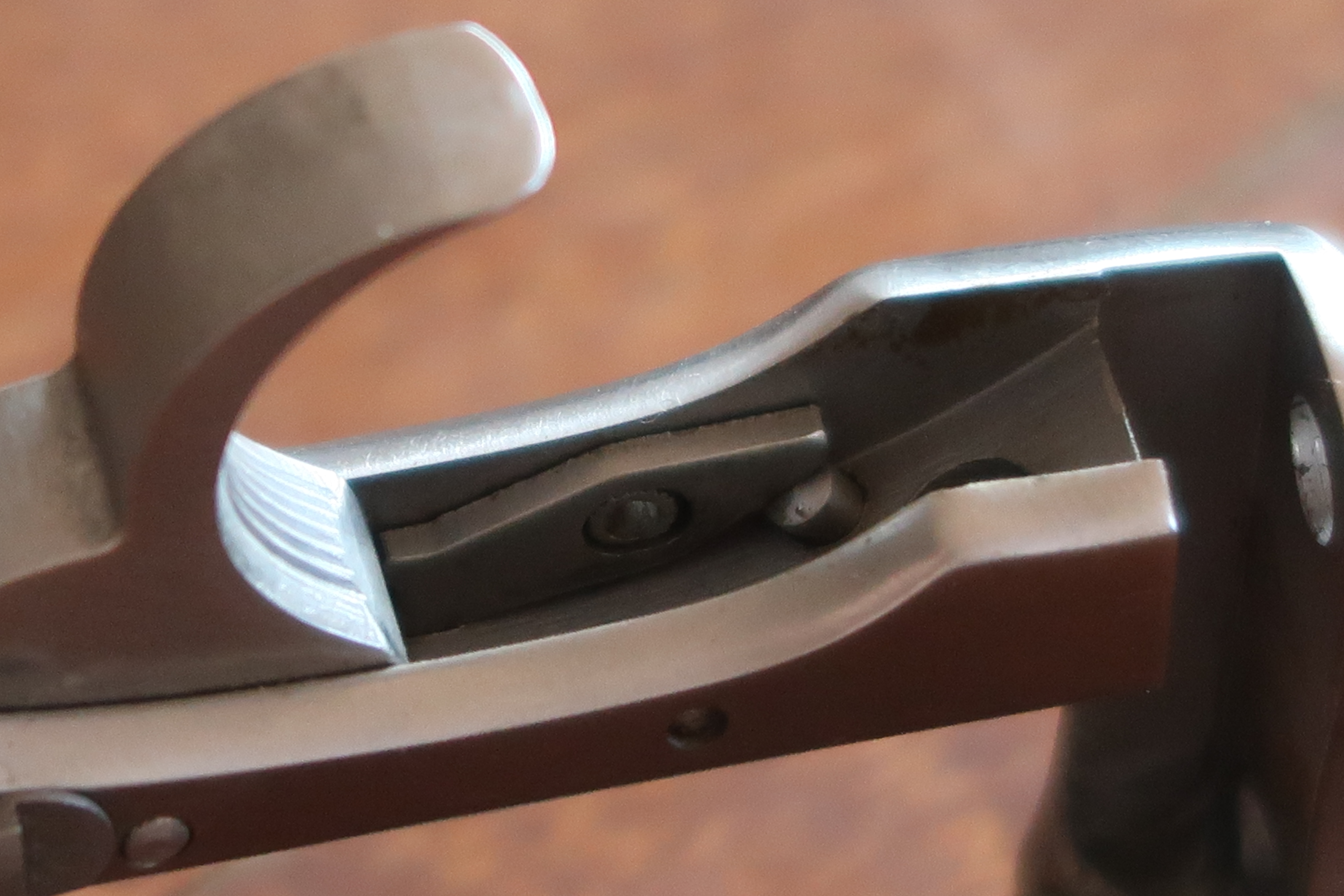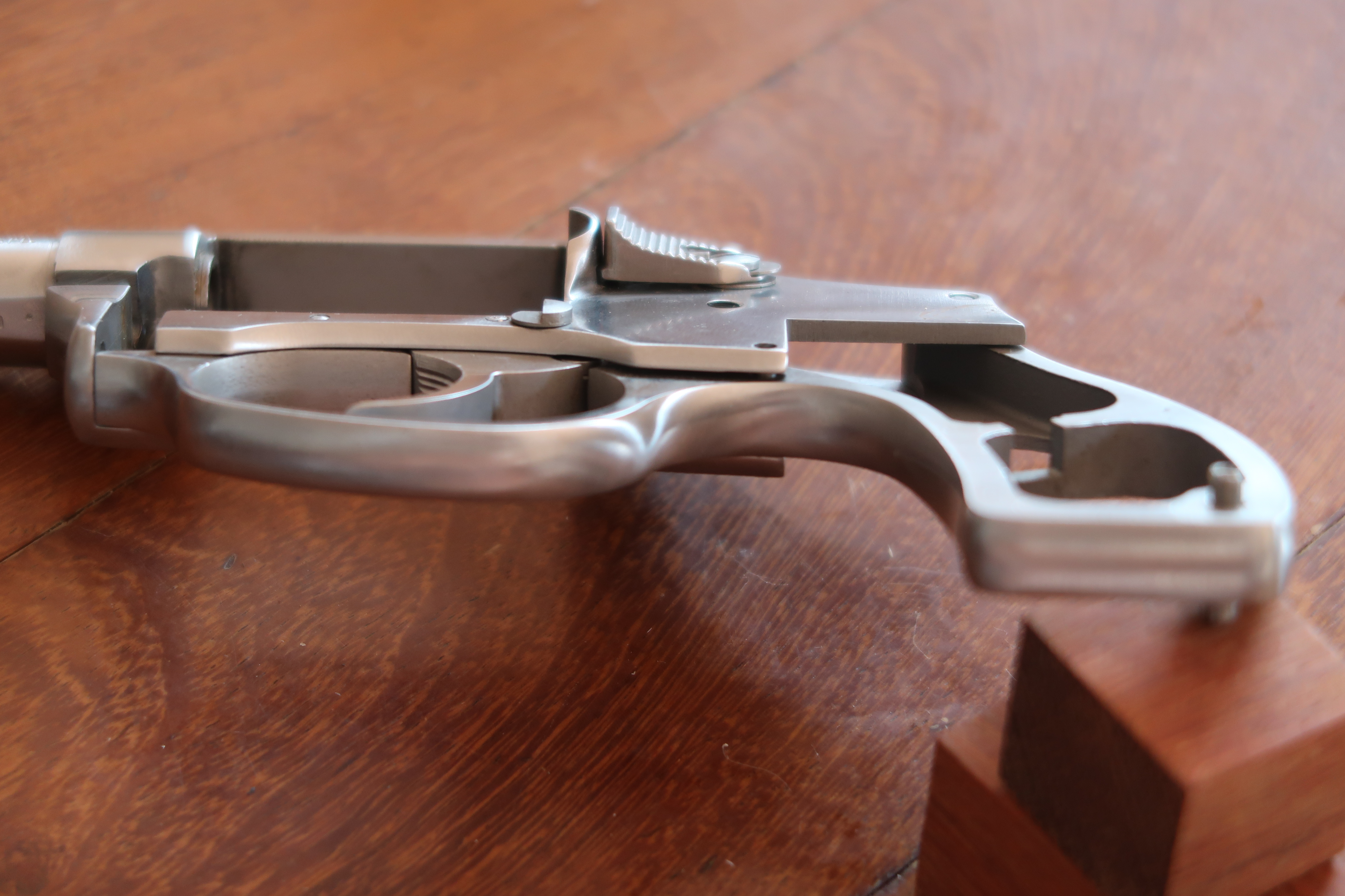 La détente est produite par micro-fusion. L’élévateur de barillet et la sécurité de percuteur sont attelés à la détente. Ces deux pièces sont assez fines, elles semblent fragiles. La détente actionne aussi le verrou de barillet. On le voit dans son logement sur les photos ci-dessous.
