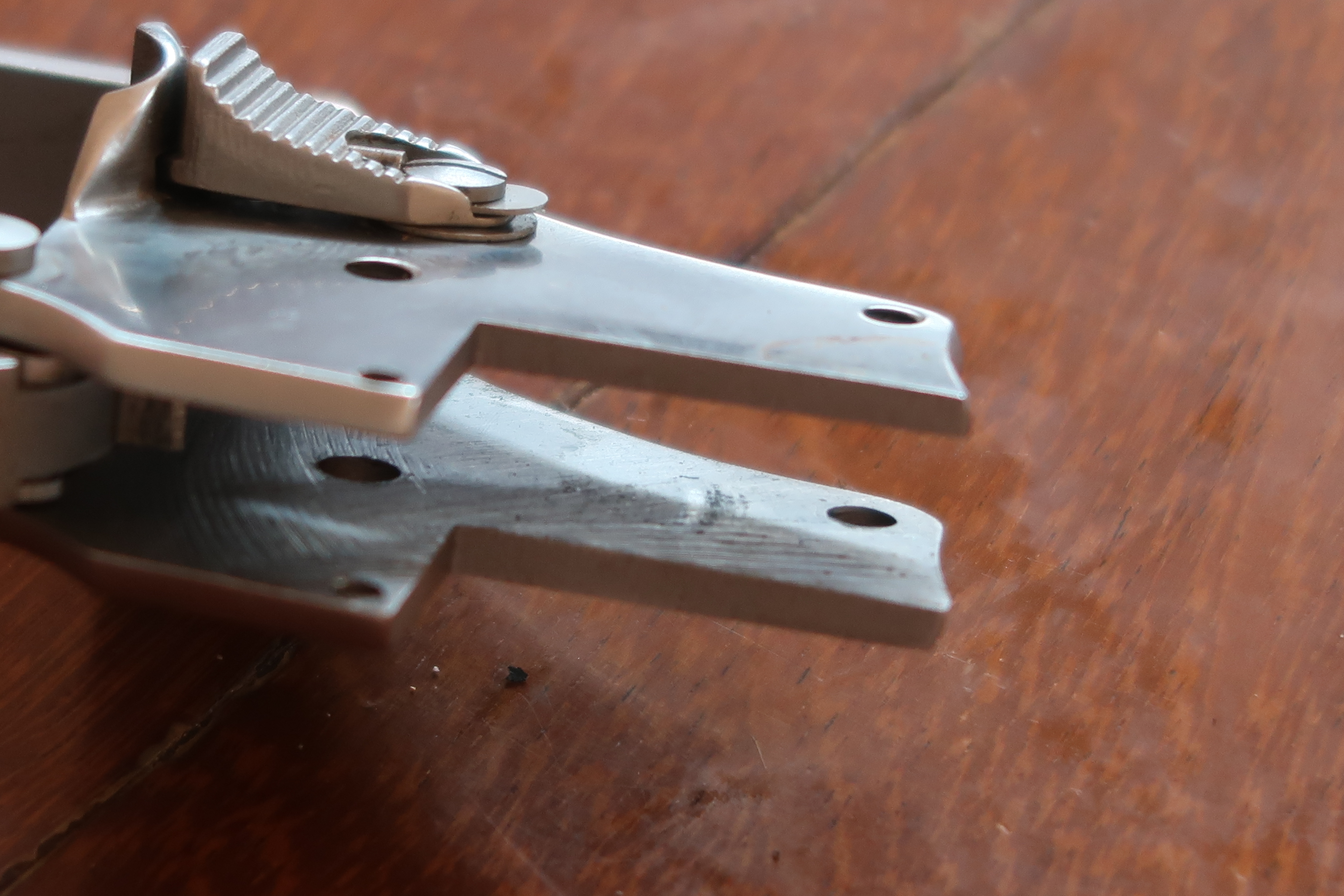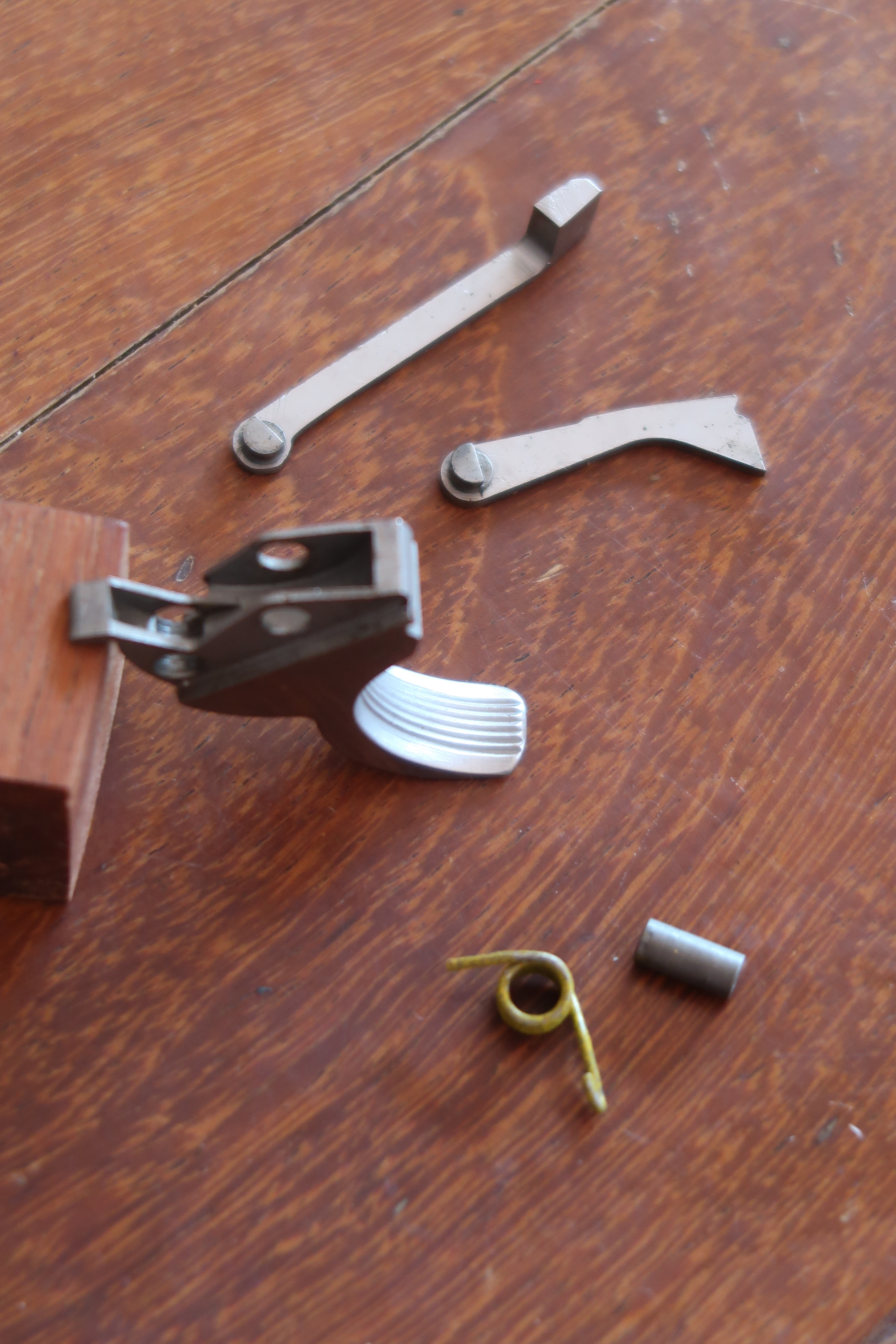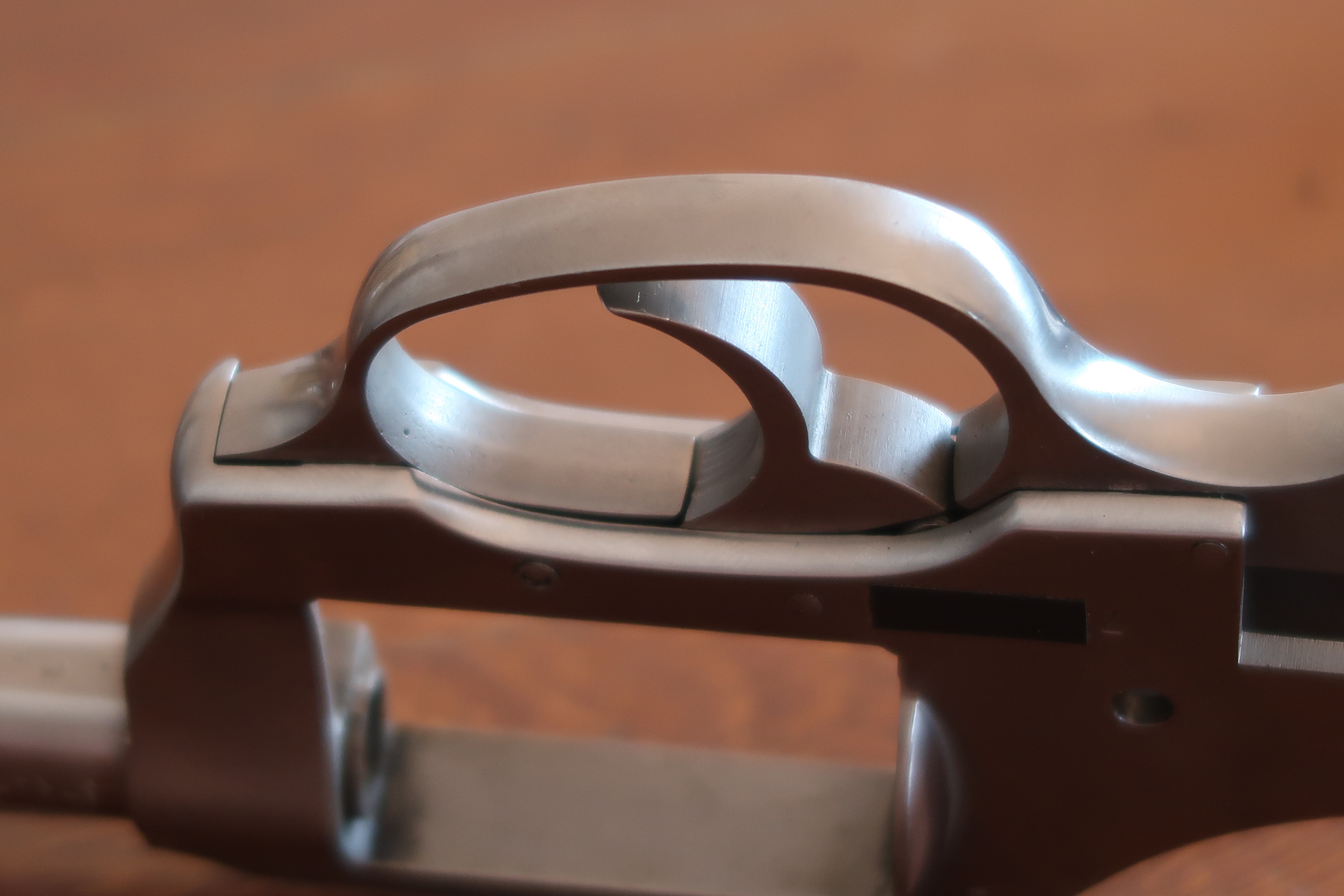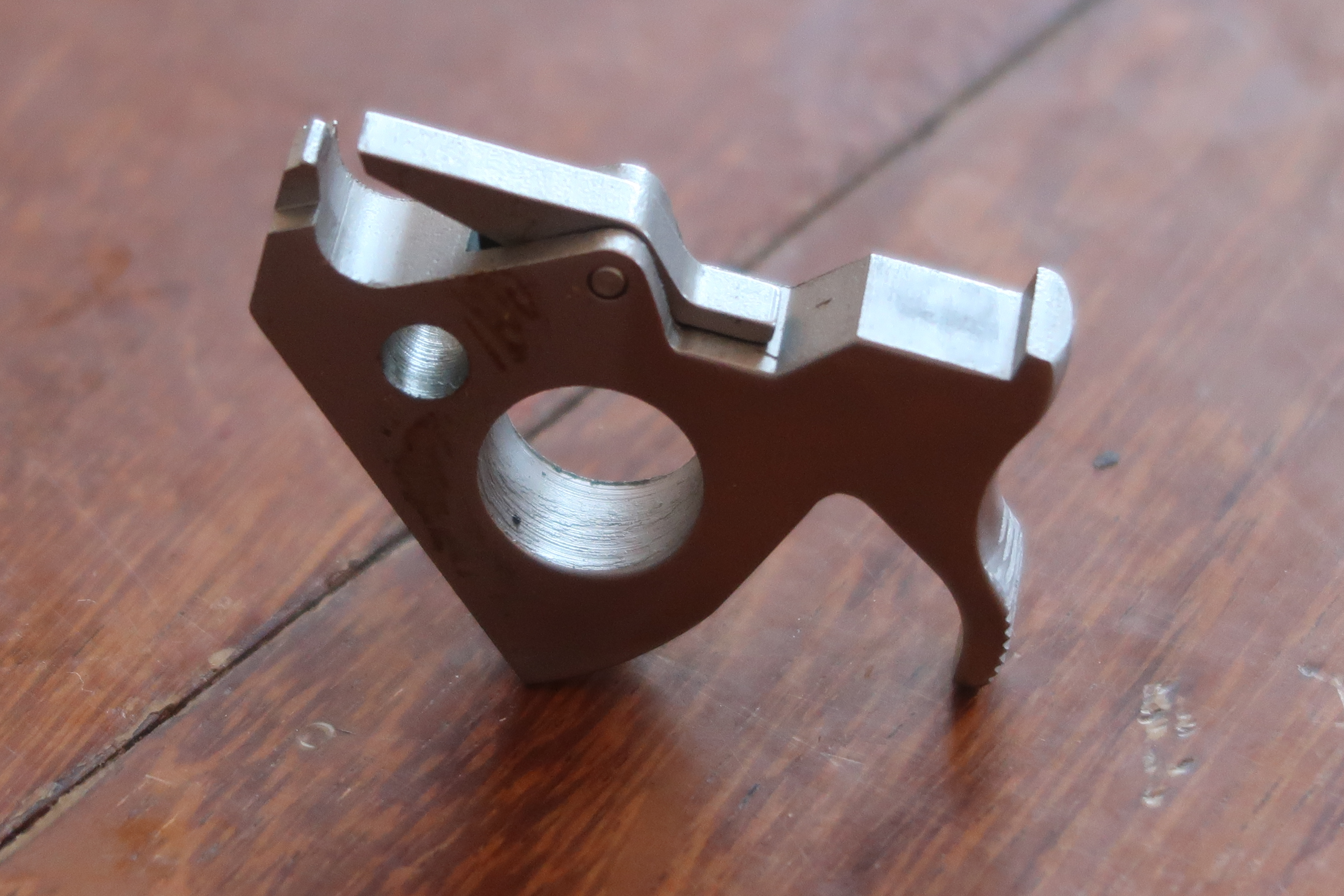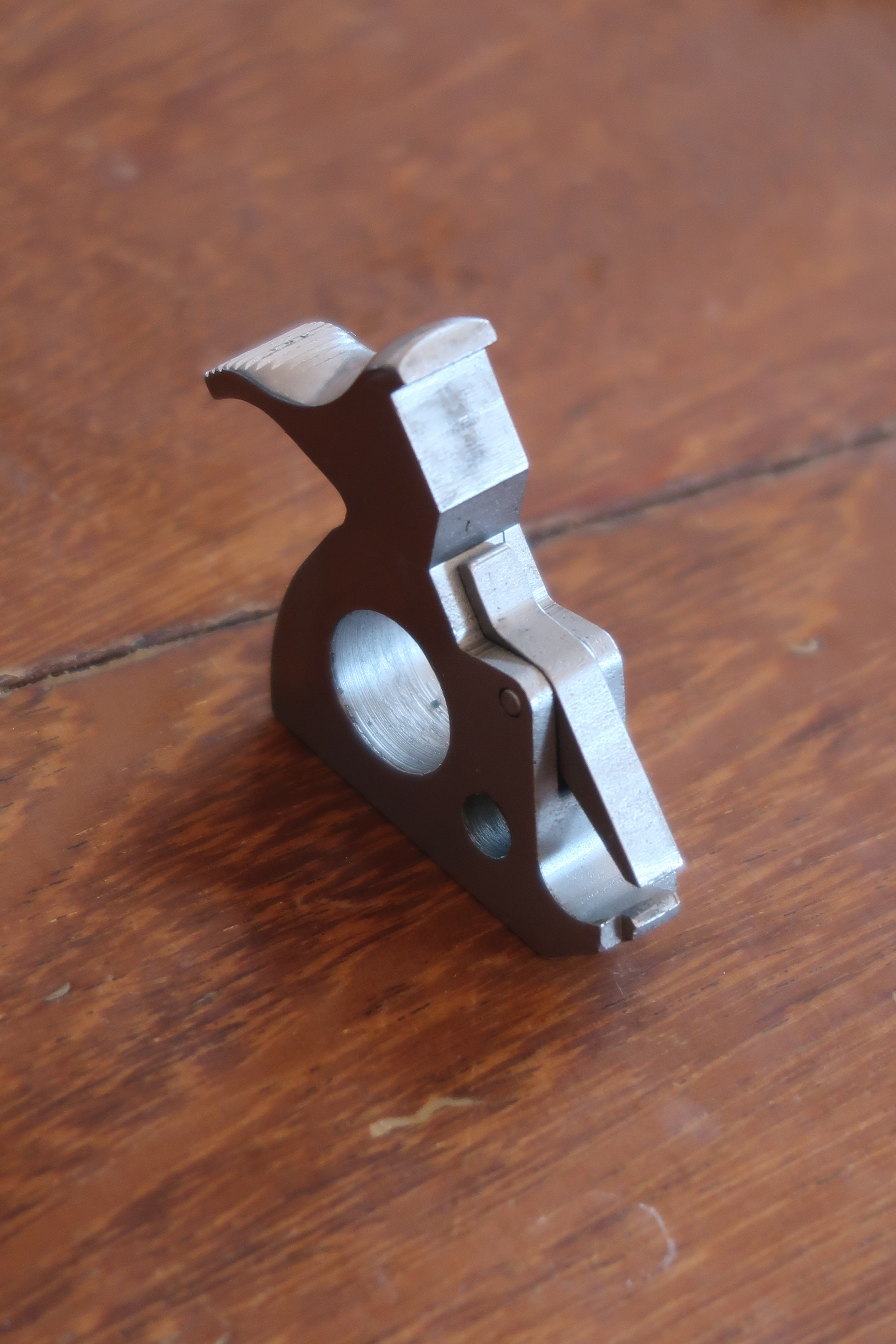 La détente est produite par micro-fusion. L’élévateur de barillet et la sécurité de percuteur sont attelés à la détente. Ces deux pièces sont assez fines, elles semblent fragiles. La détente actionne aussi le verrou de barillet. On le voit dans son logement sur les photos ci-dessous.