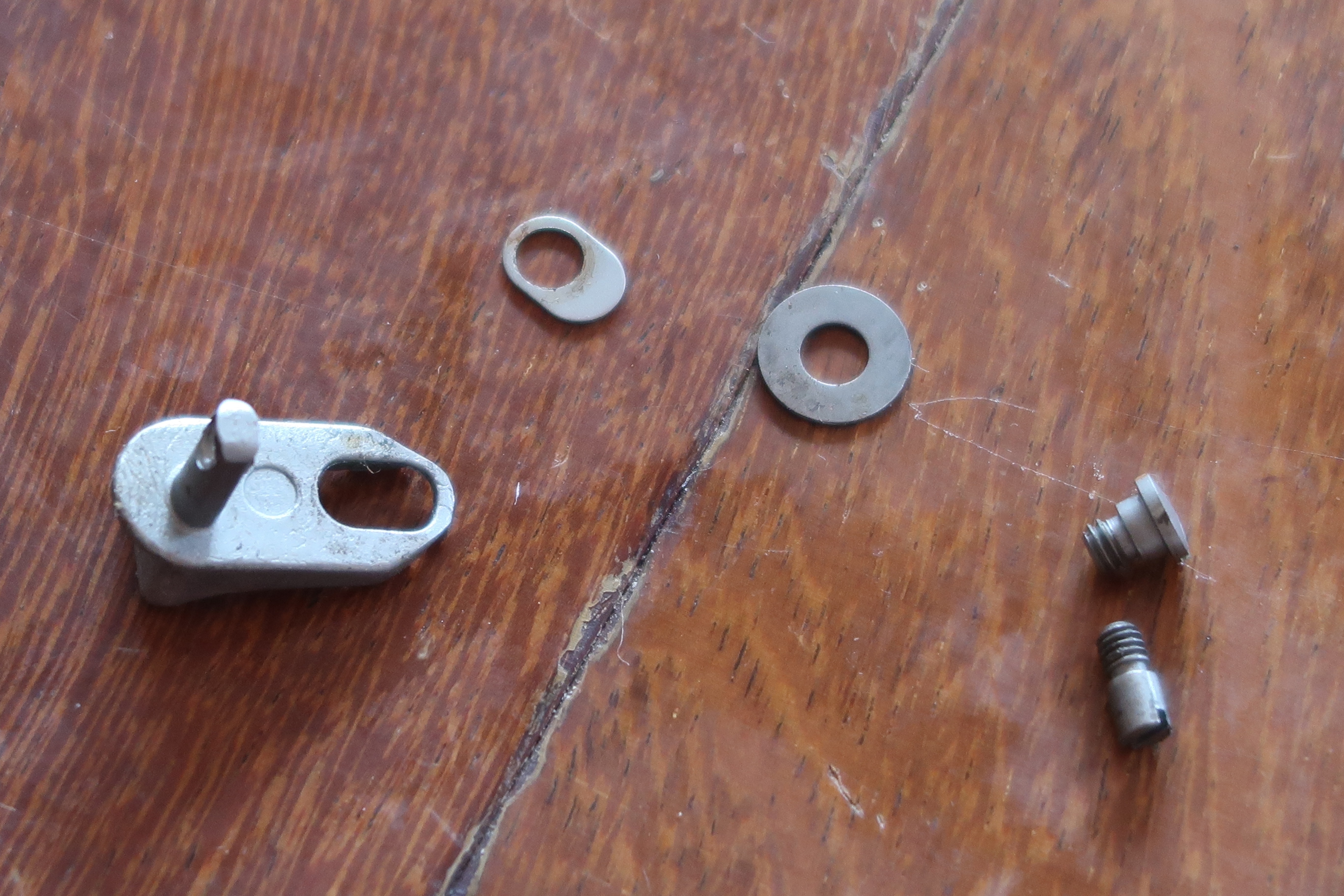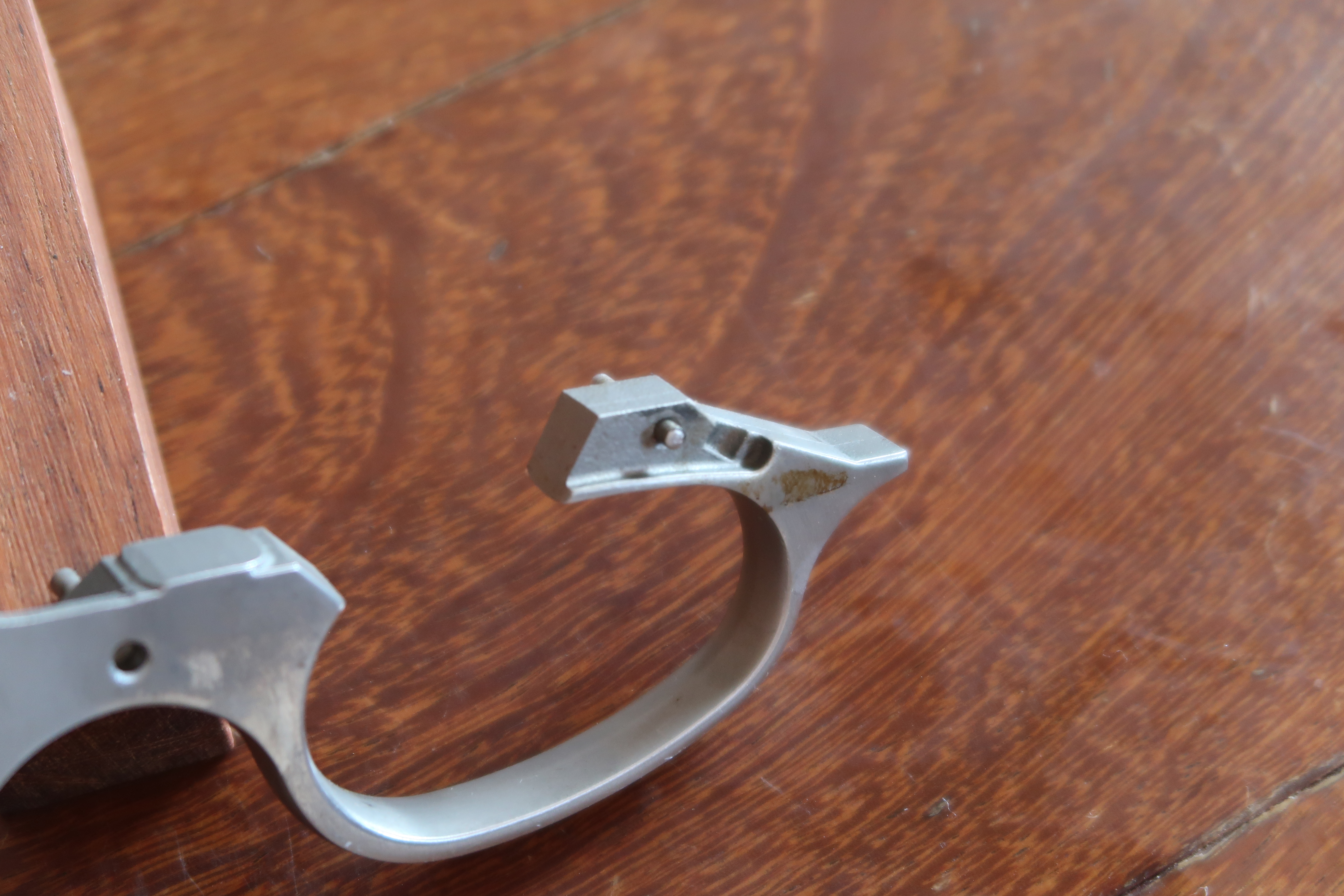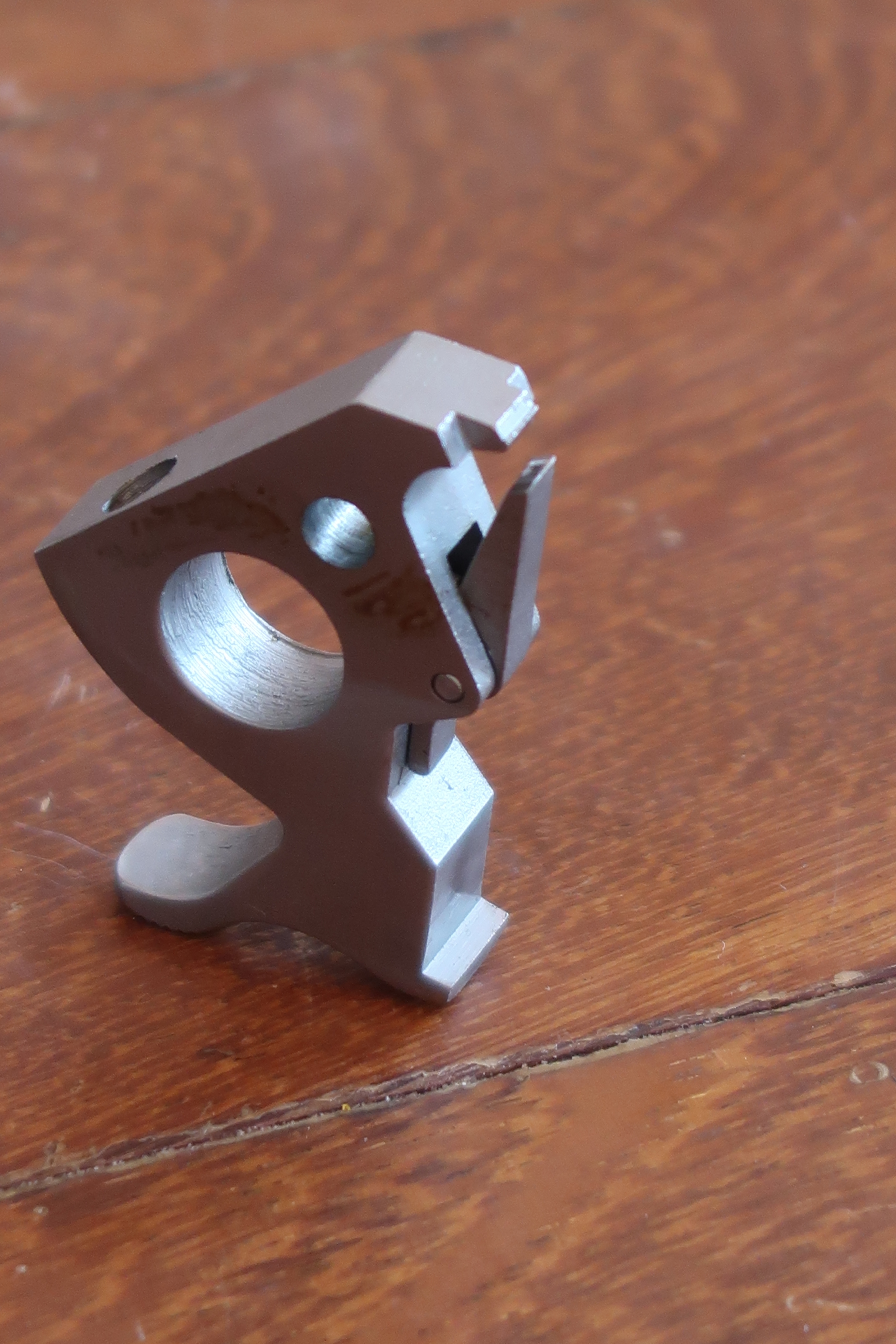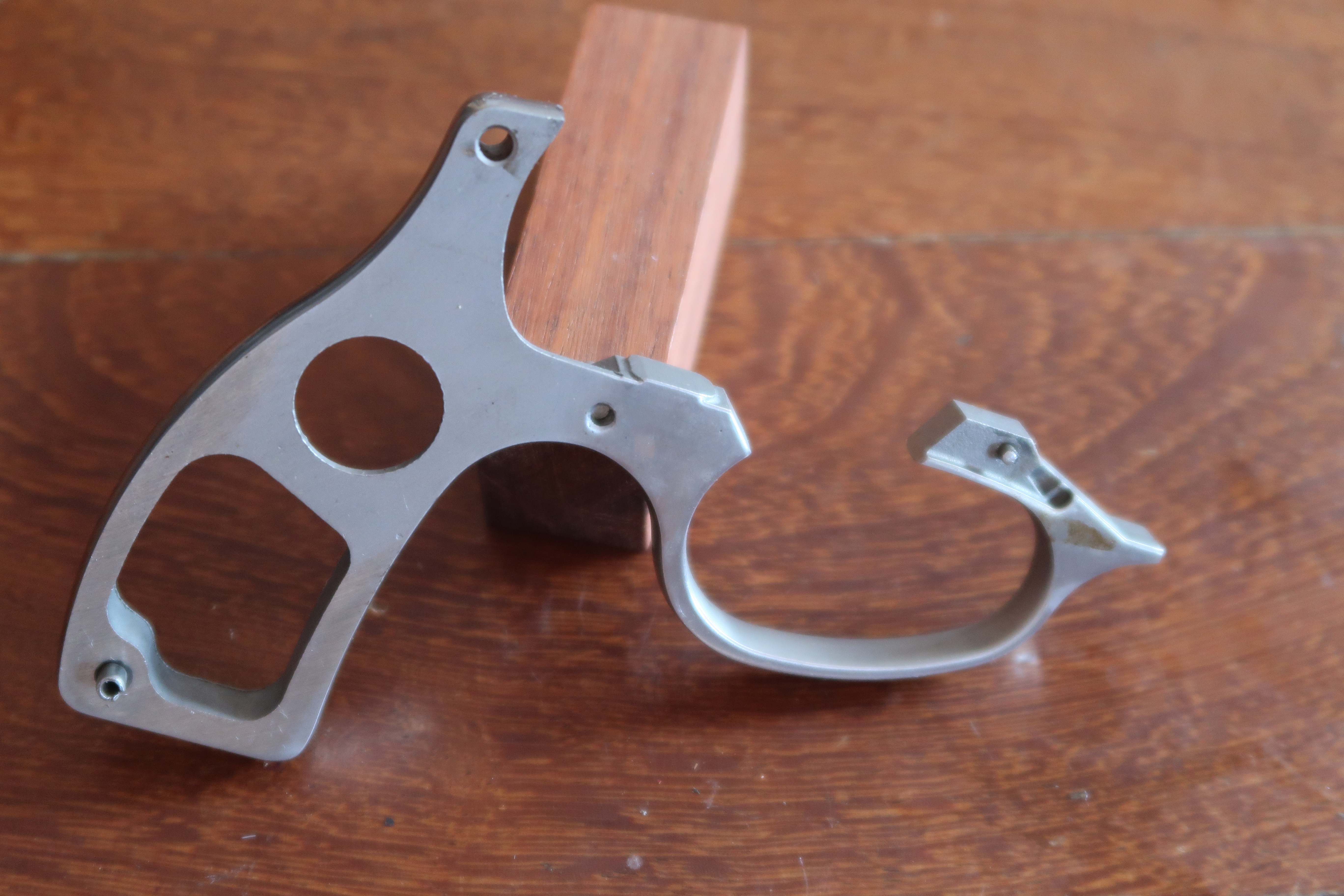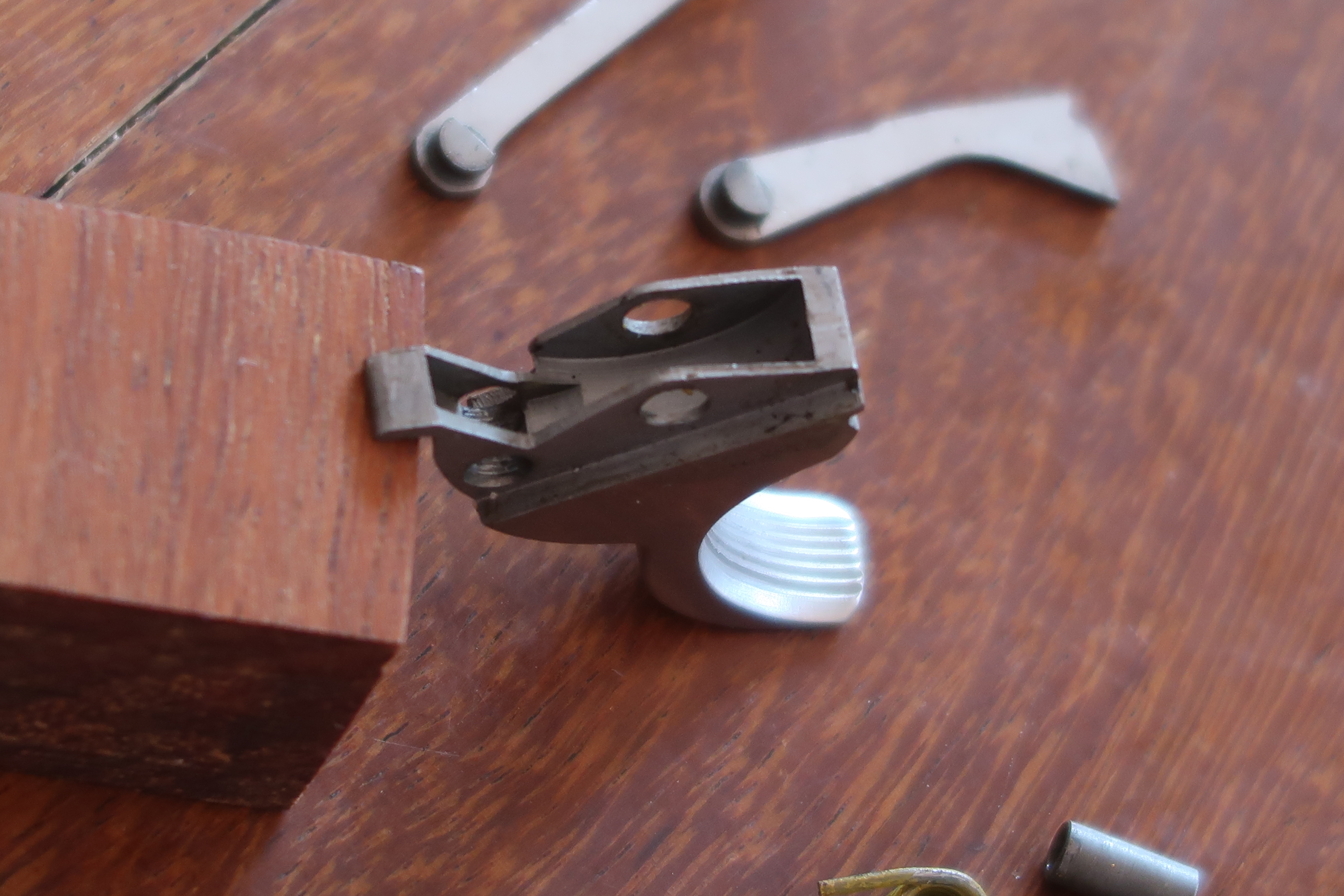 La détente est produite par micro-fusion. L’élévateur de barillet et la sécurité de percuteur sont attelés à la détente. Ces deux pièces sont assez fines, elles semblent fragiles. La détente actionne aussi le verrou de barillet. On le voit dans son logement sur les photos ci-dessous.