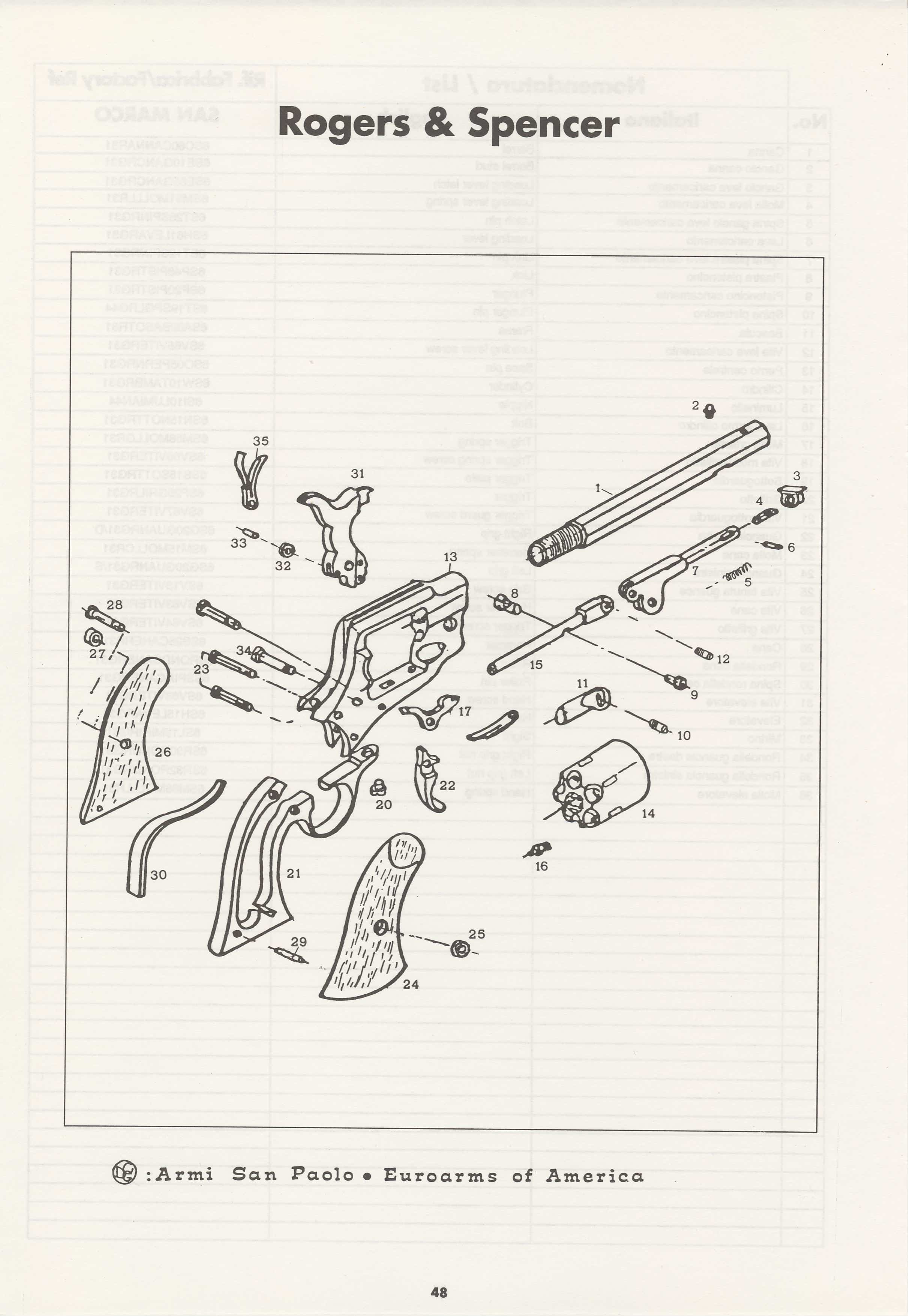L’intérêt de l’arme qui a conduit à cet article est la poignée pistolet. Ce choix permet de diviser en deux la carcasse du revolver et de ne pas avoir de plaque de recouvrement latérale. Le revolver Roger et Spencer (1863-1865, 4° vue éclatée ci-dessus) est une version assez proche (du point de vue de la conception de la carcasse) de notre revolver Charter Arms. Le mécanisme Charter Arms est crée en 1964, environ 100 ans après le Roger et Spencer.