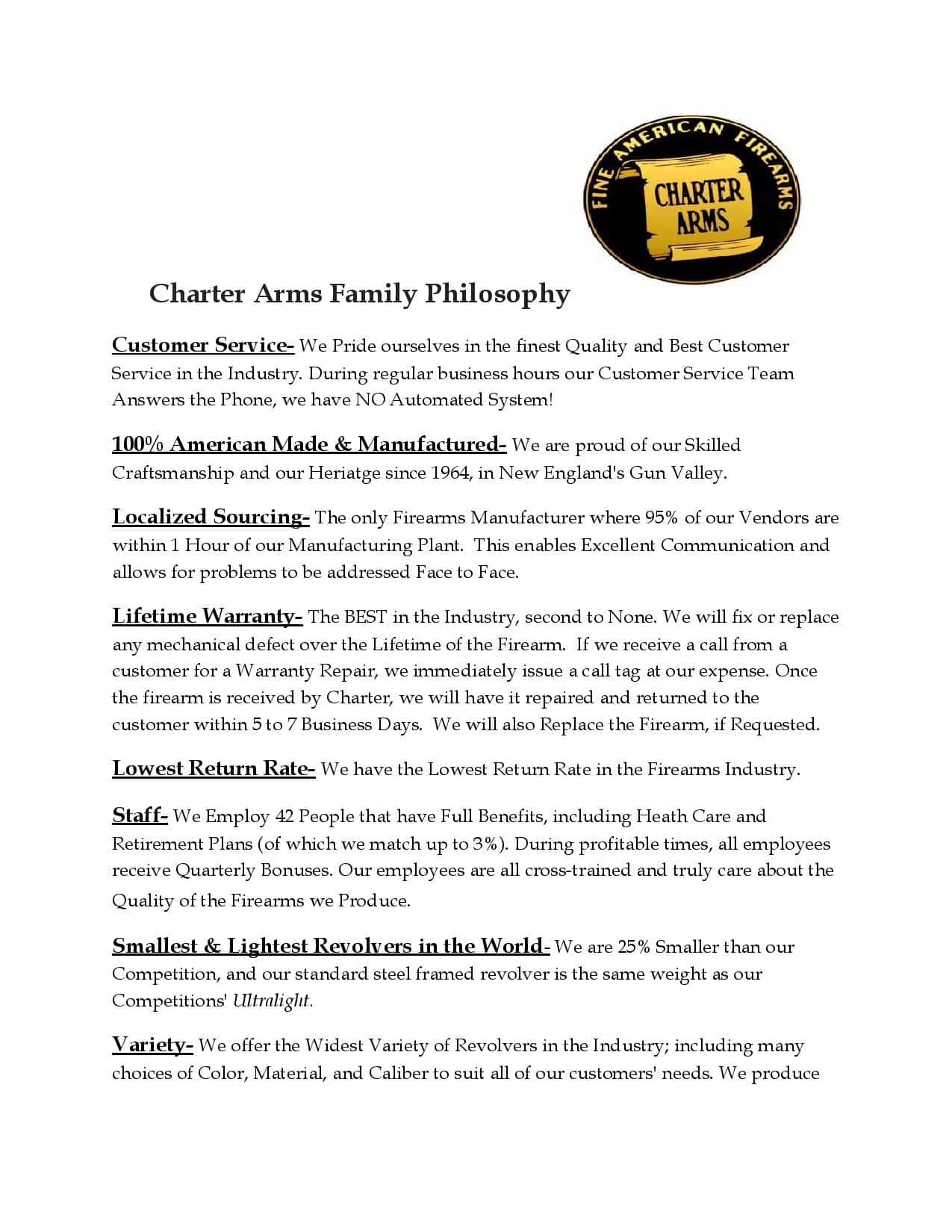 Les revolvers Charter Arms sont garantis à vie. Vous trouverez ci-dessous la philosophie de la maison.
