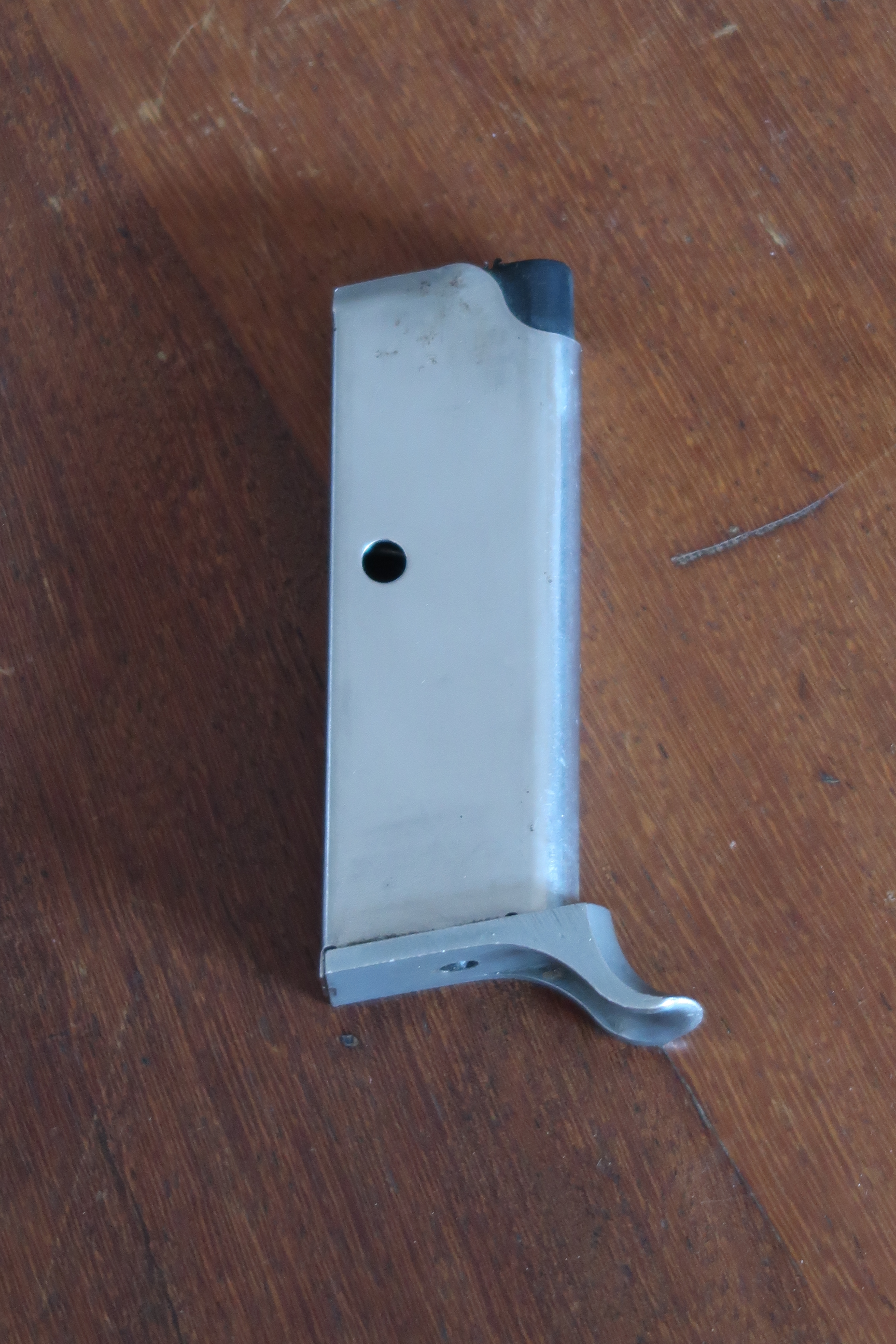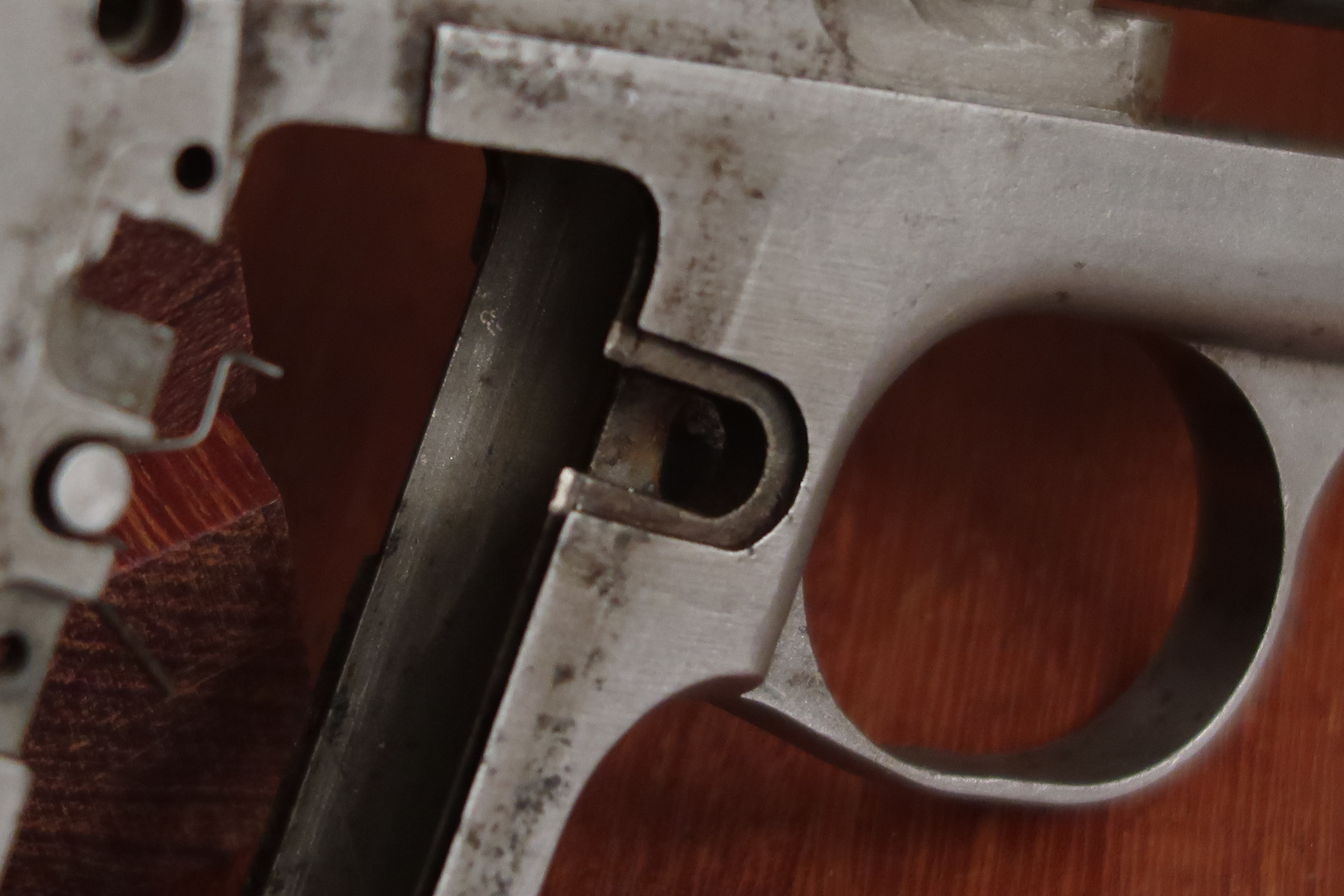 Le verrou de chargeur est une pièce aux formes complexes. Il aurait été particulièrement long et couteux de le réaliser autrement qu’en micro-fusion. L’arrêtoir de chargeur se trouve à la base de la poignée. Il faut déchausser l’arme pour extraire le chargeur. Dans une action d’urgence, il y a moins de chance de perdre le chargeur qu’en pressant un poussoir qui se trouverait près du pouce… A voir selon les goûts.