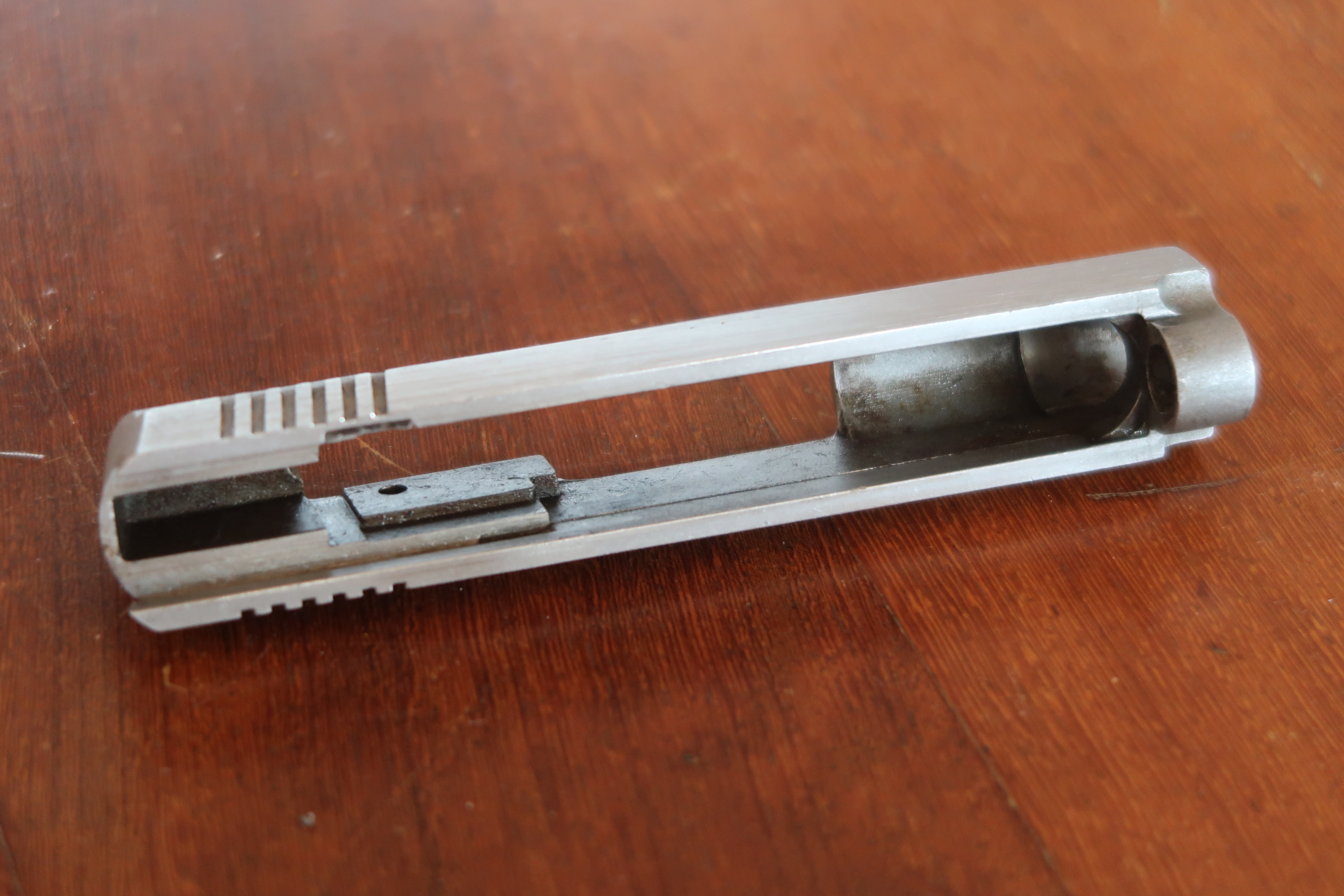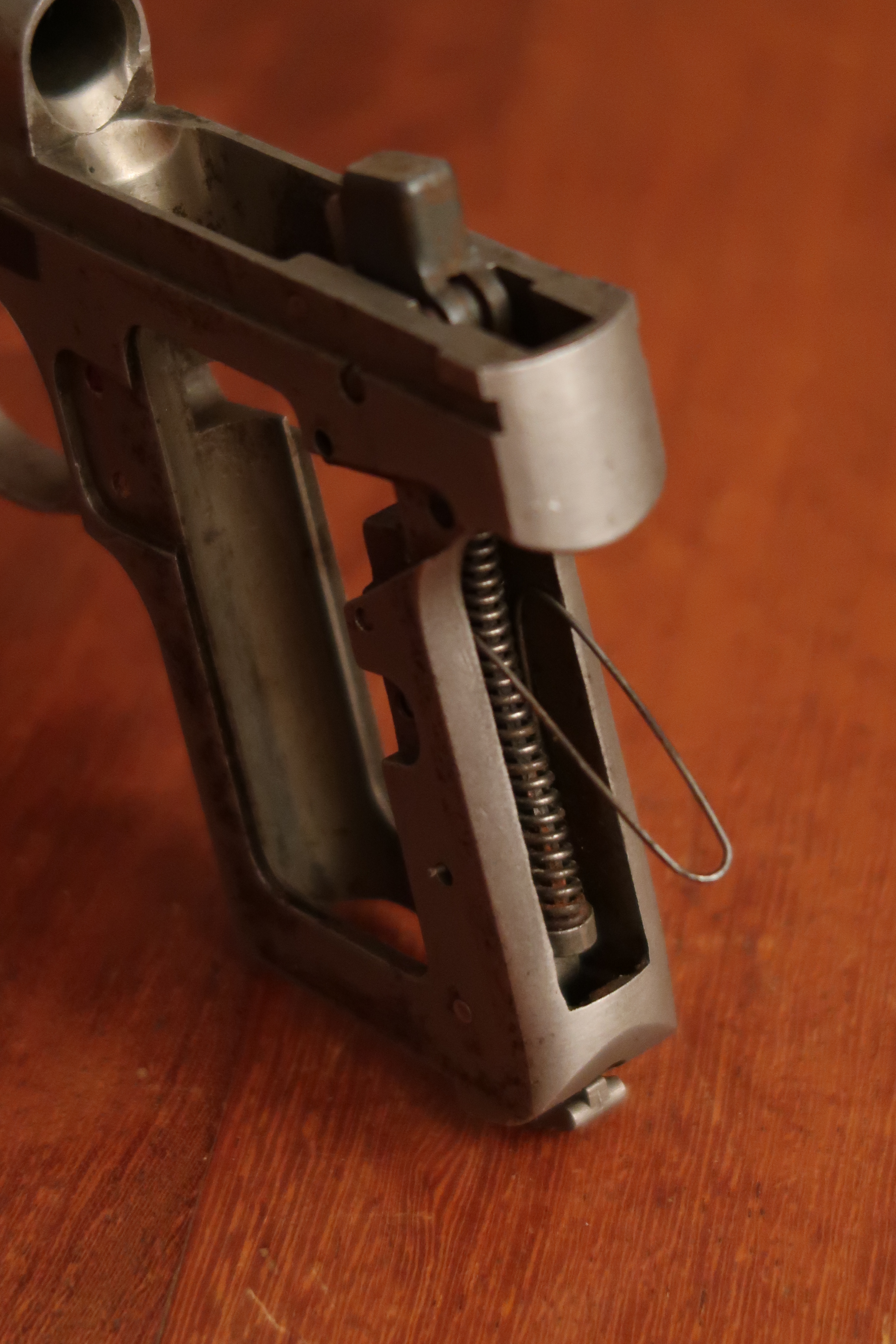 Ce pistolet est une arme à culasse non calée, dit autrement, il n’y a pas de verrouillage. La pression n’est pas suffisante pour devoir maintenir la culasse liée au canon avant la sortie de la balle du canon et donc avant la retombée de la pression. L’inertie de la culasse, la force du ressort récupérateur, l’armement du marteau sont des forces, entre autres, qui retardent l’ouverture de la culasse. Le mécanisme est plus simple, les pièces moins compliquées à construire et à assembler. On ne peut pas utiliser ce type de mécanisme avec tous les calibres.