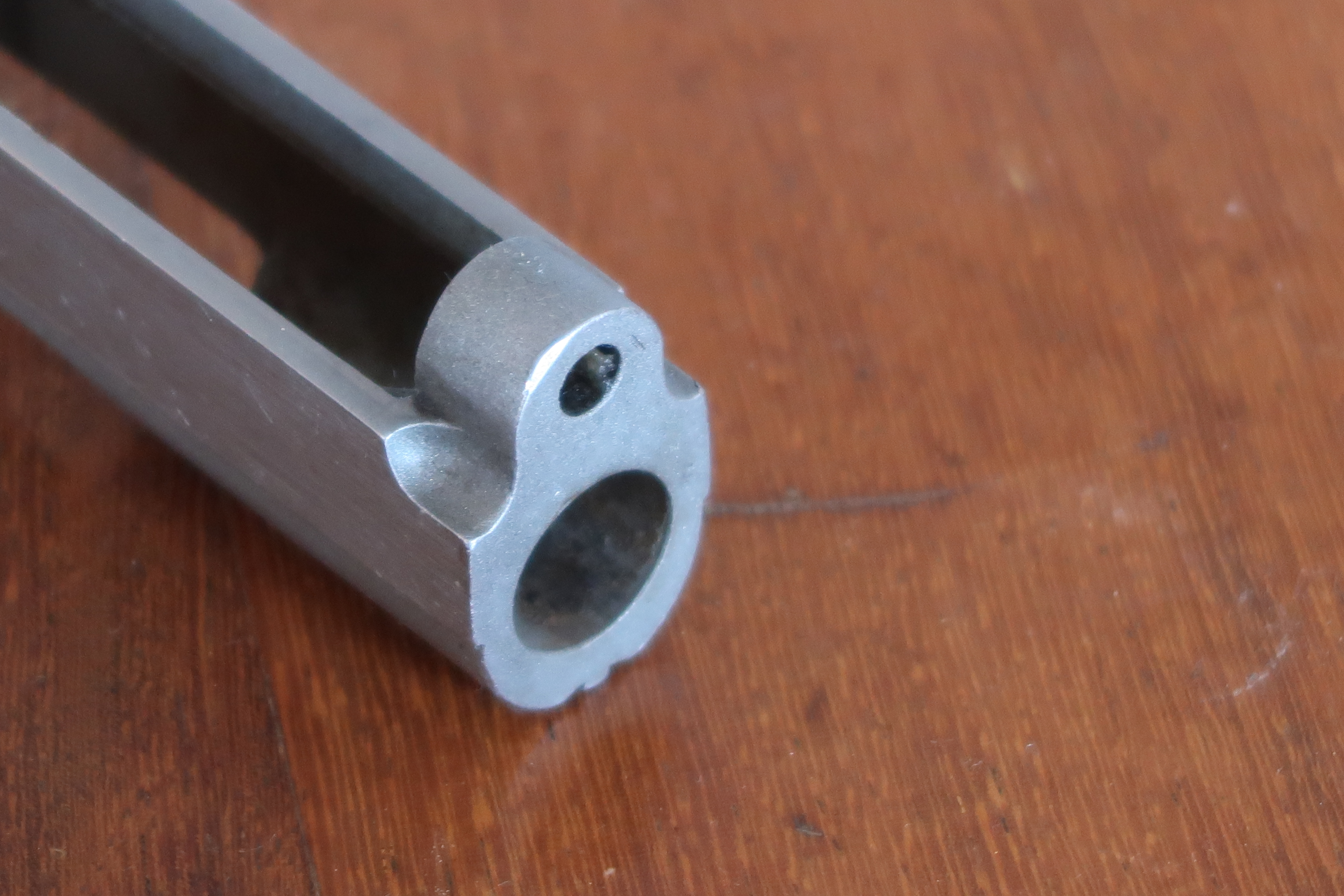 La tête de culasse se démonte par le dessus du corps de la culasse, après extraction de la goupille. Il faut prendre soin de rentrer le percuteur dans son logement avec un tournevis fin ou en utilisant l’extracteur (voir plus loin dans cette article) sinon vous ne pourrez pas désolidariser les deux pièces car le percuteur butte à l’intérieur du corps de la culasse.