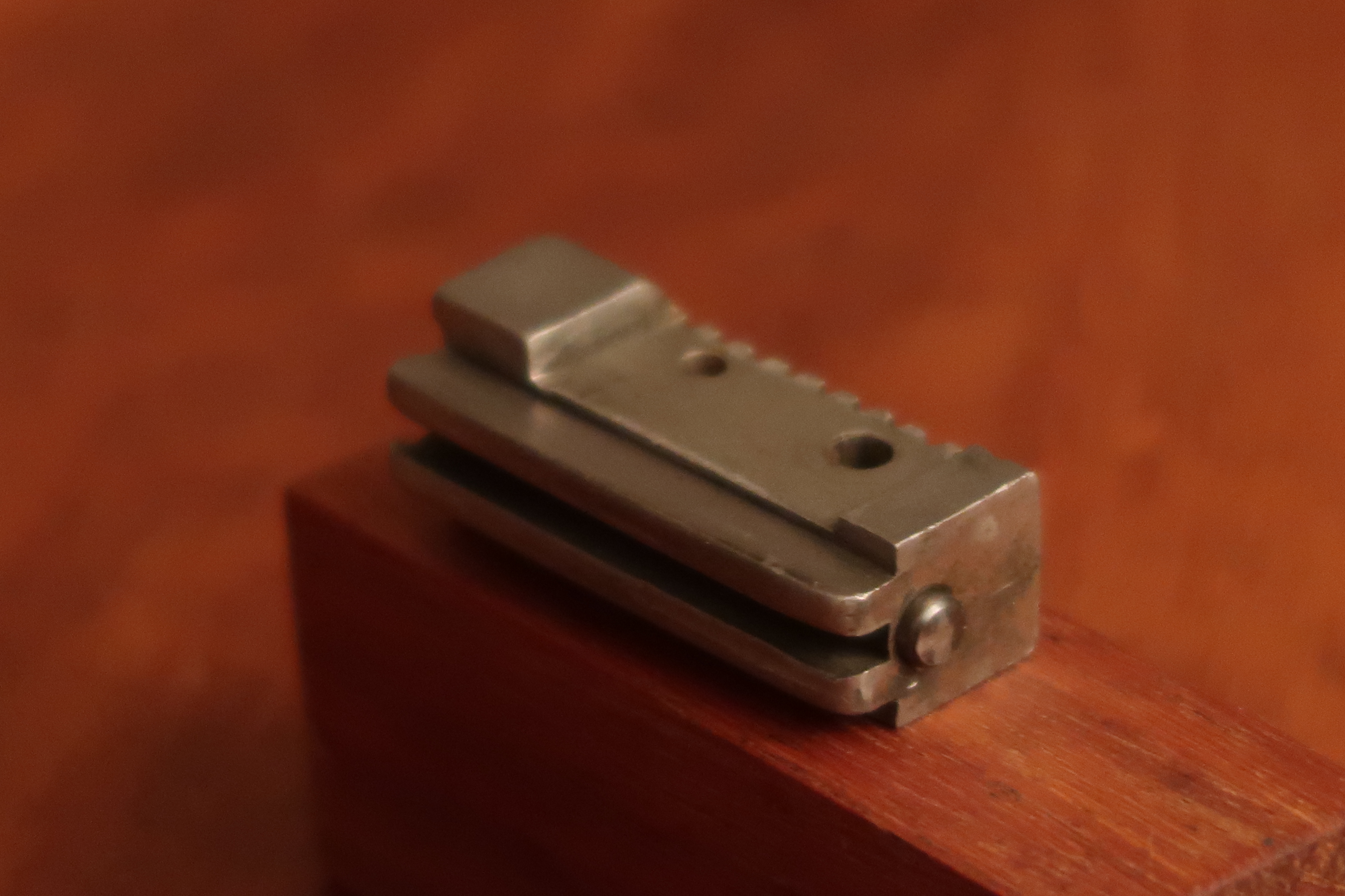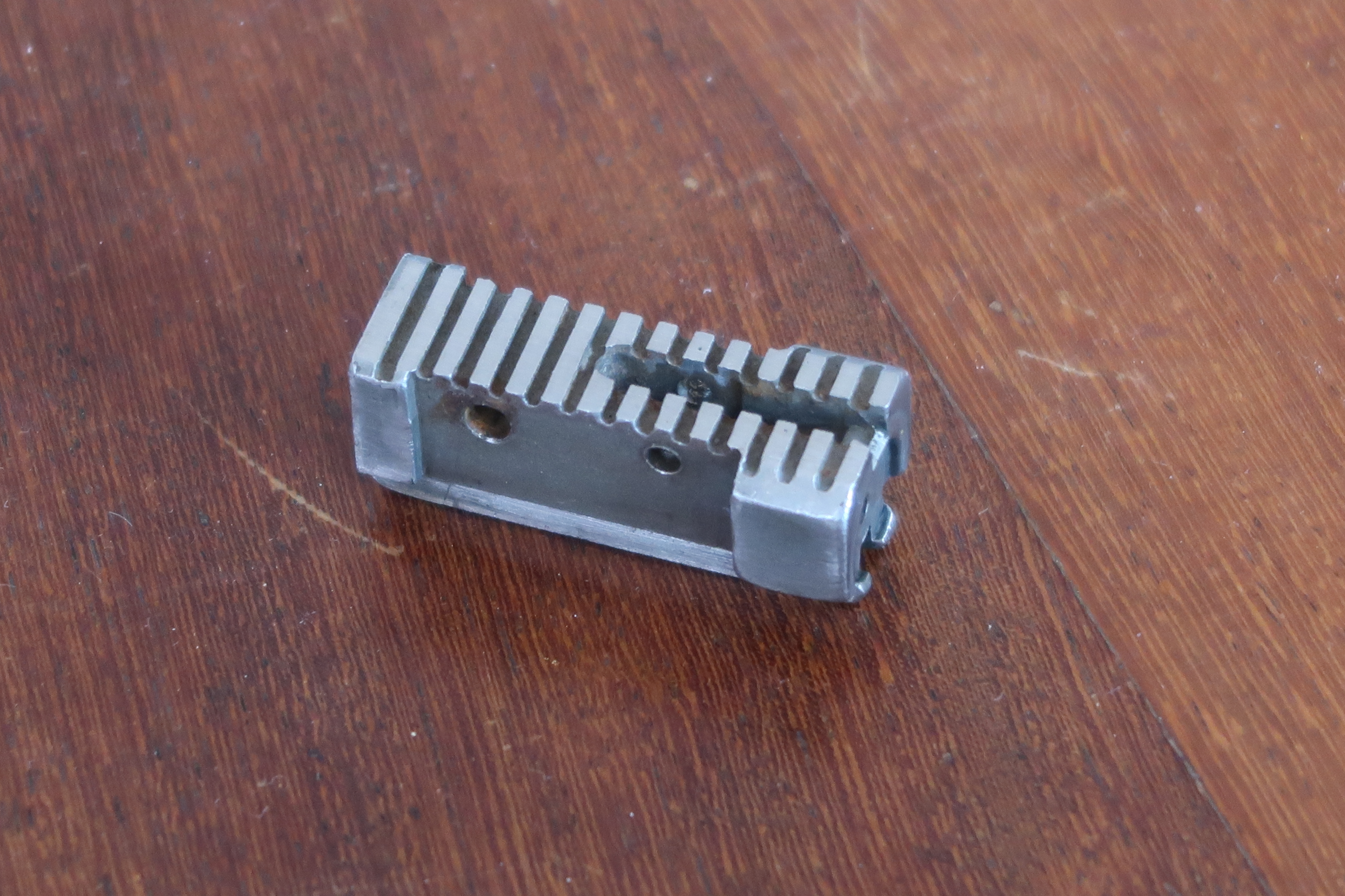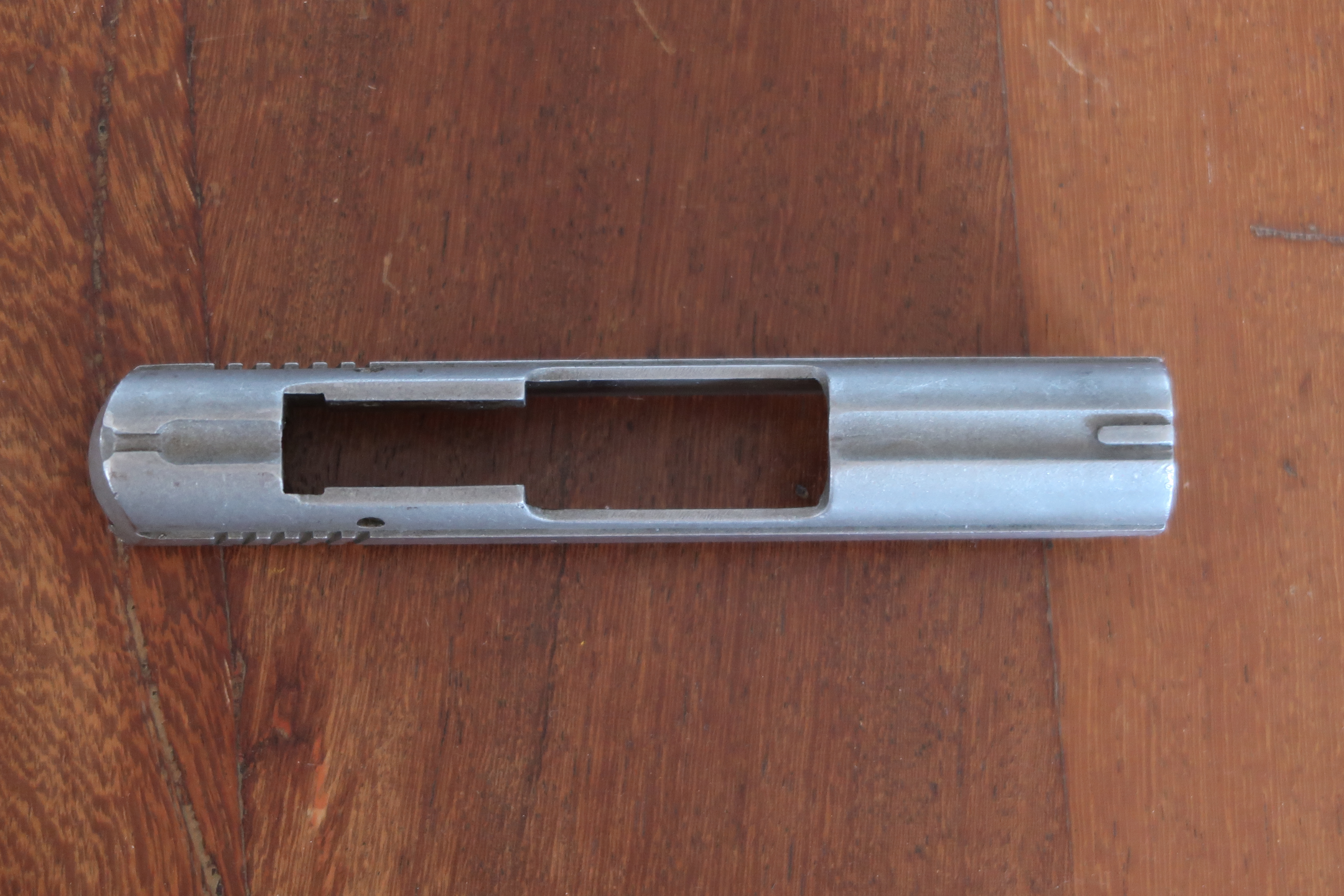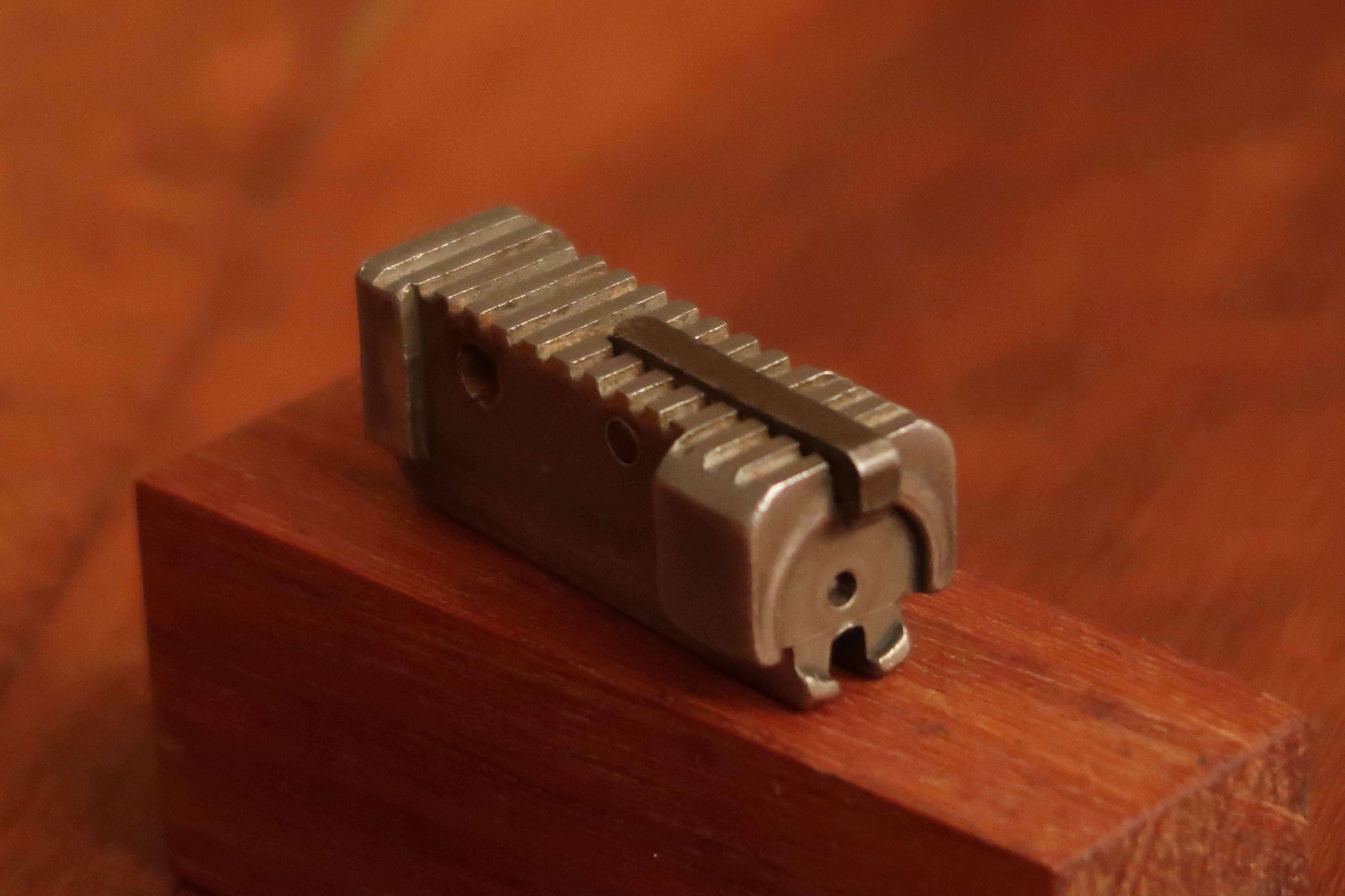 La culasse entre dans un bloc capable de : 124,5 mm x 31,5 mm x 20,3 mm. Elle en acier. Je pense que l’ébauche de la pièce provient de micro-fusion. Je dis “je pense” car ce n’est pas flagrant. Ce qui me fait dire cela est la forme de l’emplacement du marteau. Le marteau n’étant pas apparent, il faut lui aménager un emplacement interne (comme sur le pistolet Ruby). Ce logement, sur le pistolet Backup II, ne peut être obtenu par un usinage classique (fraisage), il n’a pas de trace de fraise (rayon de la fraise, ici les angles sont vifs). La micro-fusion est très fine.