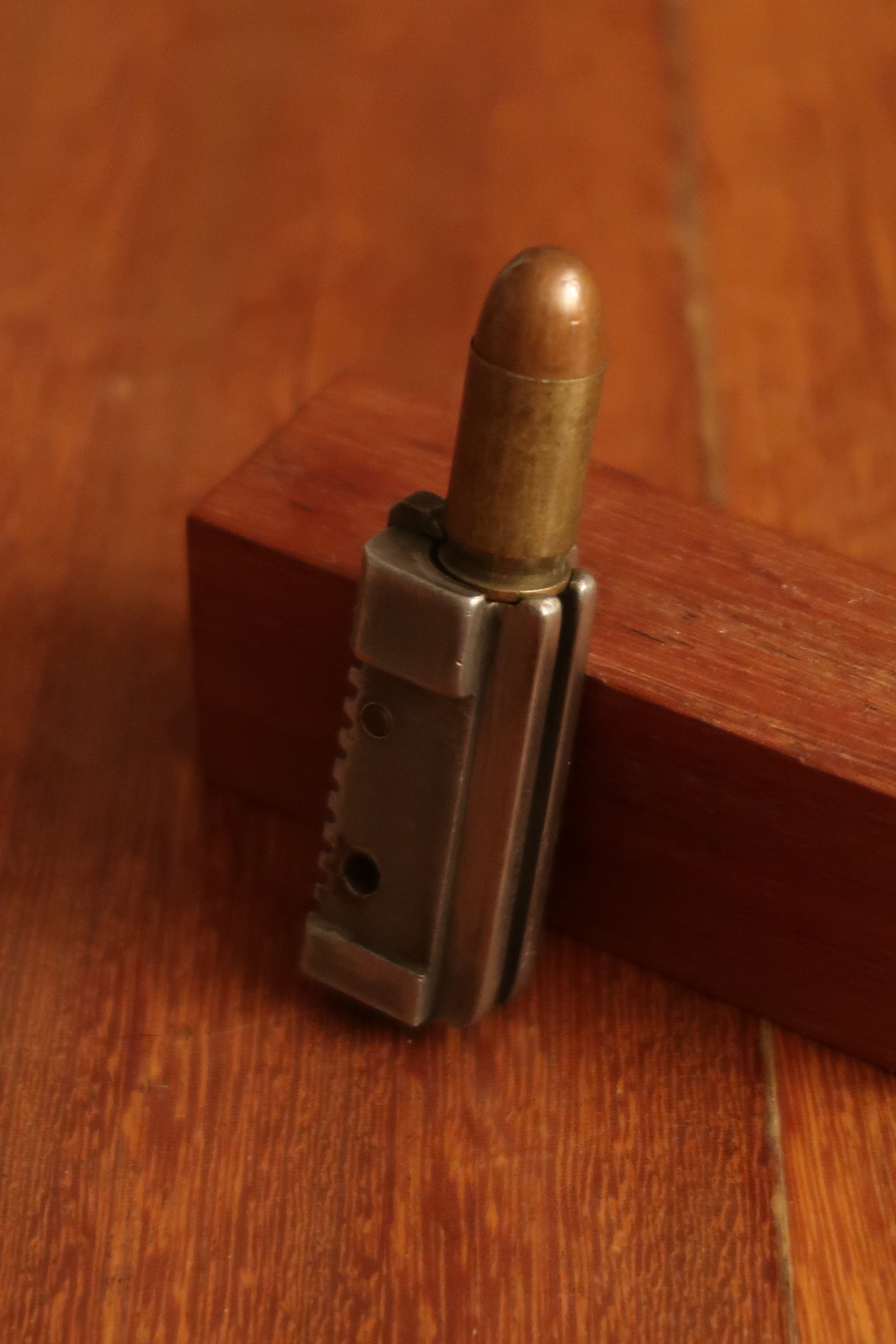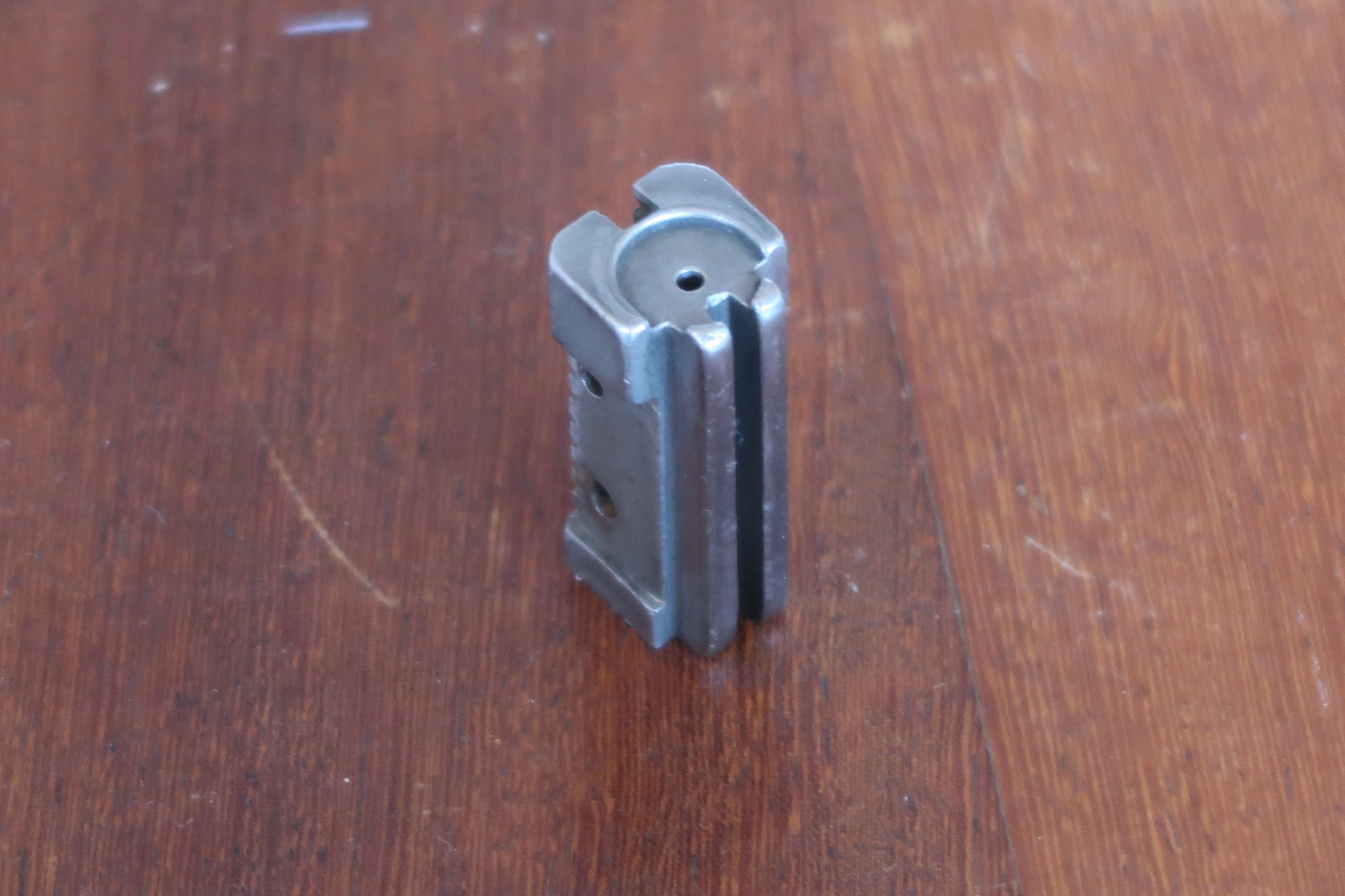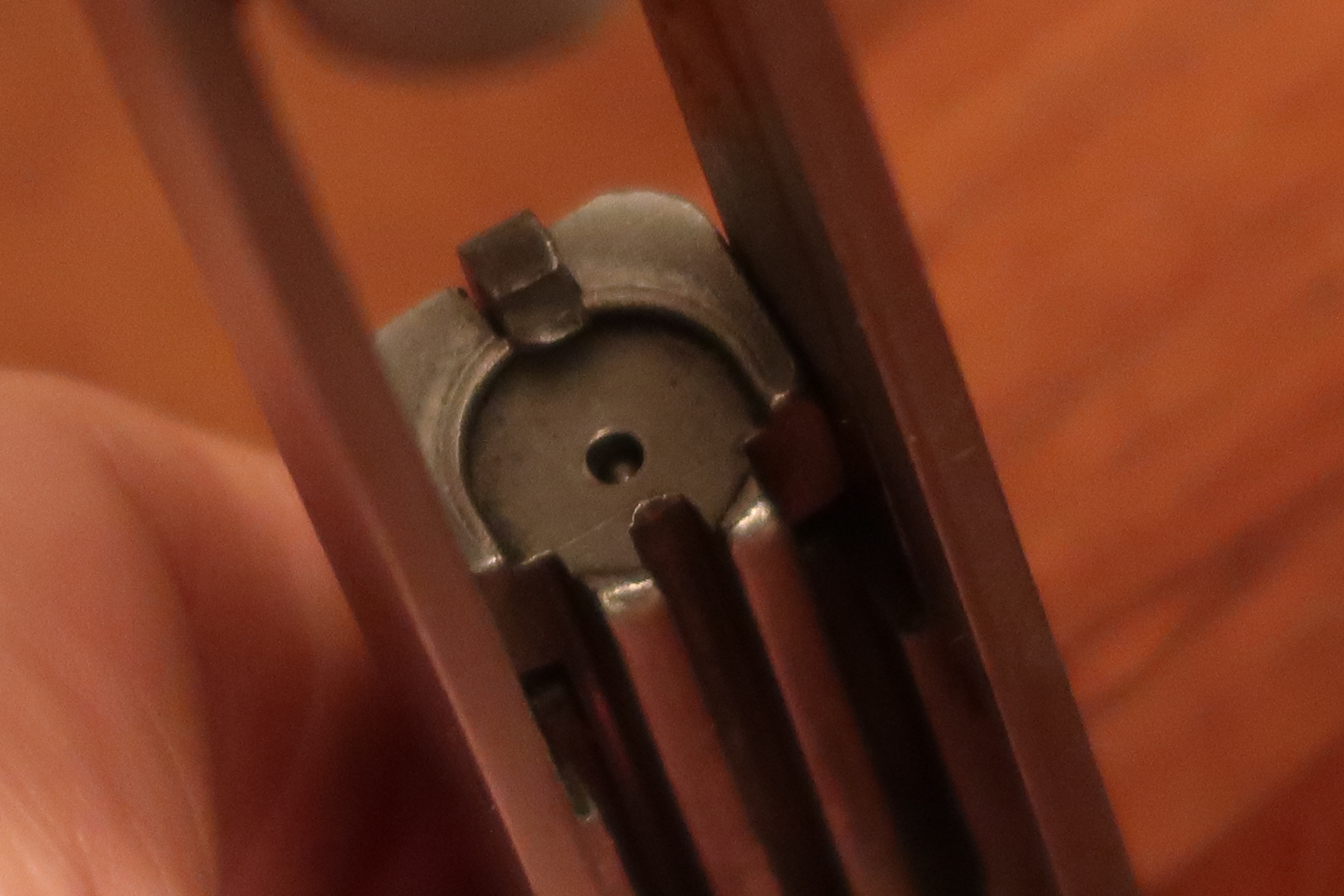 La tête de culasse est amovible. Elle entre dans un bloc capable de : 35,3 mm x 14,8 mm x 14 mm. Elle est maintenue sur le corps de la culasse par une goupille élastique type mécanindus (diamètre : 3 mm). L’effort produit par les gaz de combustion ne s’applique pas sur la goupille. Dit autrement, la pièce secondaire n’est pas seulement maintenue en place par une goupille élastique. Mais le concepteur a aménagé des surfaces d’appui de la pièce secondaire sur le corps de la culasse. Au départ du coup la pression appliquée par l’intermédiaire de l’étui vient plaquer la tête de culasse sur ses butées arrières, dans le corps de la culasse.