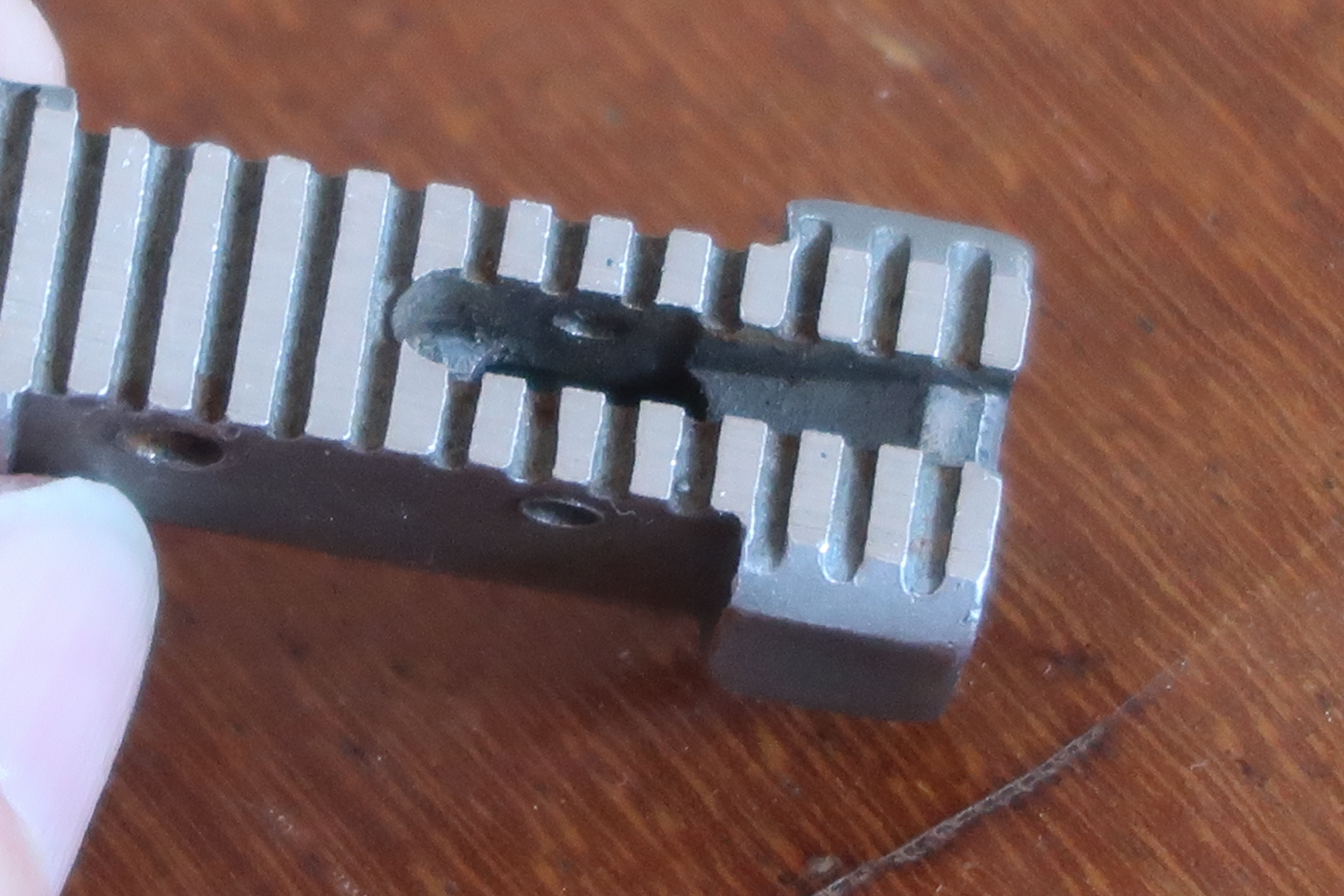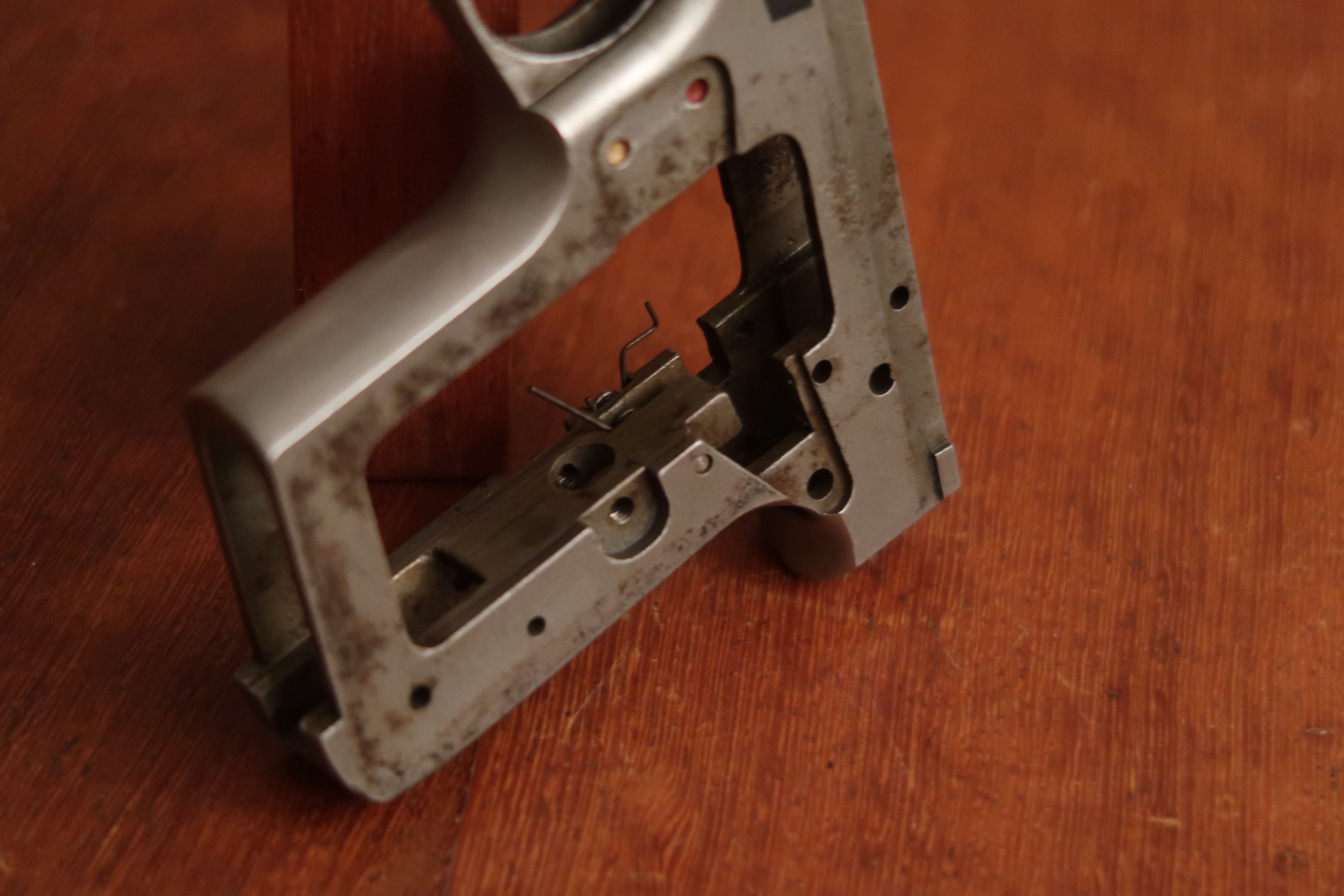 La gâchette est une pièce de micro-fusion. Elle a une excroissance de chaque coté. A gauche pour limiter les mouvements par la sûreté manuelle, à droite pour la pédale de sûreté arrière et la barrette séparateur. La gâchette de l’arme que l’on voit ici est oxydée comme plusieurs pièces du mécanisme.