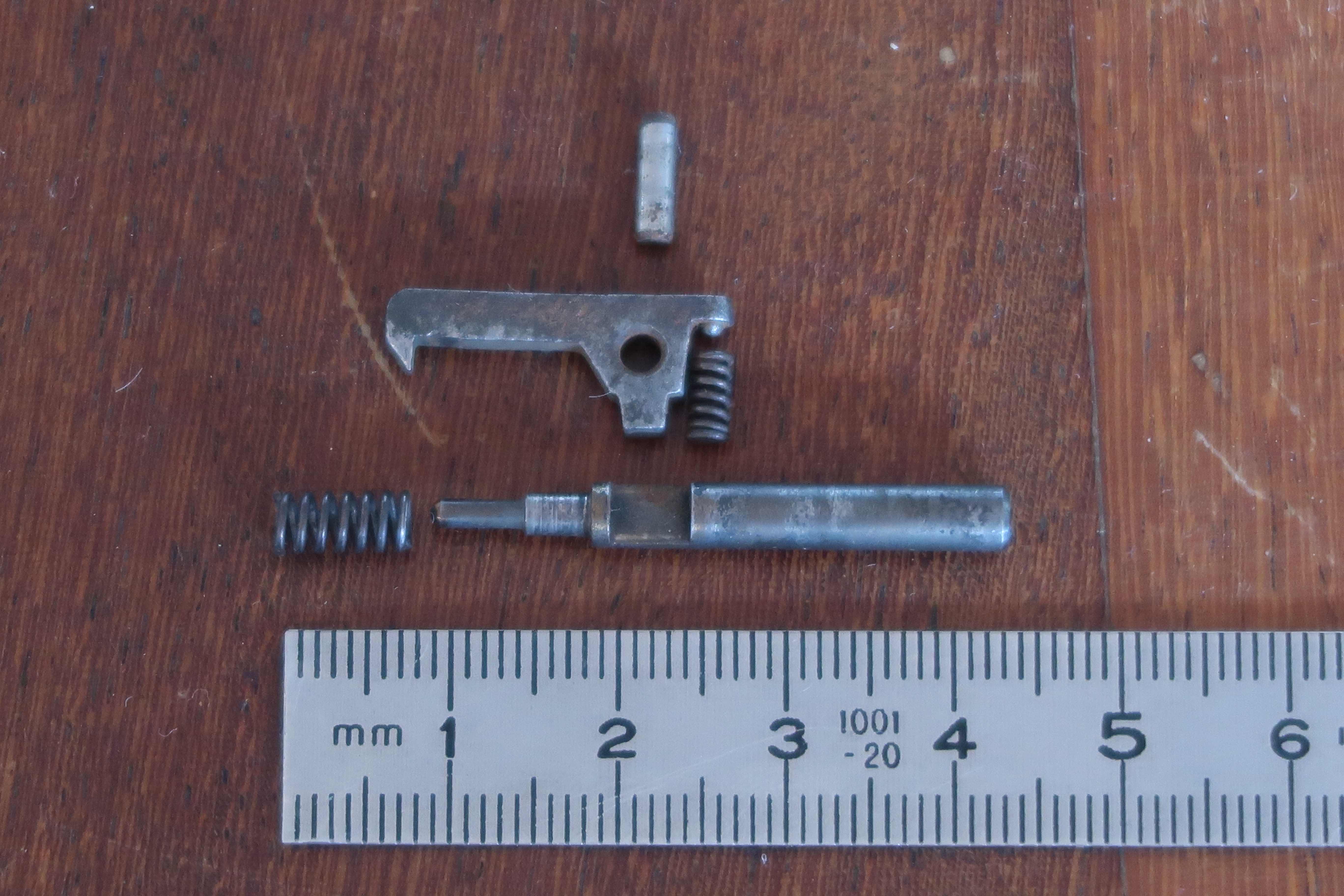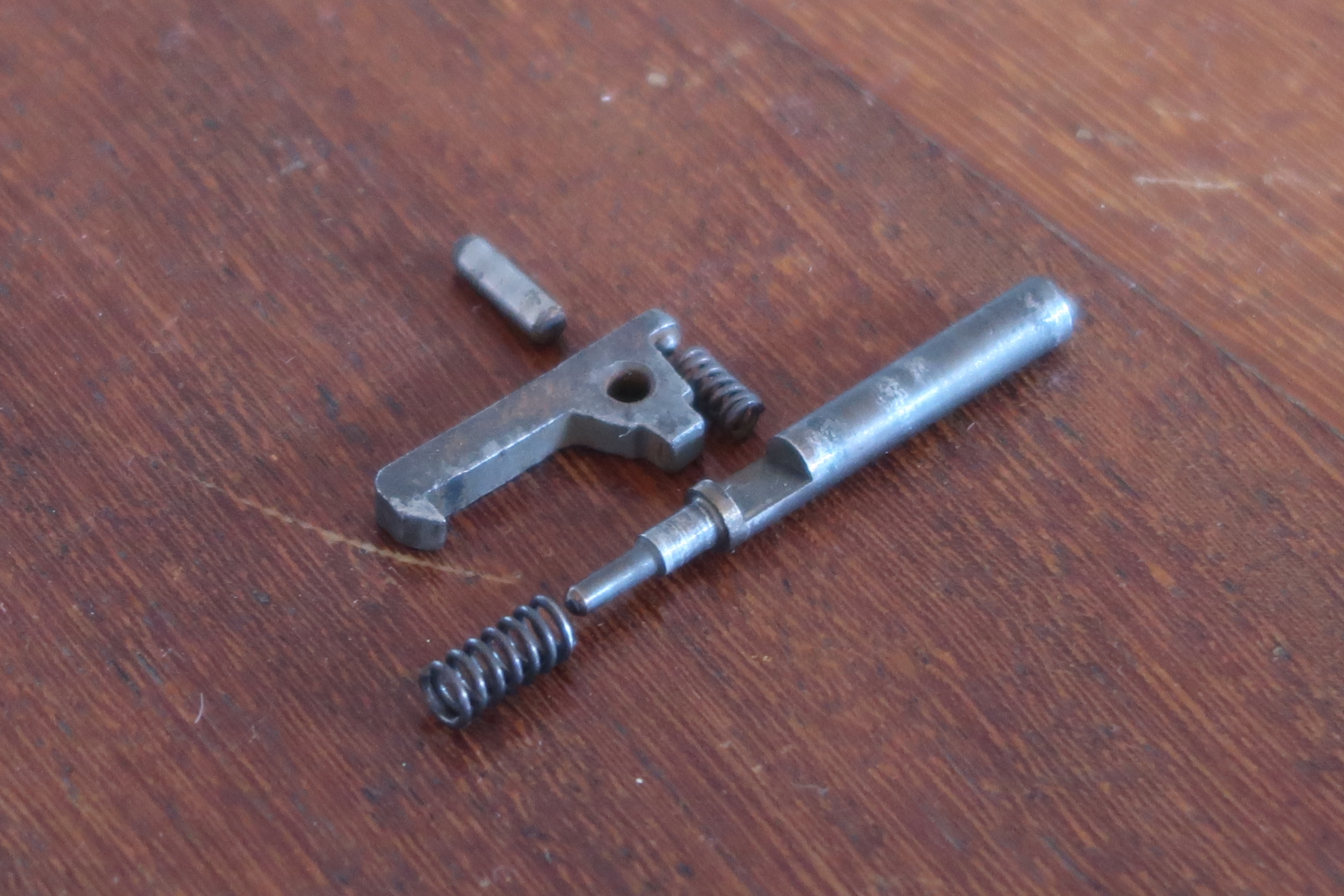 Une excroissance du dessous de l’extracteur maintien le percuteur dans son logement. Finalement une seule goupille (celle de l’extracteur, ou plus exactement un axe) donne la cohésion à l’ensemble.