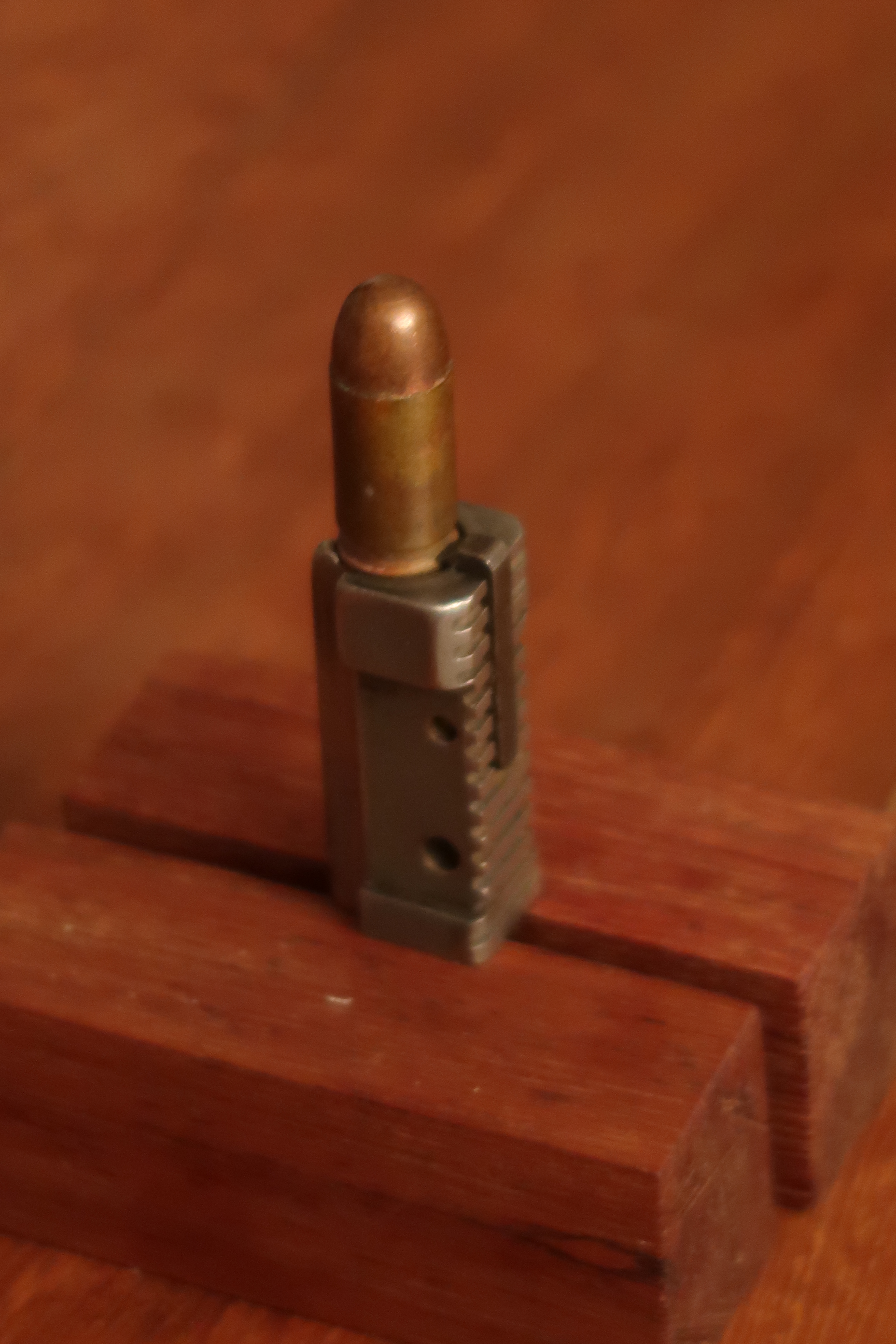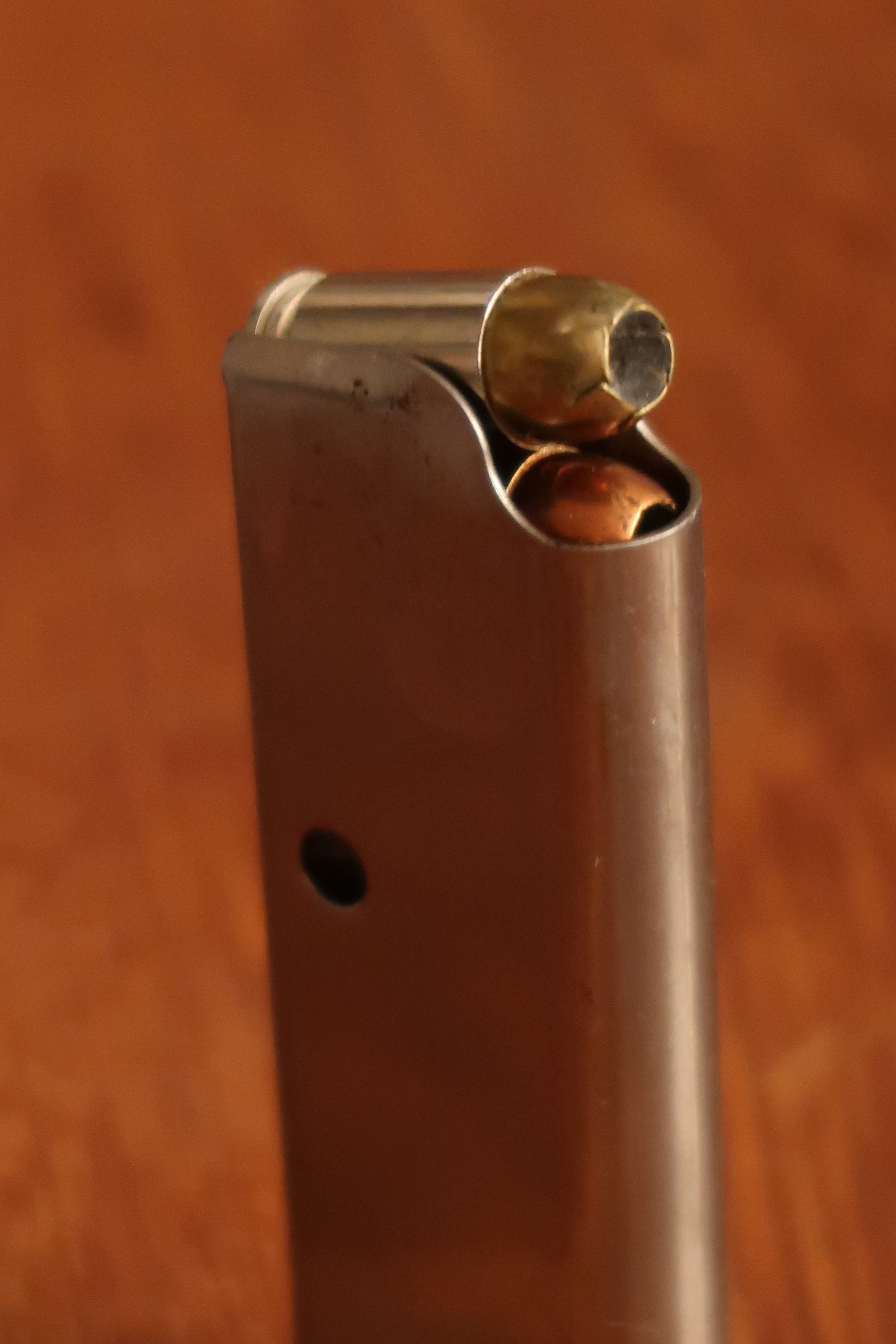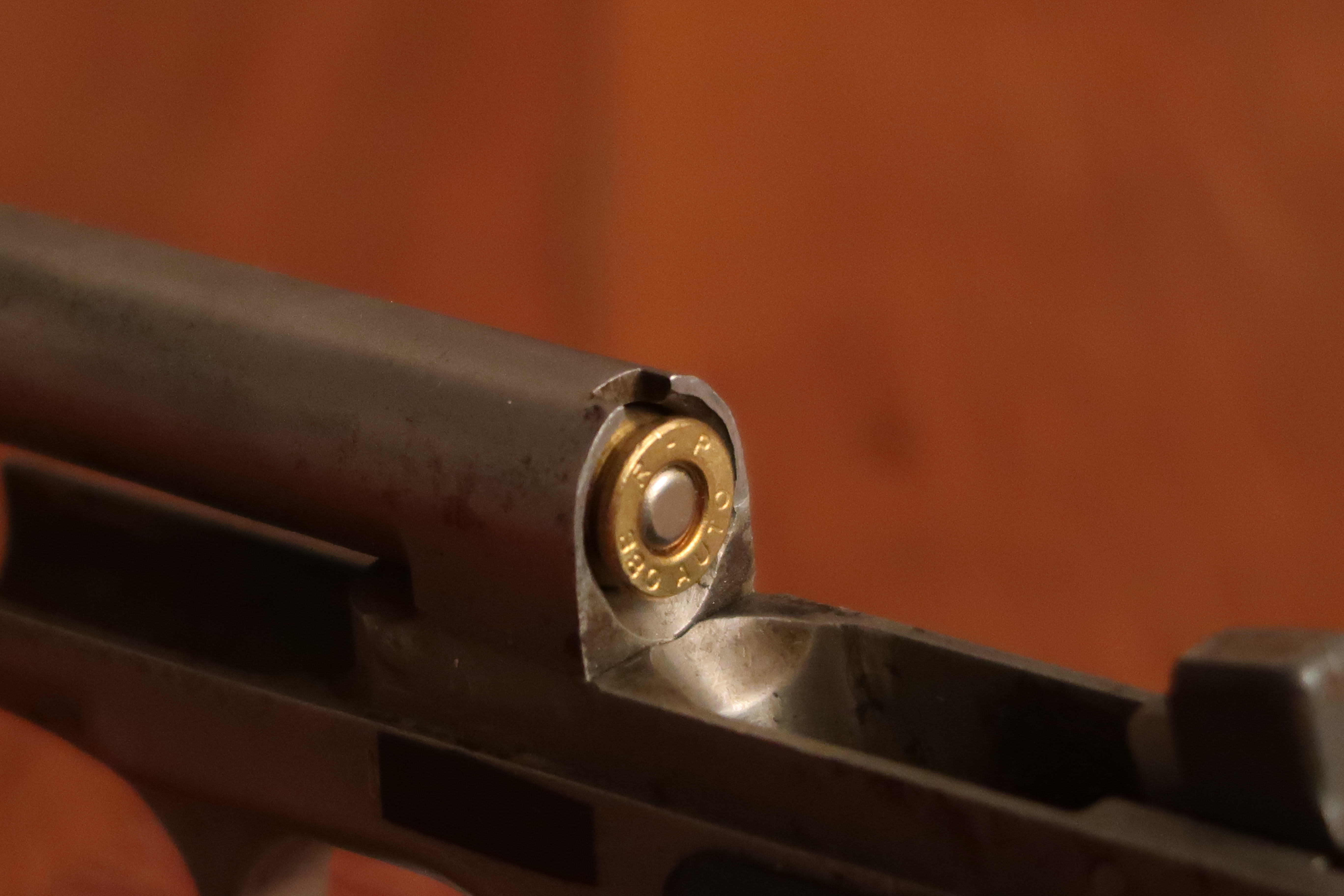 - AMT Backup II, vue d’une cartouche prète a être chambrée.