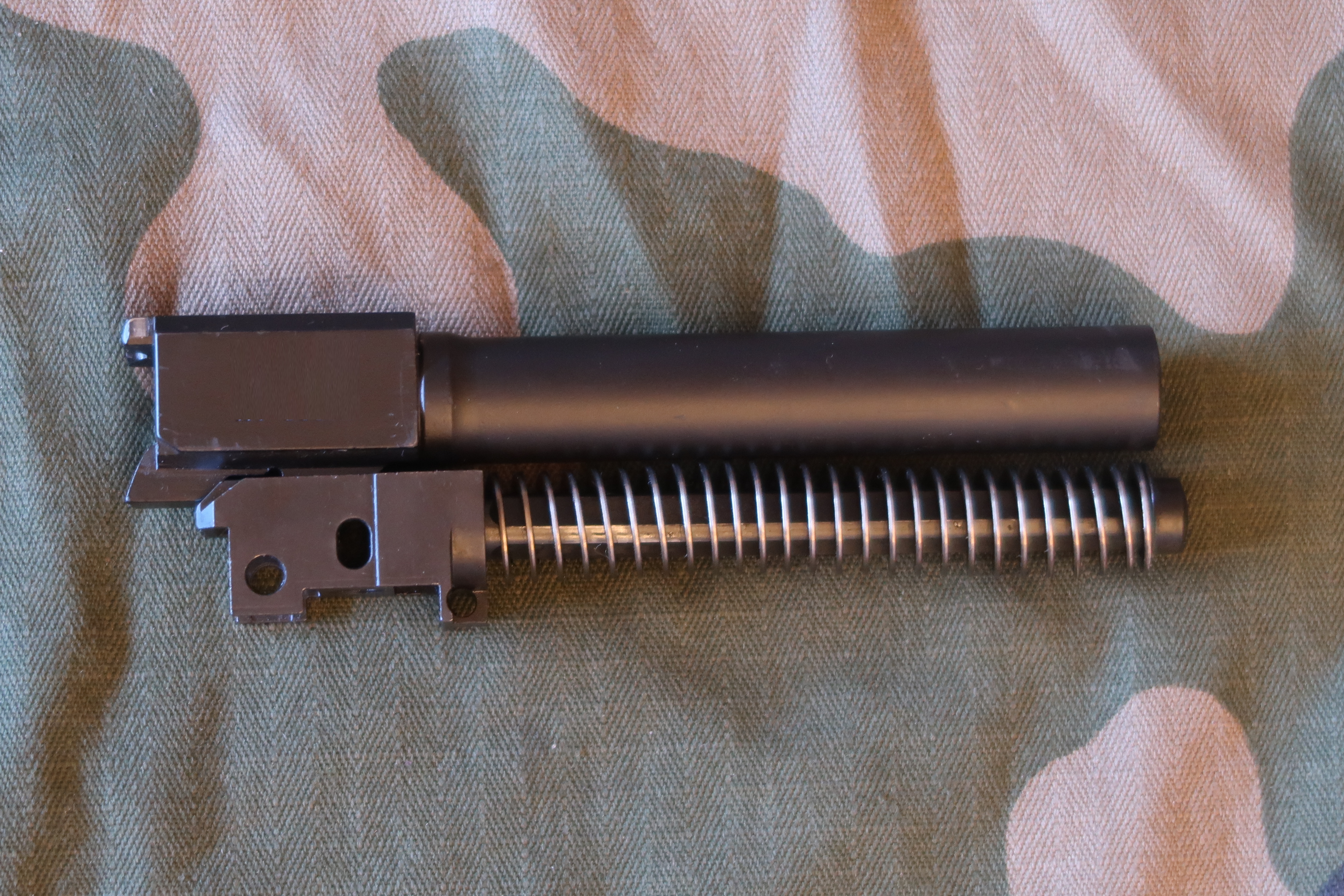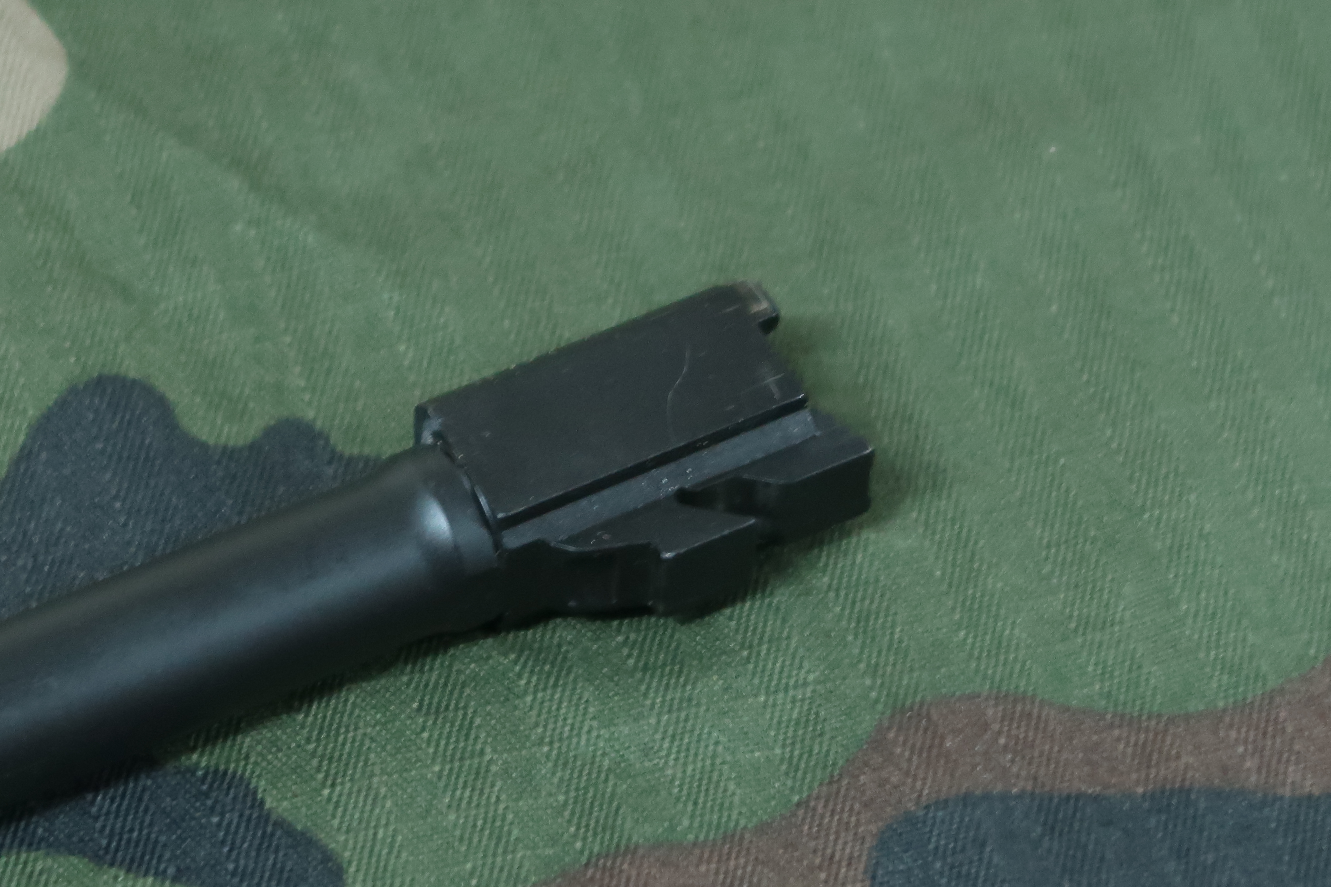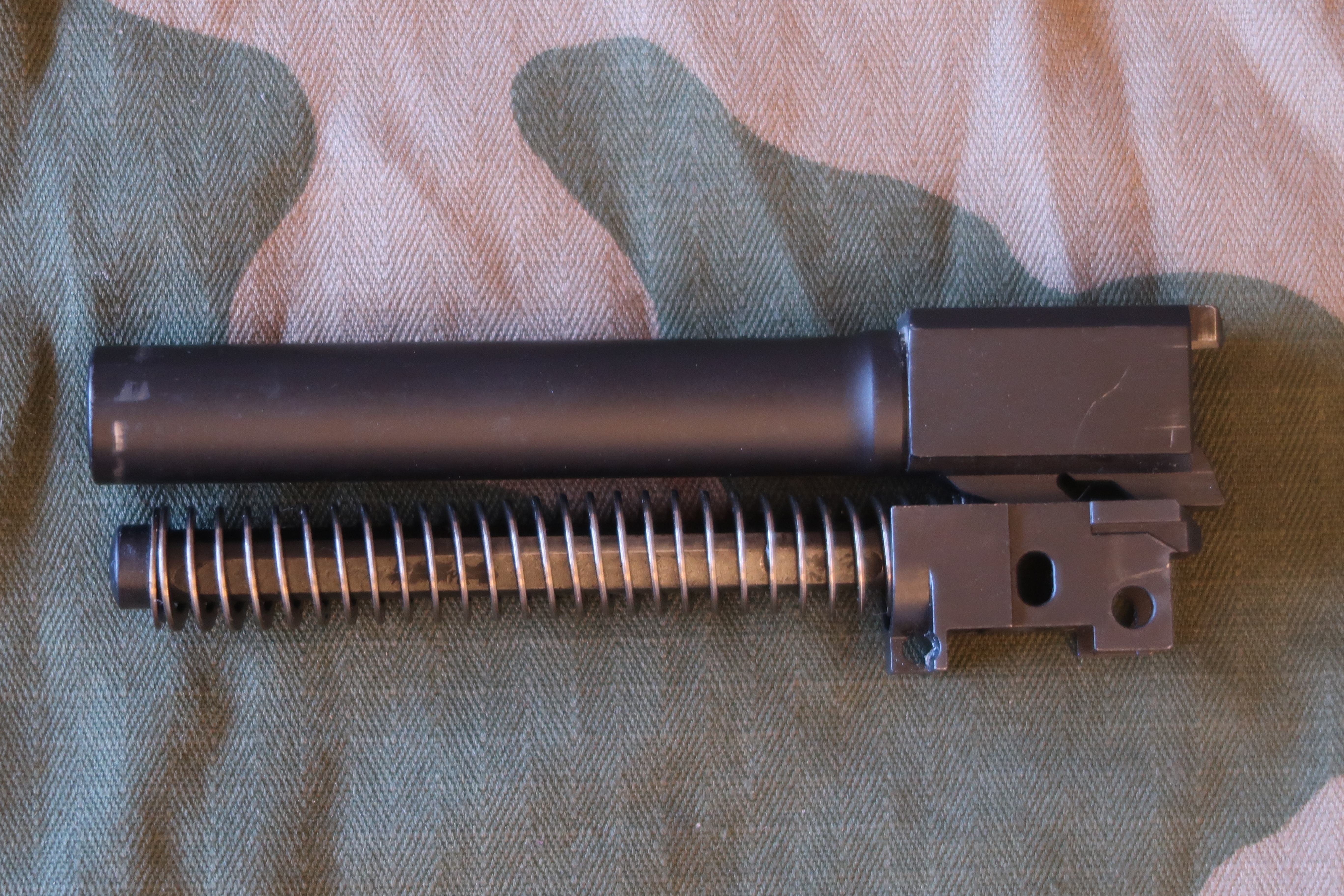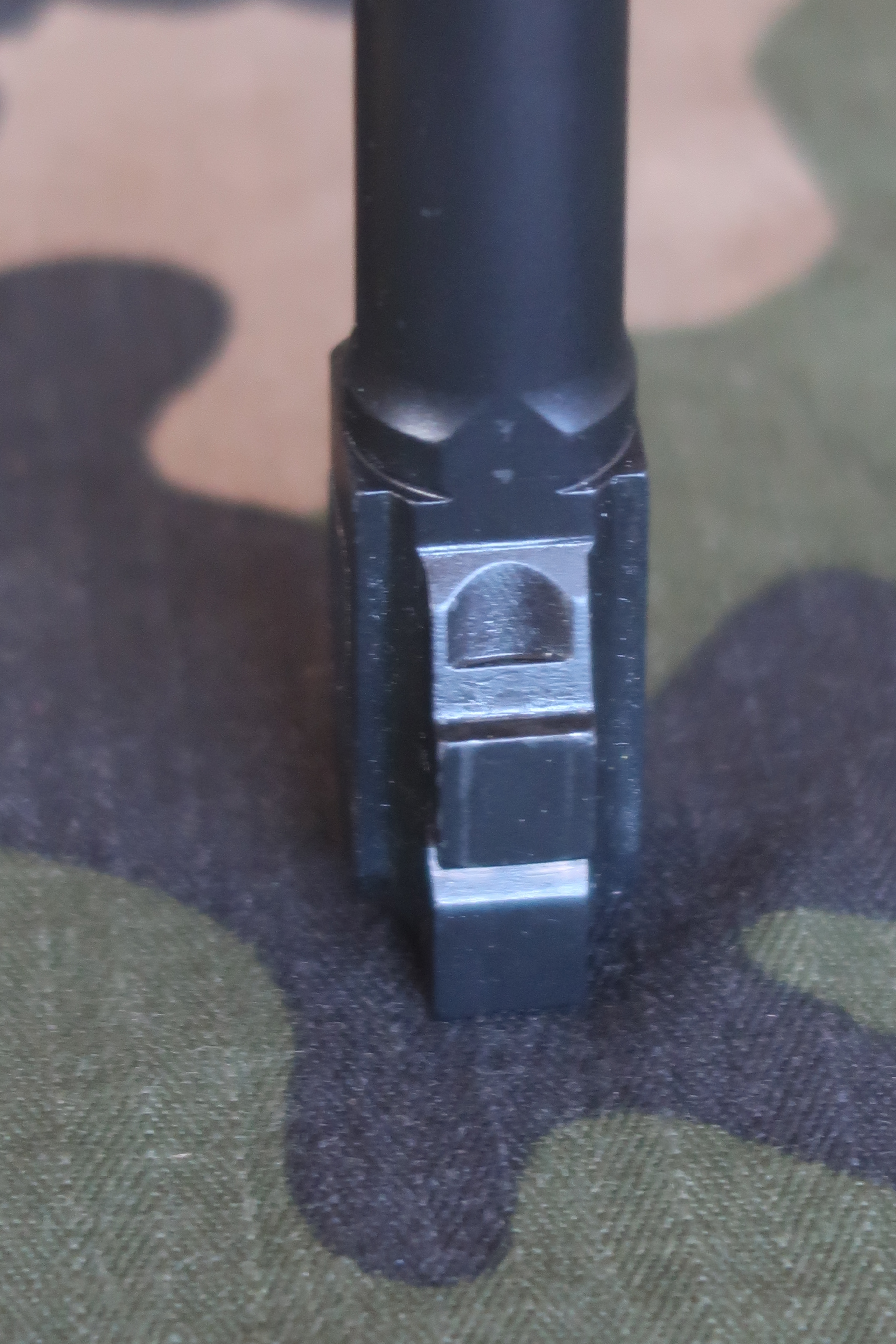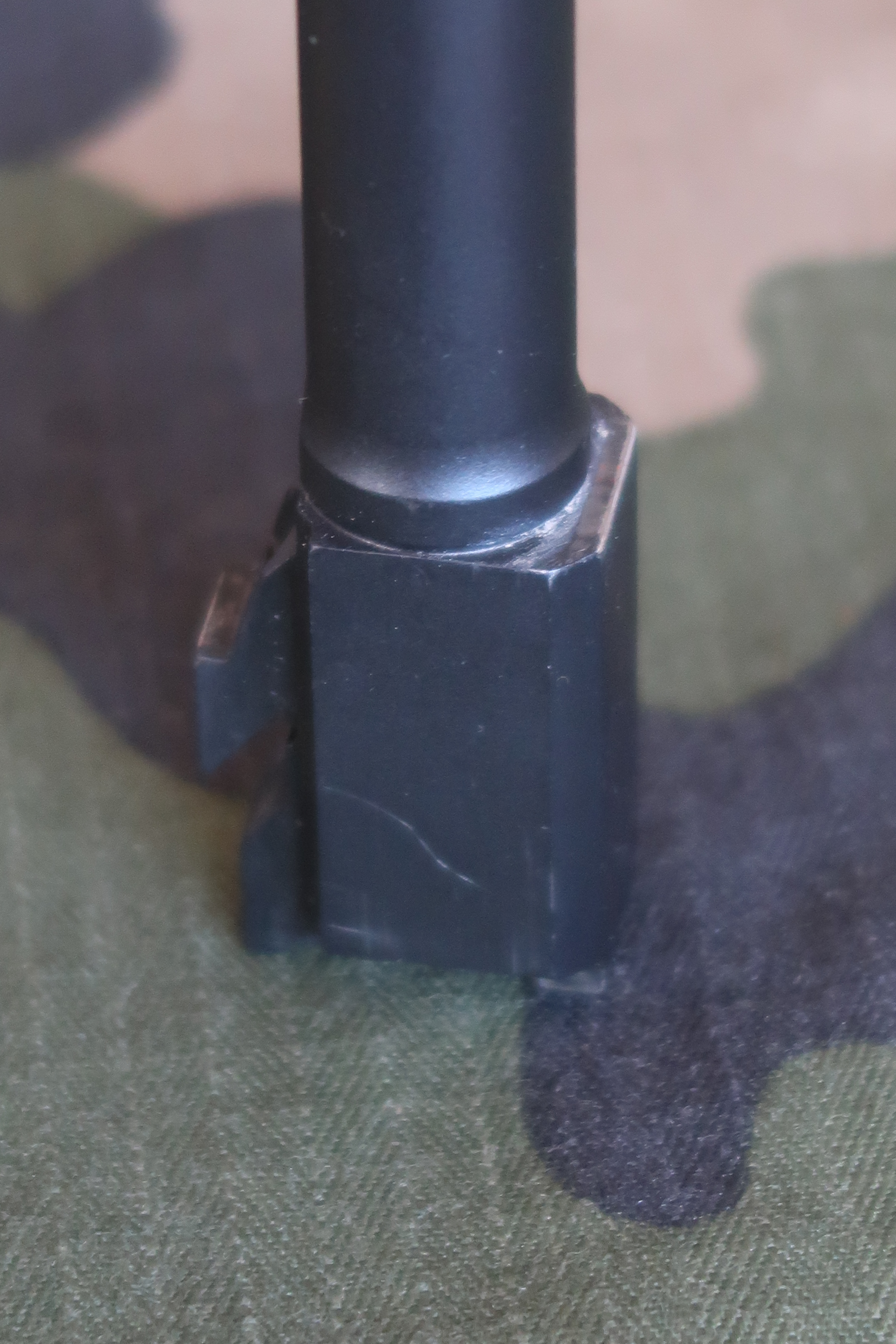 Le bloc support de canon est une pièce en acier. Elle est issue de micro-fusion. Cette pièce commande le verrouillage ou le déverrouillage du canon lorsque l’on manipule la culasse. C’est une partie majeure de l’arme, elle absorbe de nombreux chocs et vibrations. Sur les pistolets Glock, cette pièce se fissure. Il est fort probable qu’il en soit ainsi sur cette arme également. La vitesse de recul de la culasse, l’usure du ressort récupérateur, le chargement des munitions sont directement liés à cet effet.