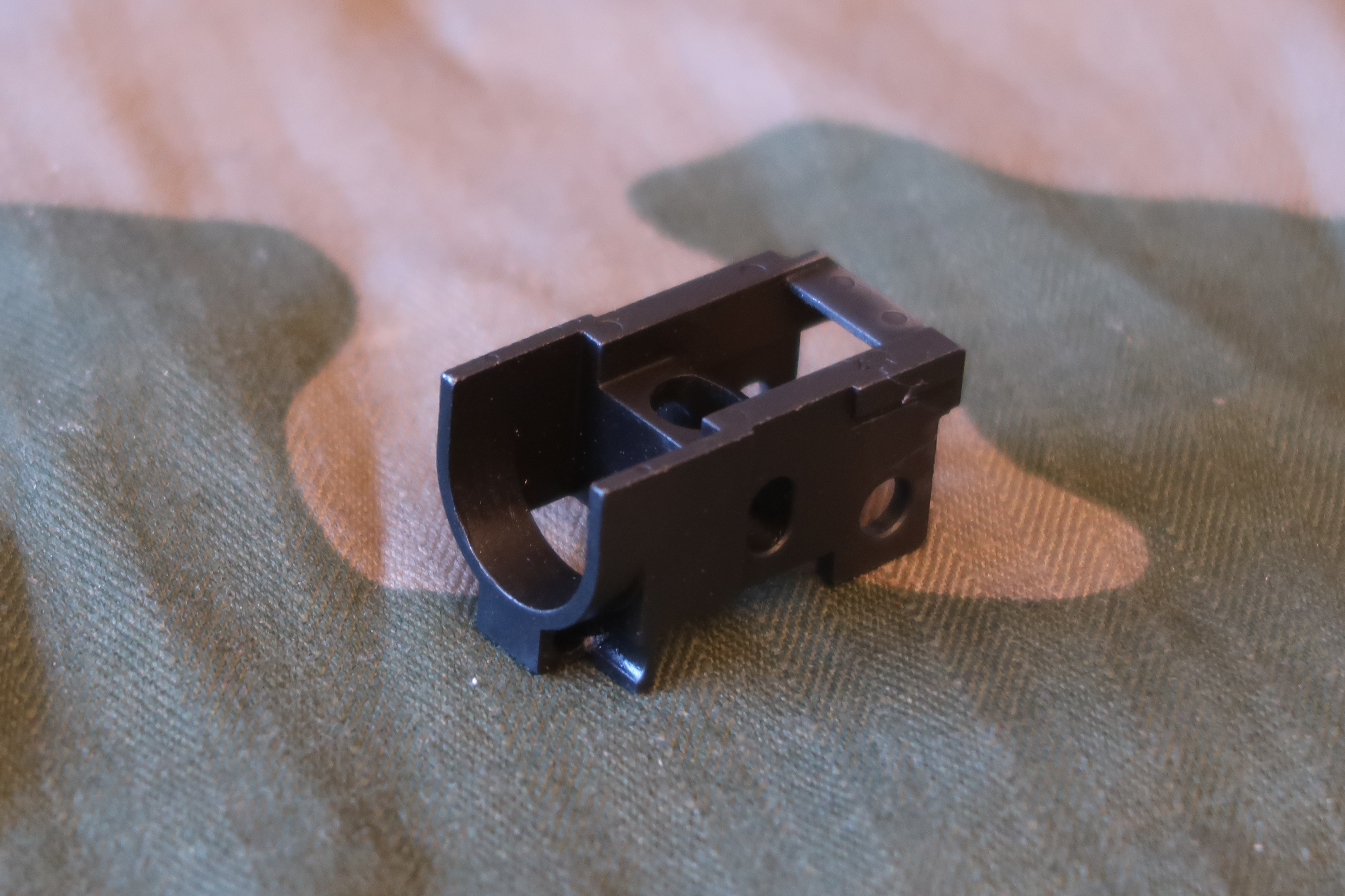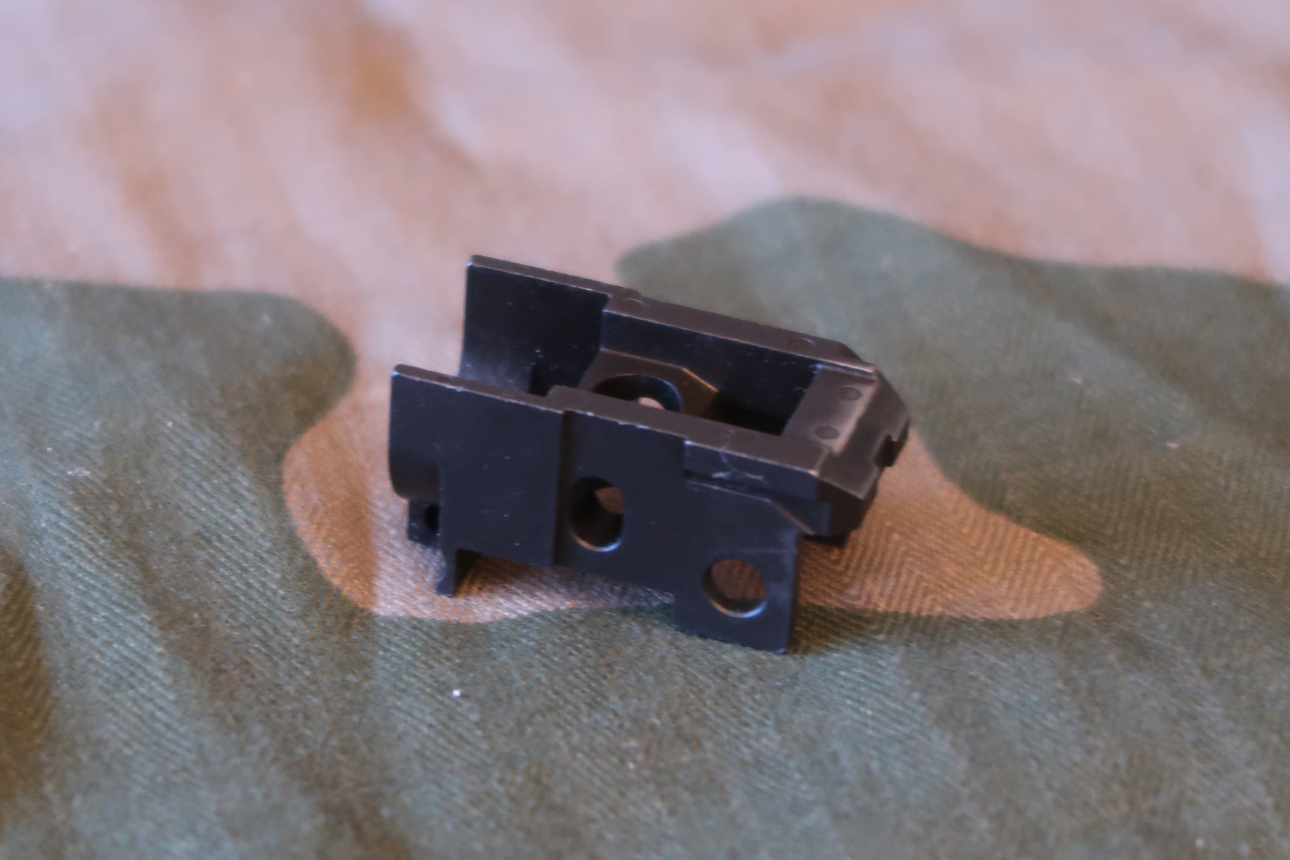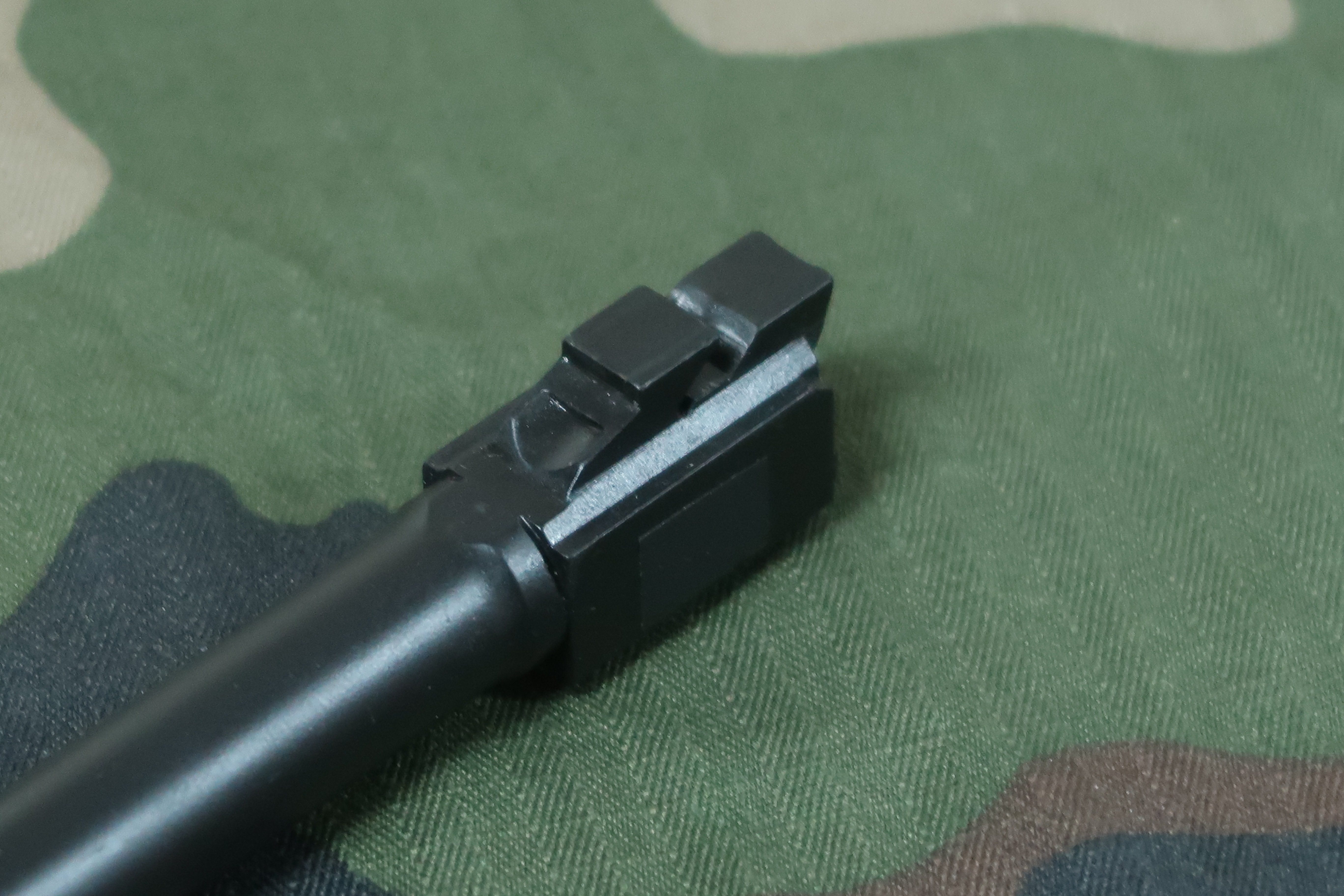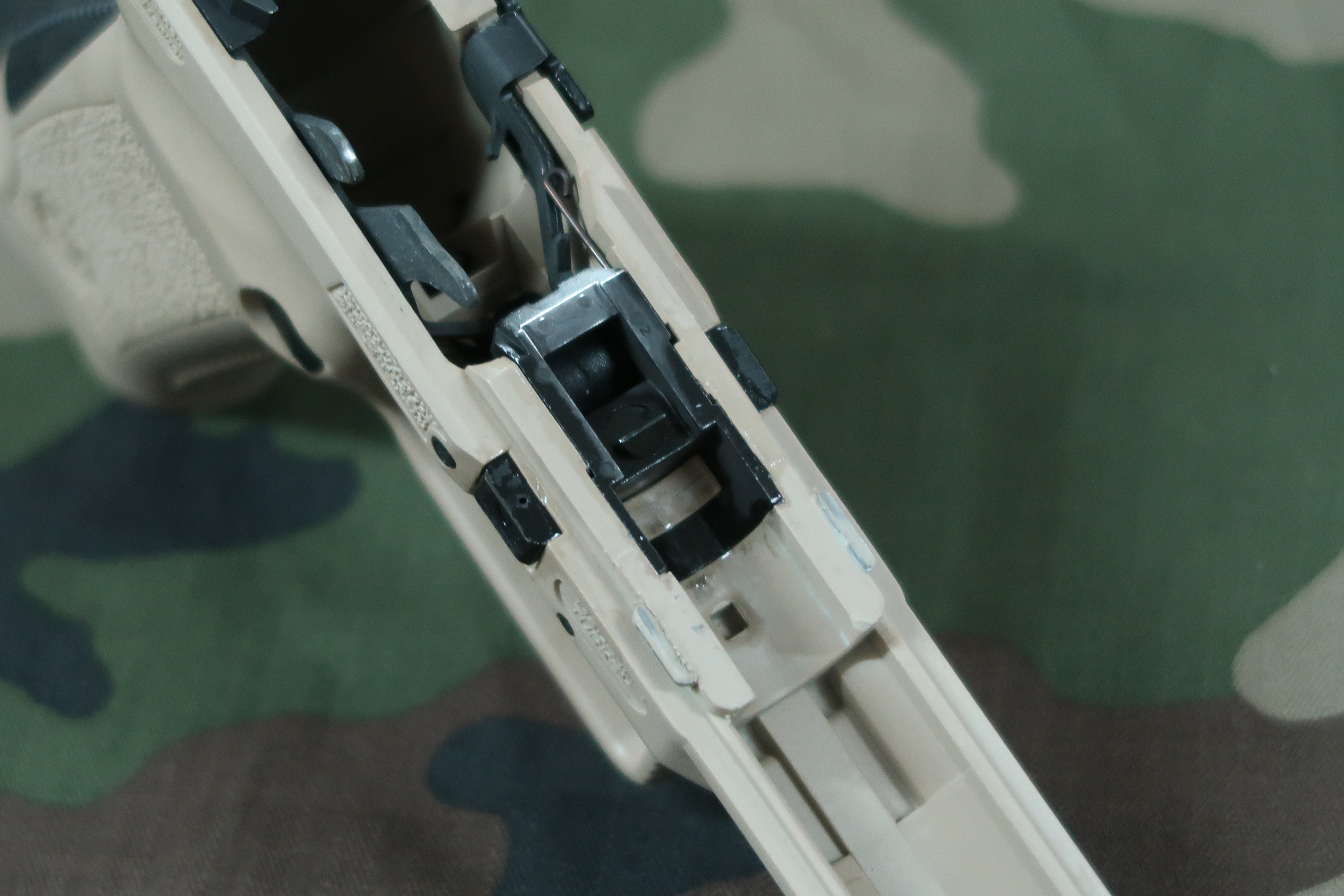 Le bloc support de canon est une pièce en acier. Elle est issue de micro-fusion. Cette pièce commande le verrouillage ou le déverrouillage du canon lorsque l’on manipule la culasse. C’est une partie majeure de l’arme, elle absorbe de nombreux chocs et vibrations. Sur les pistolets Glock, cette pièce se fissure. Il est fort probable qu’il en soit ainsi sur cette arme également. La vitesse de recul de la culasse, l’usure du ressort récupérateur, le chargement des munitions sont directement liés à cet effet.