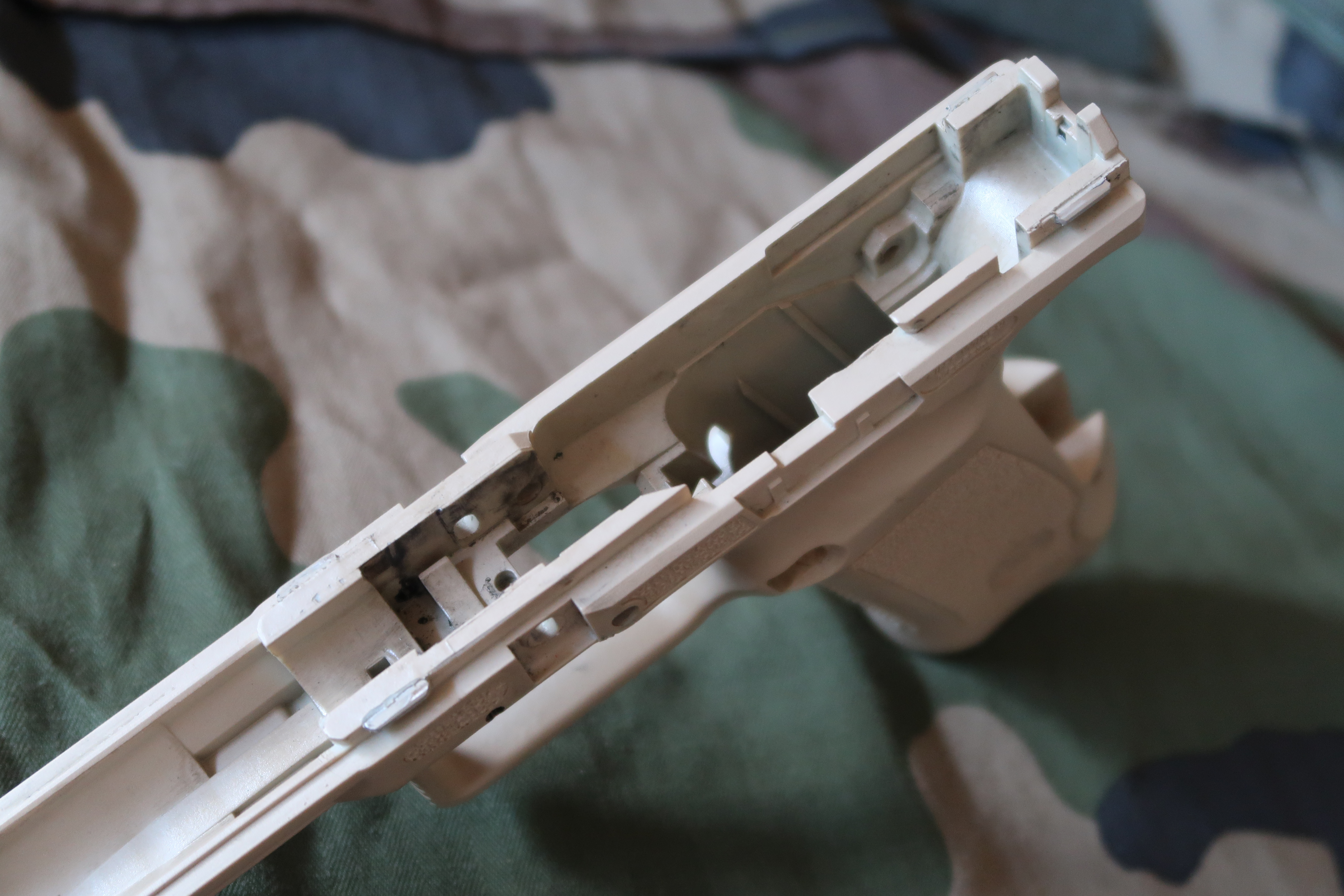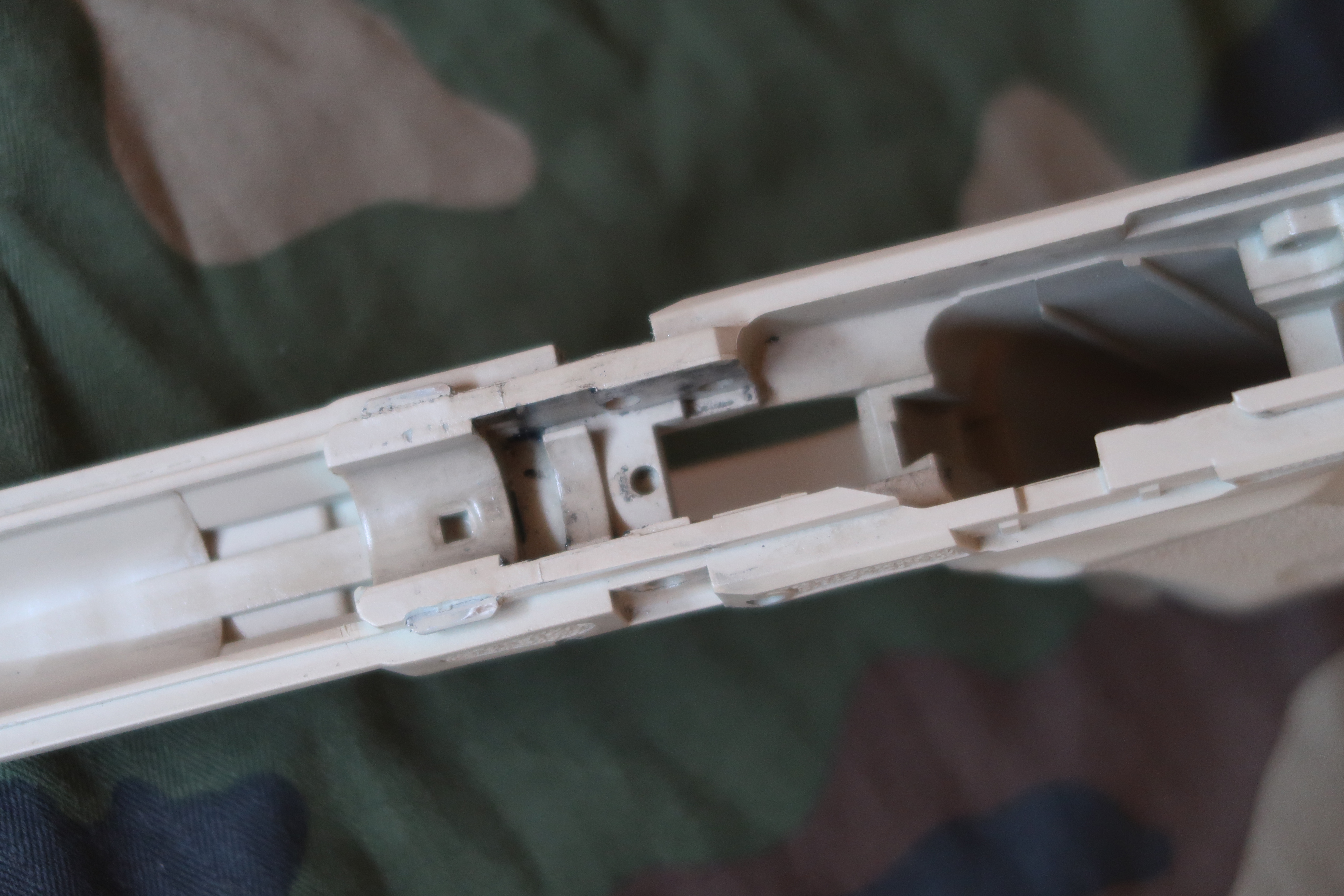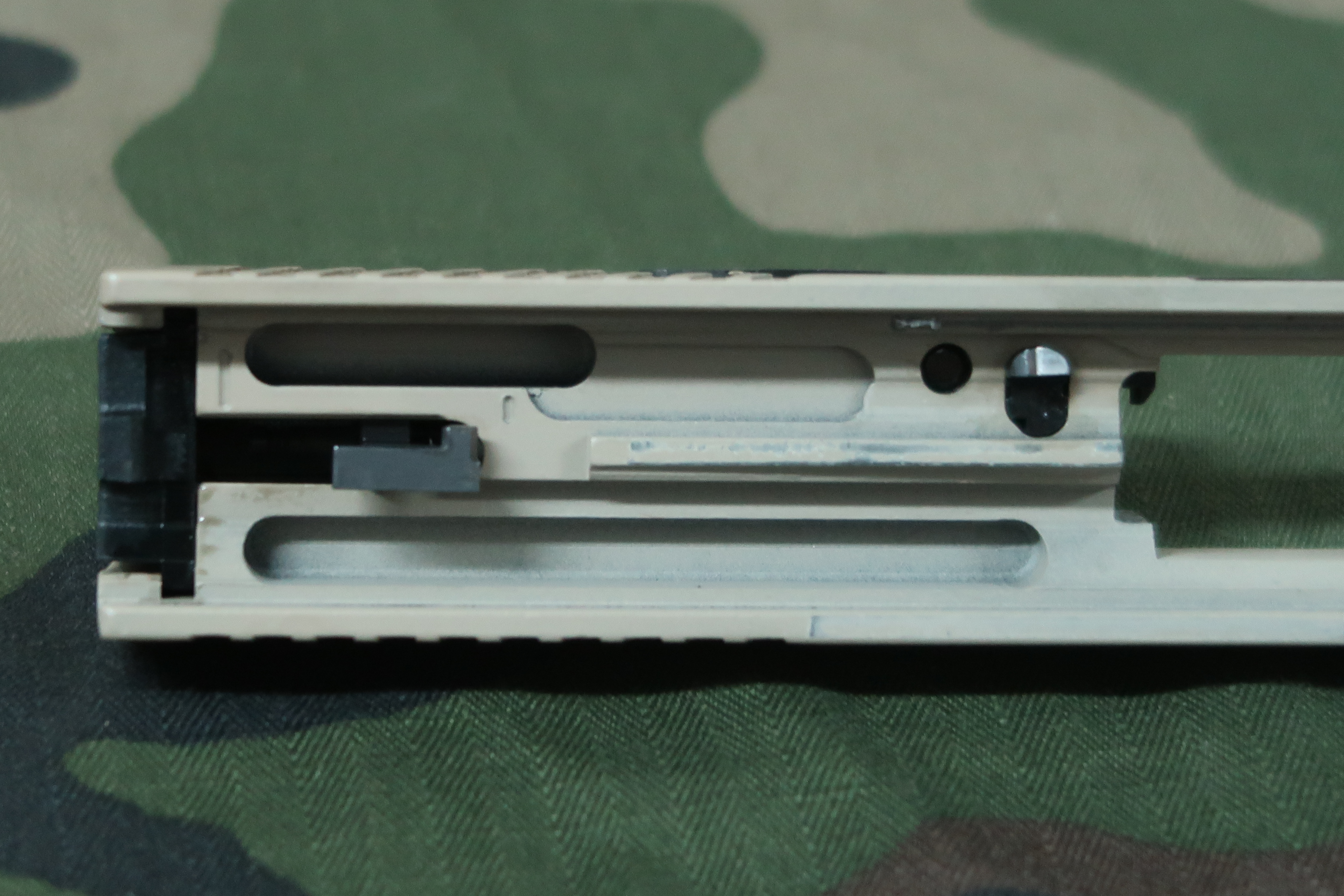 La culasse est guidée par les 4 petits inserts de la carcasse (deux de chaque cotés). Le logement des inserts sur la carcasse est de dimensions : la hauteur du logement des inserts sur la culasse est de 1,7 mm de haut et 25,2 mm de large (de bord à bord).