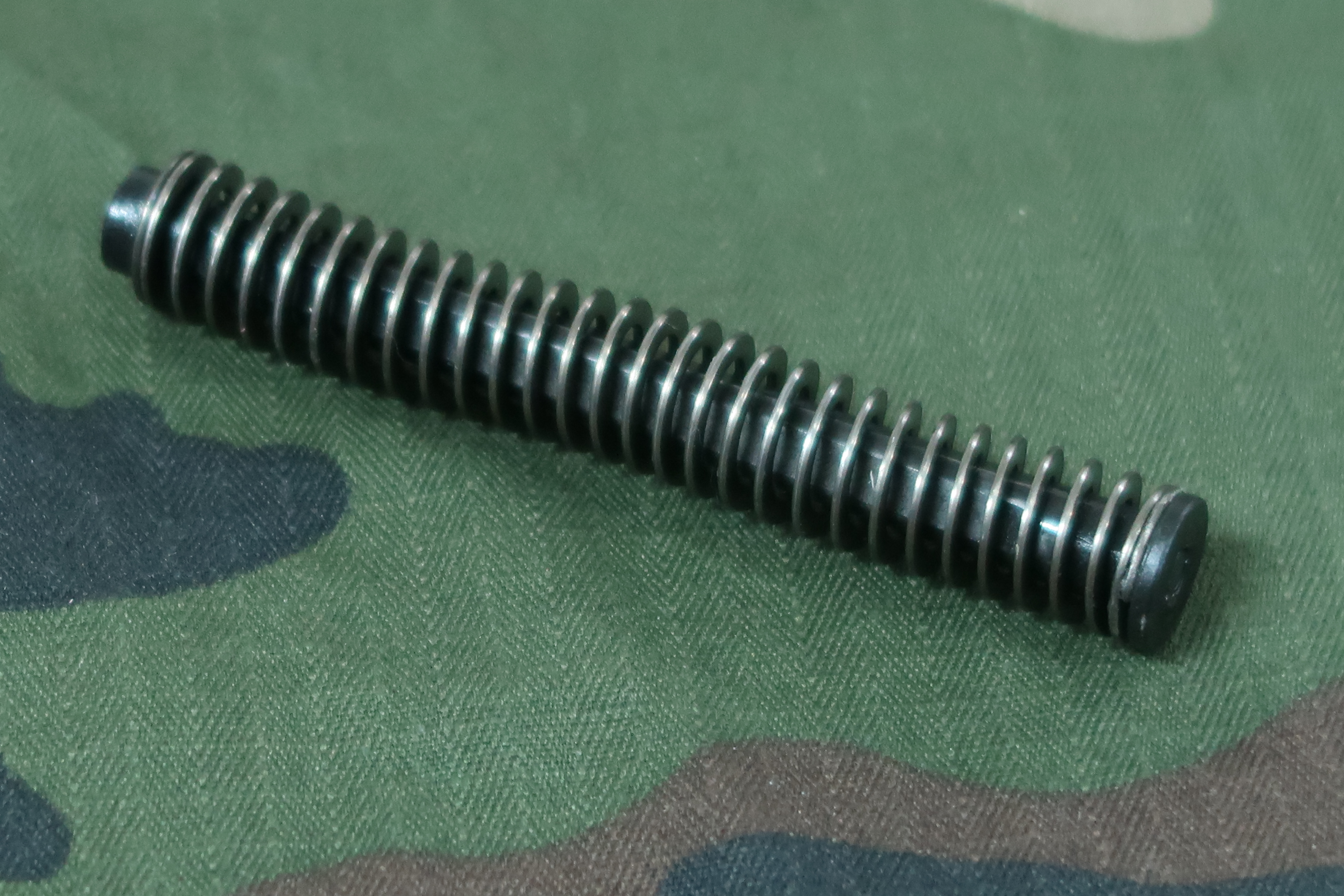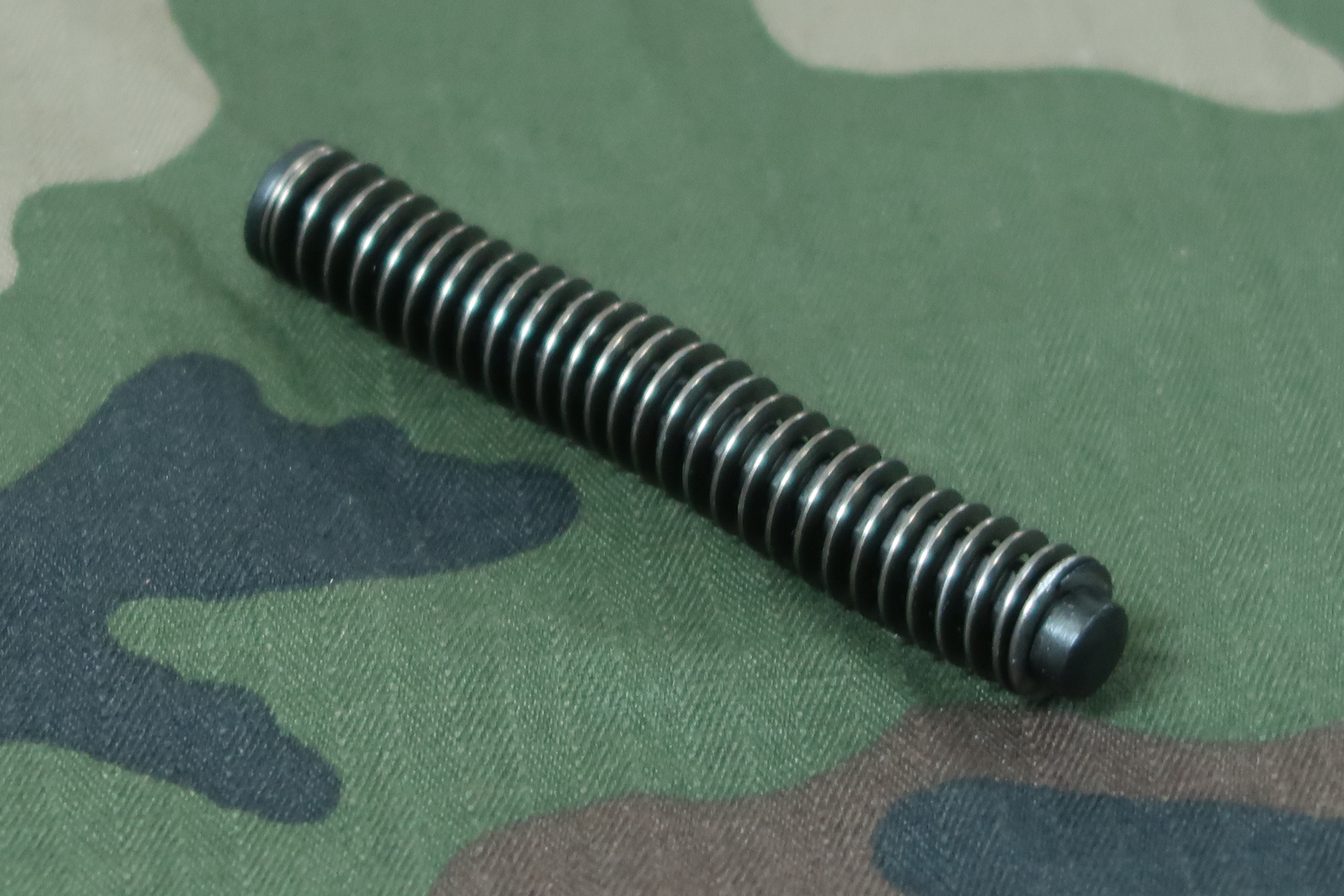Le ressort de rebondissement du percuteur a un diamètre de : 6 mm, une longueur sans charge de : 11 mm, un diamètre de fil de : 0,4 mm. Le Glock n’a pas de ressort de rebondissement. Sur la photo ci-dessous, le ressort est autour du percuteur.