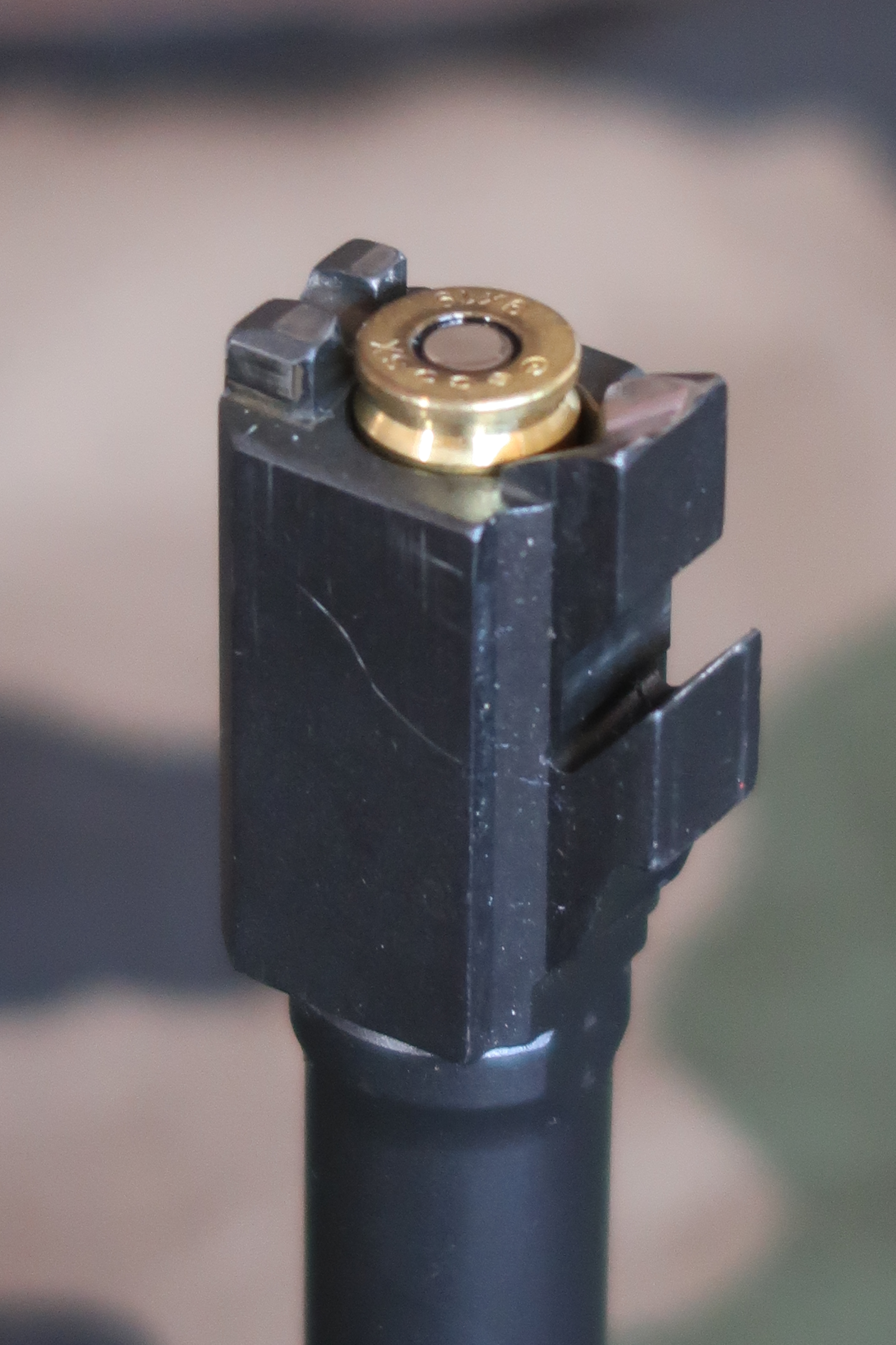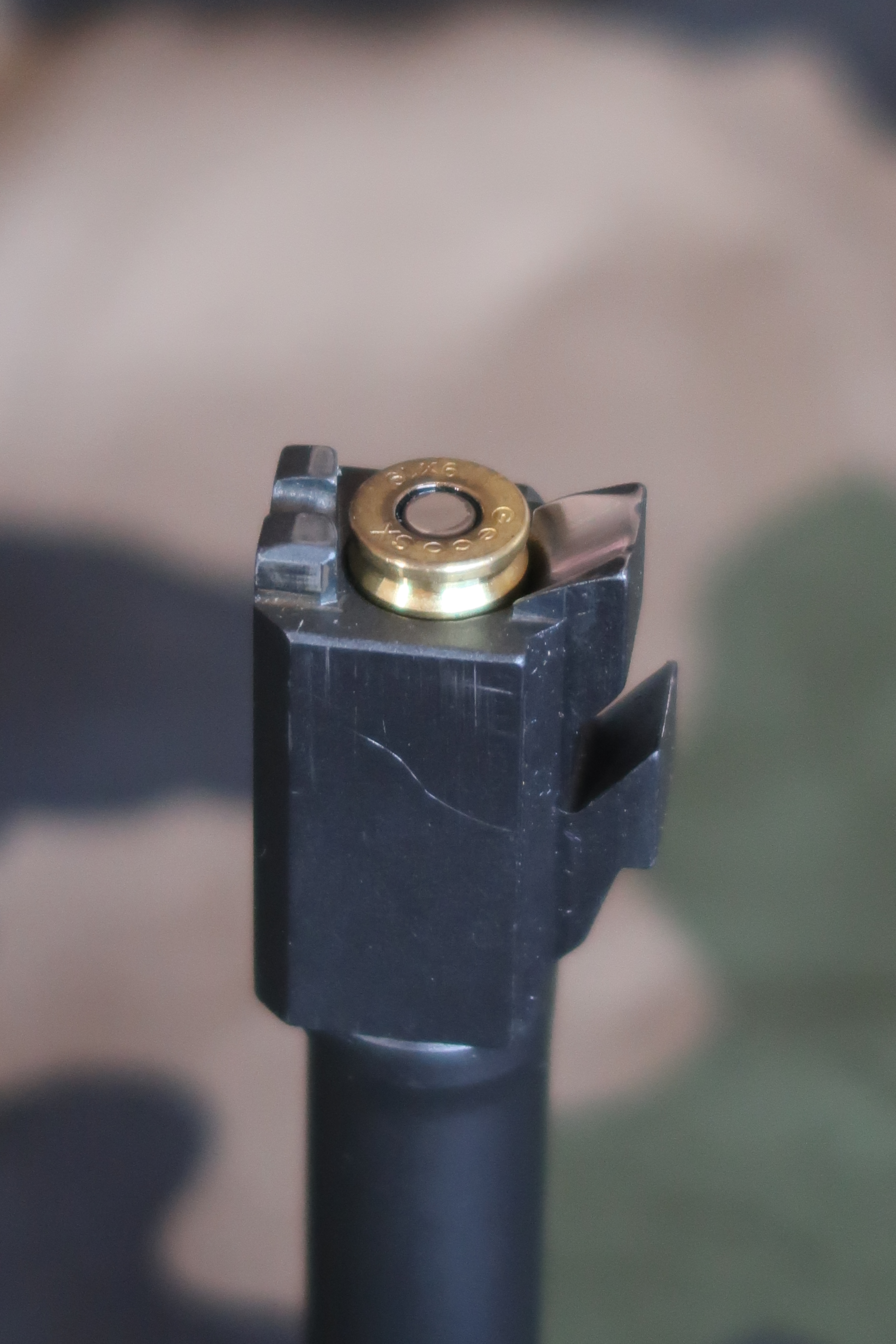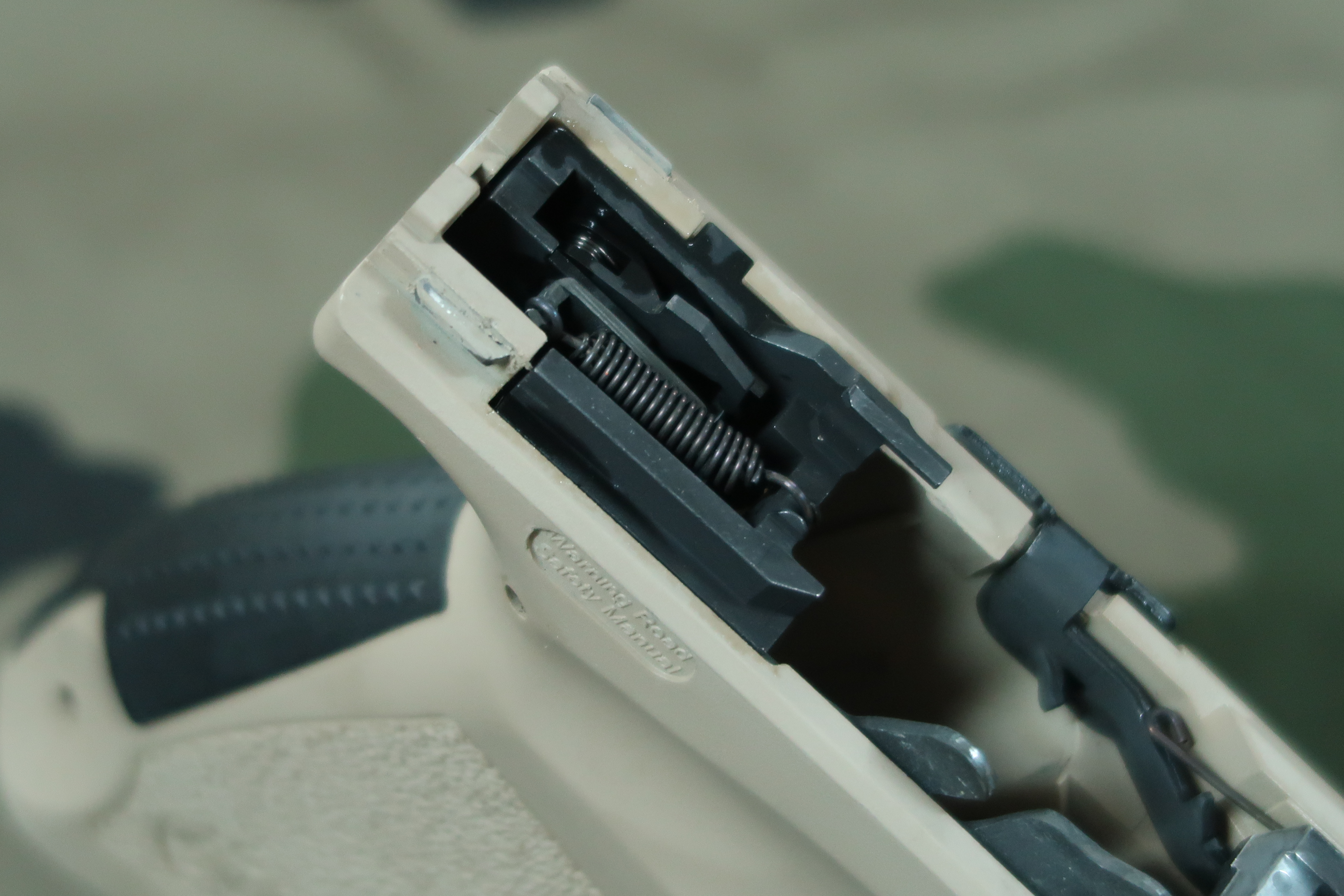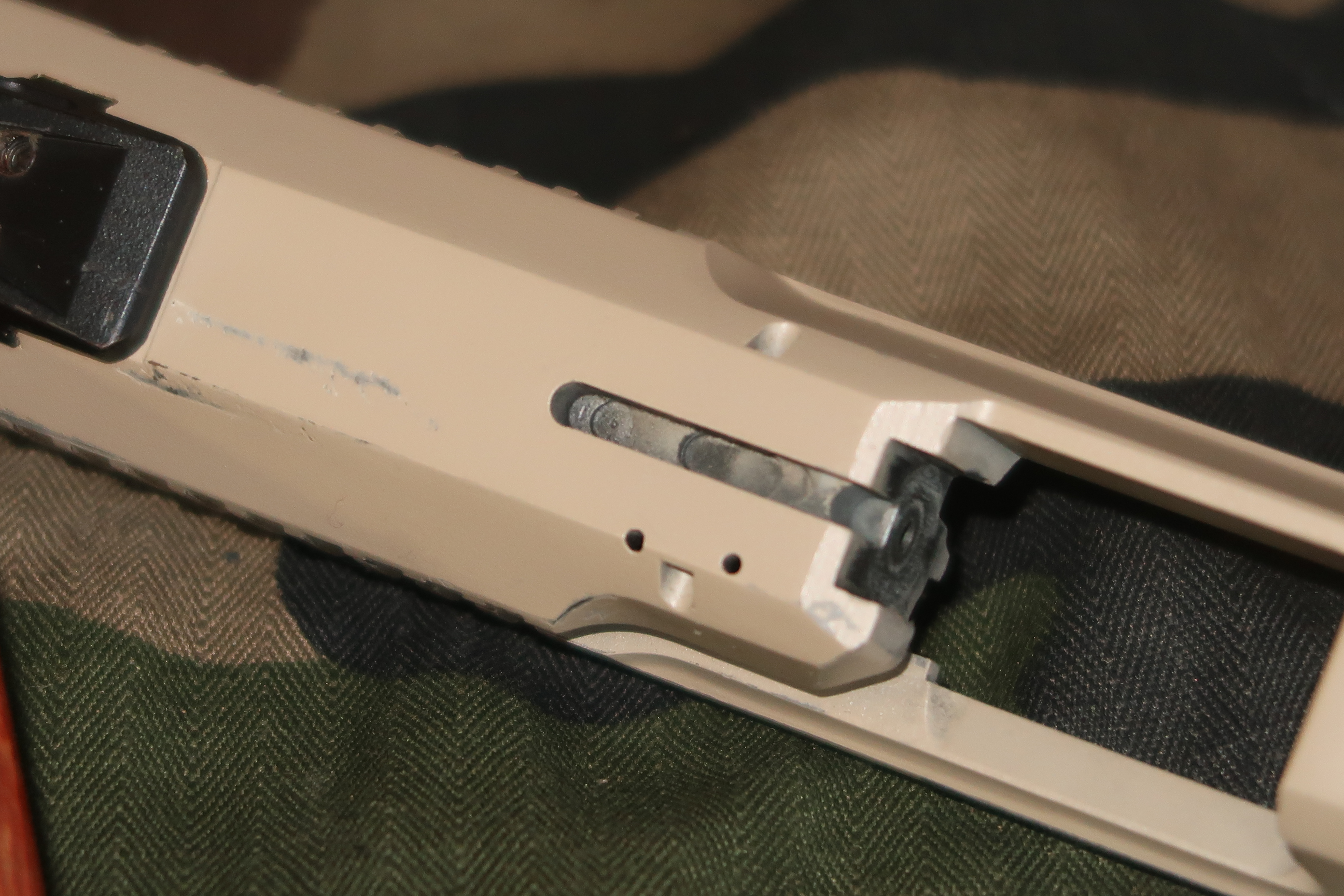 L’extracteur est une pièce en acier de micro-fusion. Il a une largeur de 4,92 mm. Une des choses intéressantes sur cette arme est l’axe d’extracteur. En effet, pas besoin de chasser un axe pour démonter l’extracteur et nettoyer son logement. L’axe est en fait un poussoir actionné par un ressort. Pour démonter l’extracteur, il faut enfoncer ce poussoir/axe dans la culasse. L’extracteur peut s’extraire lorsque l’on a enfoncé suffisamment le poussoir.