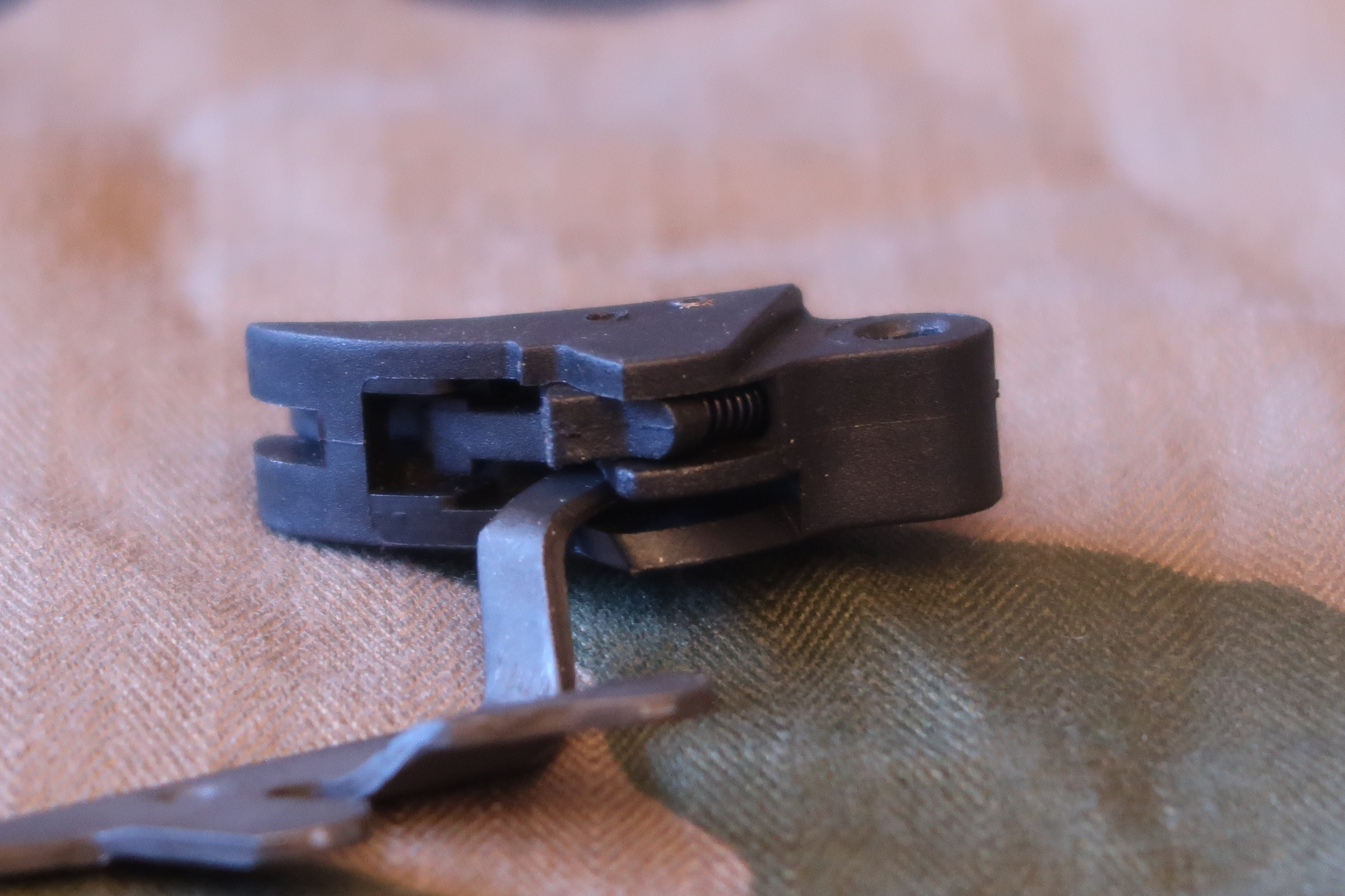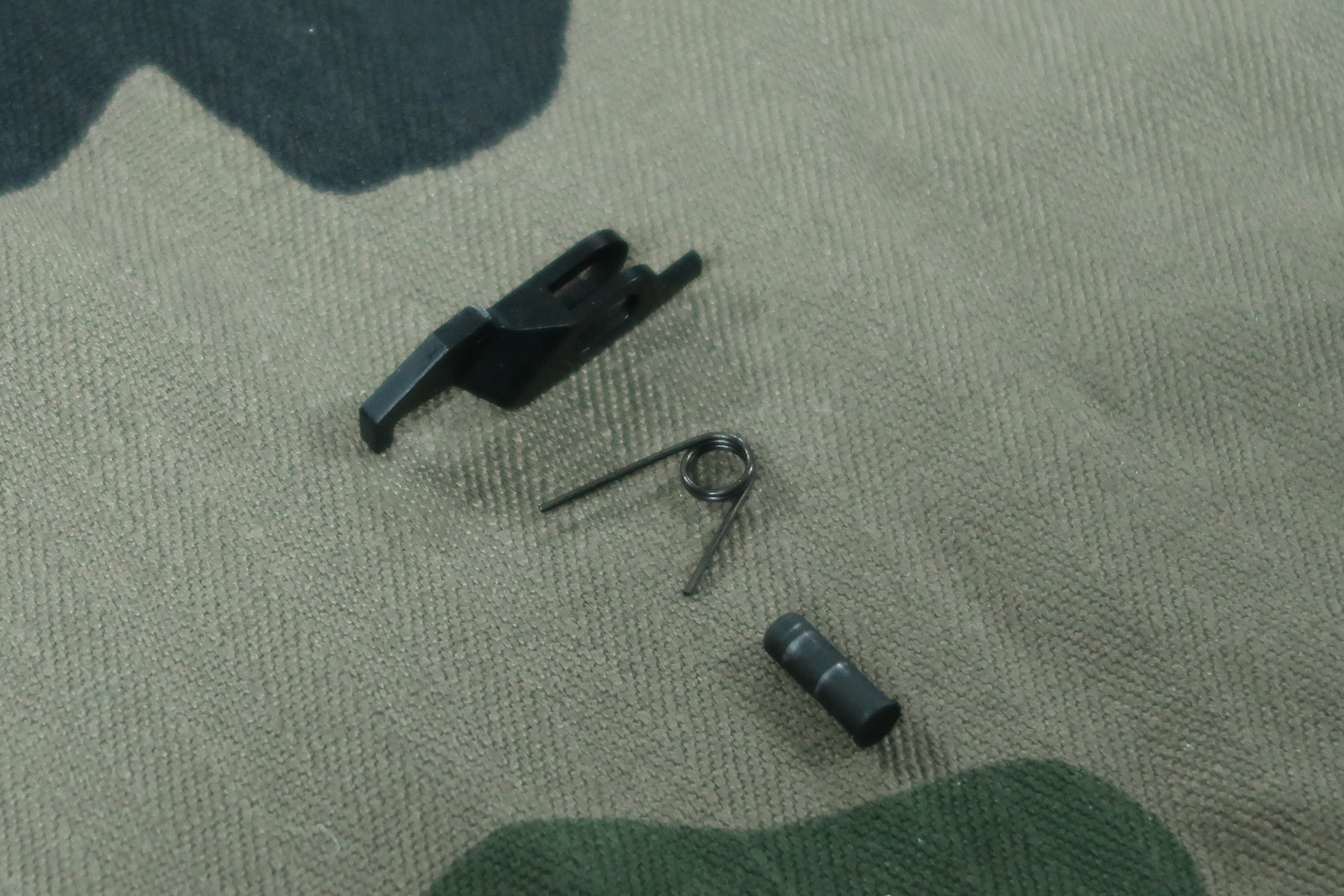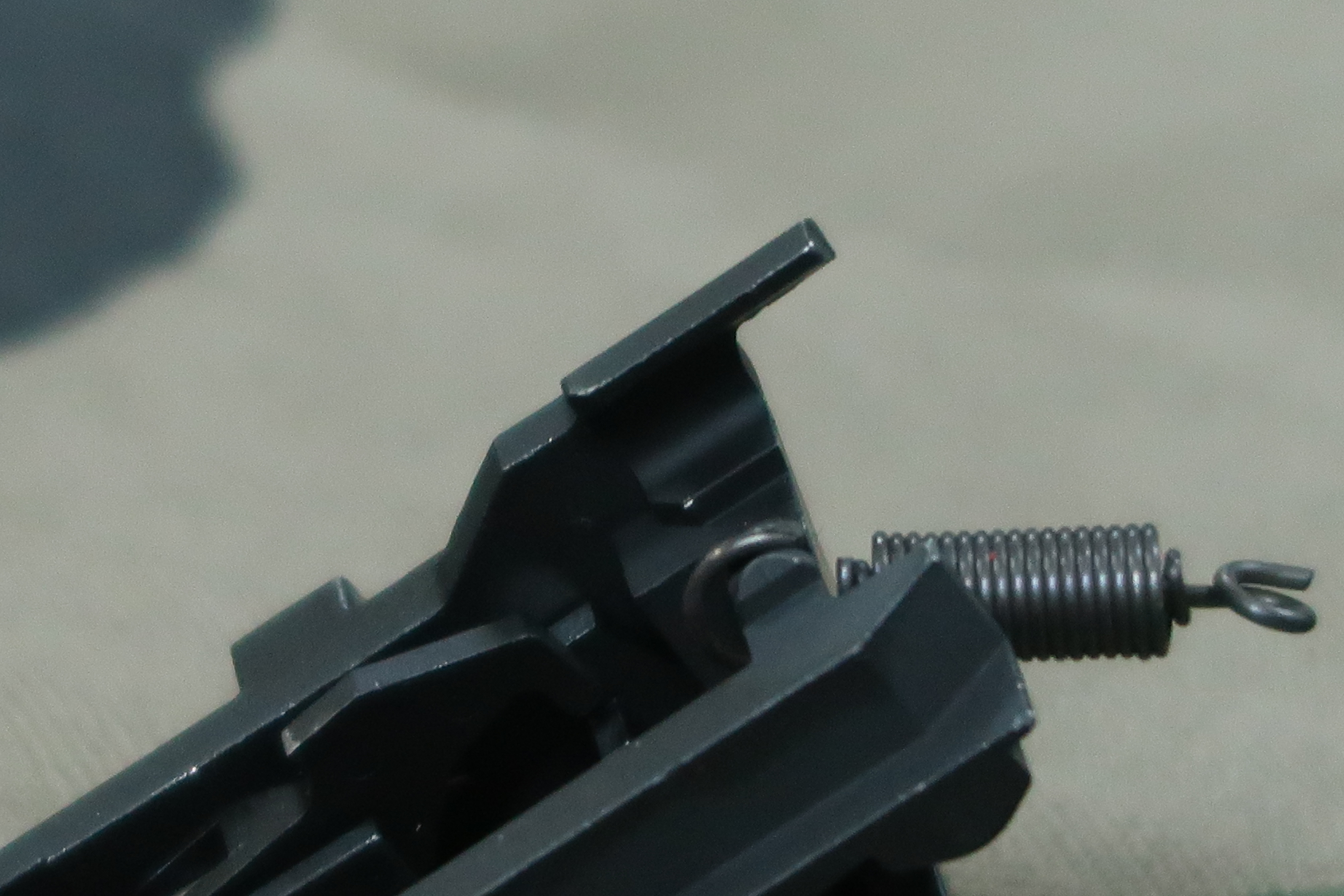 L’arrêtoir de culasse est une tôle d’acier matricée. Bien que complexe, cette pièce est très bien réalisée. L’axe de queue de détente est l’axe de l’arrêtoir de culasse. Son ressort est maintenu en place entre la carcasse plastique et le support de canon. Pour extraire le ressort de son logement, il faut commencer par démonter le bloc support de canon.