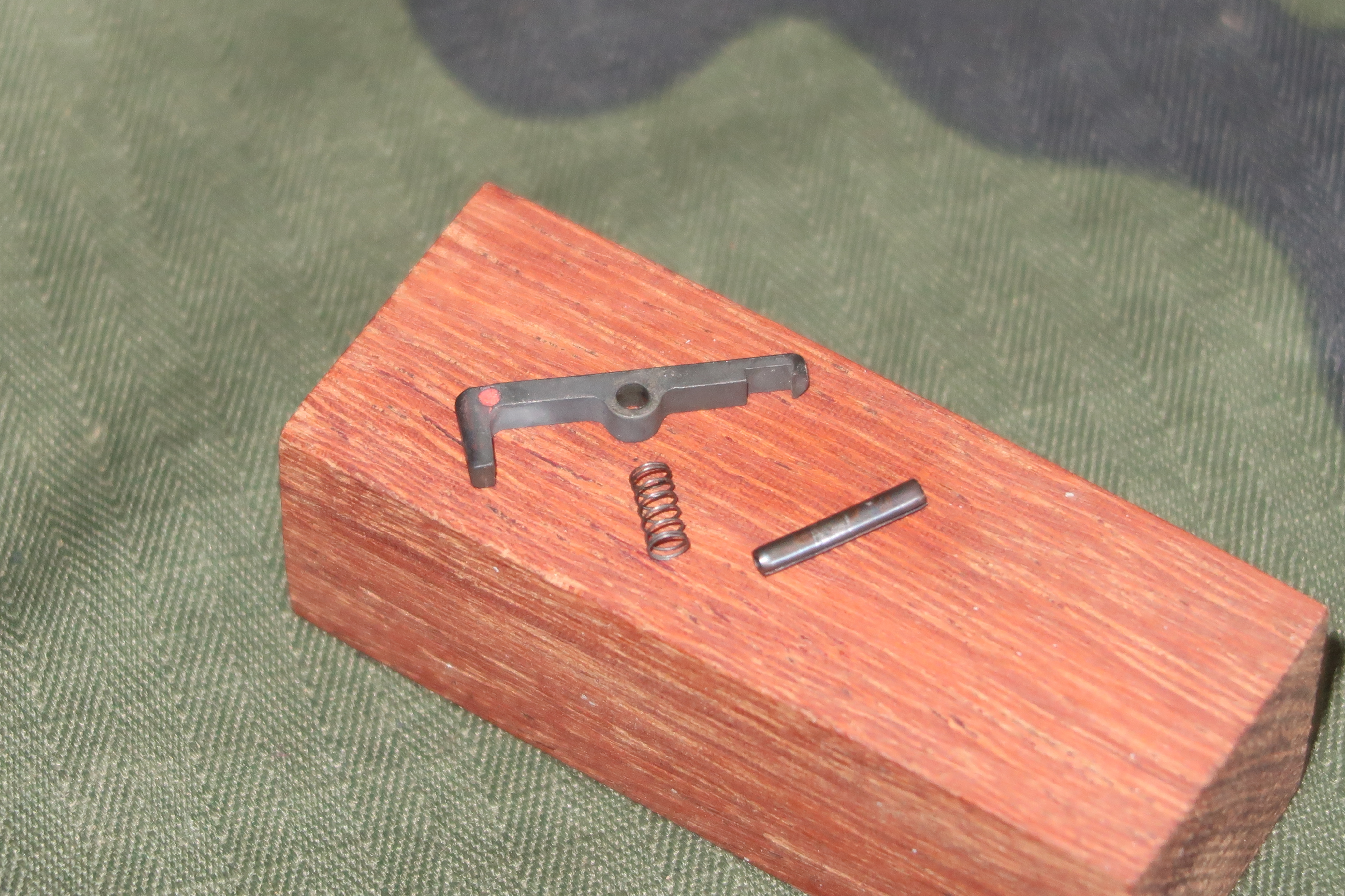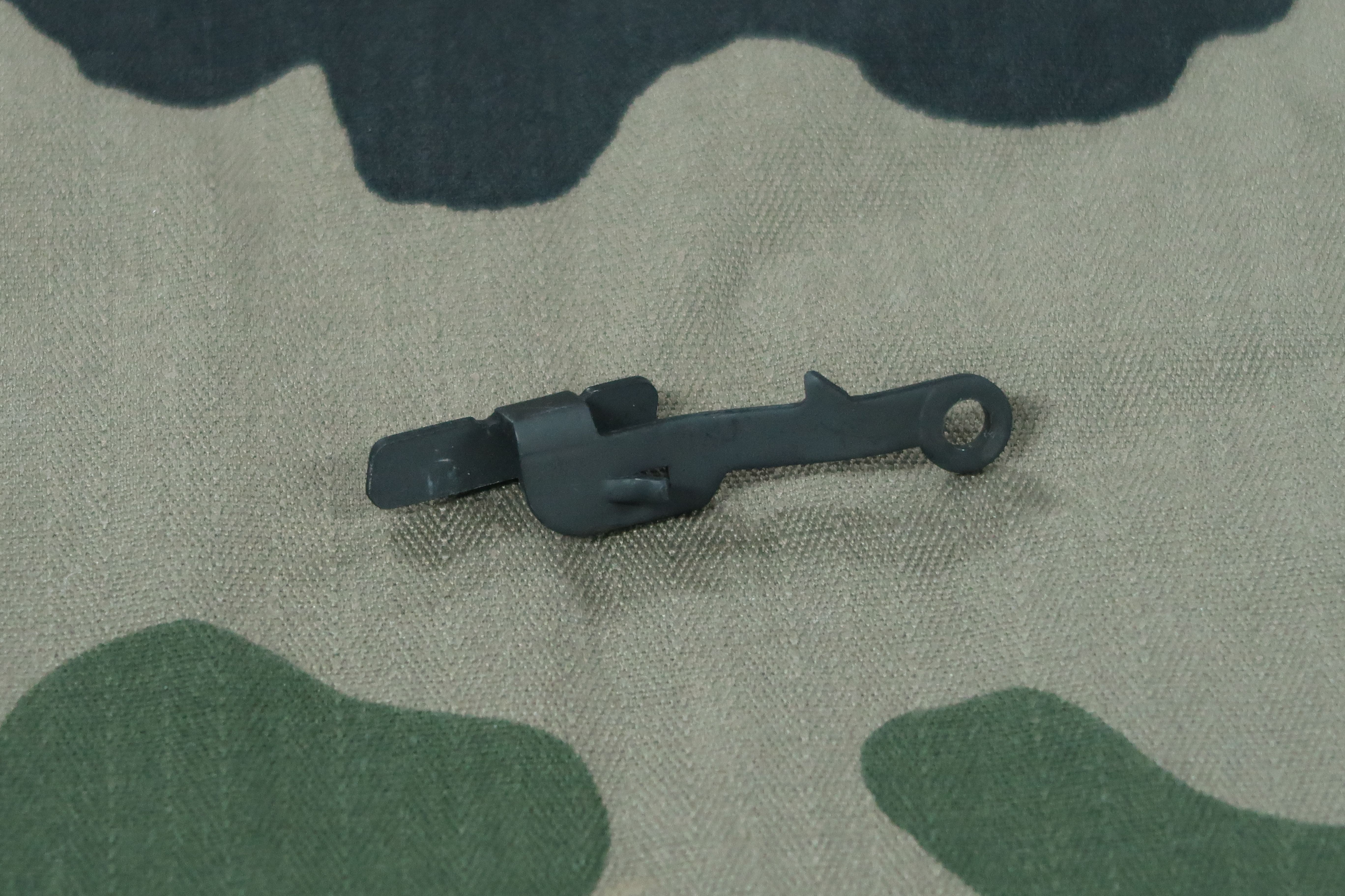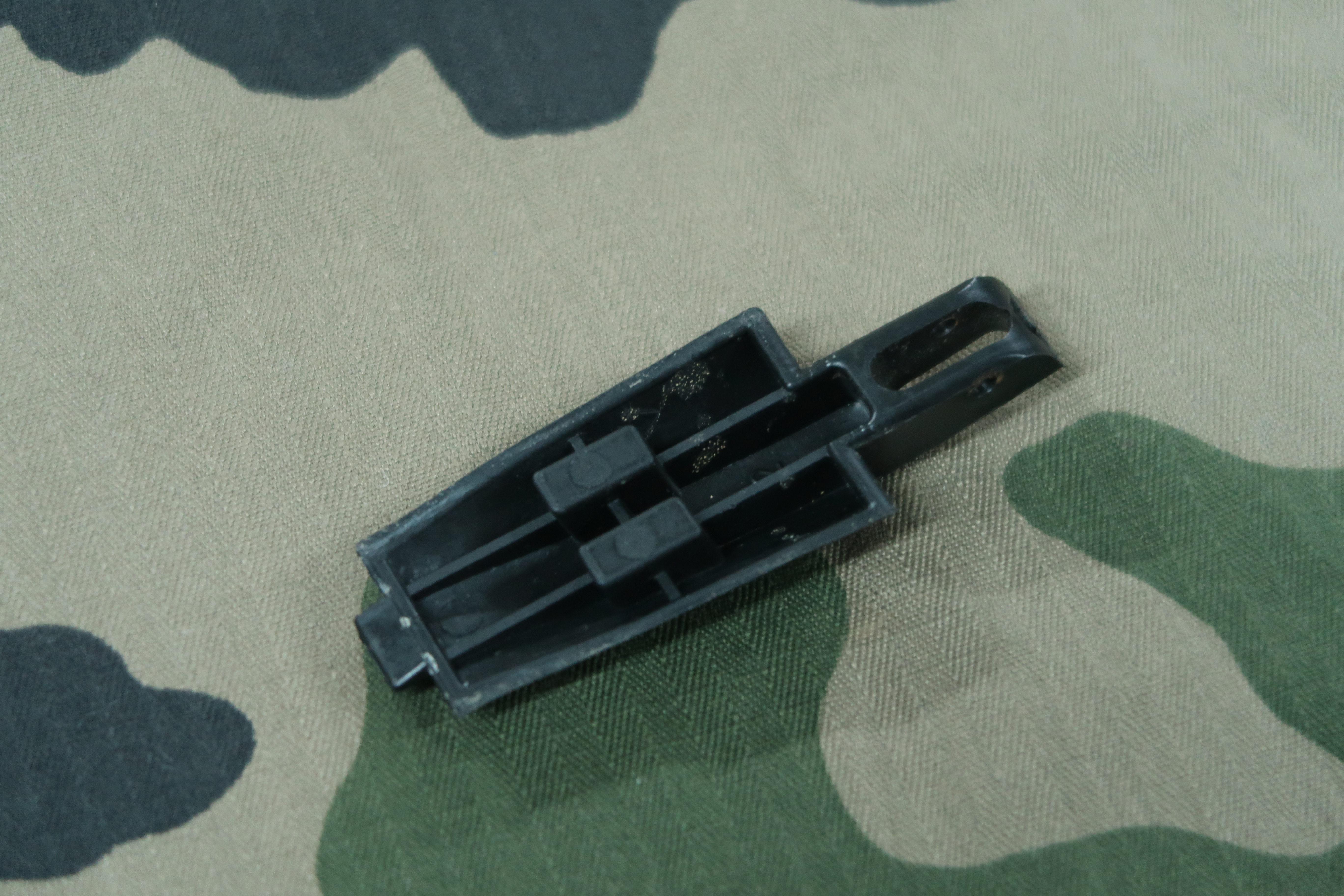 L’arrêtoir de culasse est une tôle d’acier matricée. Bien que complexe, cette pièce est très bien réalisée. L’axe de queue de détente est l’axe de l’arrêtoir de culasse. Son ressort est maintenu en place entre la carcasse plastique et le support de canon. Pour extraire le ressort de son logement, il faut commencer par démonter le bloc support de canon.