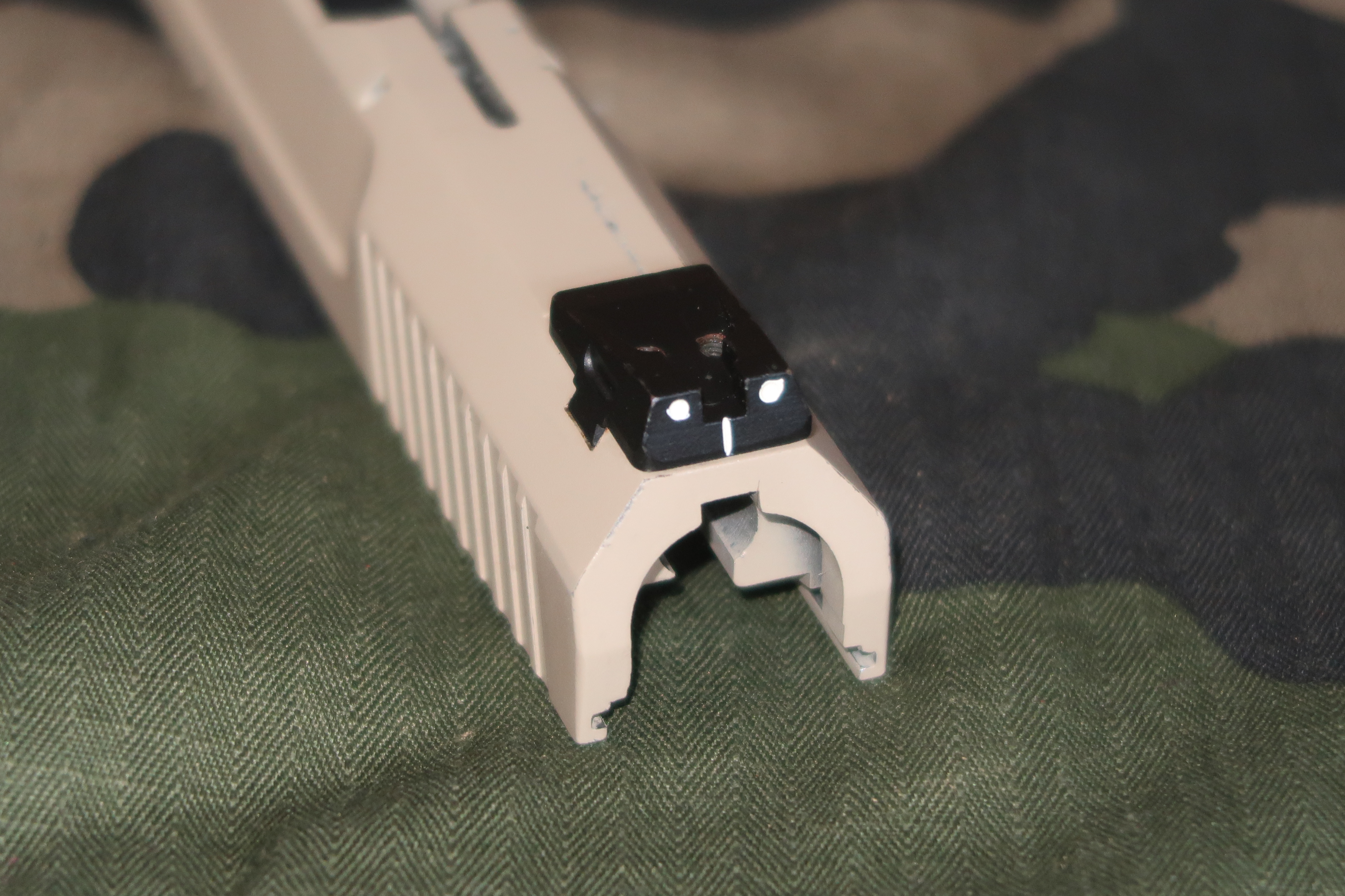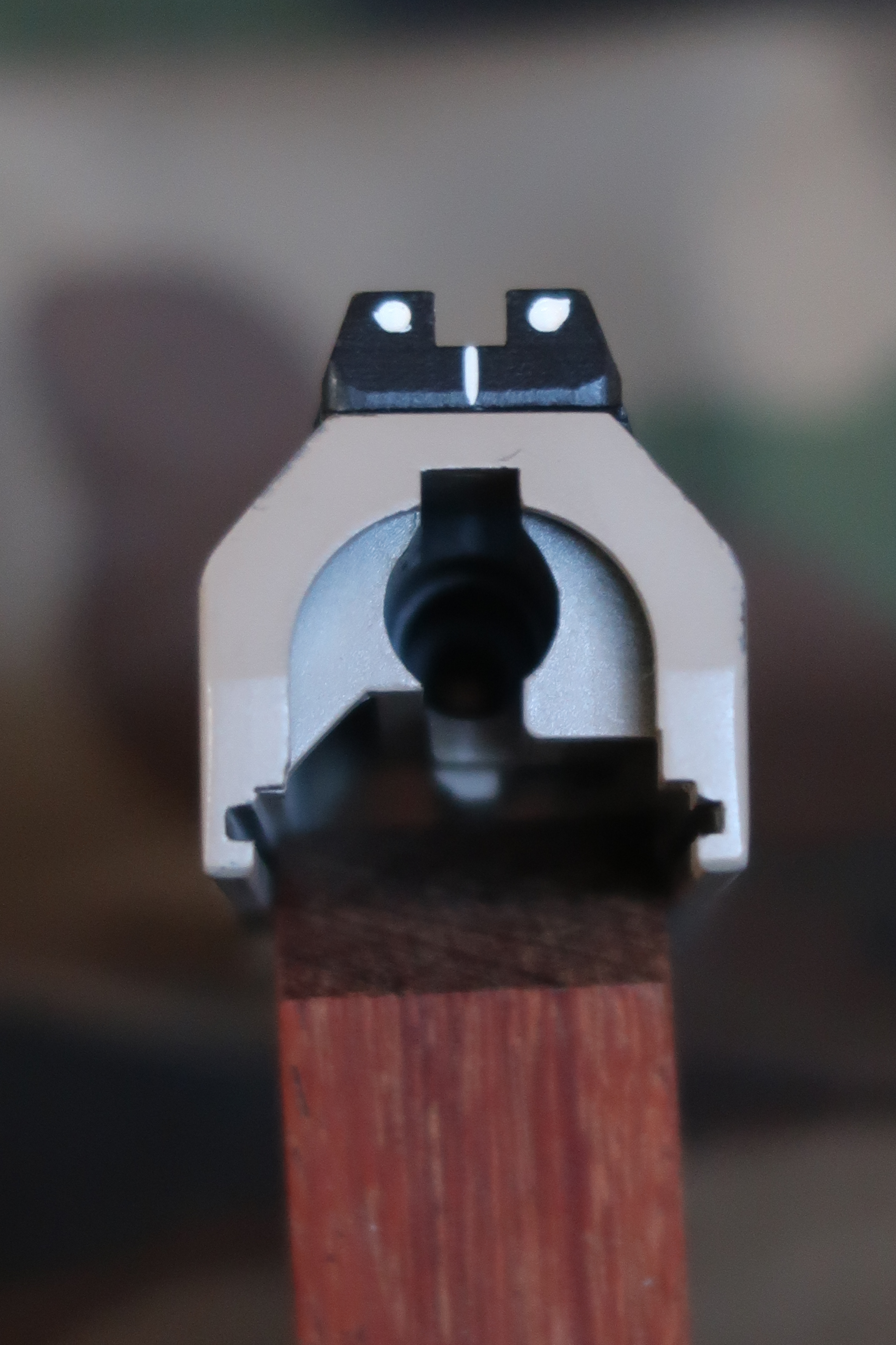 Les éléments de visée sont amovibles, ils sont montés par queue d’aronde. Le guidon mesure 3,8 mm de large.
