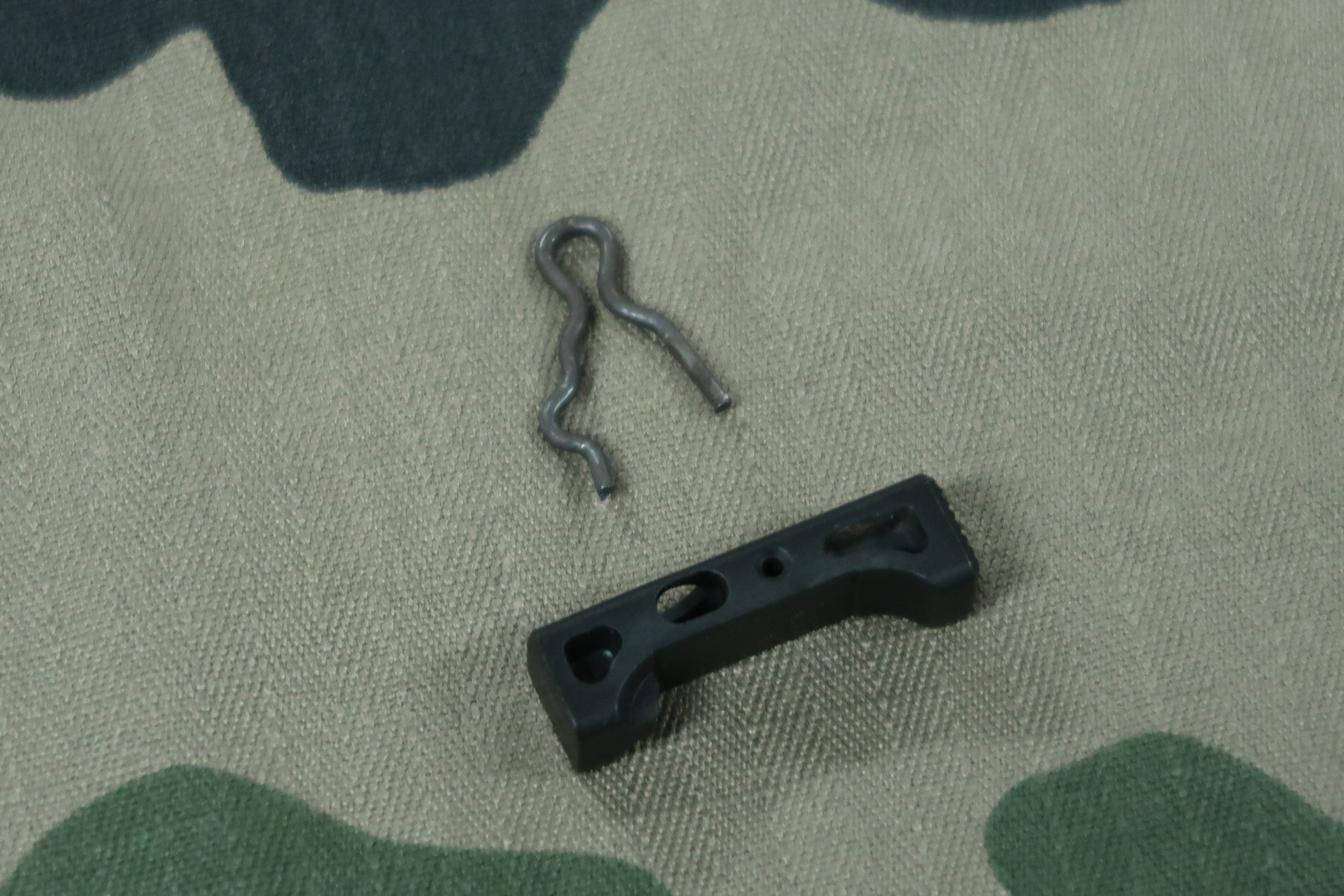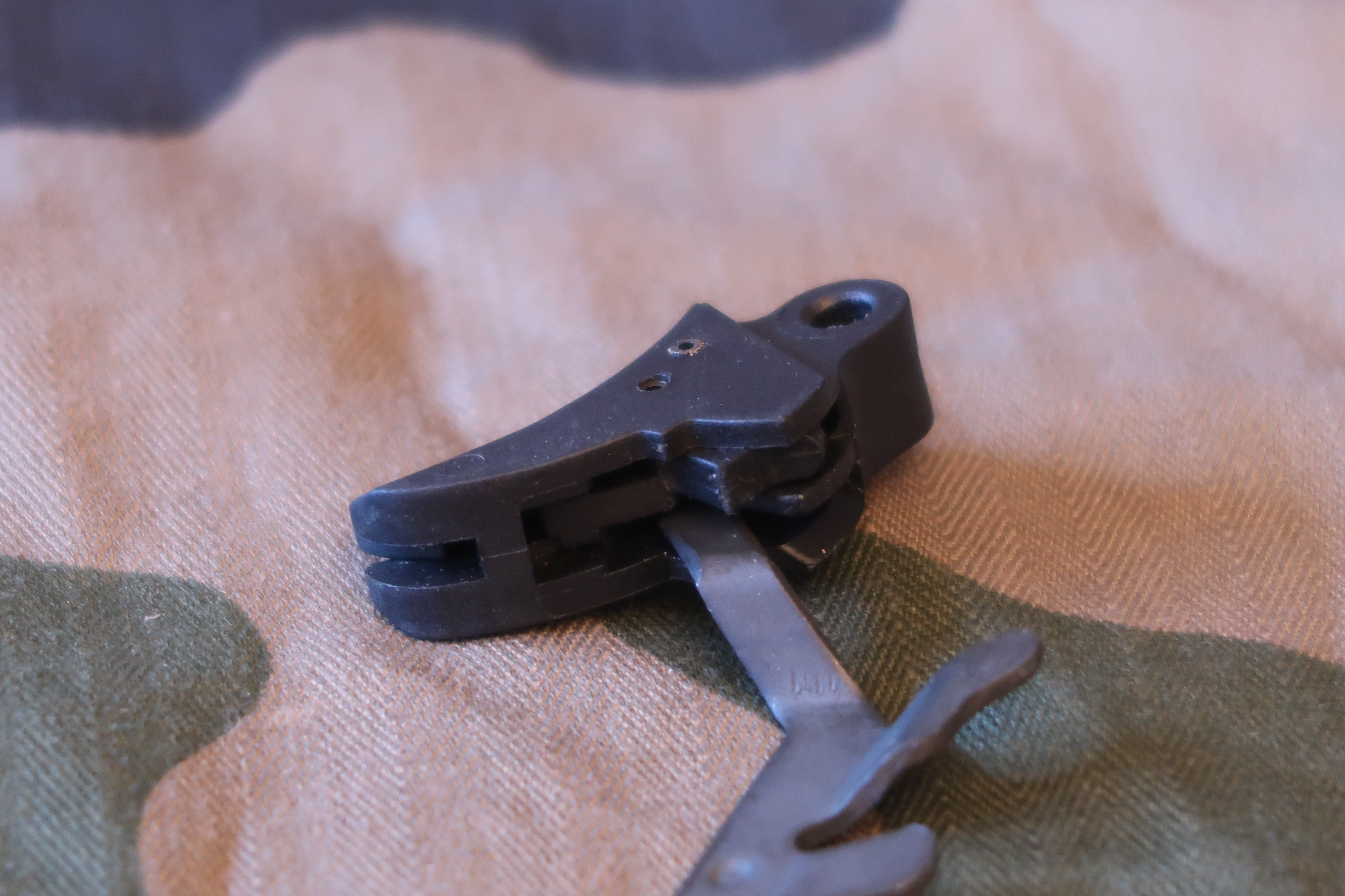 La queue de détente est en plastique. En son milieu, il y a un petit levier de sûreté. Lorsque le tireur presse la queue de détente, il efface la sureté. La barrette séparatrice est classique, il s’agit d’une pièce en acier goupillée sur la queue de détente. Le ressort de rappel de queue de détente relie la barrette séparatrice et le bloc de détente à l’arrière de la poignée.