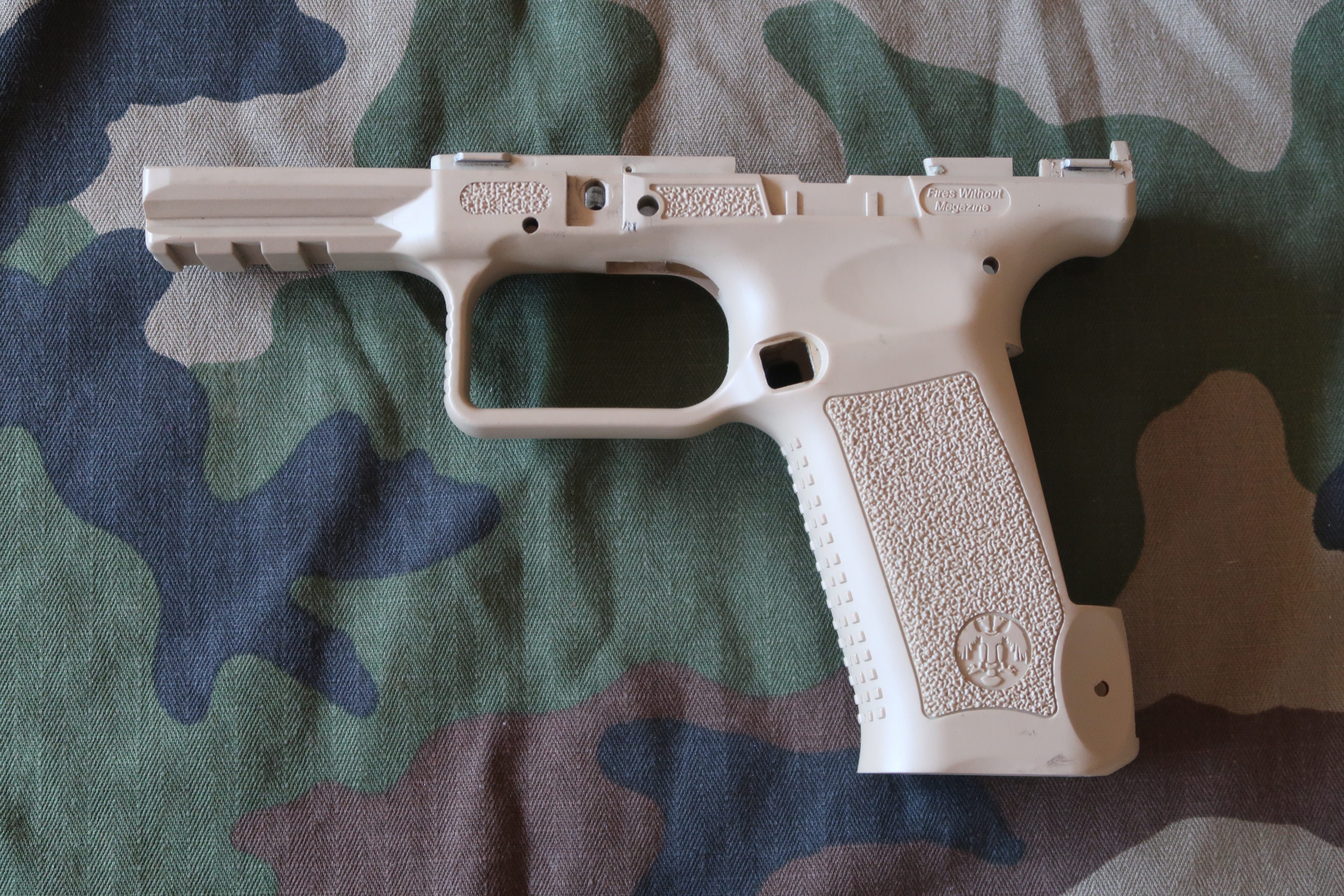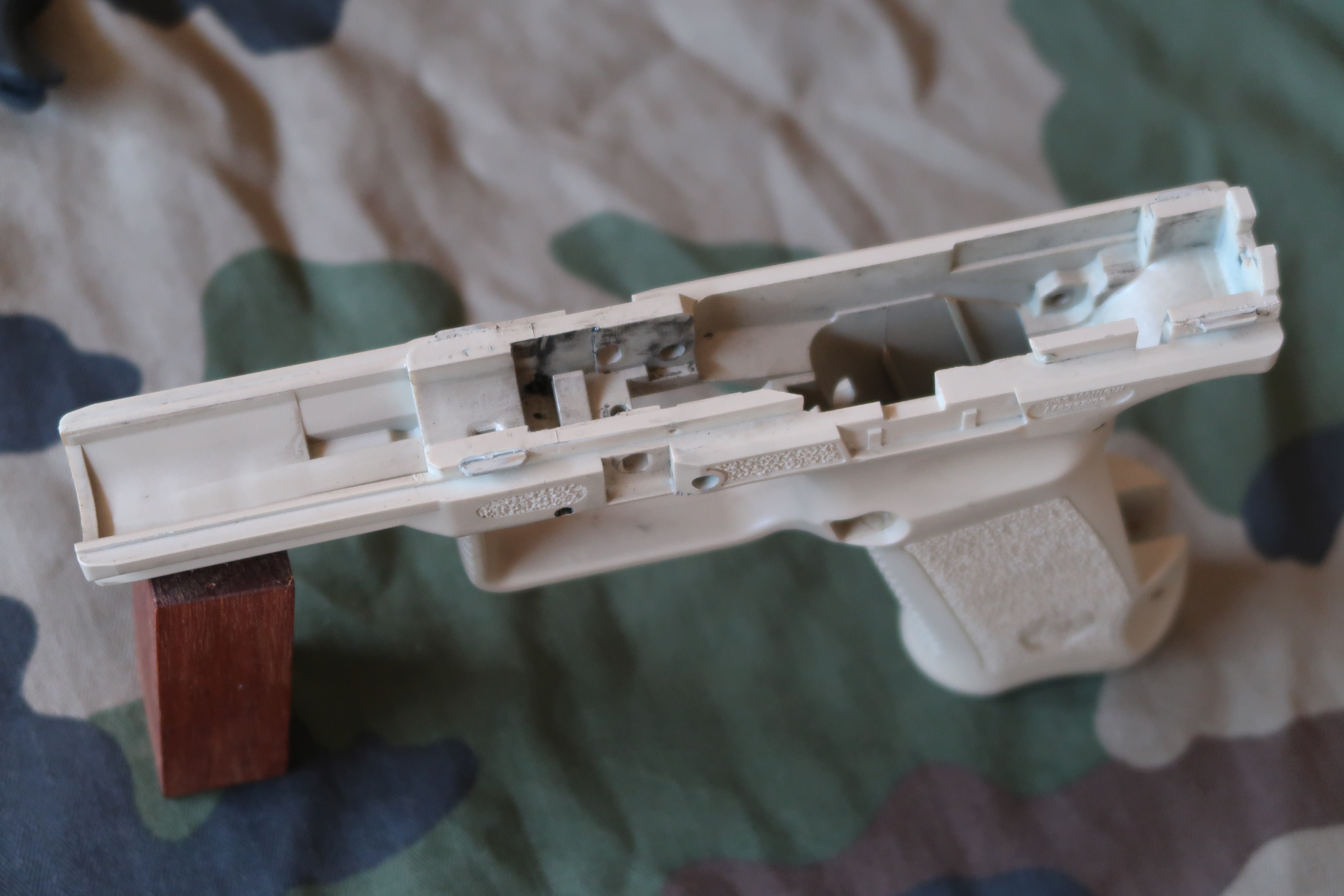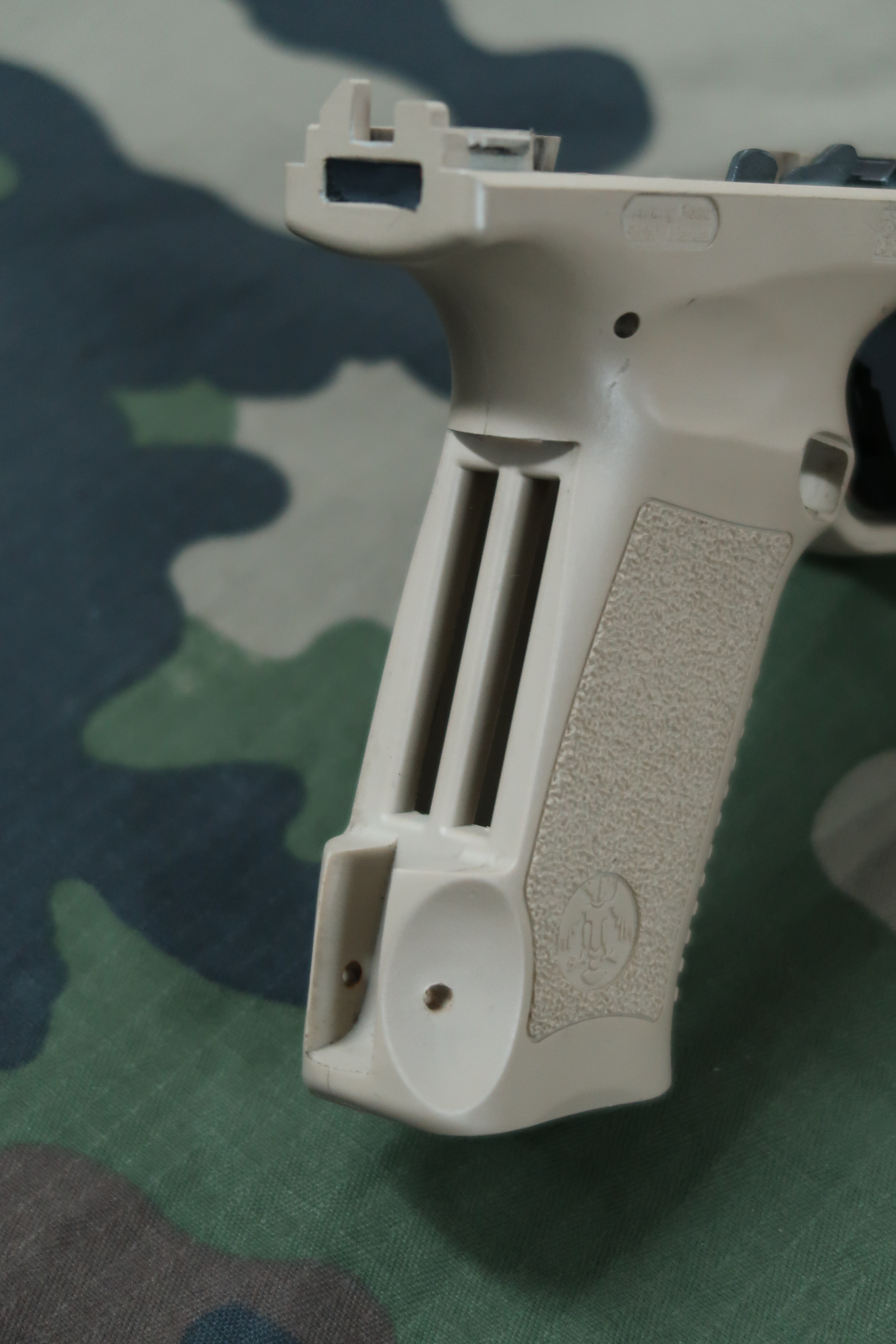 La plaque arrière est en plastique avec un insert en acier. Cette pièce se démonte très bien ce qui n’est pas le cas du pistolet Glock.
