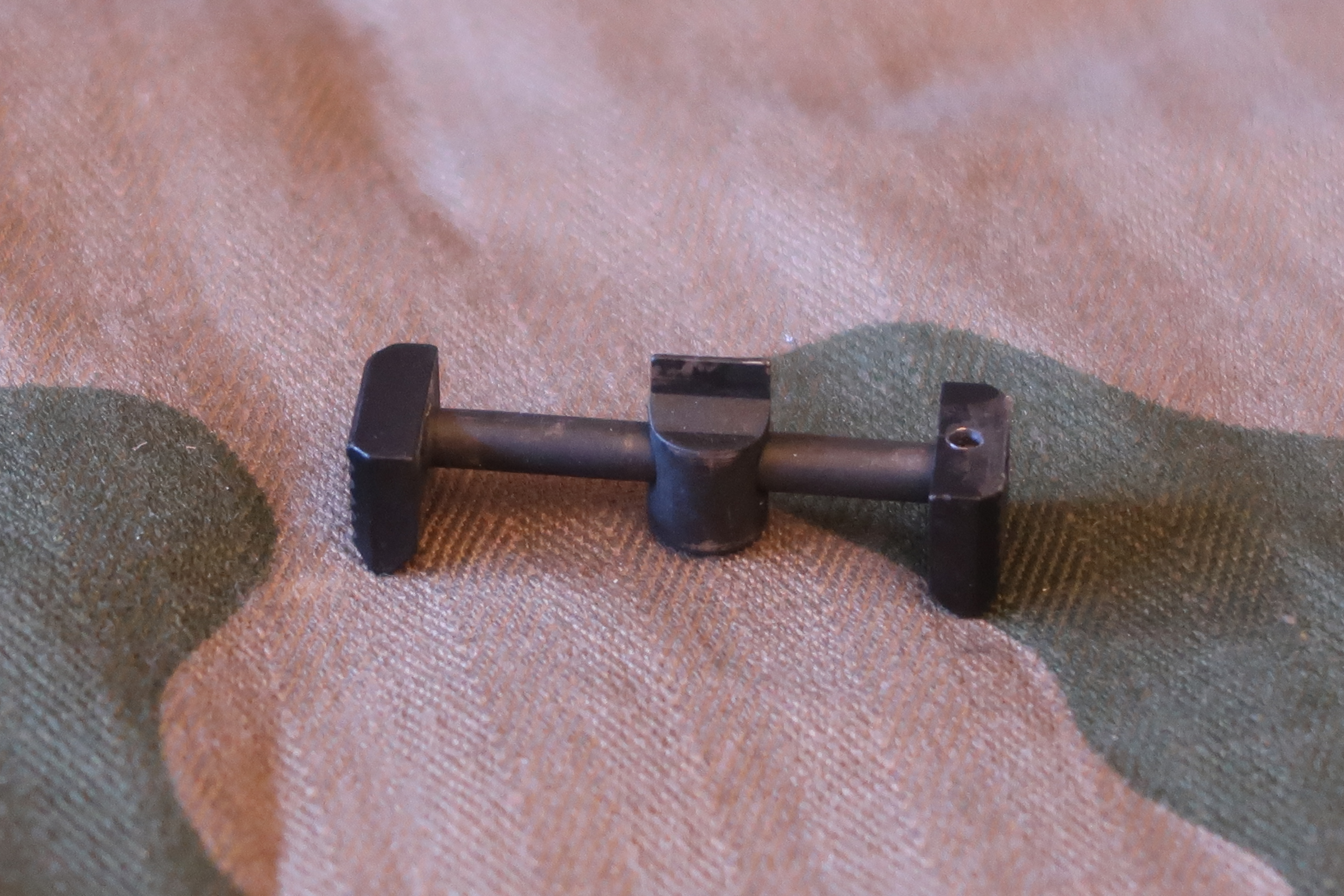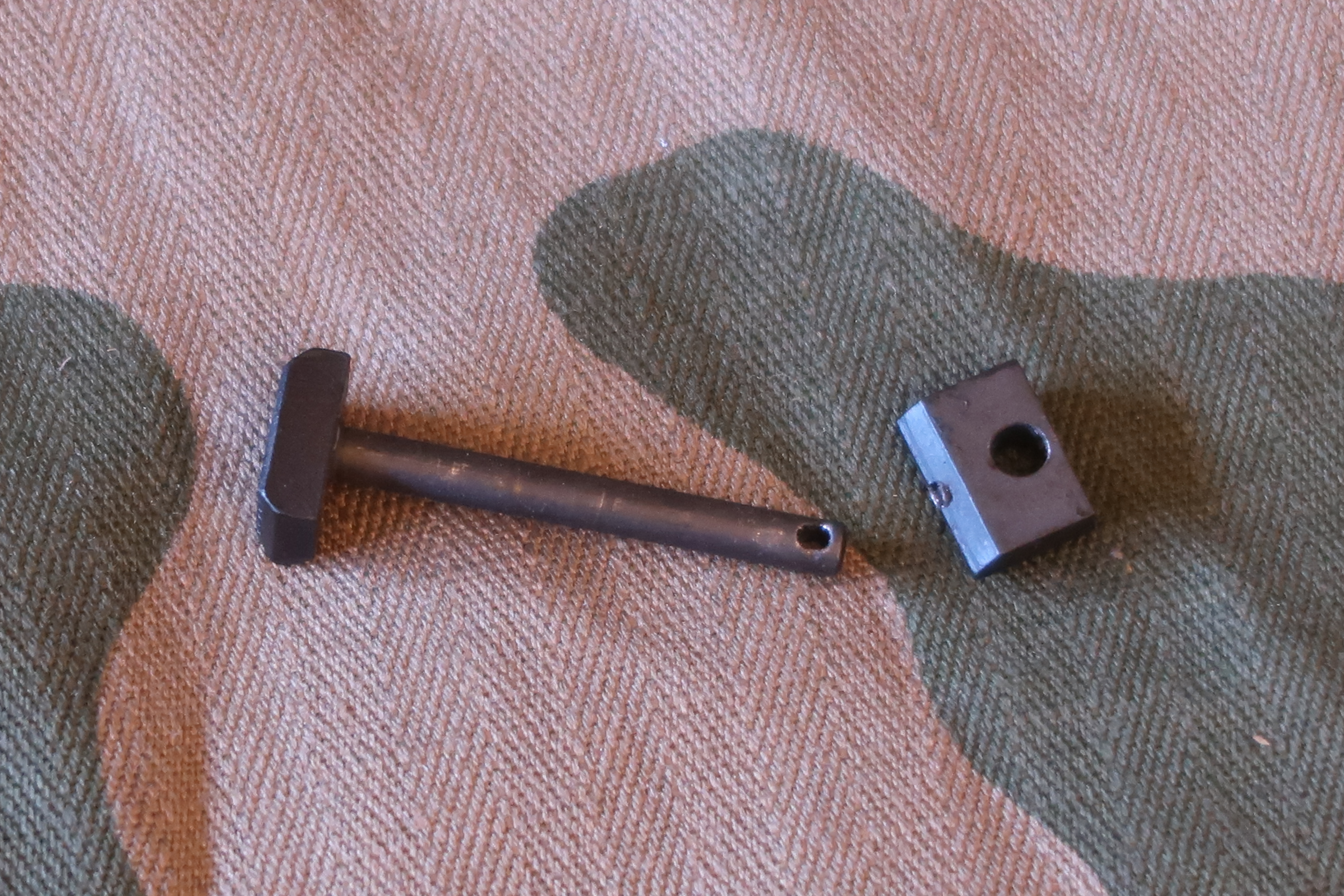 Pour désolidariser l’ensemble culasse/canon de l’arme, il faut abaisser le levier de démontage. Cela se fait via un petit axe transversal, il maintien le canon. L’effacer c’est libérer le canon, libérer le canon c’est démonter la culasse.