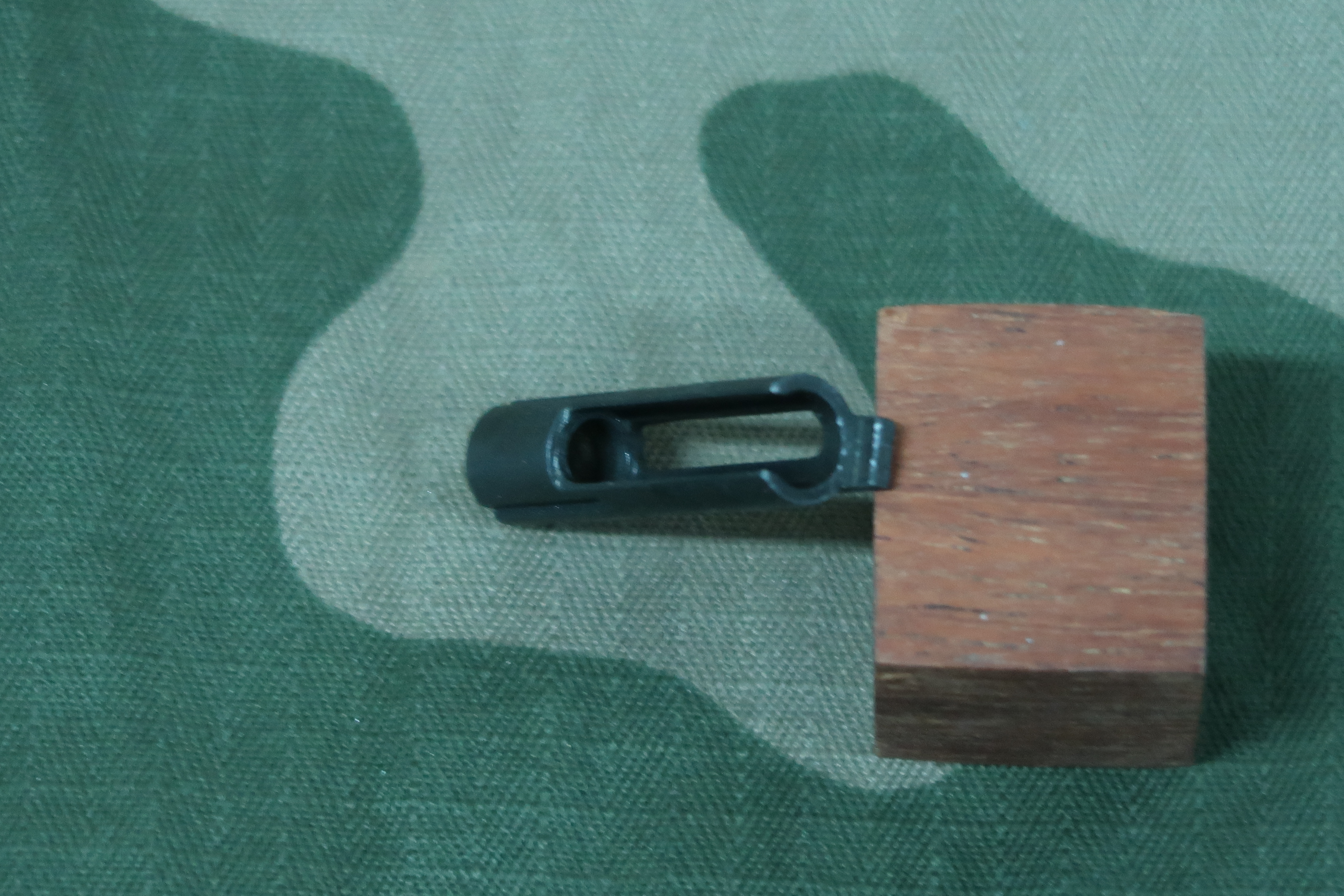 Pour démonter cette pièce, il faut au préalable démonter le levier de démontage. Ce qui n’est pas simple, on le verra plus loin. Le support de canon est maintenu dans son logement par deux goupilles dont une est l’axe de la queue de détente et d’arrêtoir de culasse.