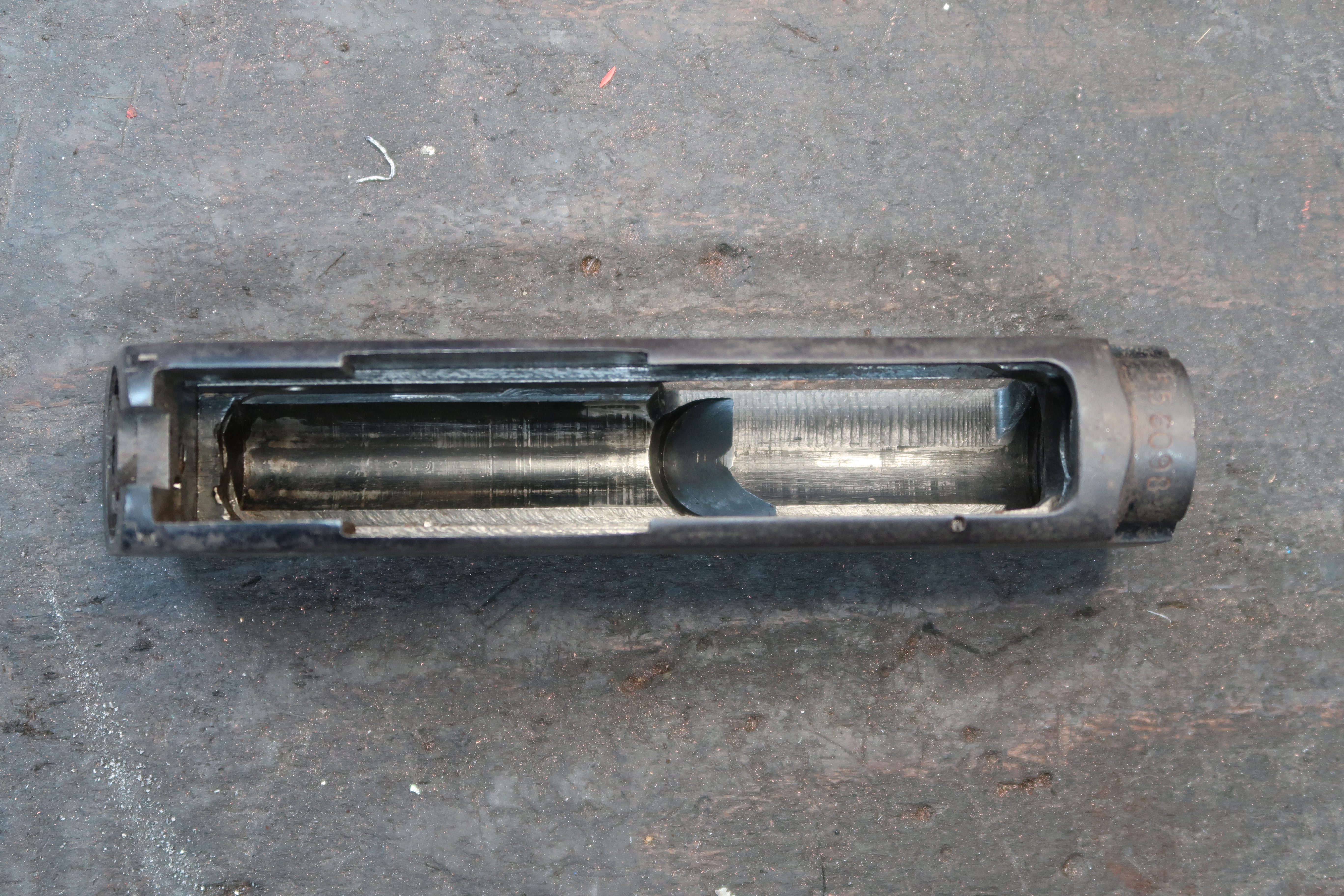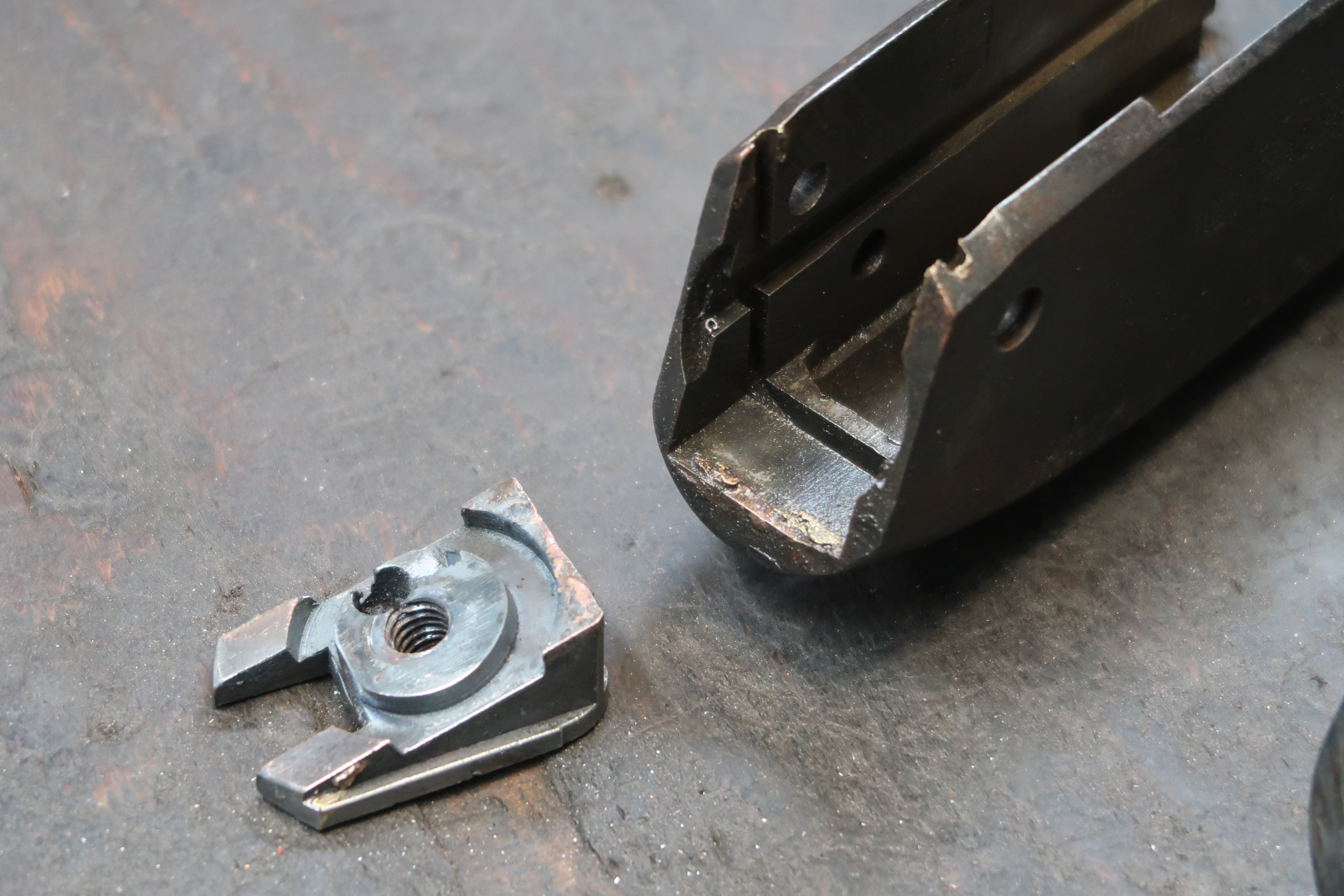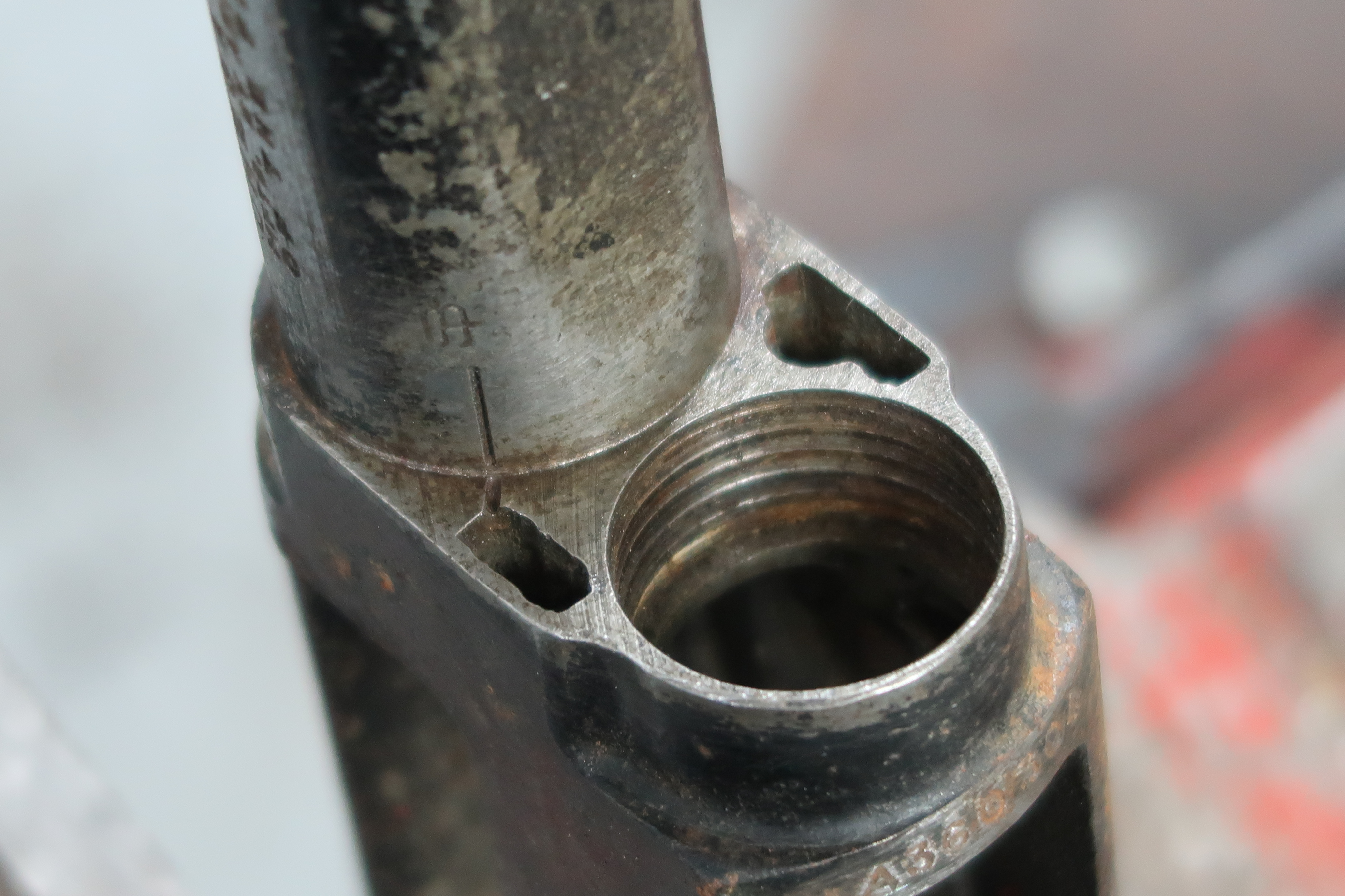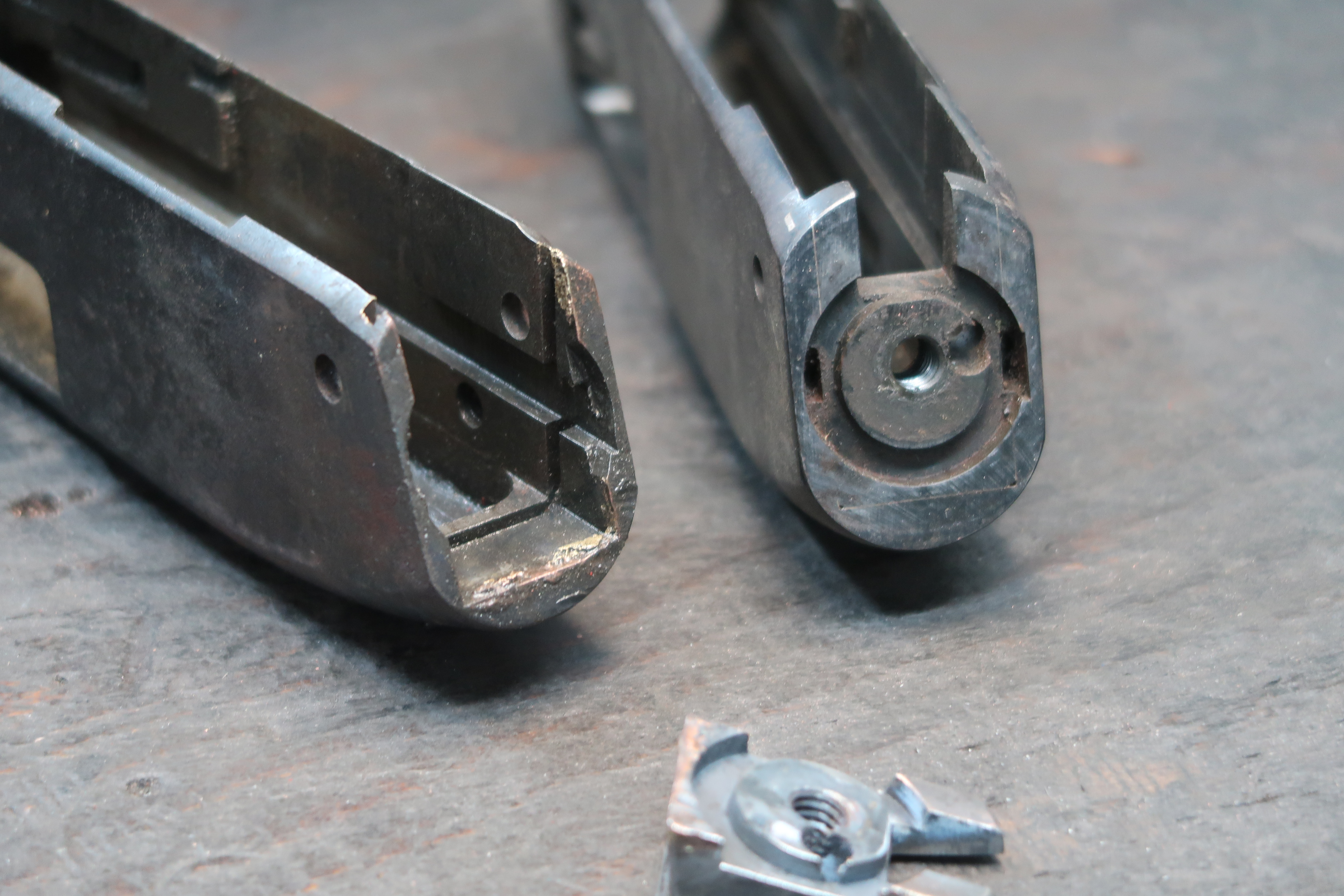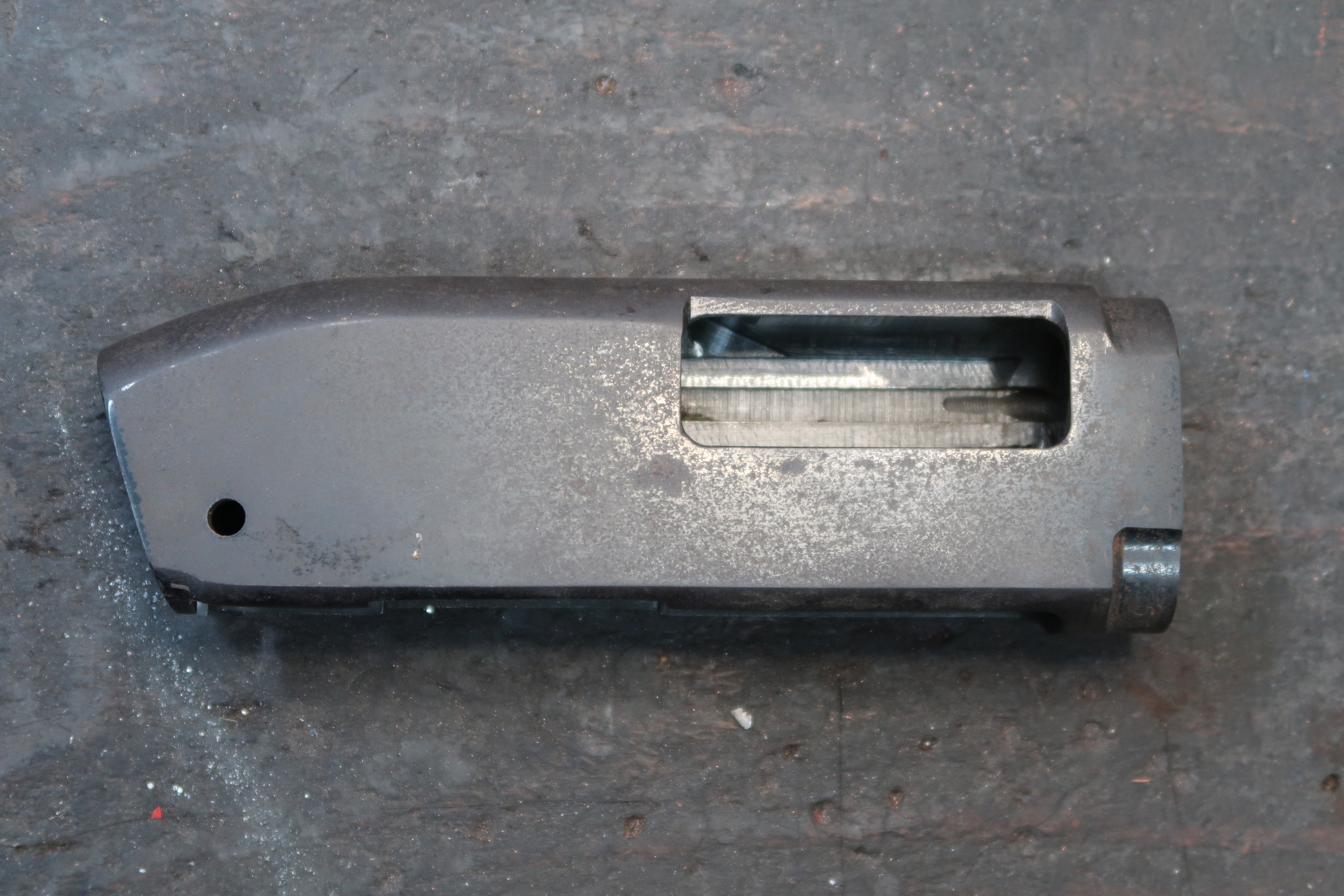 Lors de l’analyse de l’arme, j’ai remarqué que l’arrière de la boite de culasse est une pièce rapportée. Une chose m’avait mis la puce à l’oreille : les usinages en angle vif de l’intérieur de la carcasse. Ce type d’usinage ne peut exister qu’avec des moyens de production particuliers hors je doute que ceux-ci soient appliqués à un fusil de cette marque à faible coût. Sur la face arrière de la boite de culasse, on aperçoit des traces de soudure en forme de rectangle. Je dirais de la brasure à l’argent ou un procédé proche.