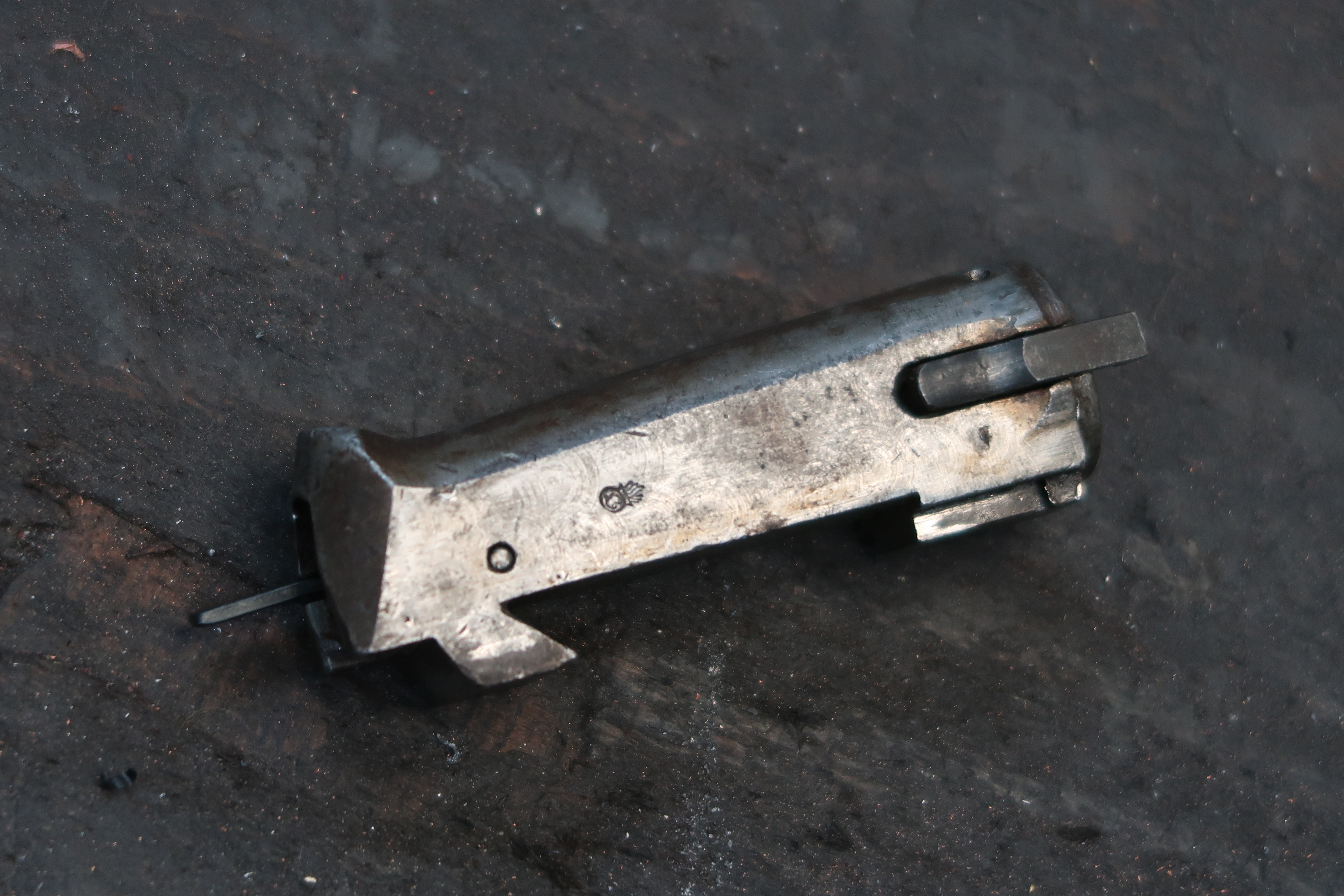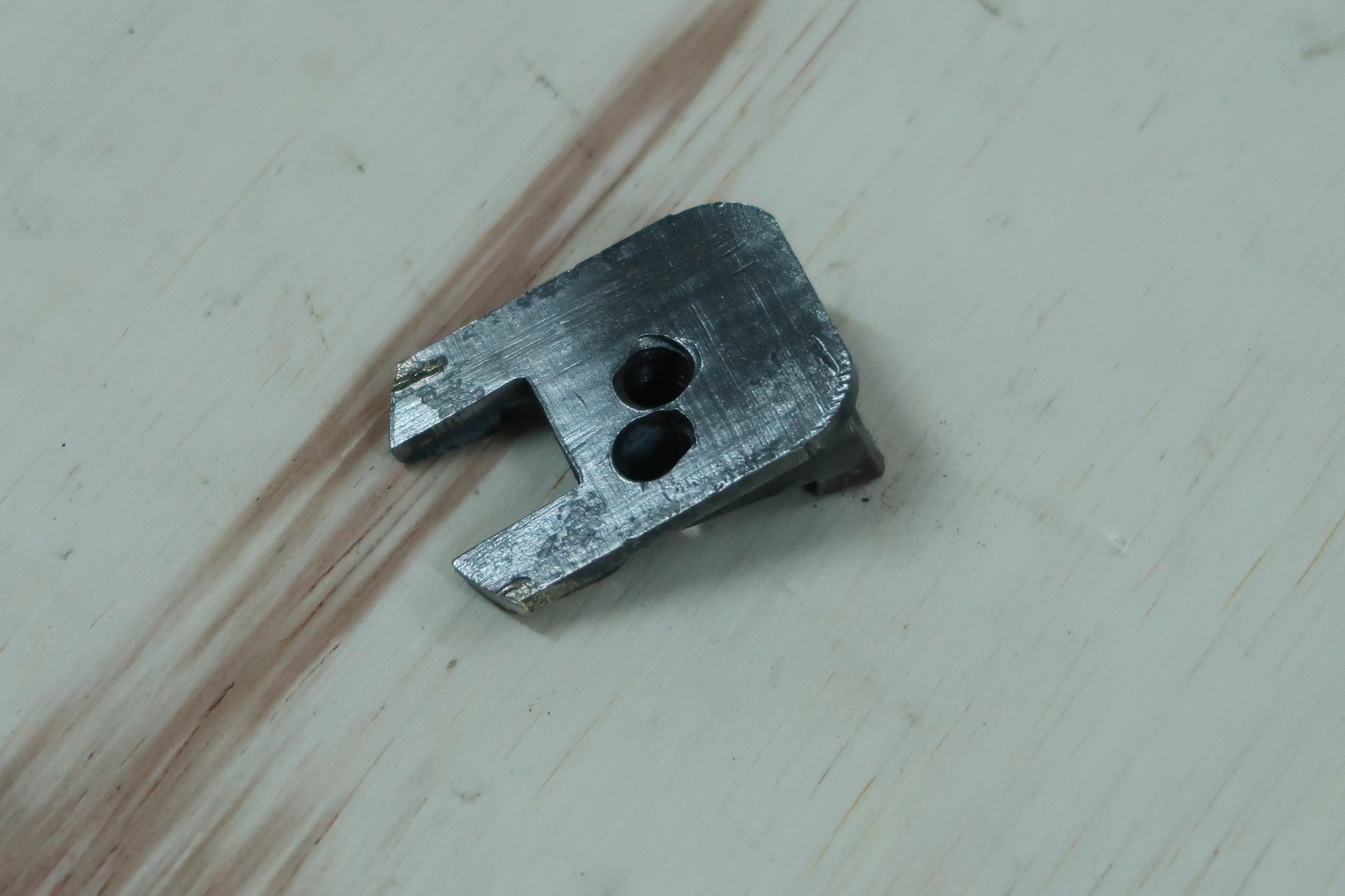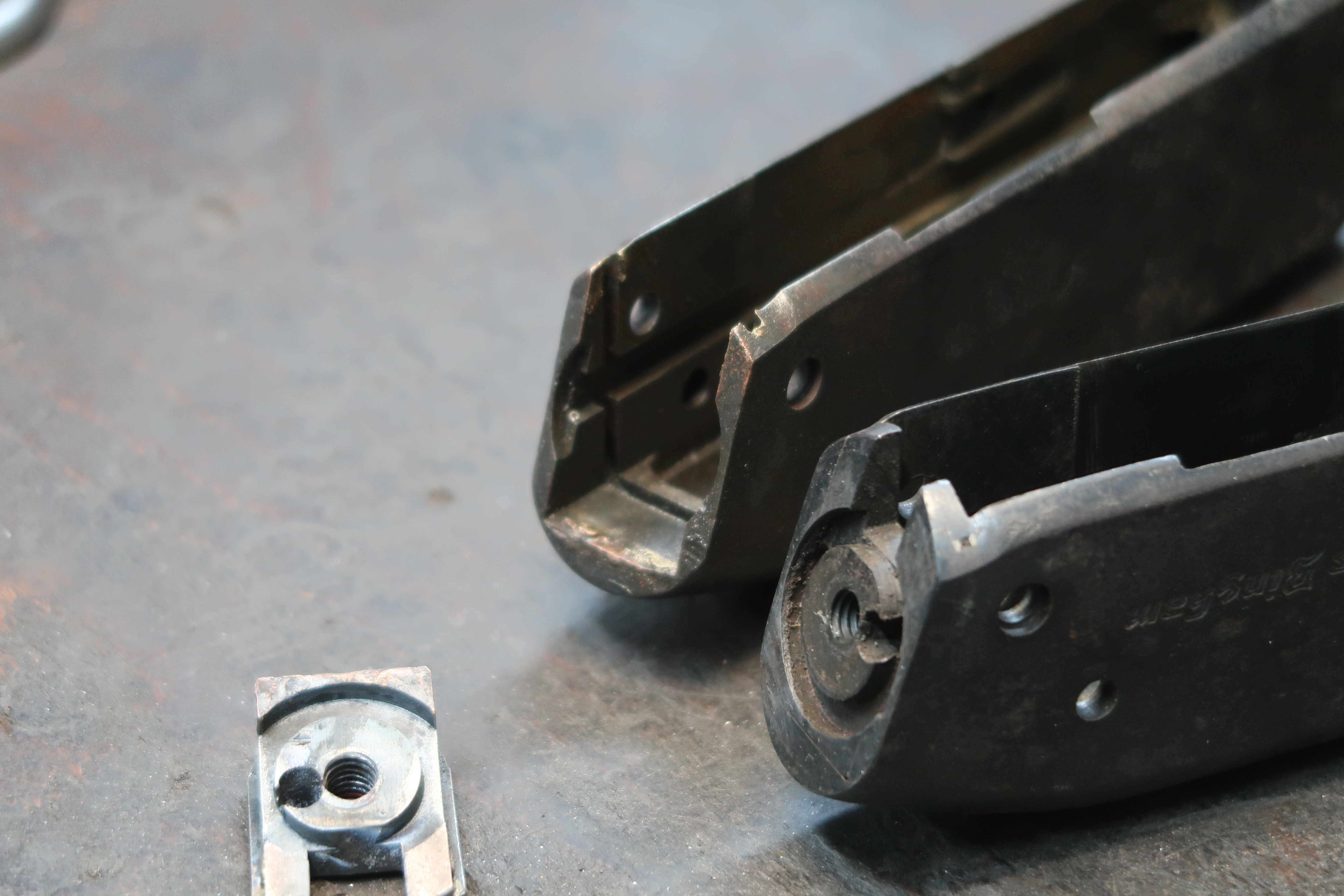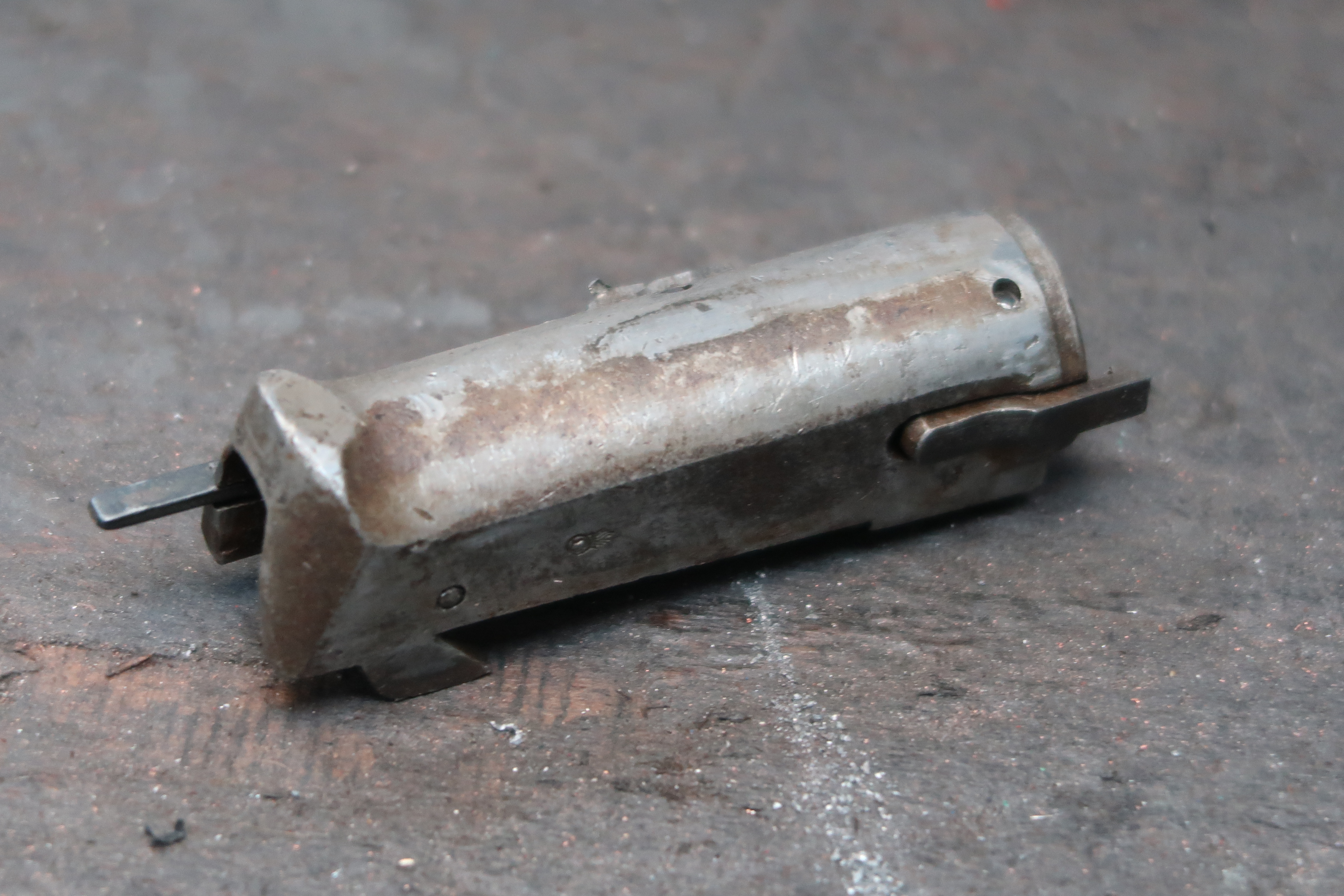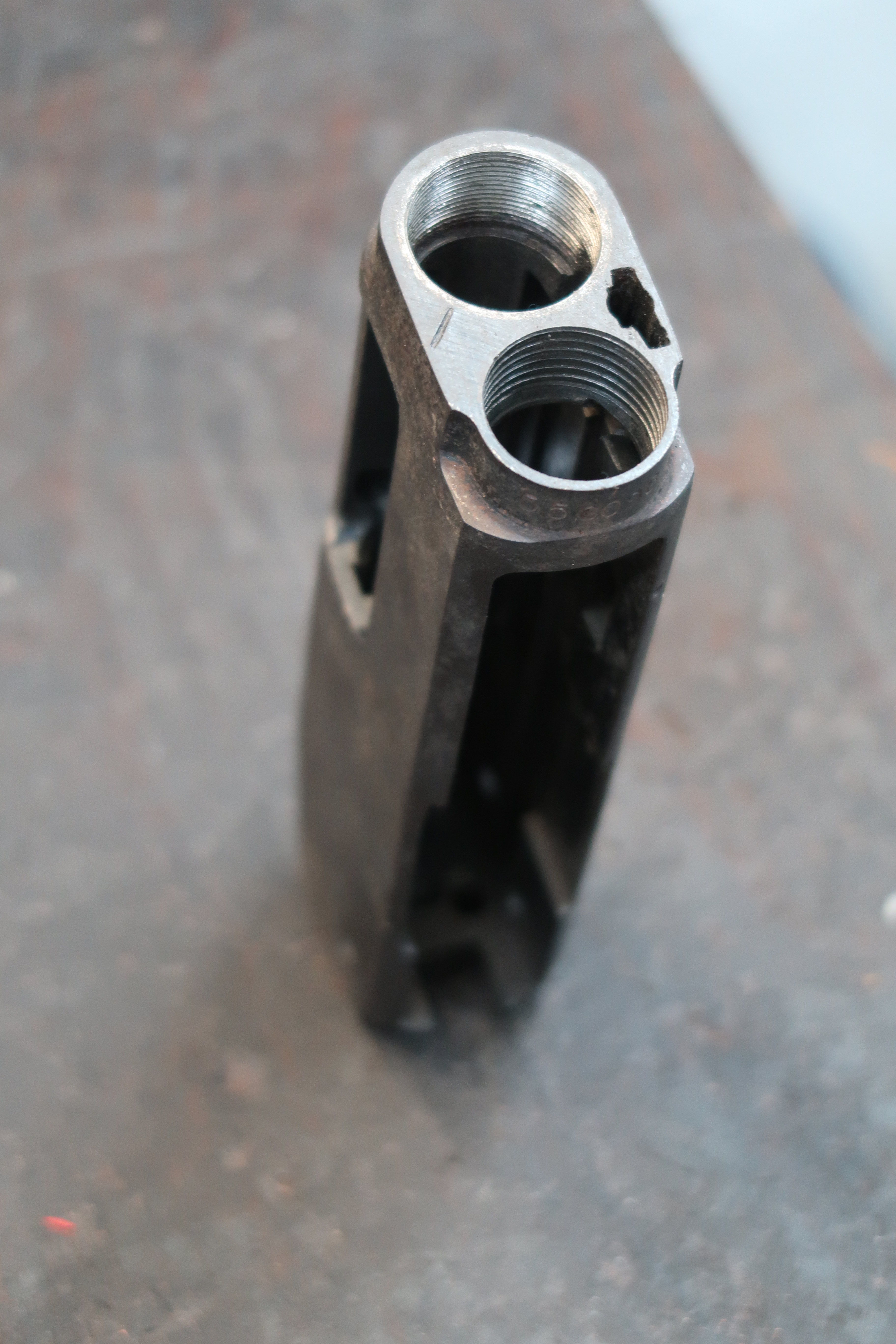 Lors de l’analyse de l’arme, j’ai remarqué que l’arrière de la boite de culasse est une pièce rapportée. Une chose m’avait mis la puce à l’oreille : les usinages en angle vif de l’intérieur de la carcasse. Ce type d’usinage ne peut exister qu’avec des moyens de production particuliers hors je doute que ceux-ci soient appliqués à un fusil de cette marque à faible coût. Sur la face arrière de la boite de culasse, on aperçoit des traces de soudure en forme de rectangle. Je dirais de la brasure à l’argent ou un procédé proche.